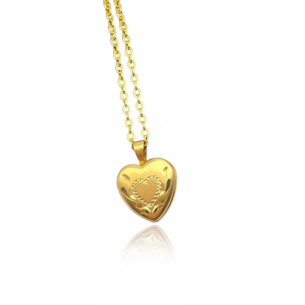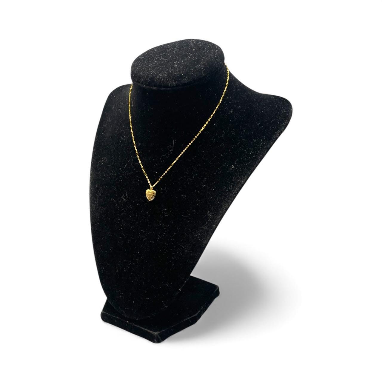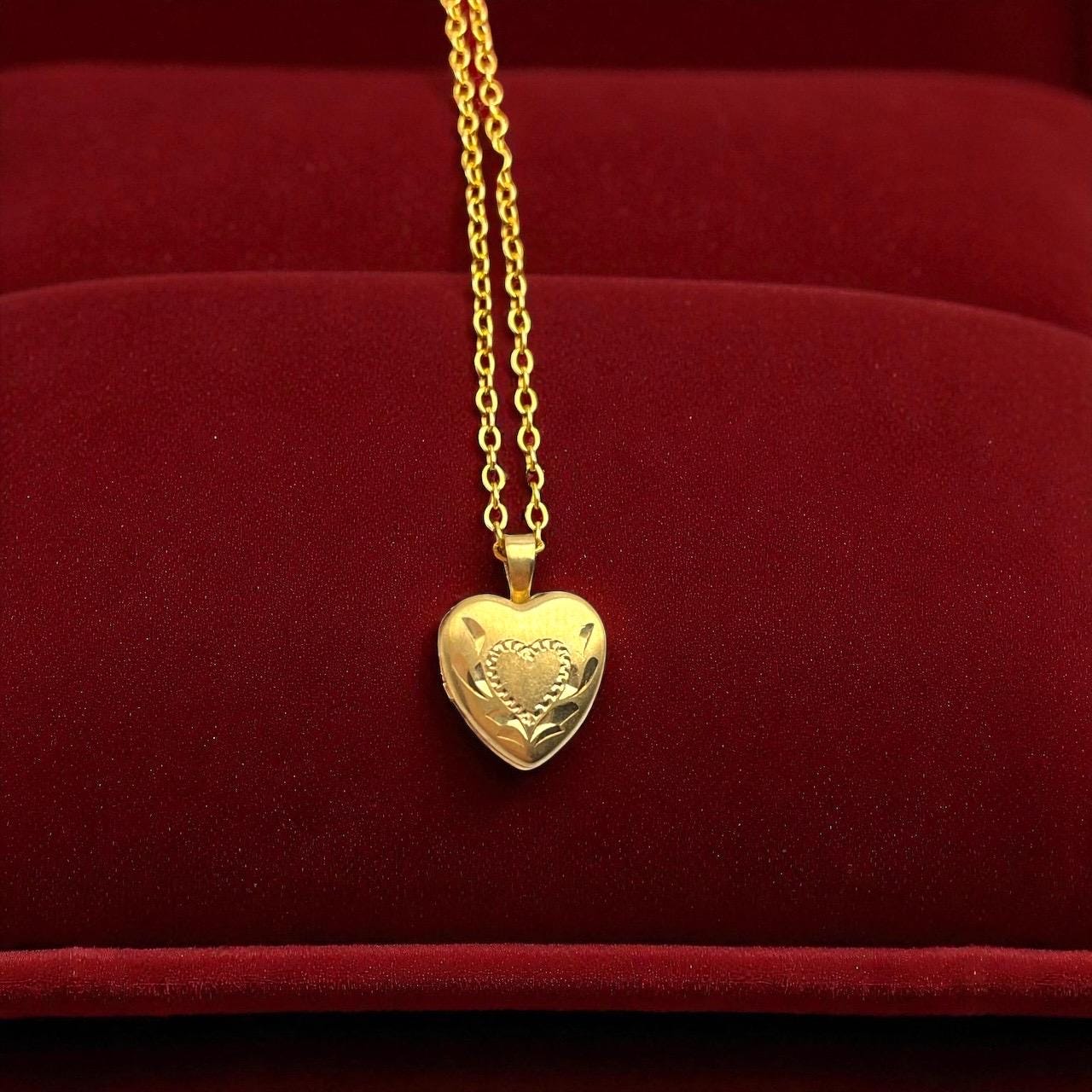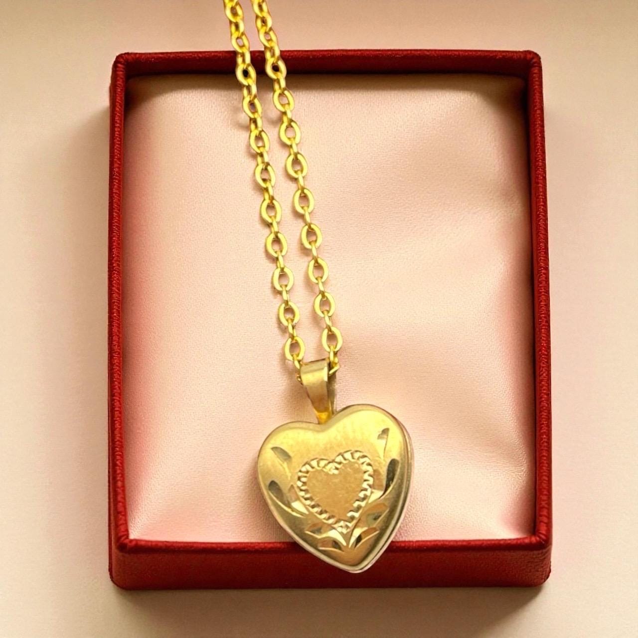 A wonderful petite vintage 14K yellow gold filled heart shaped locket necklace with a front that features an even smaller etched heart in the center and etched designs surrounding. The back is plain with no design.