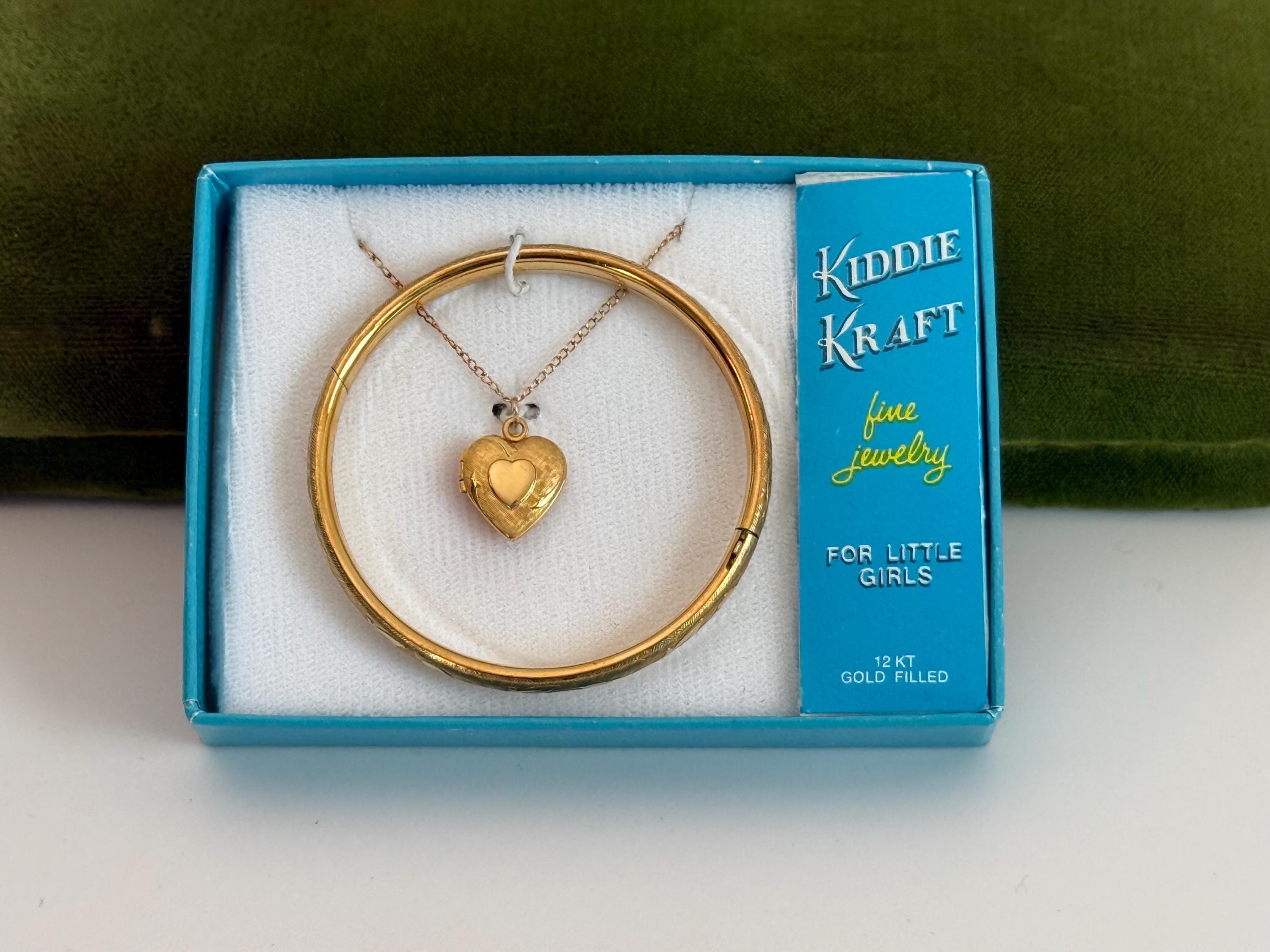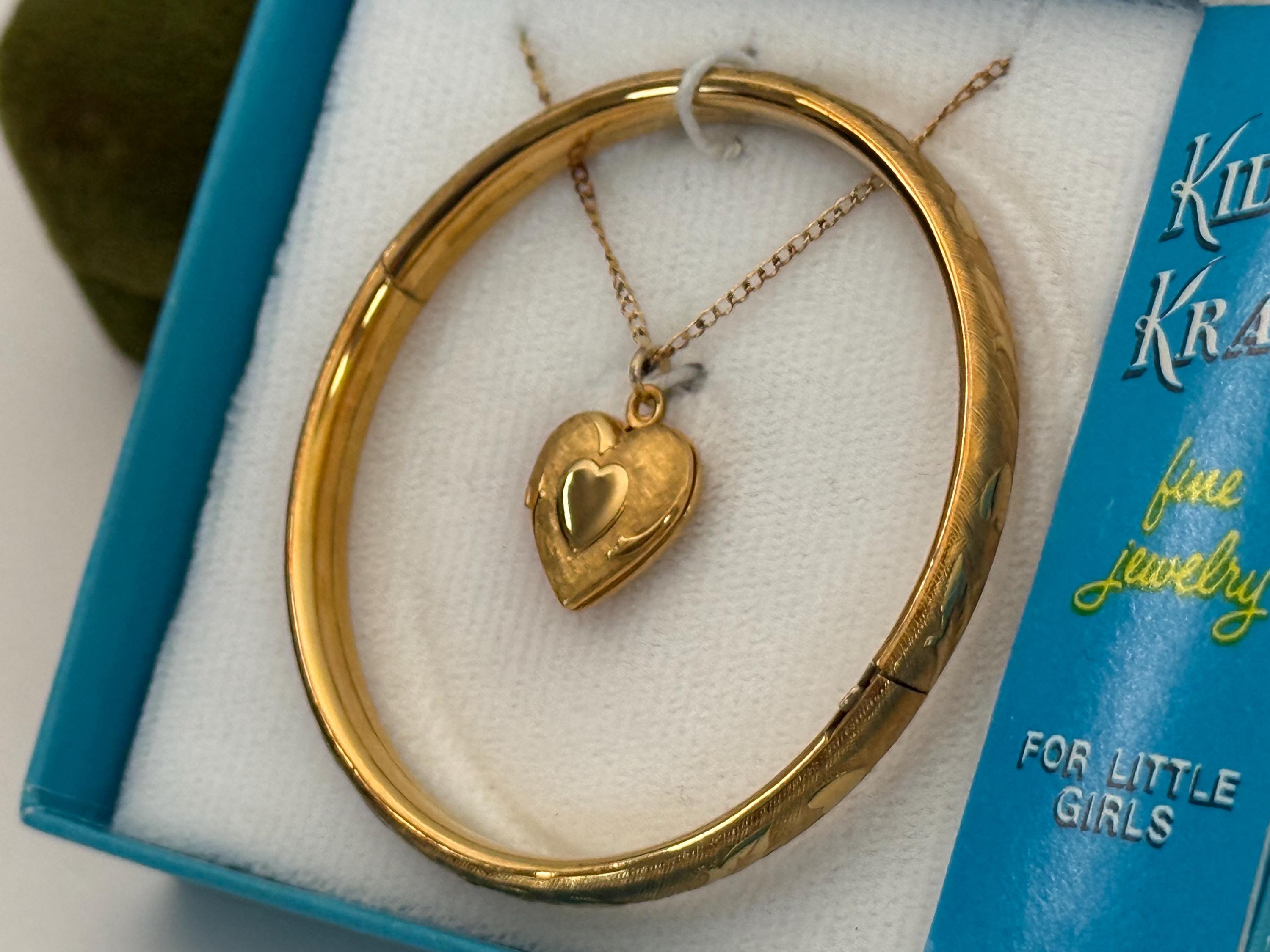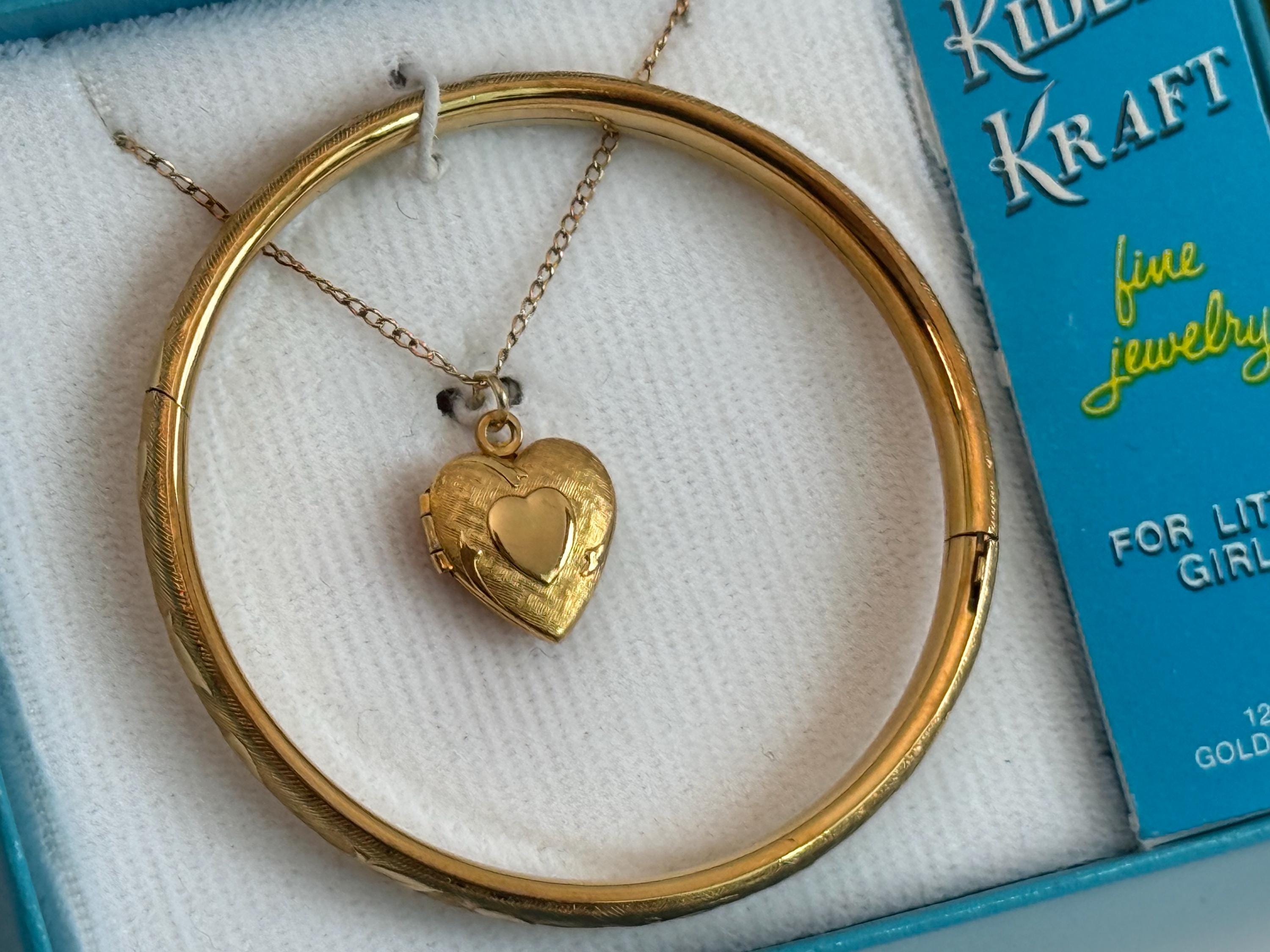 Vintage 12K Gold Filled Heart Locket & Bangle Bracelet - Kiddie Kraft 2 Pc Set in Box - Retro Era Girl Child