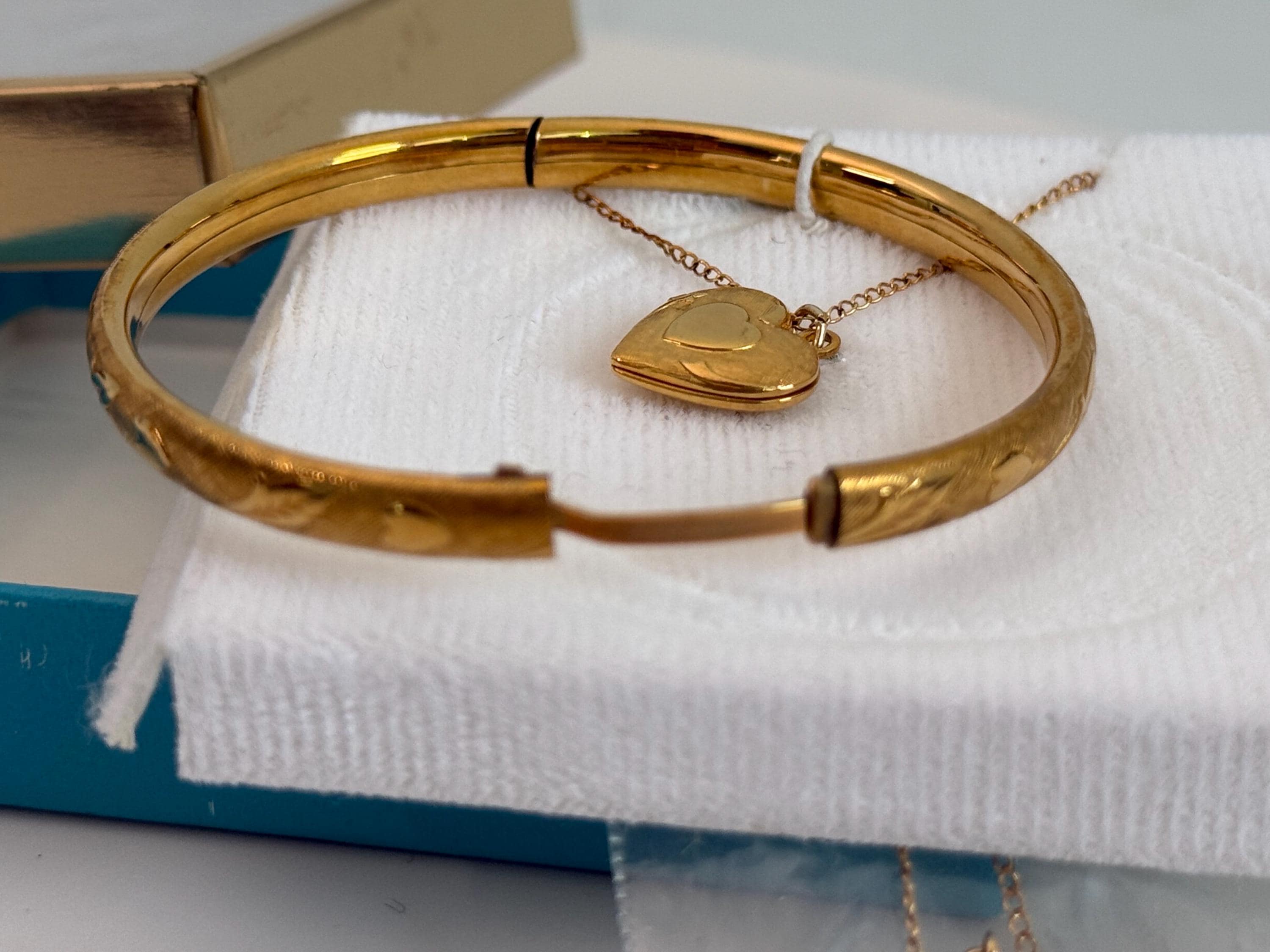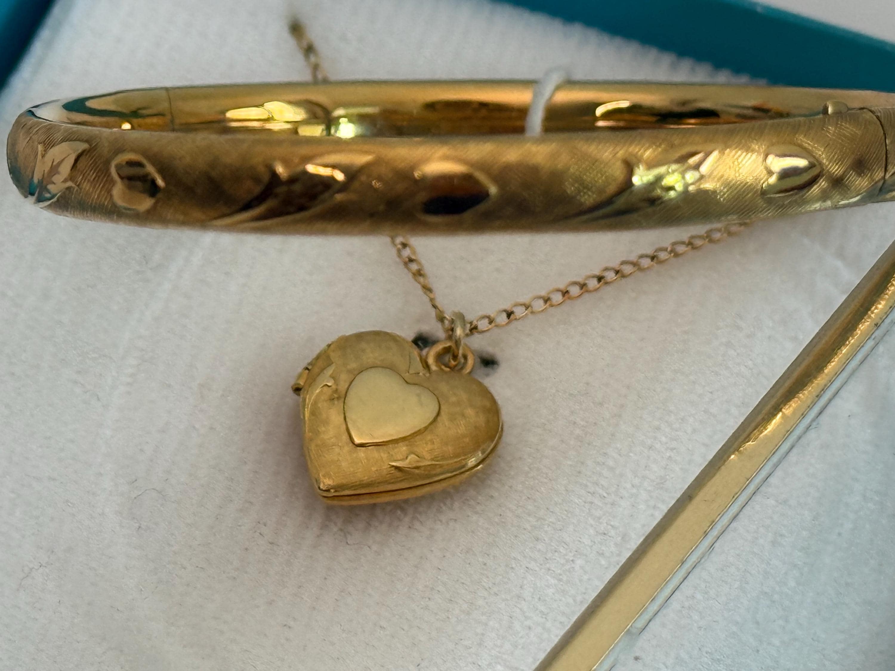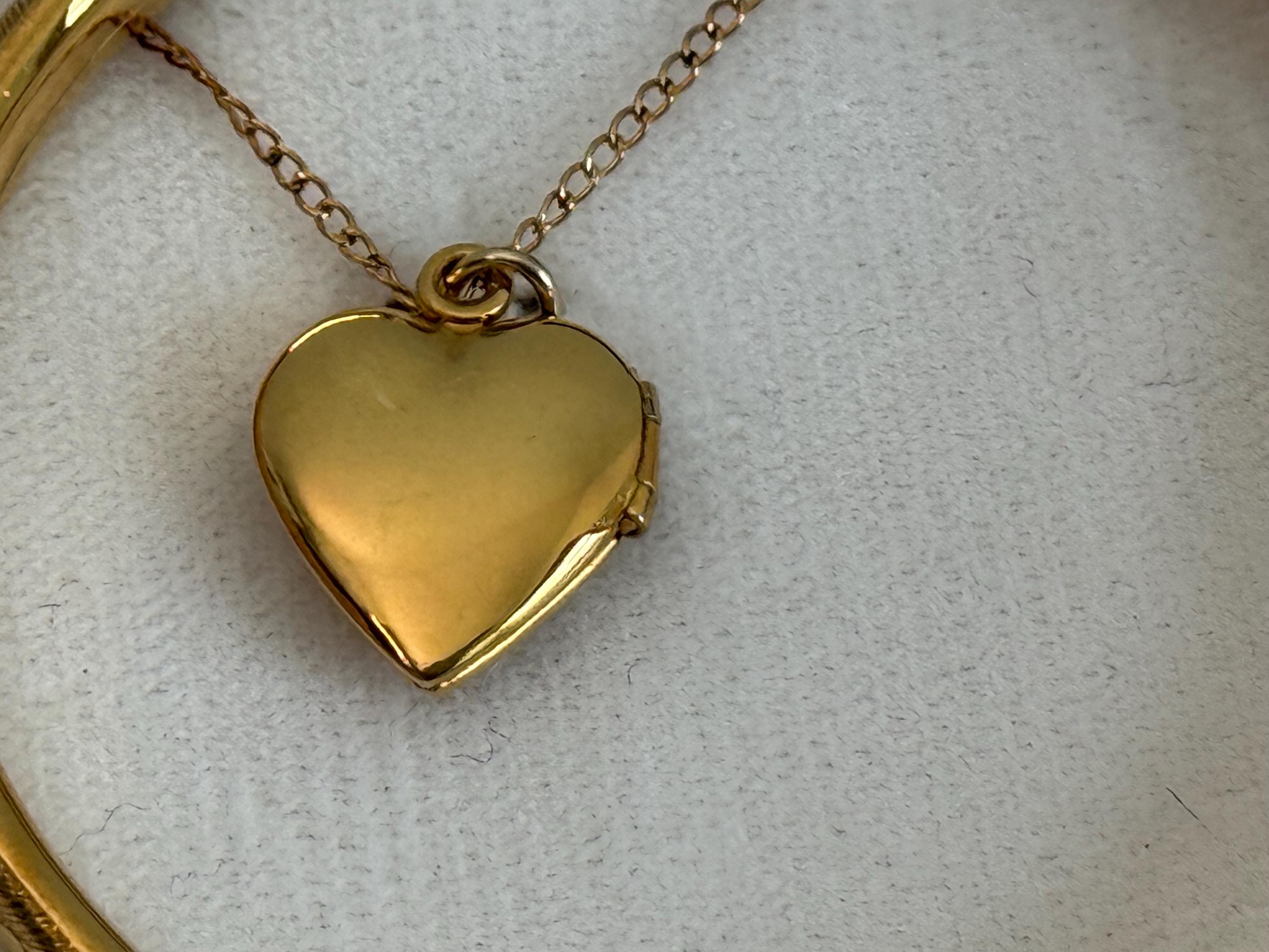 A sweet little gold filled heart locket along with a coordinating bangle bracelet in the original box. This is for a young girl aged 2-6 years of age.