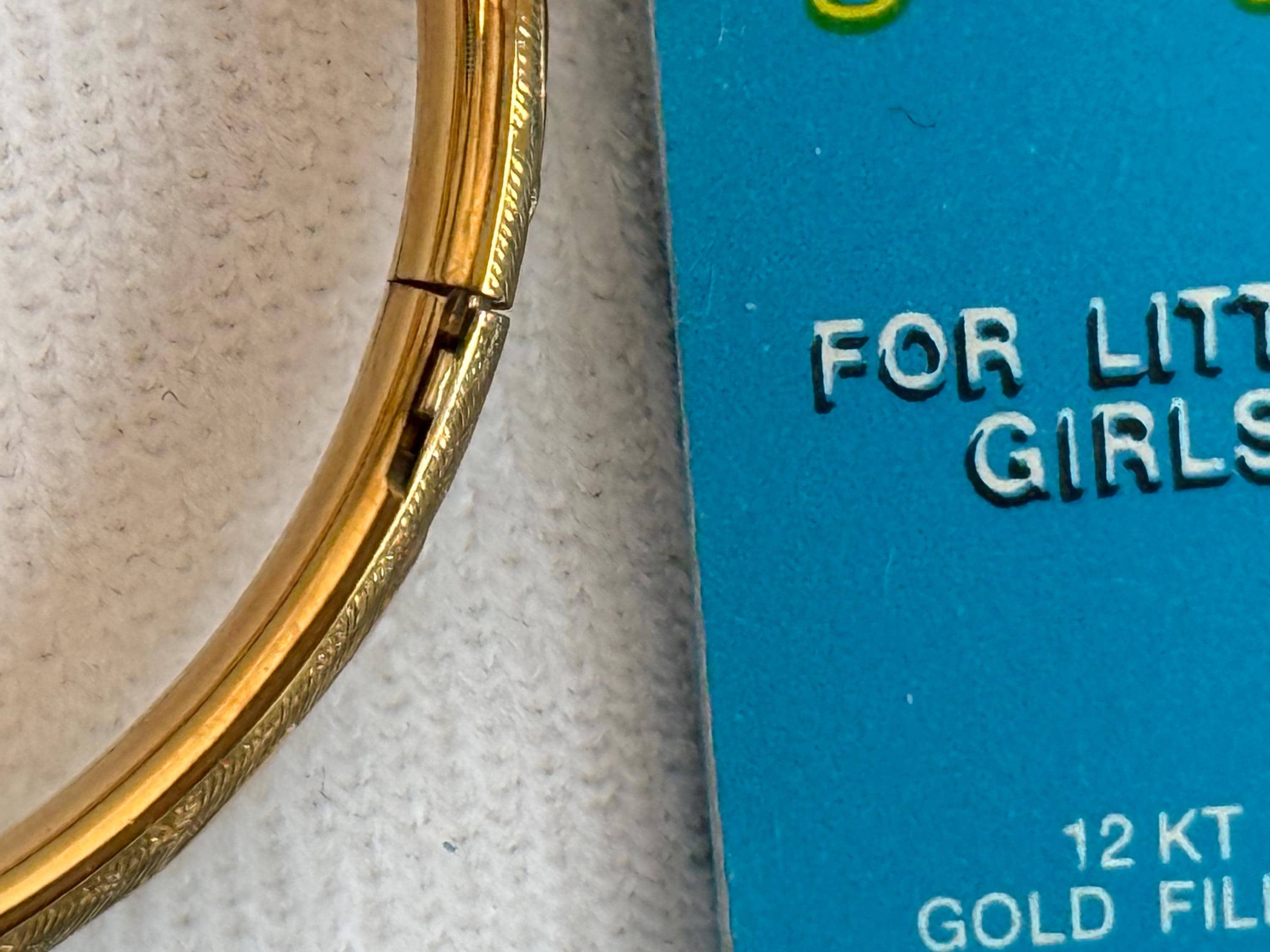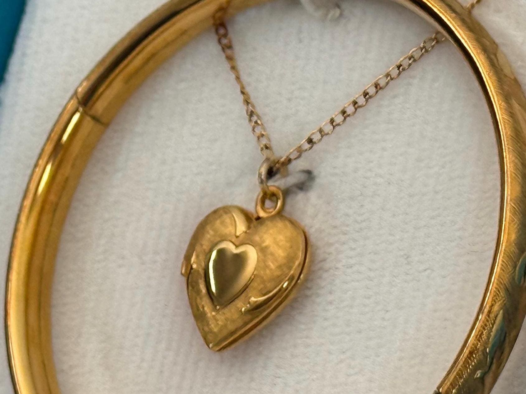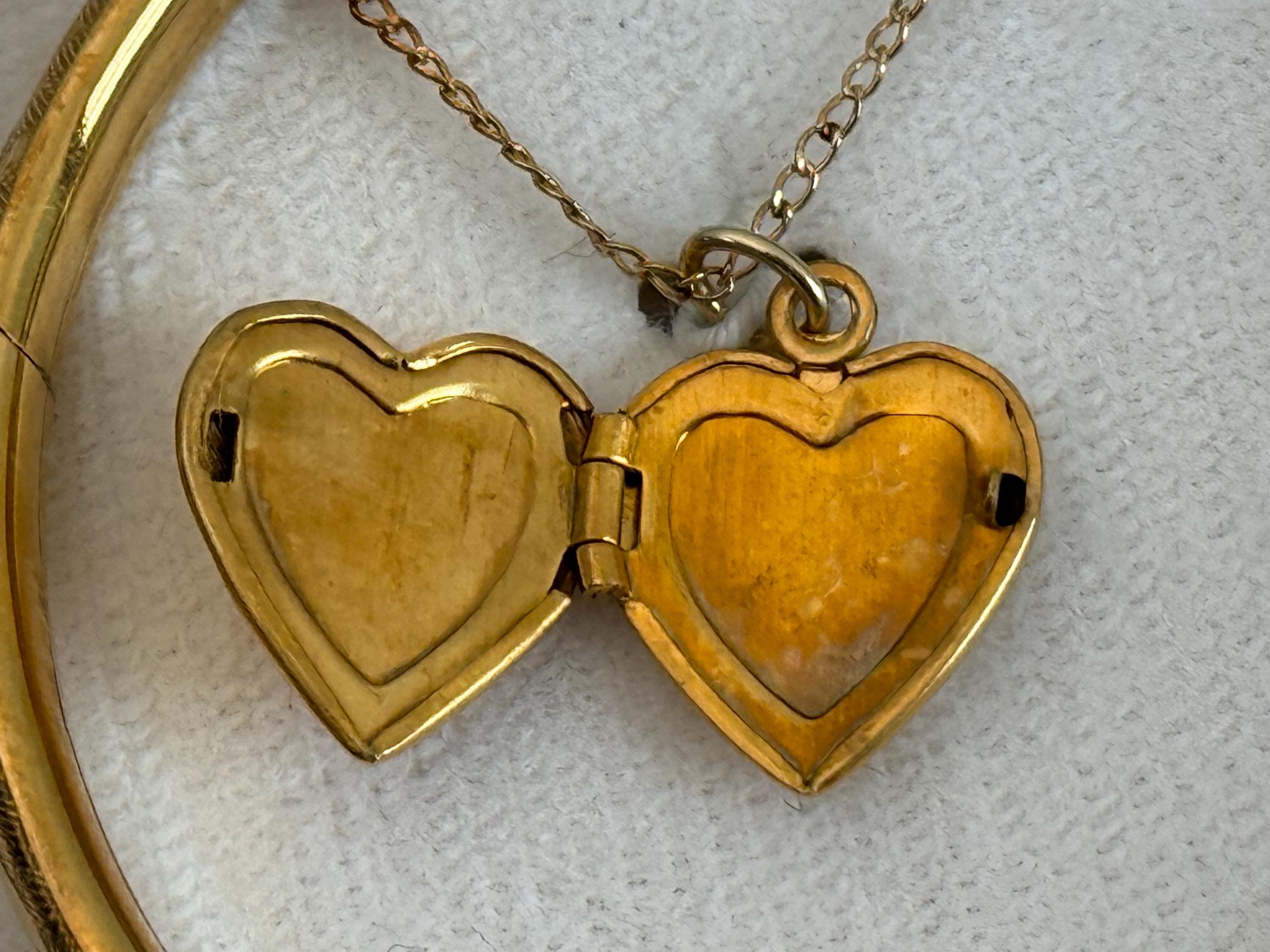 A sweet little gold filled heart locket along with a coordinating bangle bracelet in the original box. This is for a young girl aged 2-6 years of age.