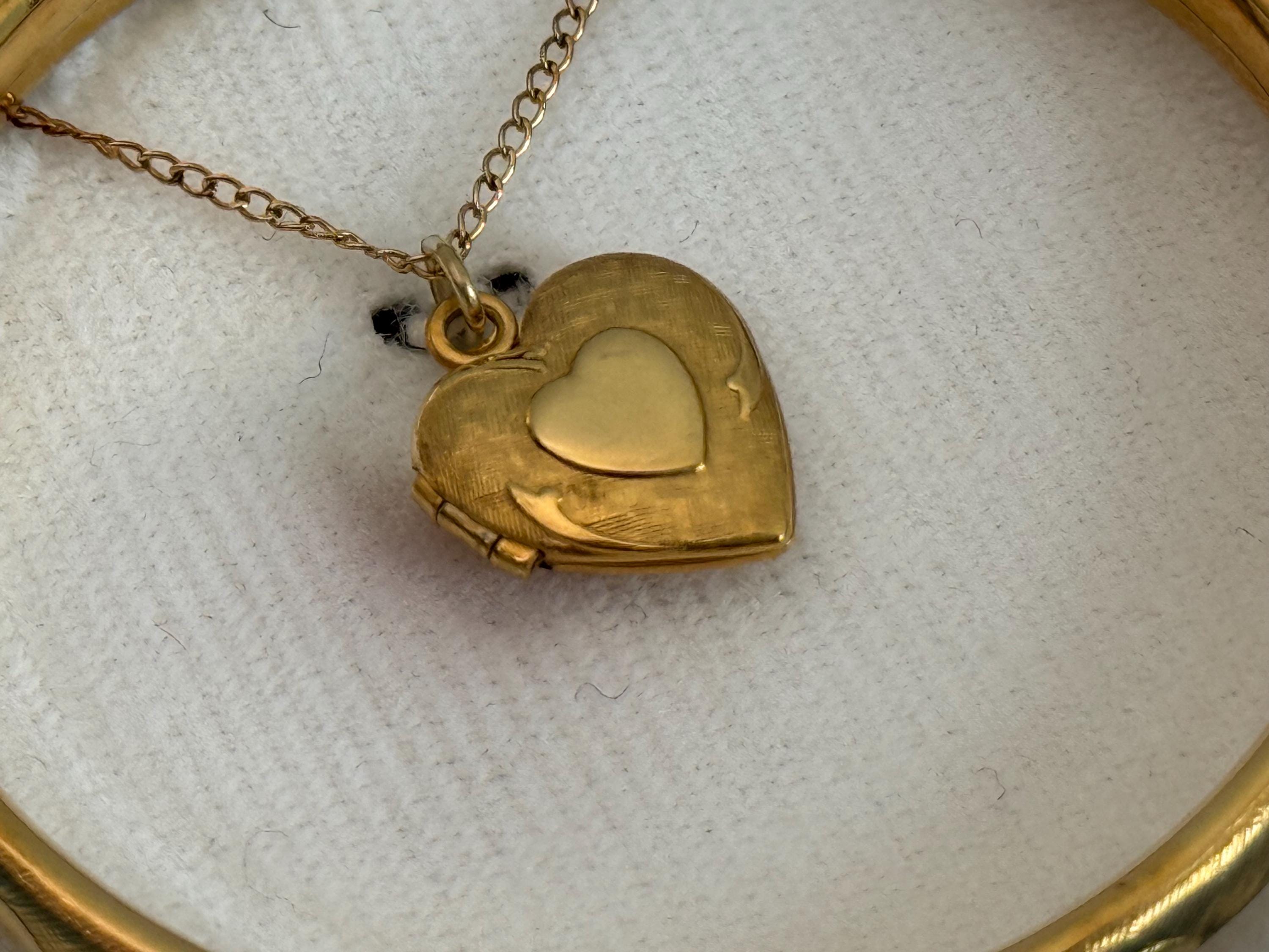 The small heart shaped locket features a central heart on a textured background and it hangs on a fine gold filled oval link chain. The back side of the locket pendant is plain with no decoration