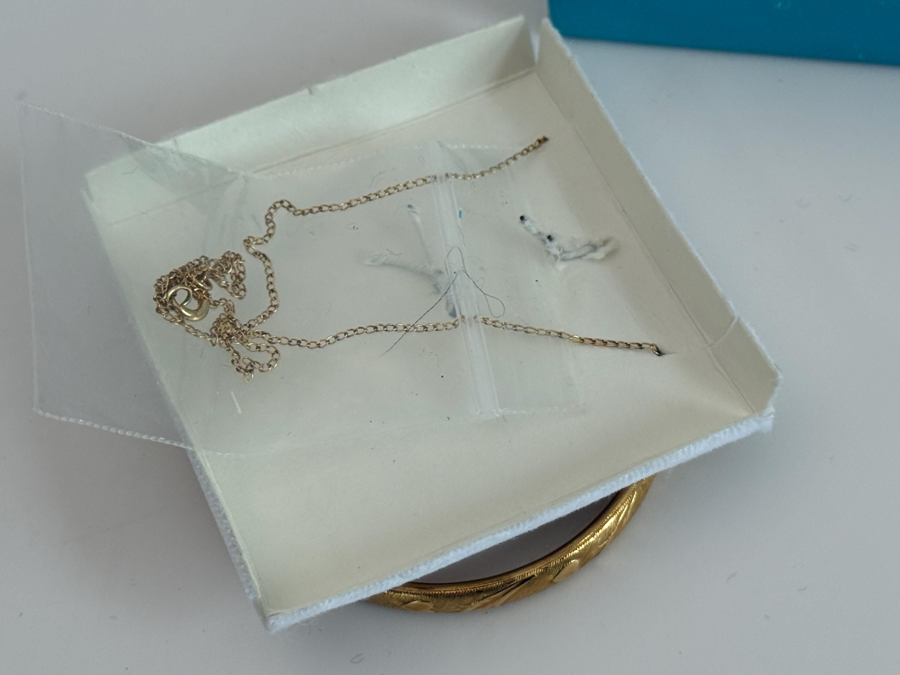 The two piece locket and bracelet set comes in the original box and is late mid century in age. The store tags are still on the back. it appears to never have been worn.