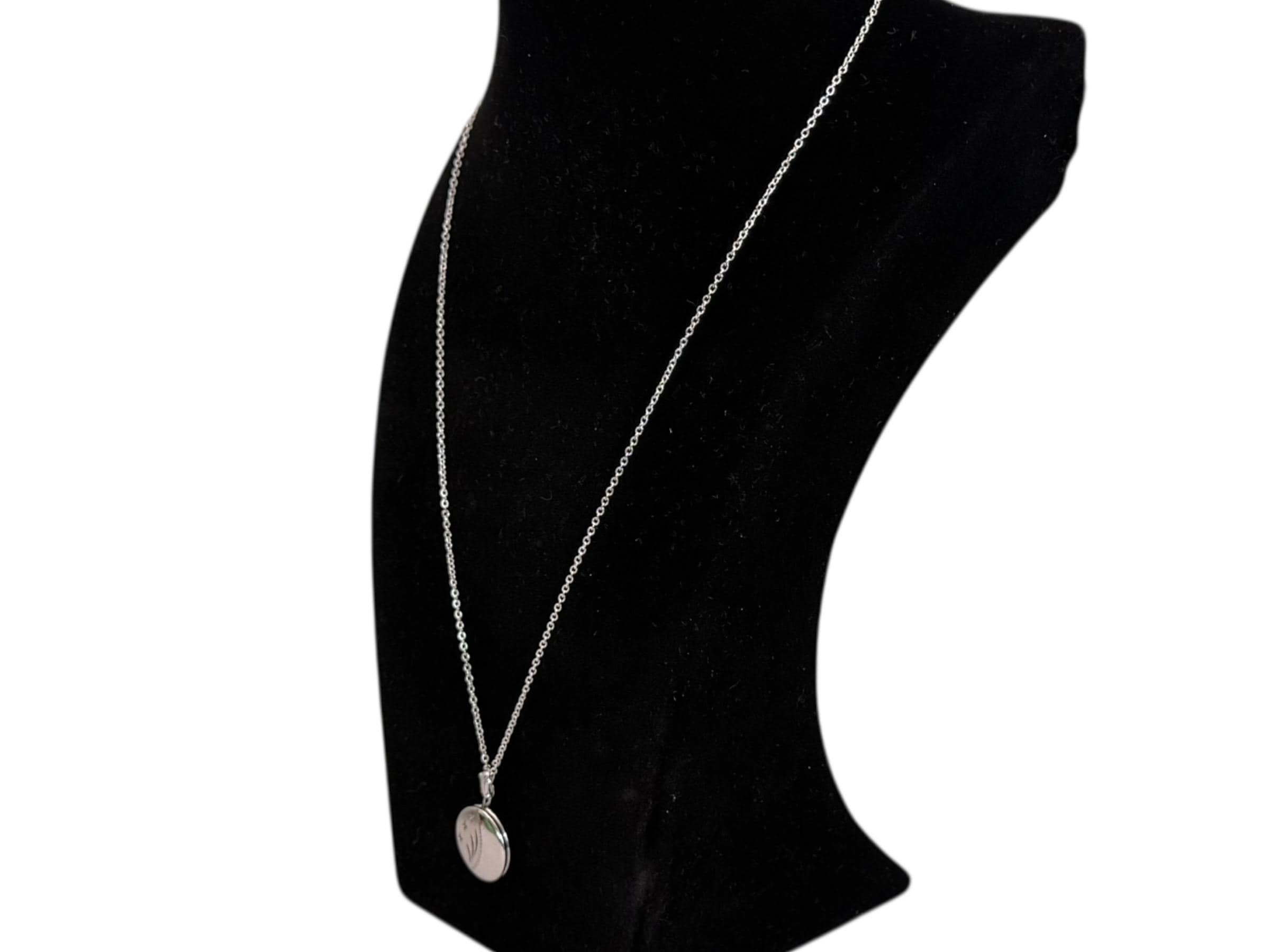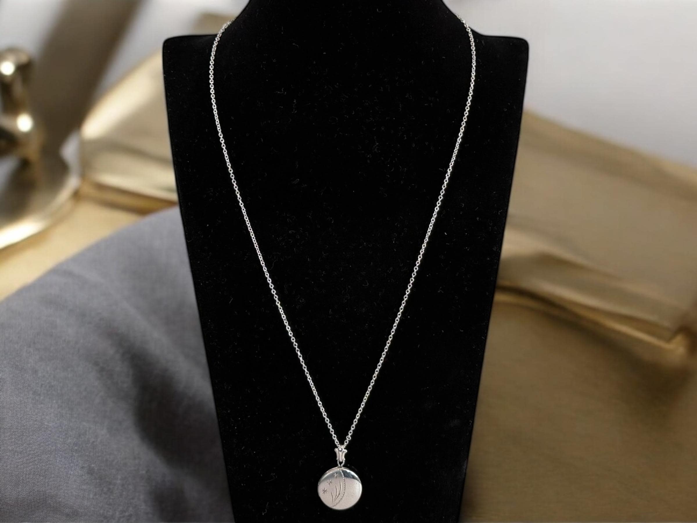 A vintage round Sterling Silver locket hanging on a fine new Sterling Silver 18” long chain. The front of the locket has a shiny side and a textured side. There are 3 small etched stems with flowers on the textured section to the left. The back of this locket has an ornate circular design.