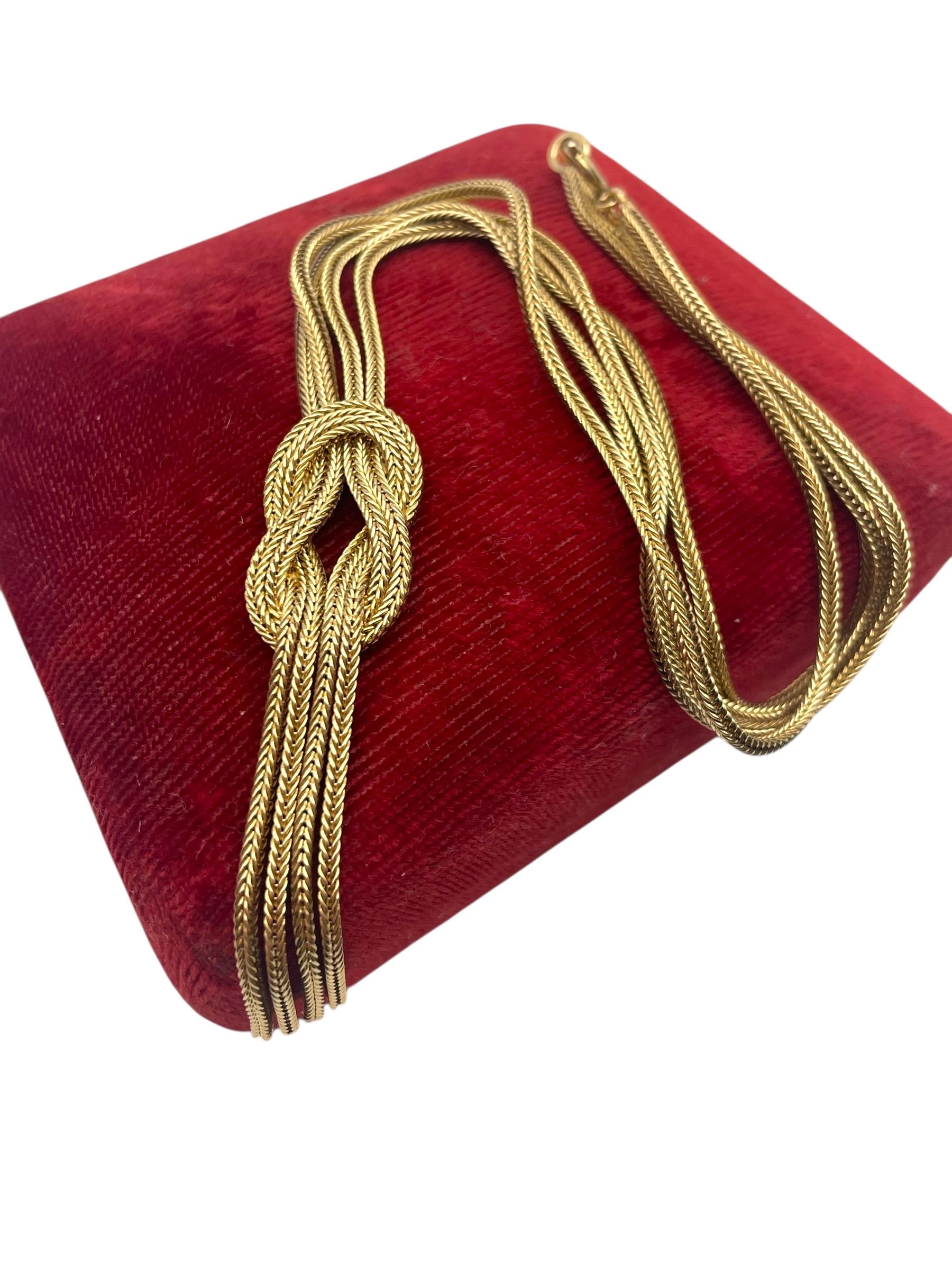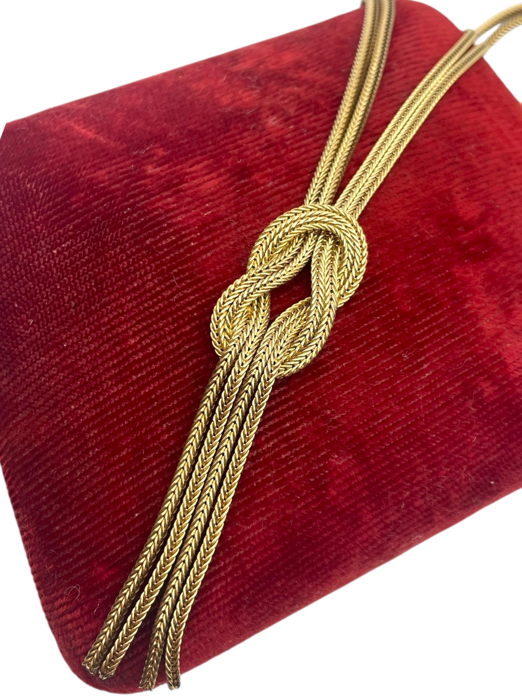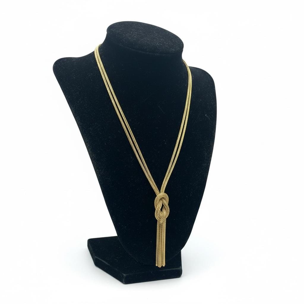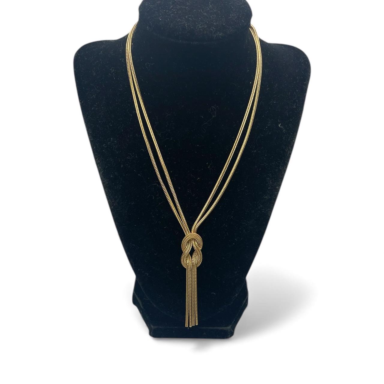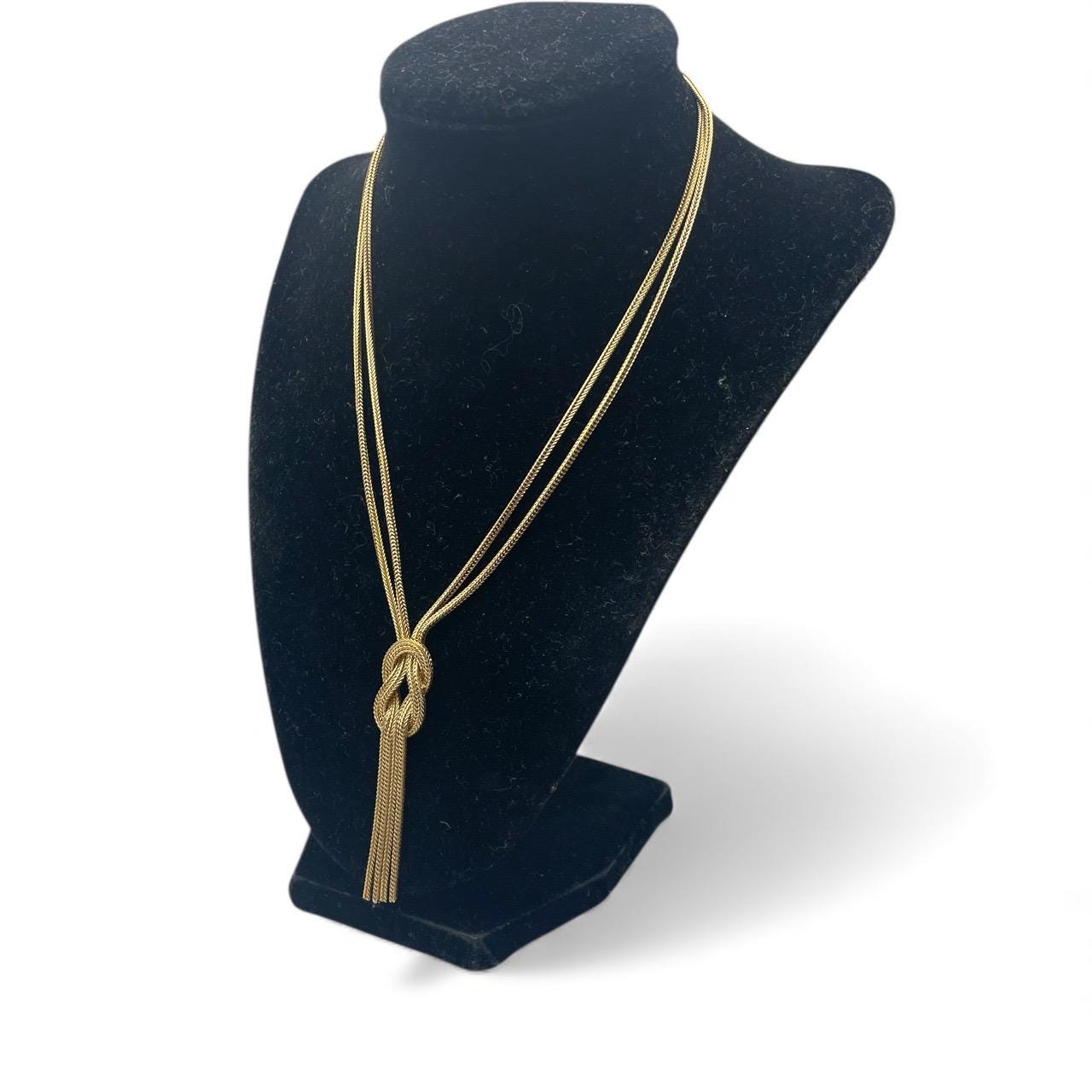 A simple and beautiful knotted gold filled necklace with a tassel dangle. This necklace was made by Rhythm and is 1990s in style. This necklace is 16'' long (choker length) before the square knot.