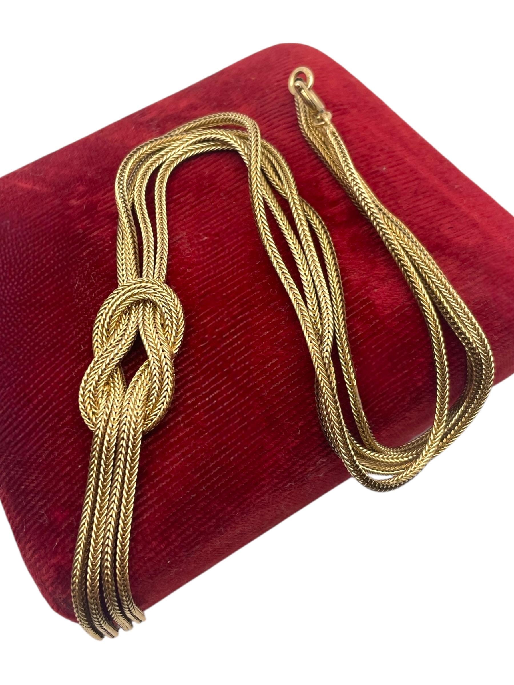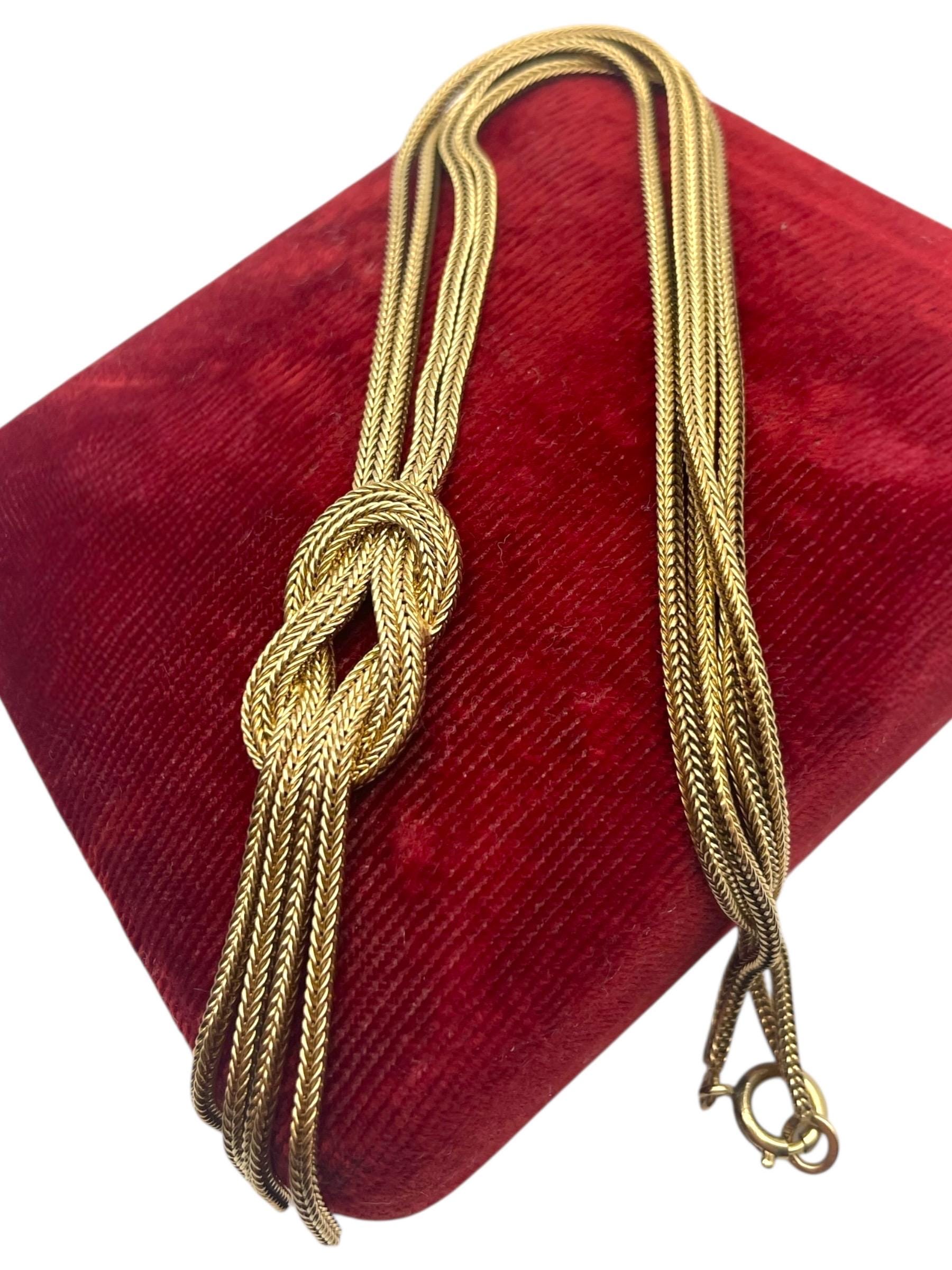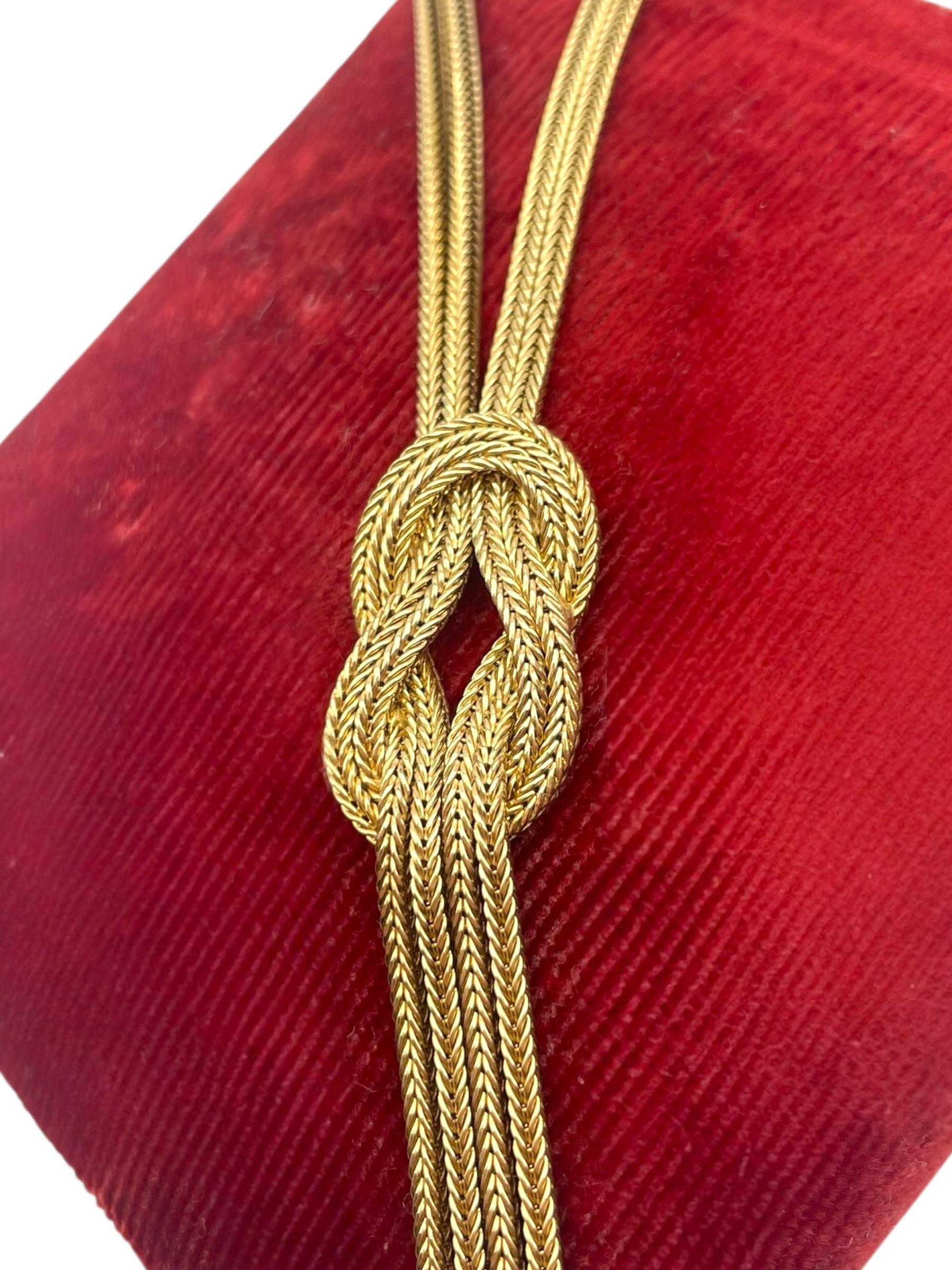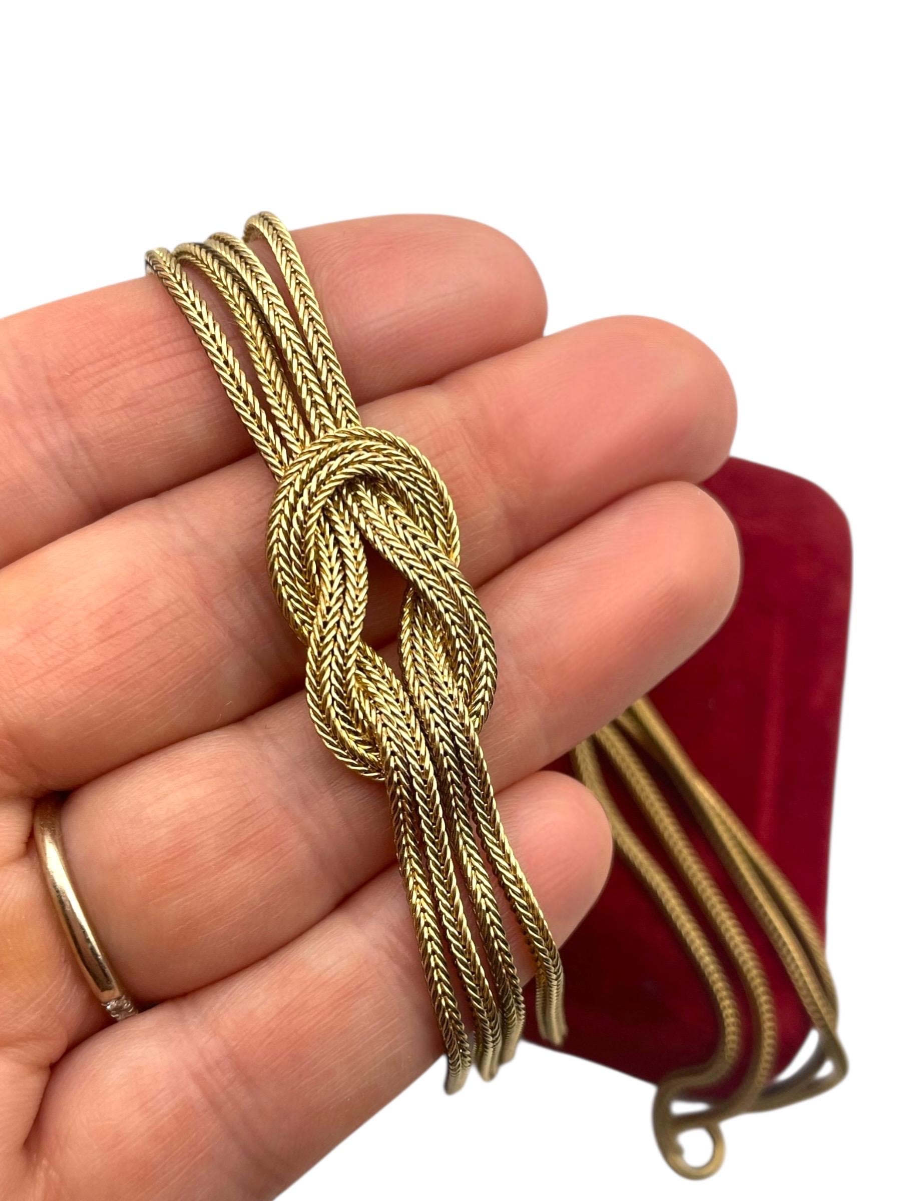 A simple and beautiful knotted gold filled necklace with a tassel dangle. This necklace was made by Rhythm and is 1990s in style. This necklace is 16'' long (choker length) before the square knot.