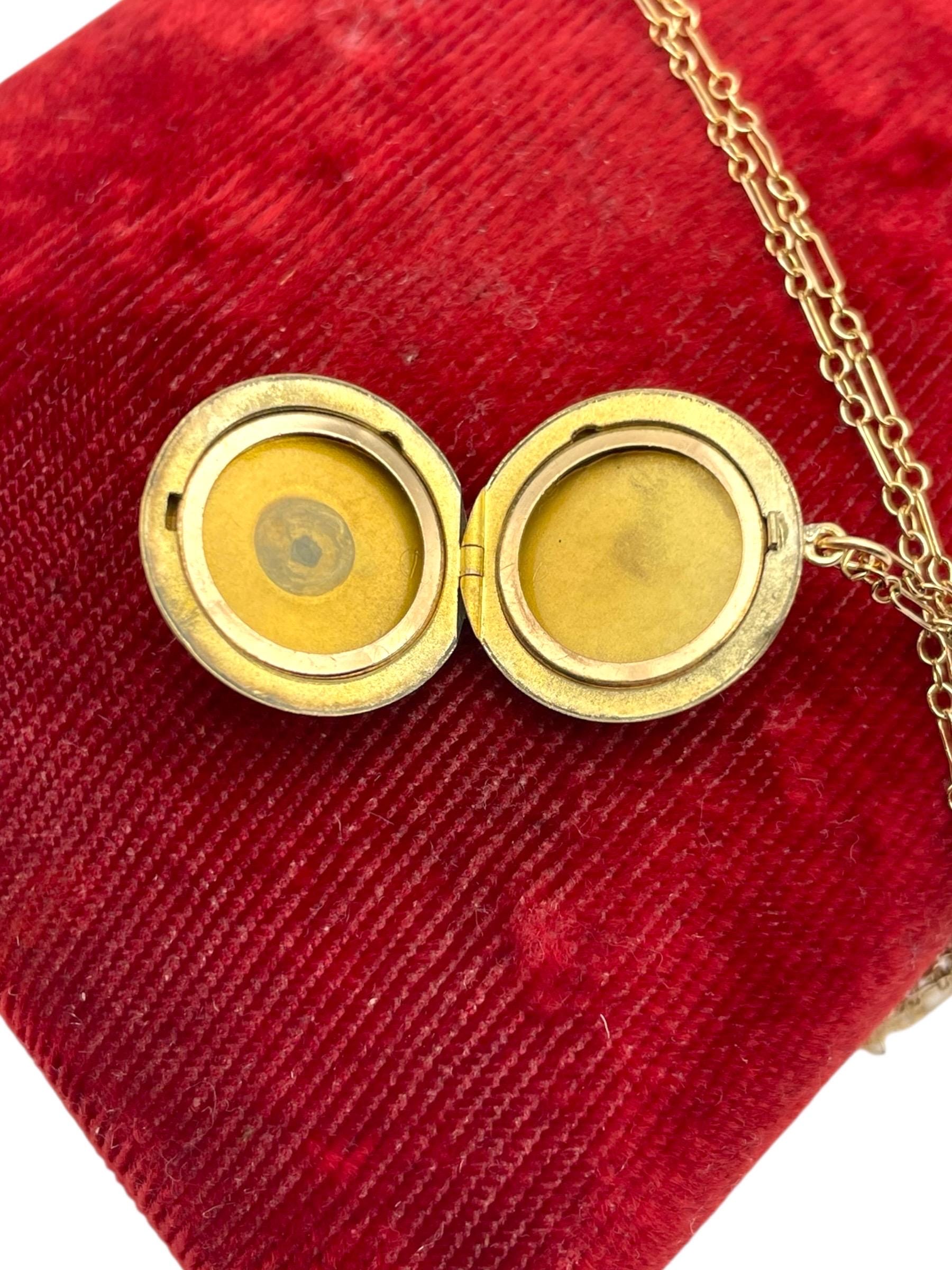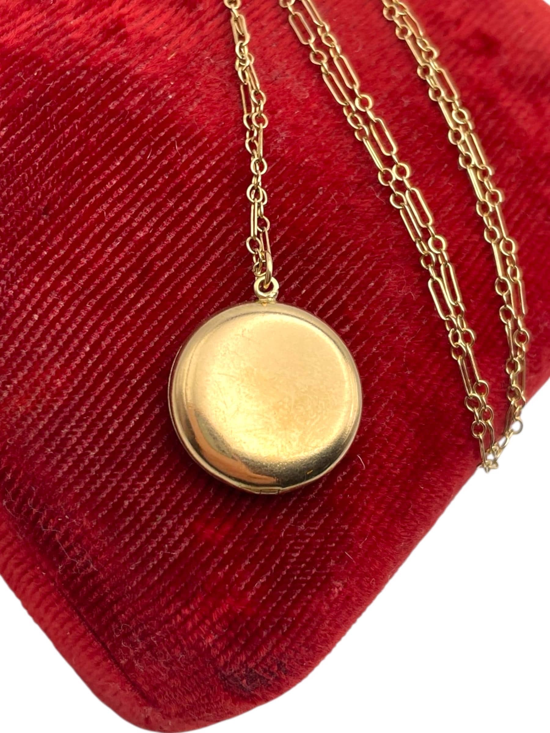 In nice antique condition with wear commensurate with vintage age which is circa early 1900s. There is some light wear on the back side of this antique locket as it is plain with no design. See photos for details. The chain is new and in great condition.