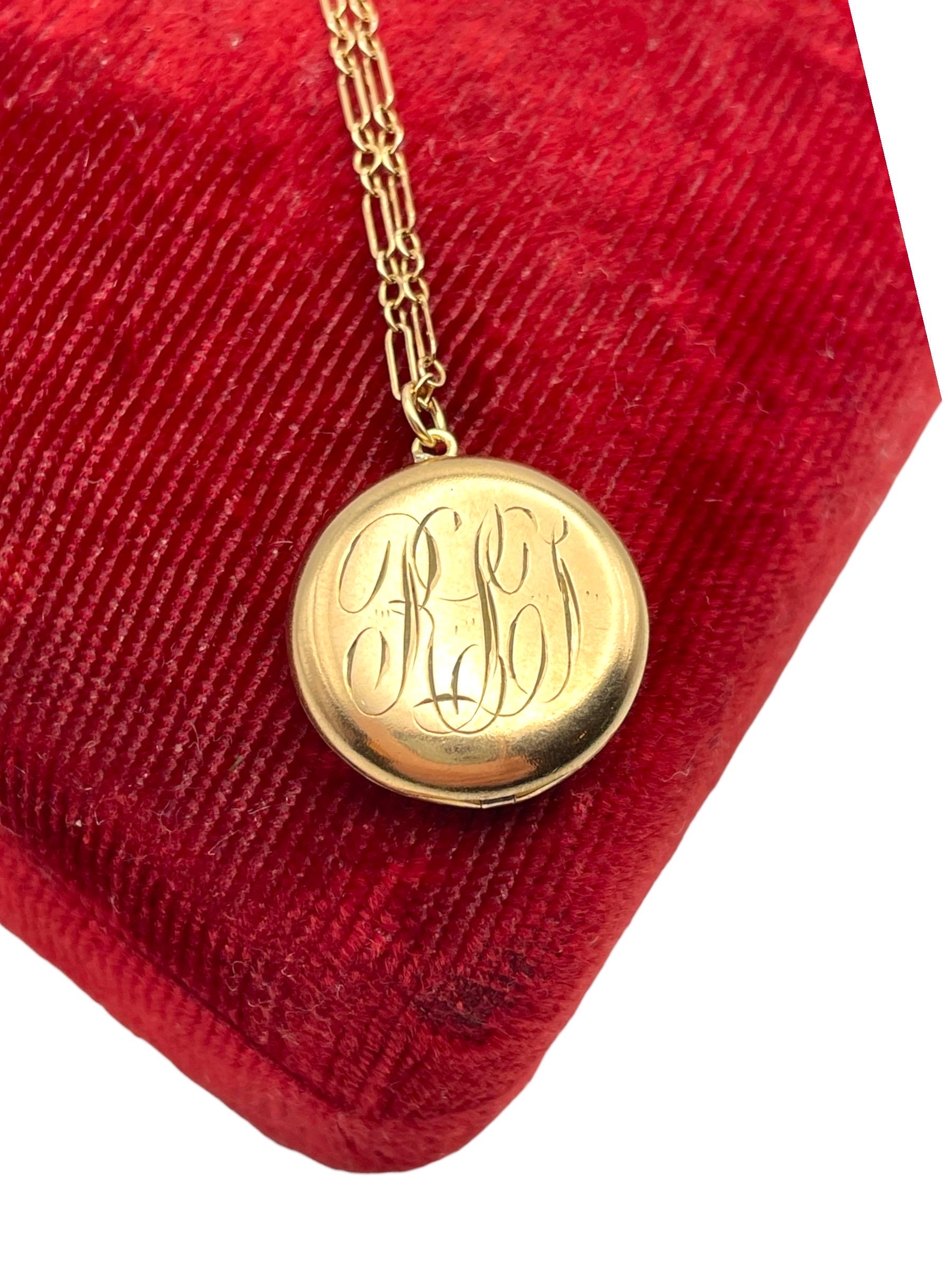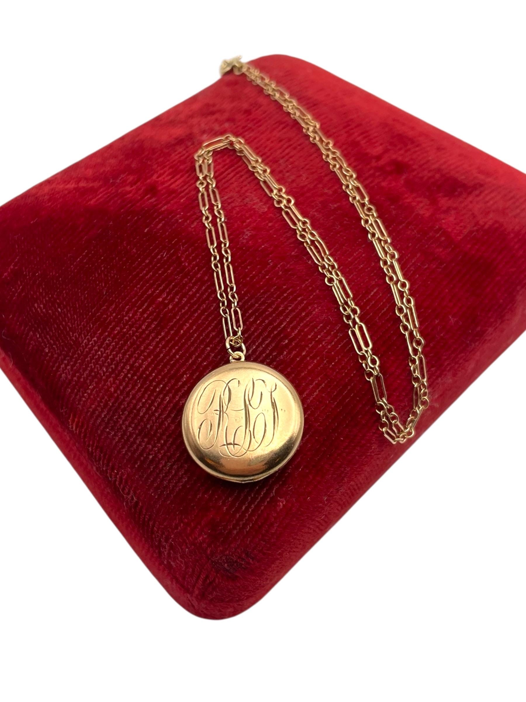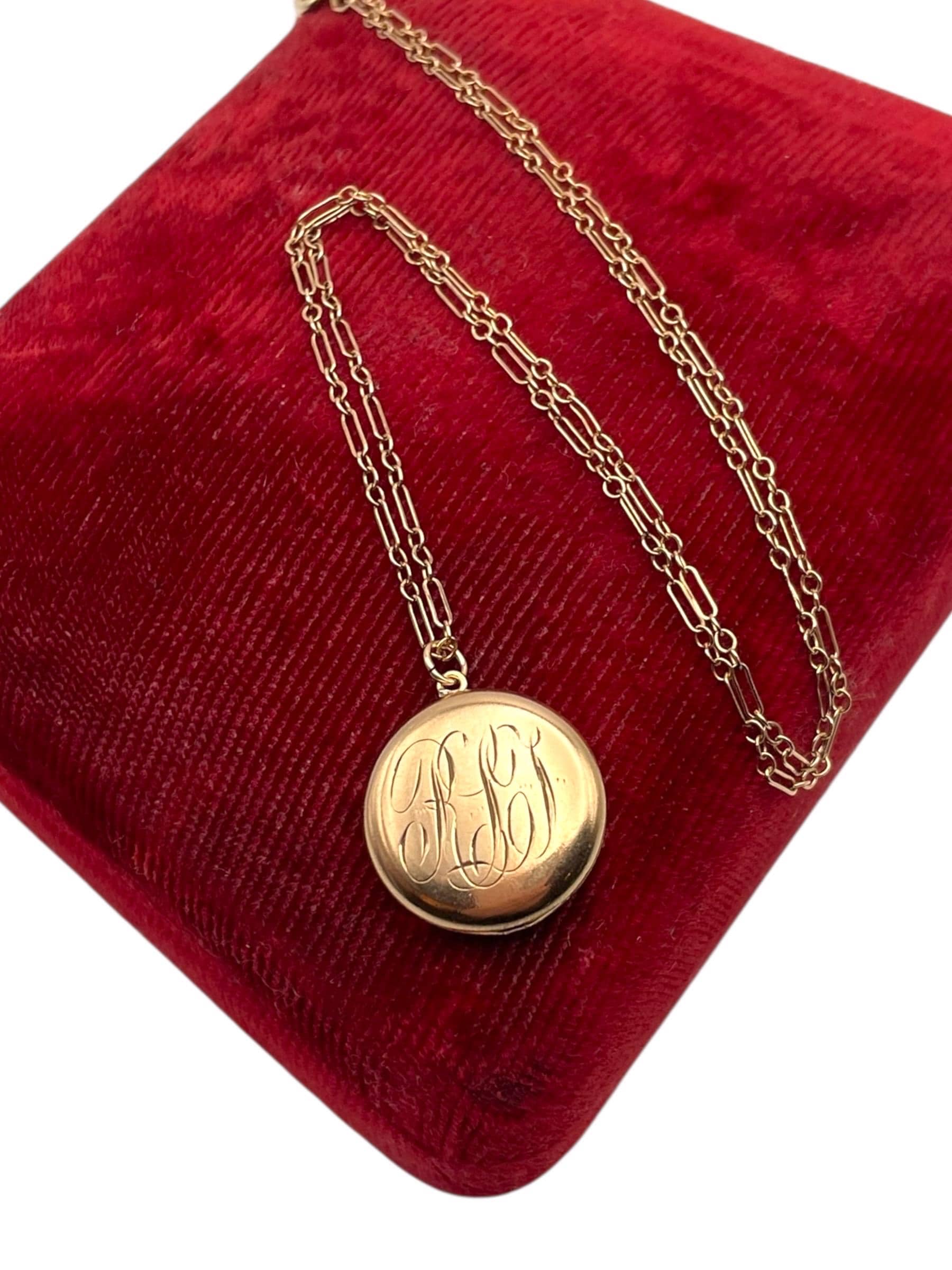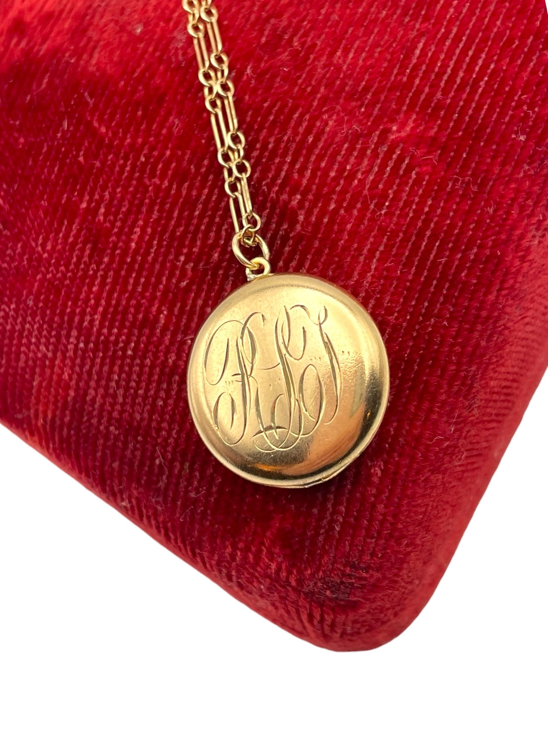 A sweet round antique gold filled locket featuring a monogrammed front with the initials "RLT” in an old cursive script hanging on a 12K gold filled specialty chain chain. The back side of this circa early 1900s locket is plain with no decoration.