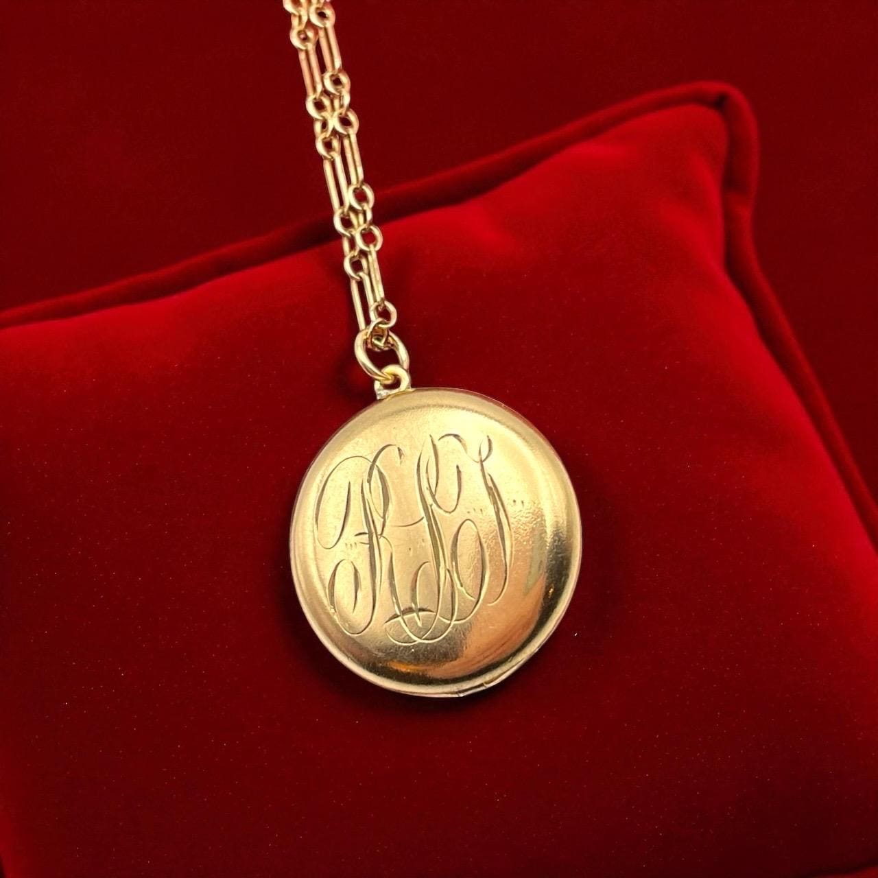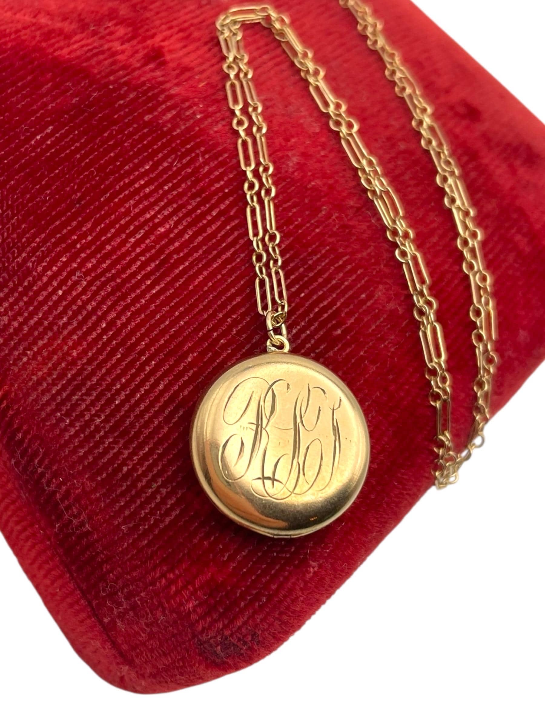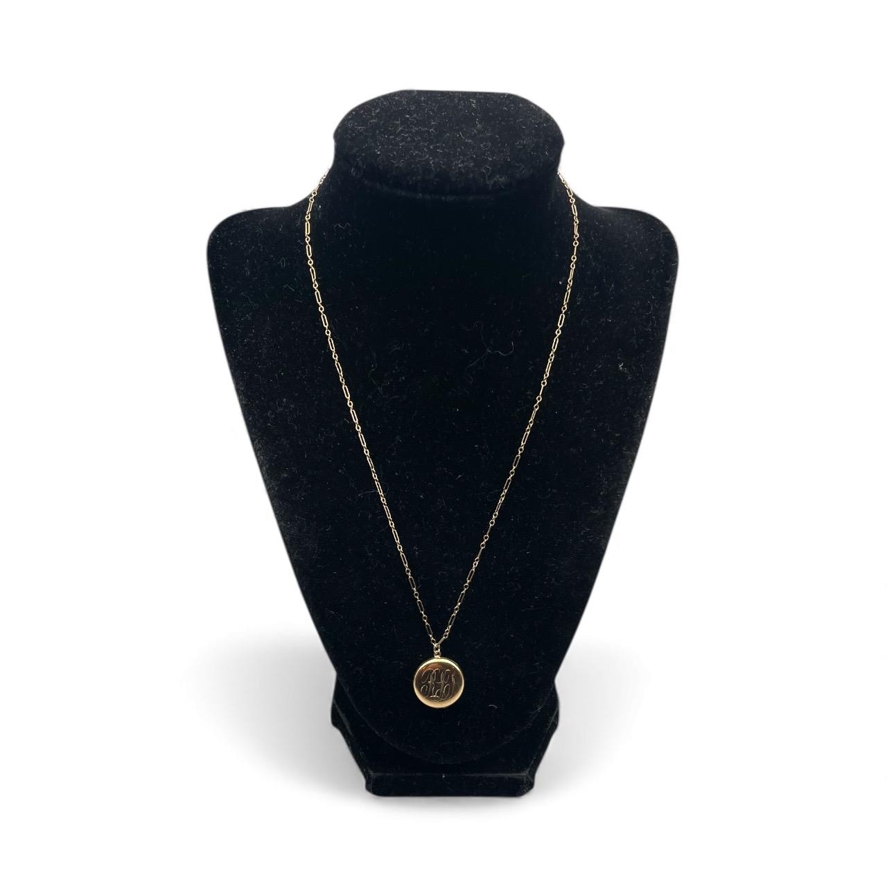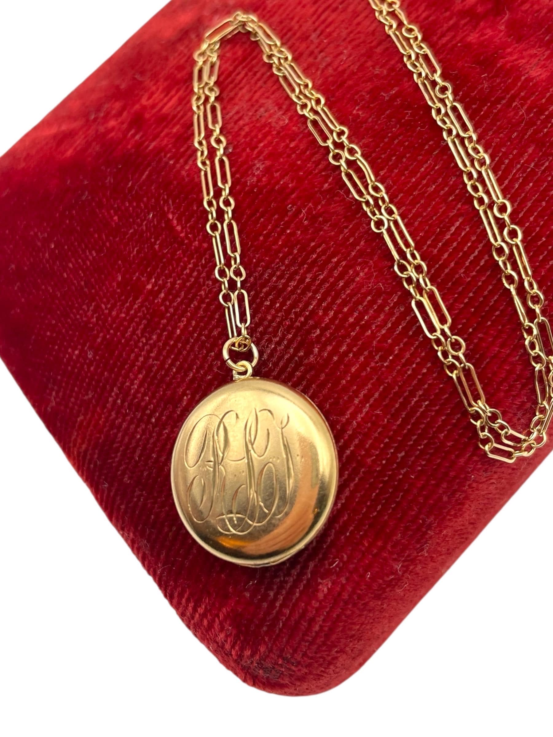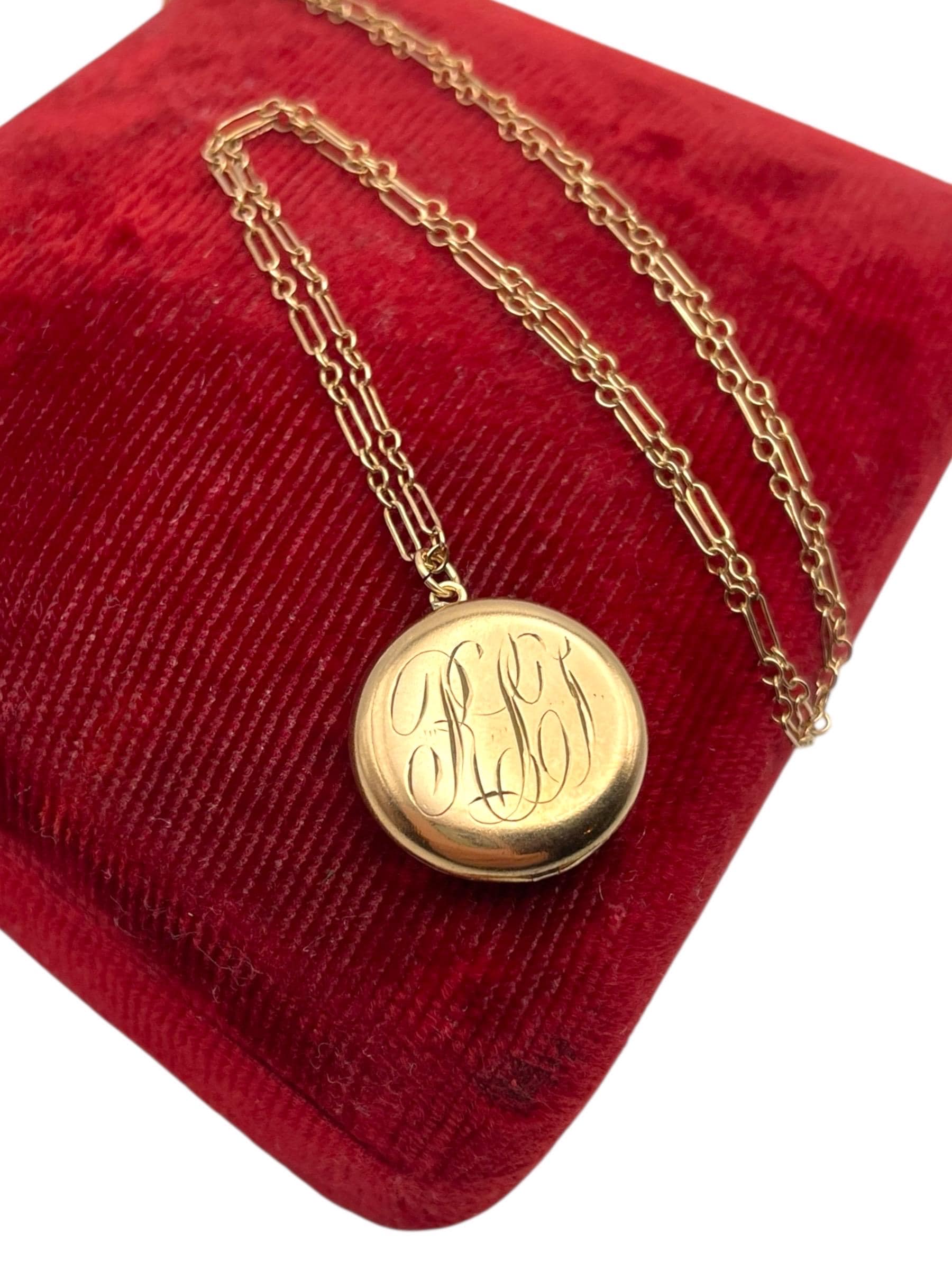 A sweet round antique gold filled locket featuring a monogrammed front with the initials "RLT” in an old cursive script hanging on a 12K gold filled specialty chain chain. The back side of this circa early 1900s locket is plain with no decoration.