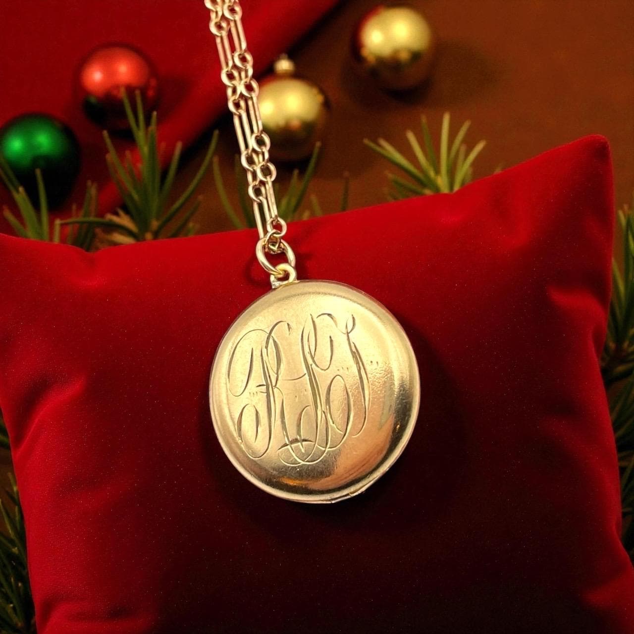 This type of monogrammed item was very popular during the Edwardian era (early 1900s). This locket still has the original photo frames and plastic covers intact.