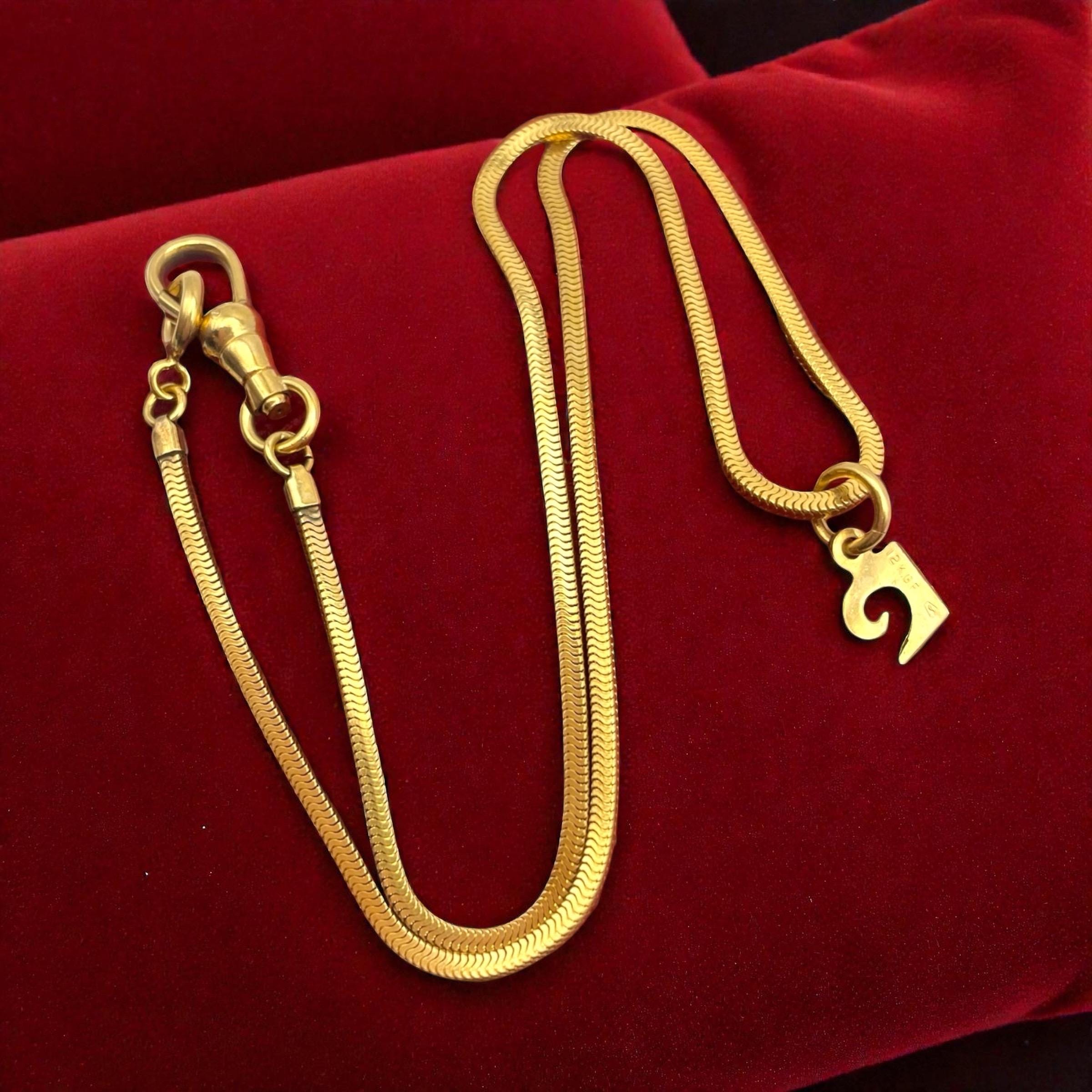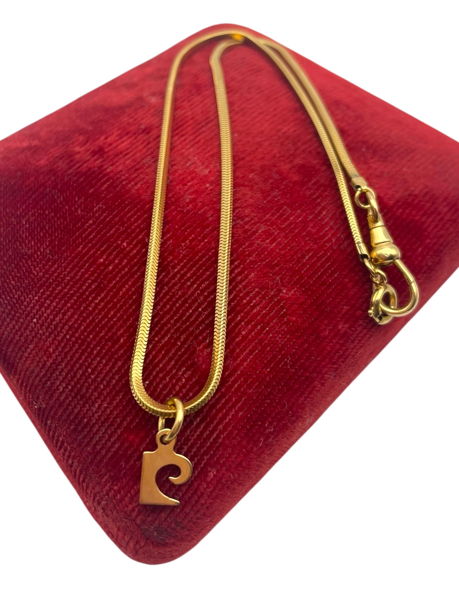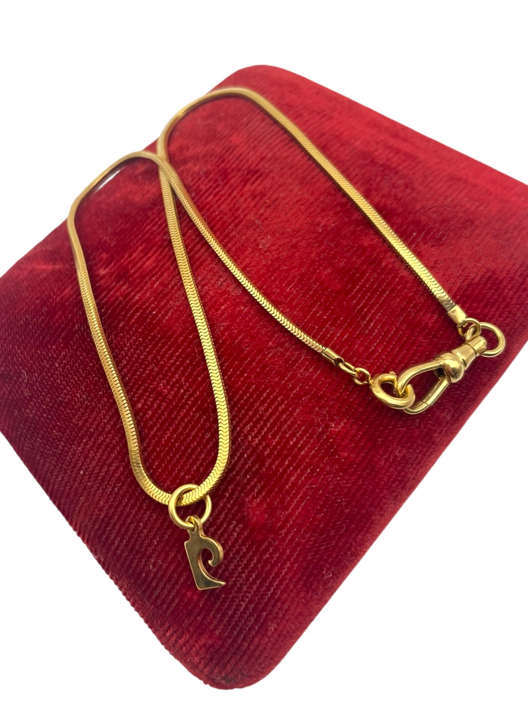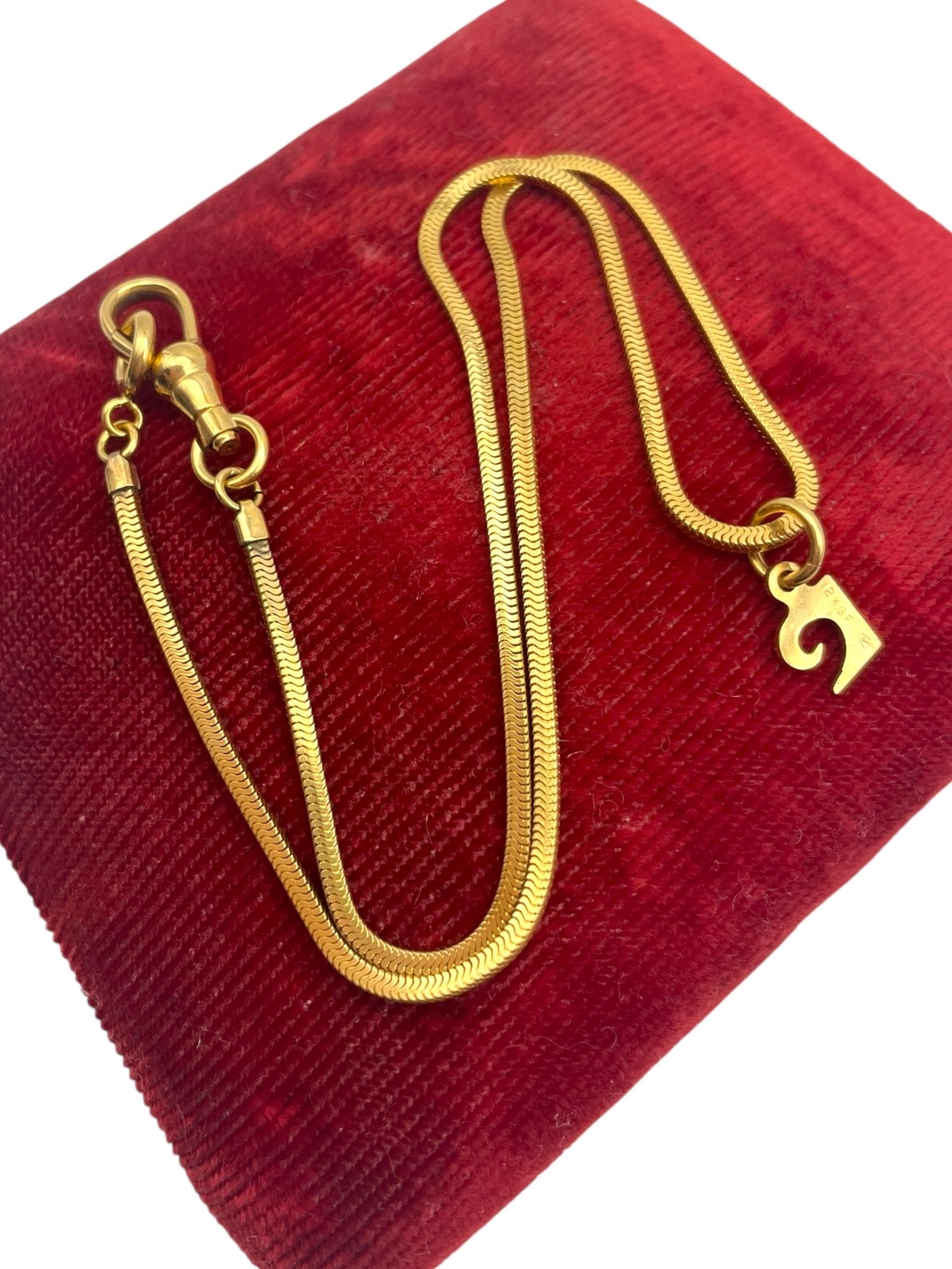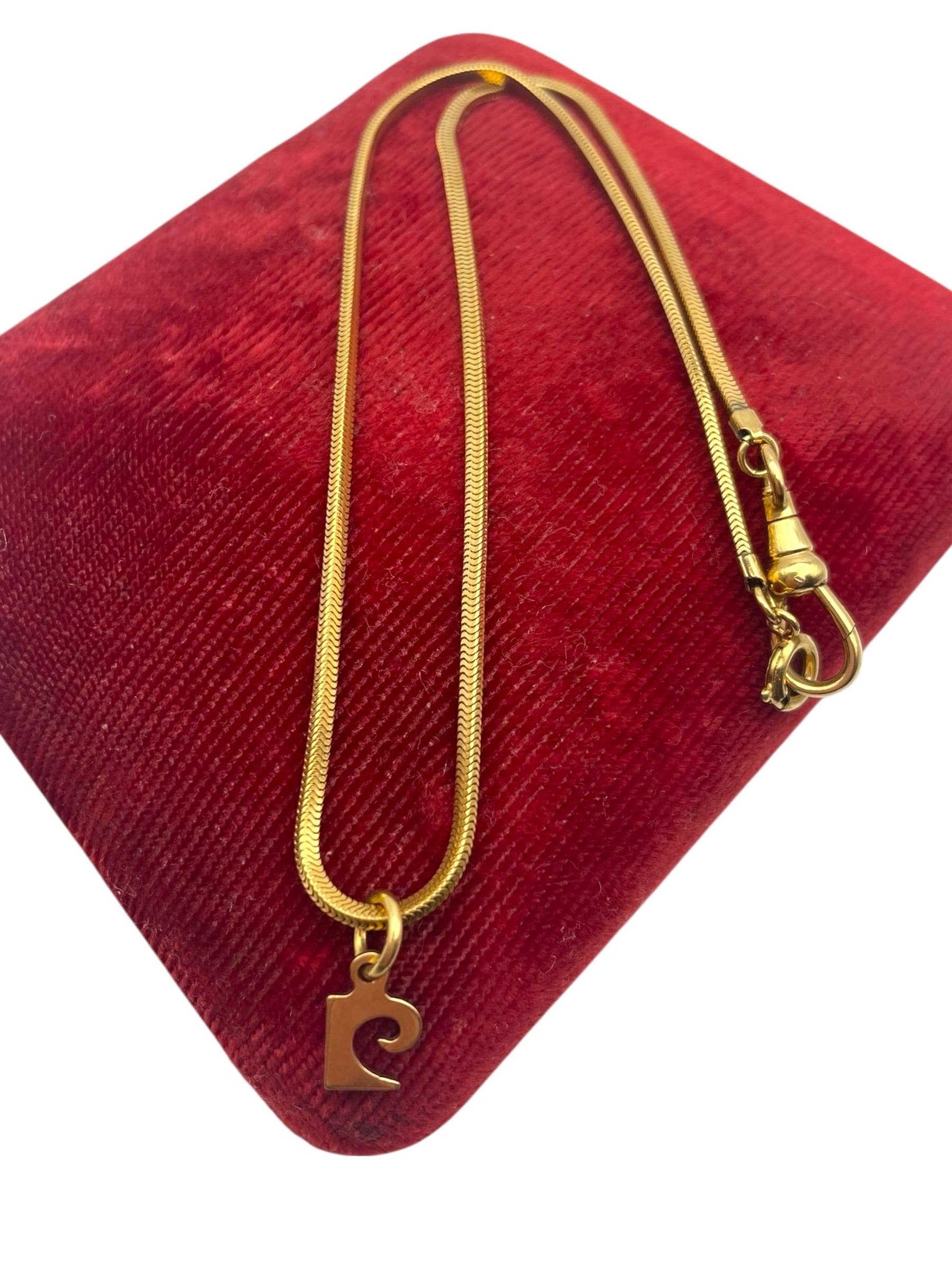 Description: Awesome vintage Pierre Cardin gold filled snake chain with dog clip, small Pierre Cardin charm attached. Sleek and modern snake chain necklace that can be worn alone or layered with others. Marked 12K Gold filled and signed by Pierre Cardin.