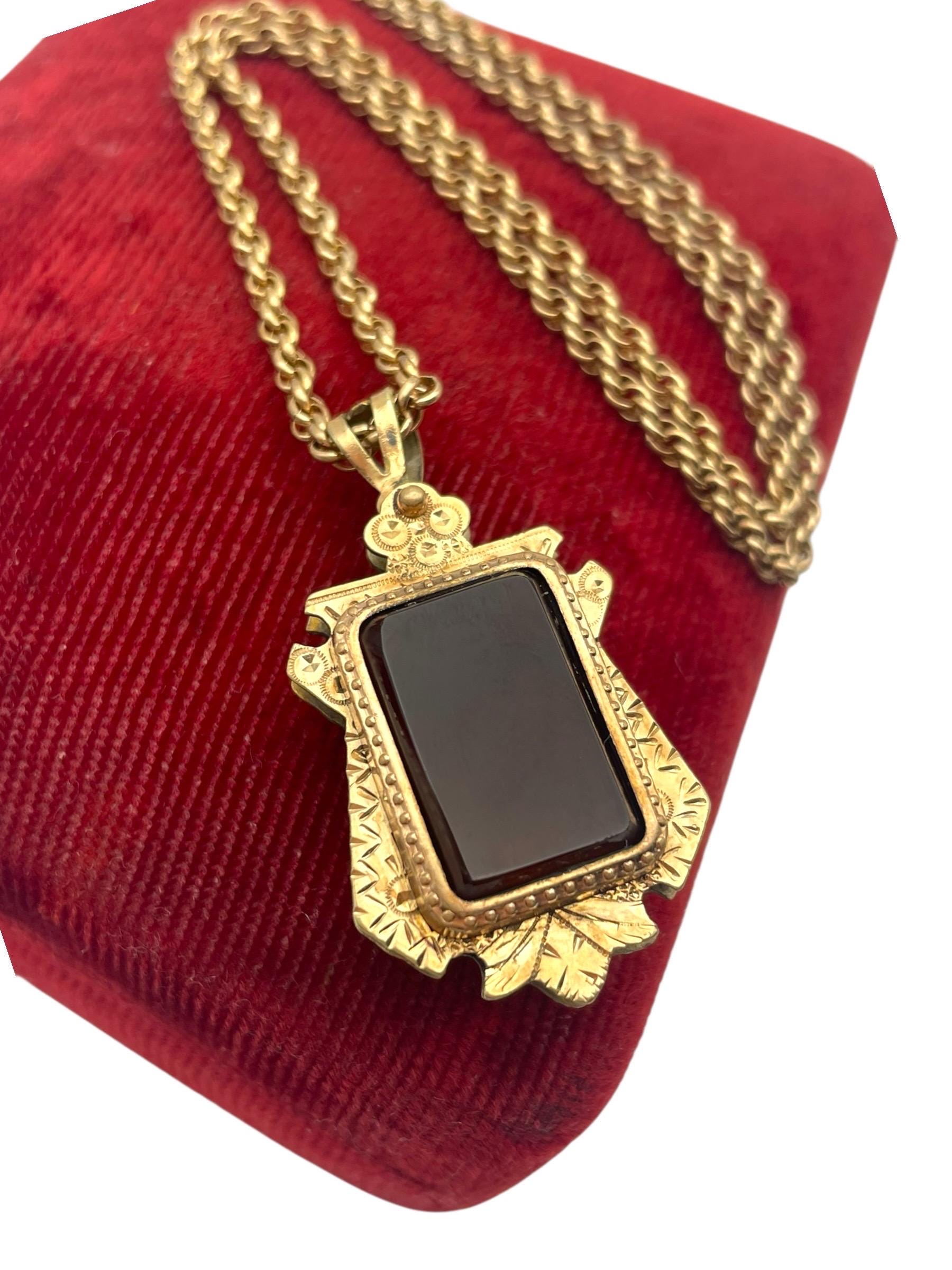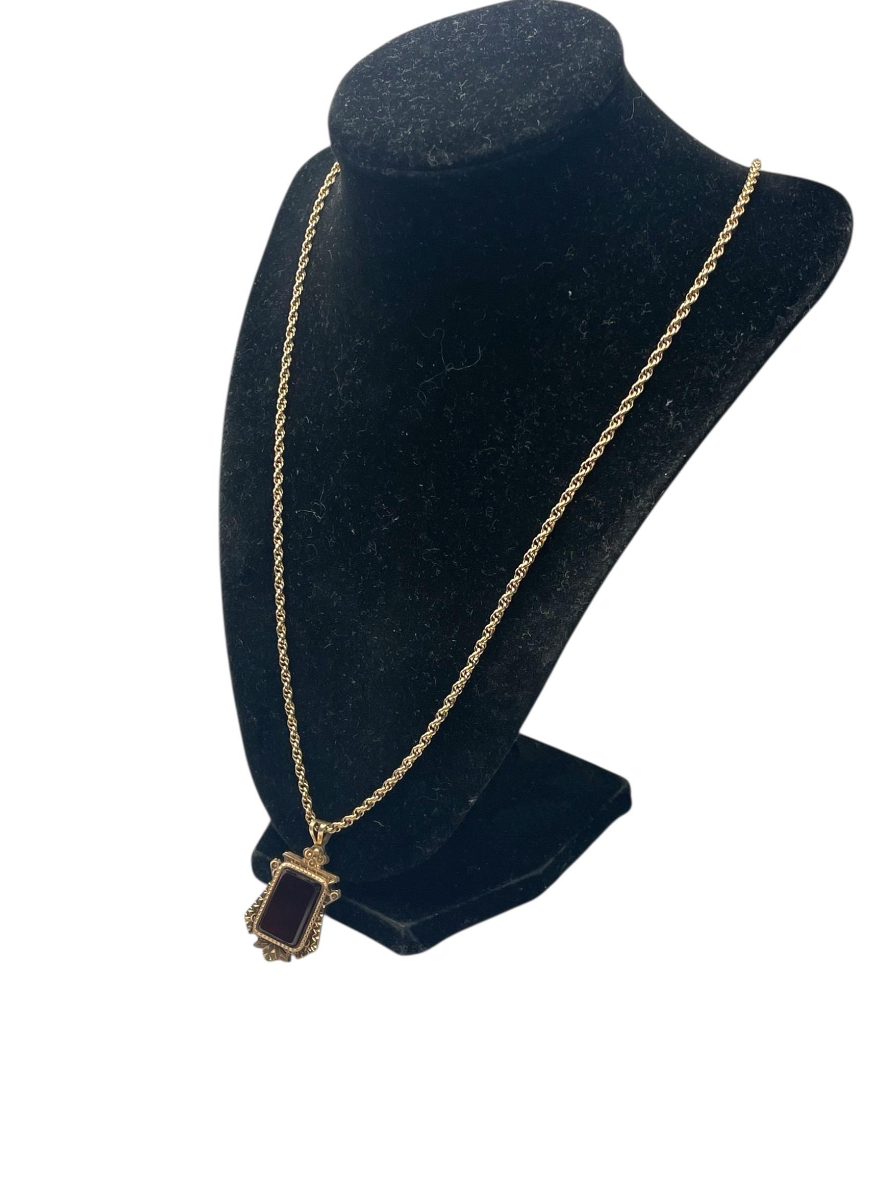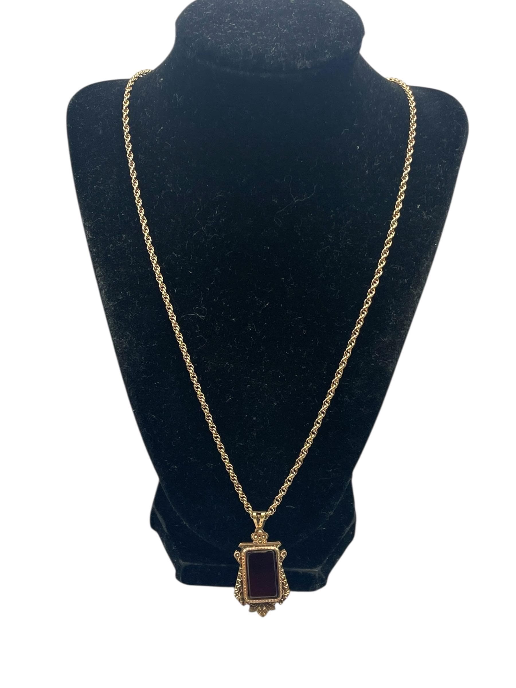 Lovely fob necklace with a rectangle stone center and a shield shape that features 2 unique sides. Both have decorative gold edges with etched designs while the centers are rectangular stones. One side is a red/orange color and appears to be Carnelian while the other is darker (almost black) but is a very dark brown with red undertones when you look very closely.