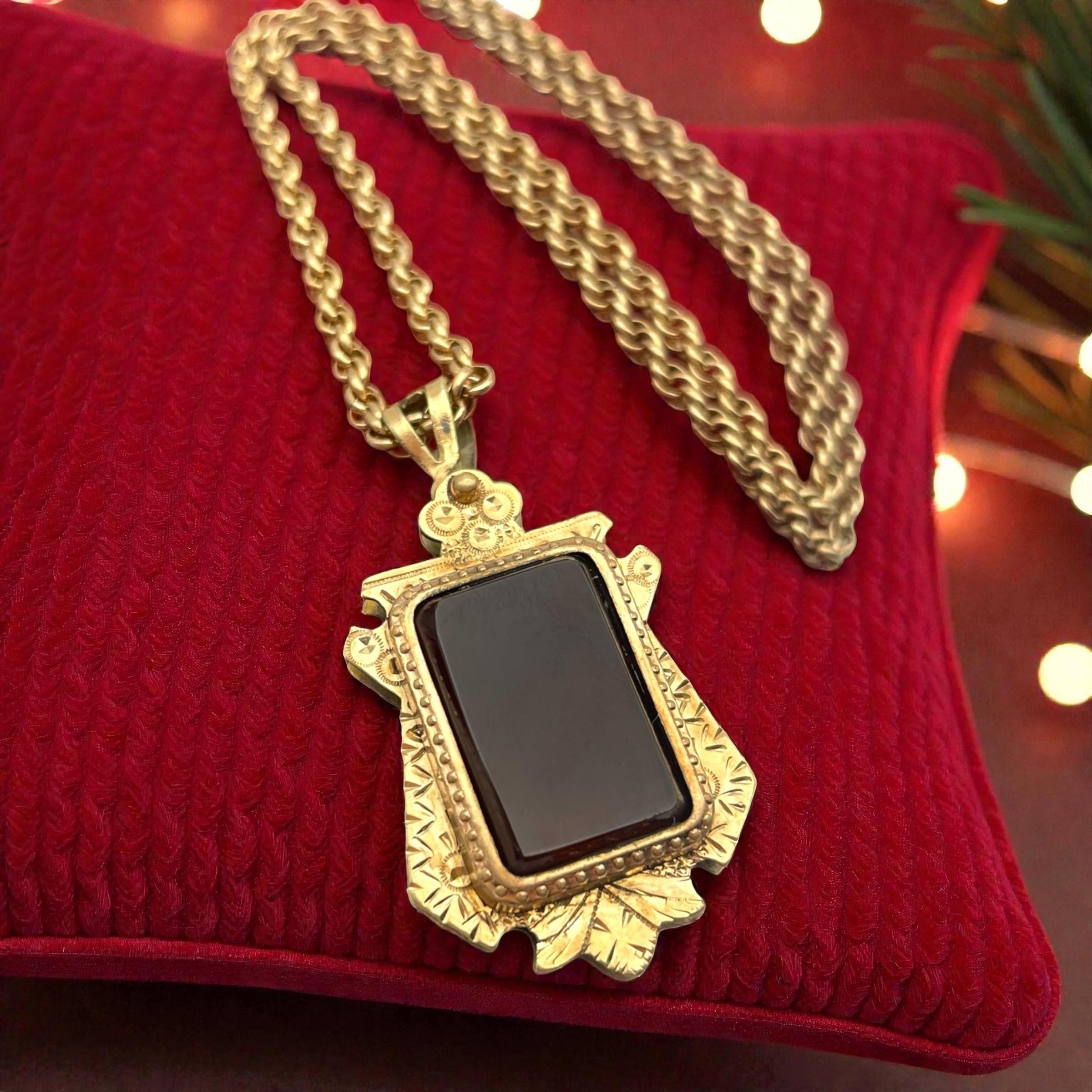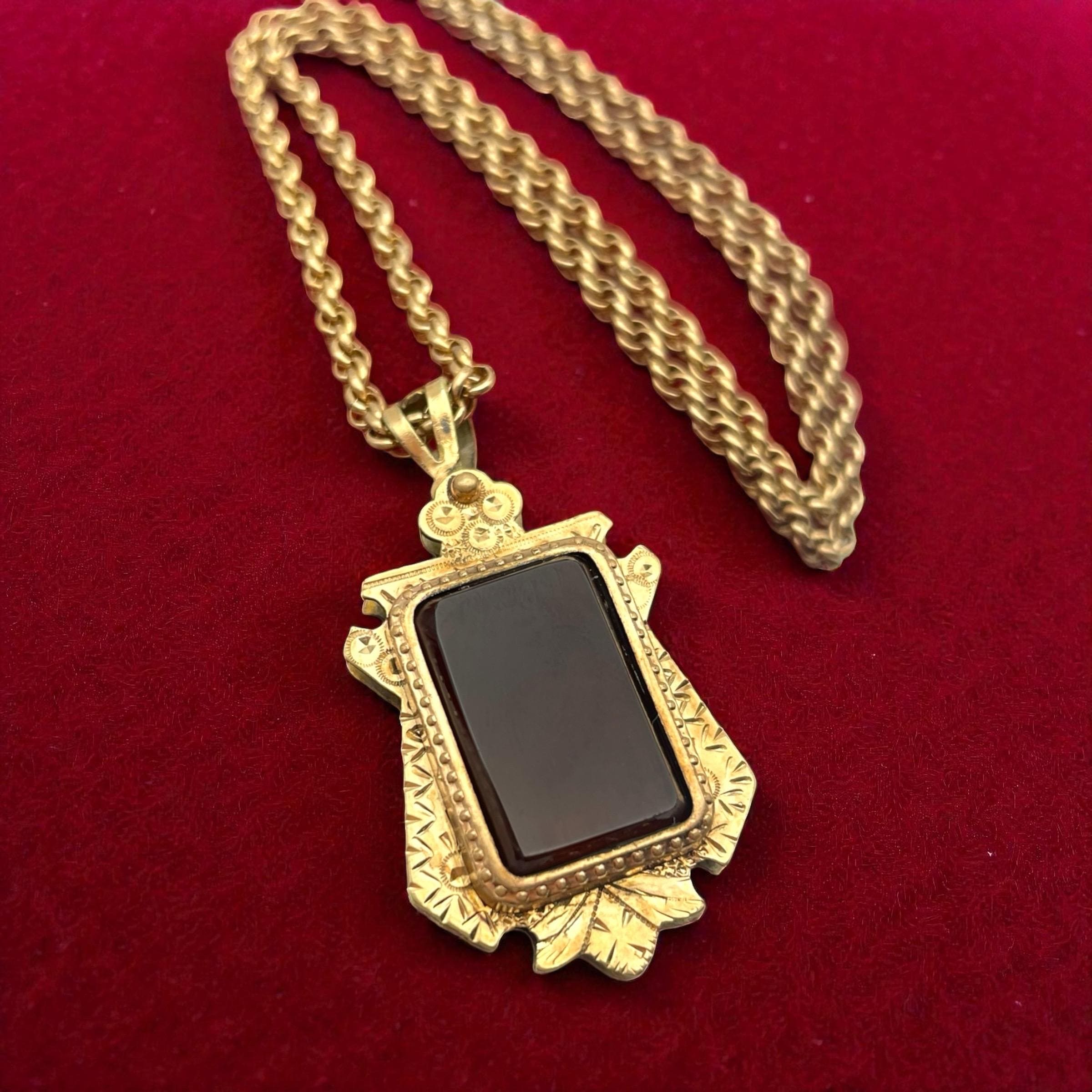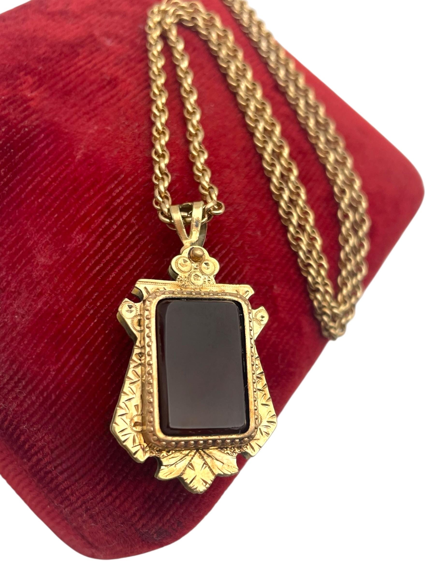 Lovely fob necklace with a rectangle stone center and a shield shape that features 2 unique sides. Both have decorative gold edges with etched designs while the centers are rectangular stones. One side is a red/orange color and appears to be Carnelian while the other is darker (almost black) but is a very dark brown with red undertones when you look very closely.