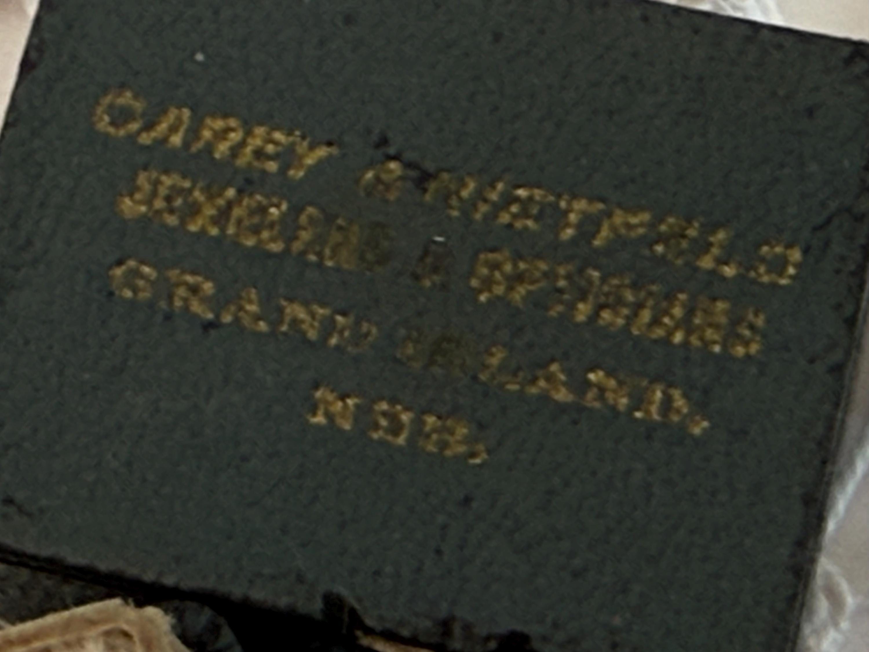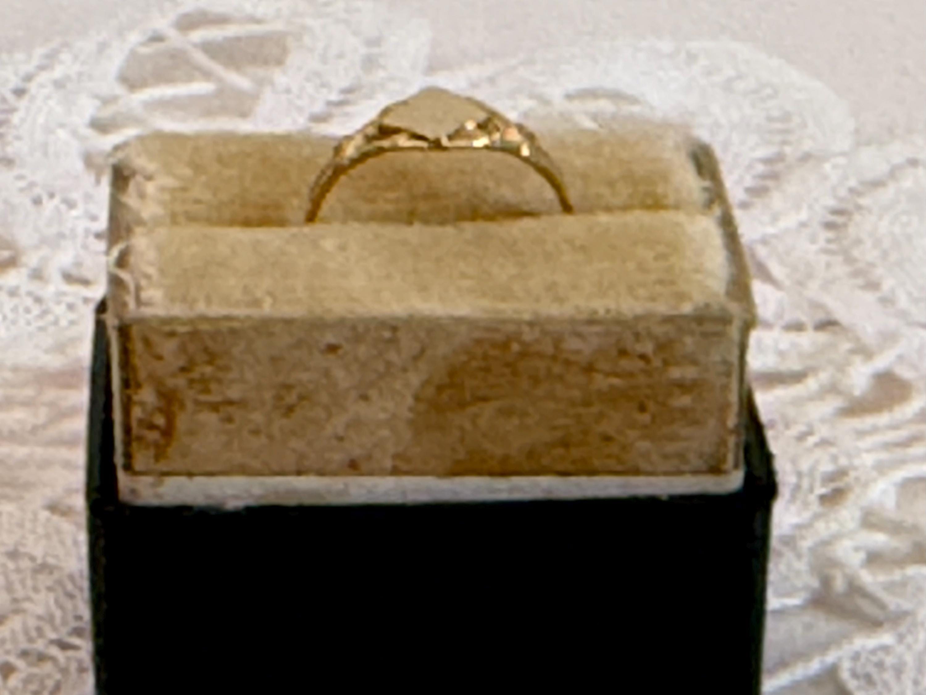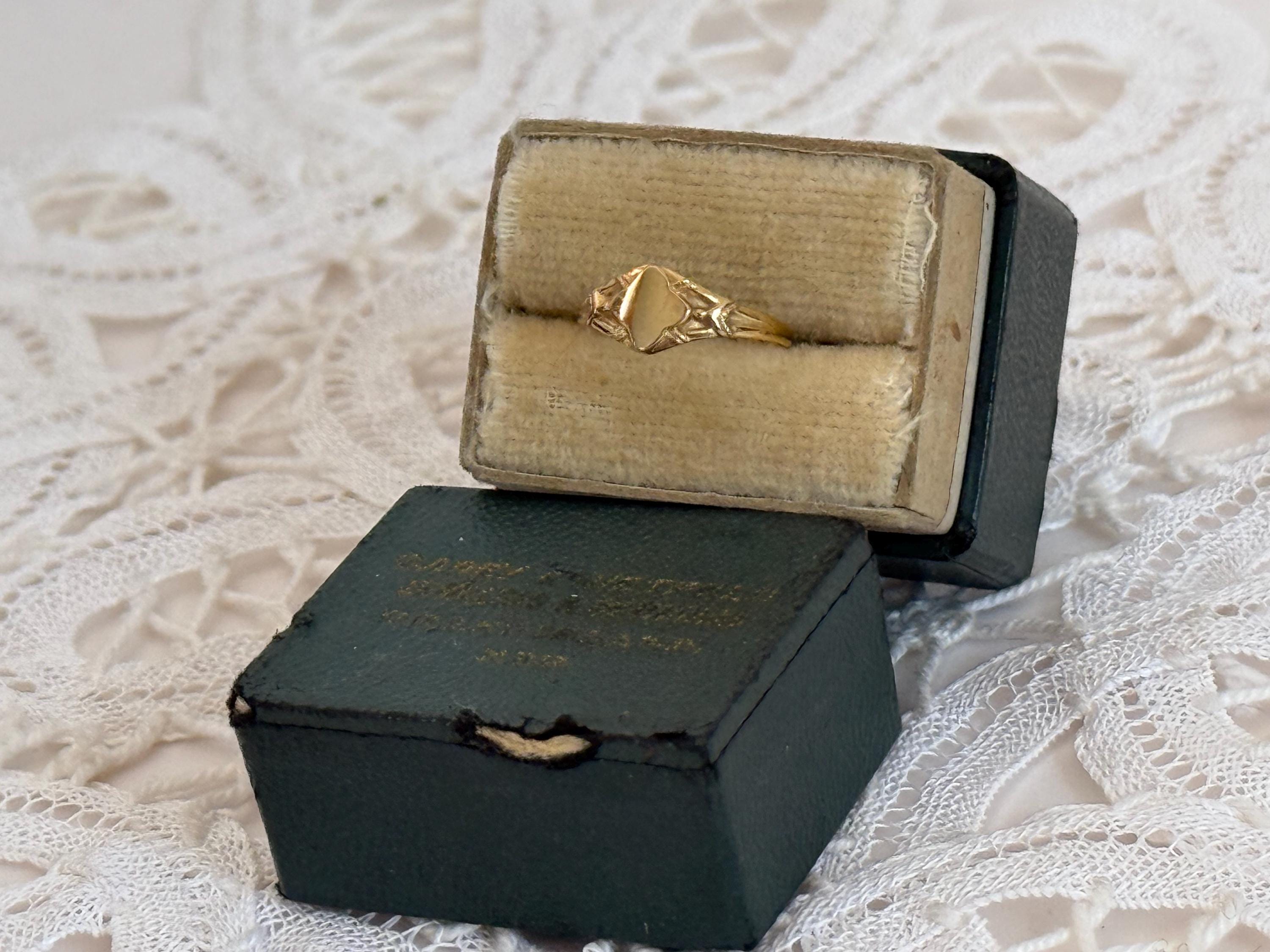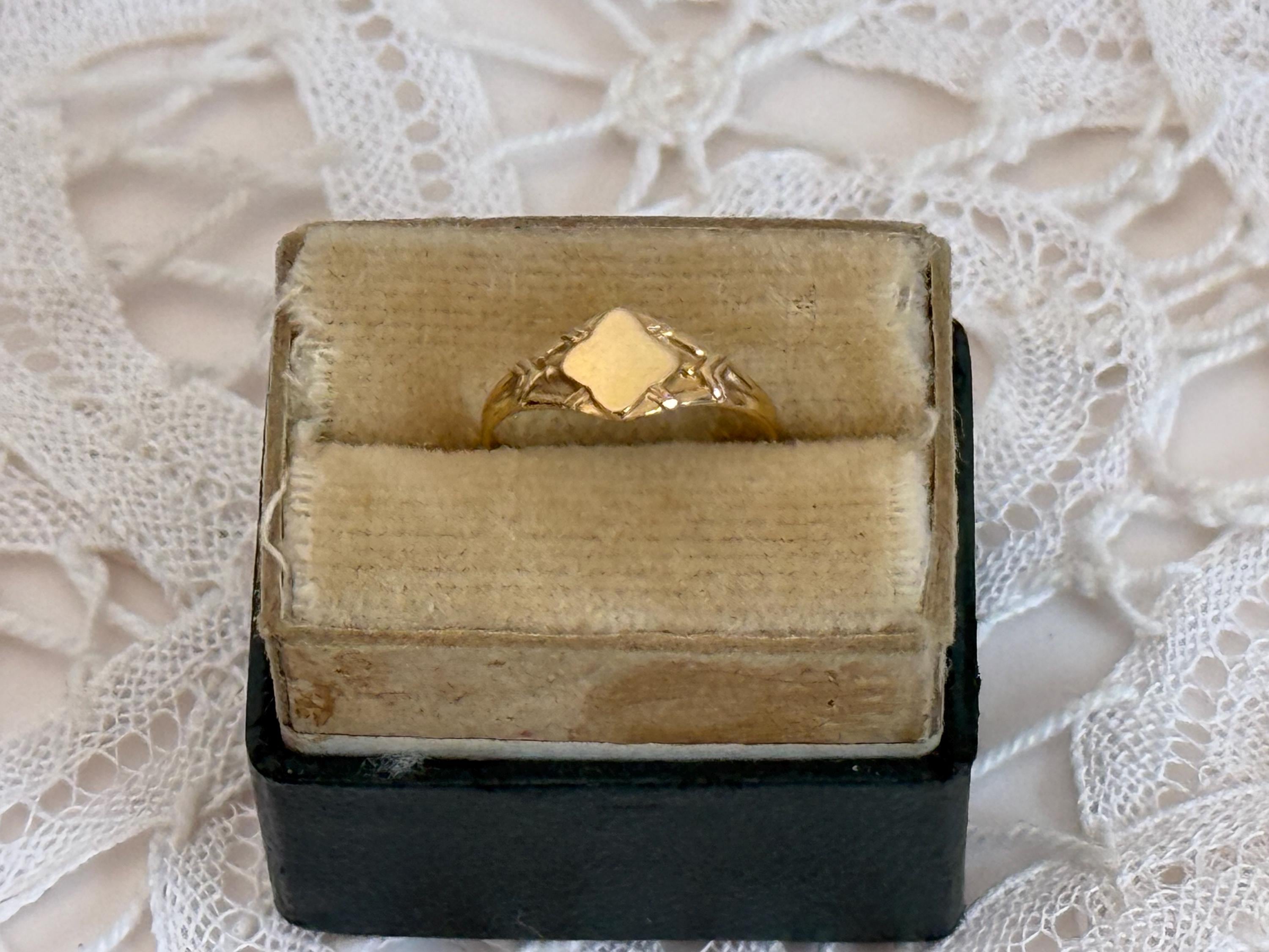Antique 10K yellow gold baby signet ring. This is a VERY small size, meant for a baby. This tiny (size .5 or 1/2) ring features an oval center and ornate raised shoulders. It comes with its jeweler’s presentation box. The box is stamped on the top, “CAREY & NIETFELD JEWELERS & OPTICIANS GRAND ISLAND, NEB”.