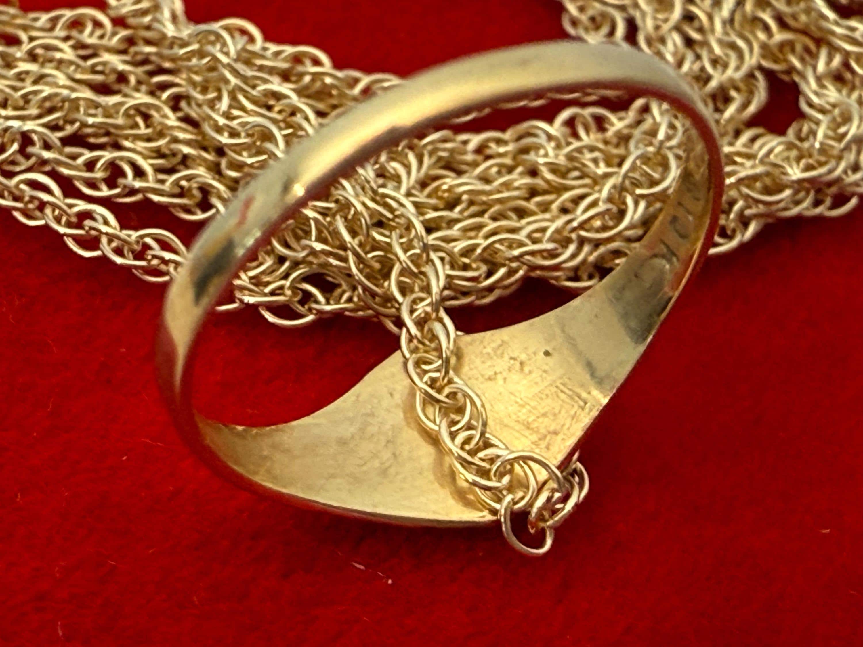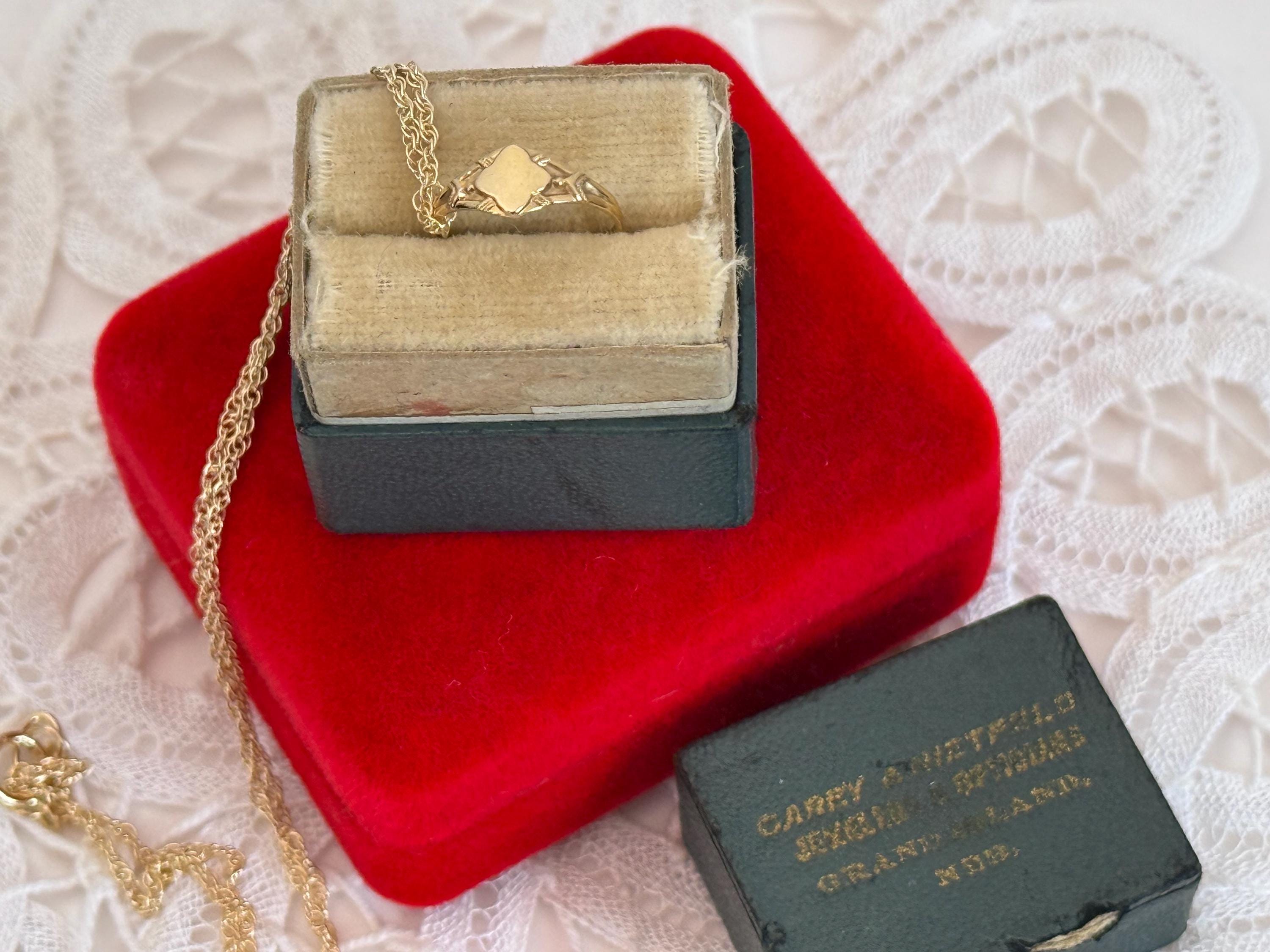 This adorable little gold ring is circa early 1900s. The chain is new.
