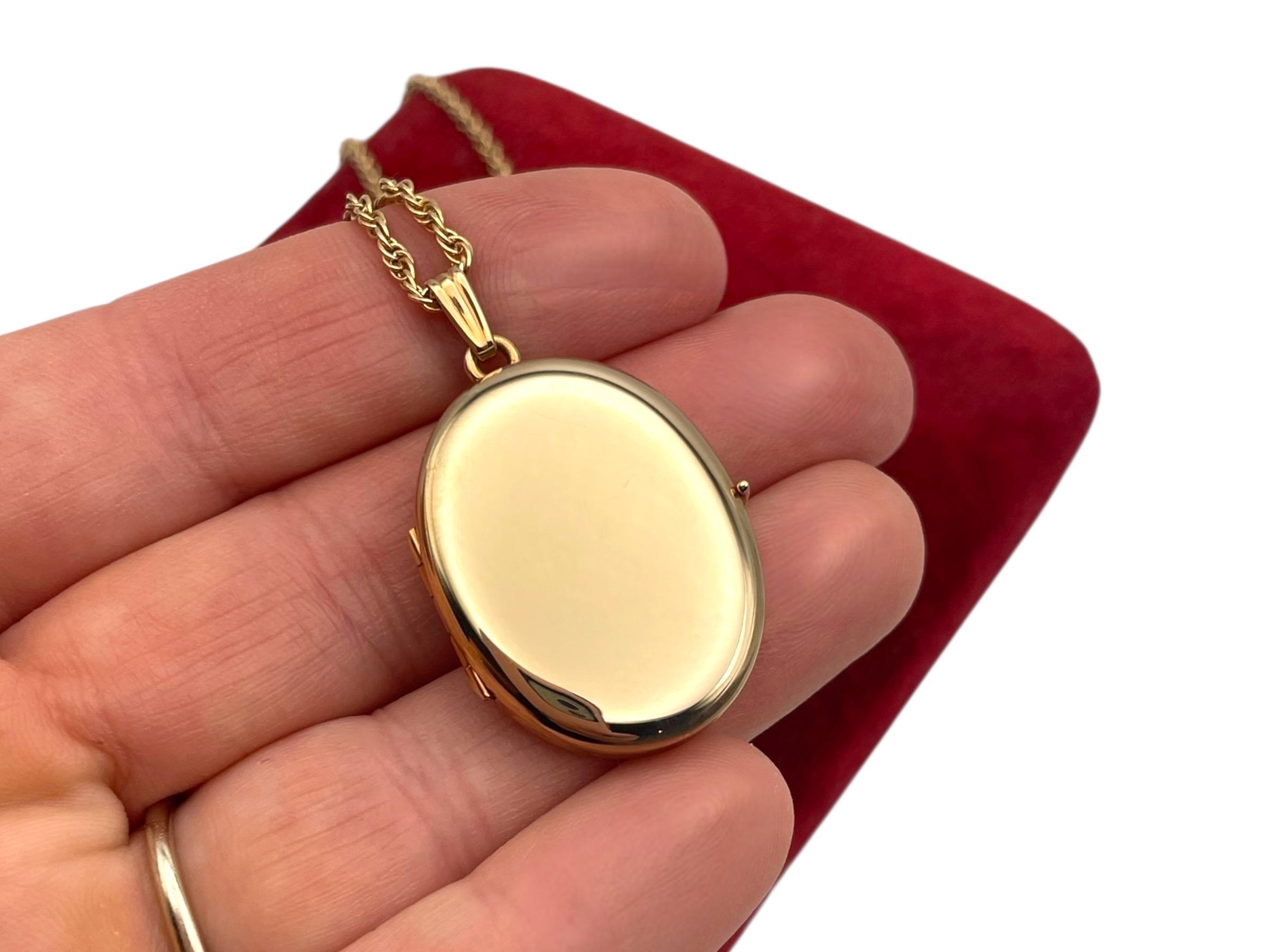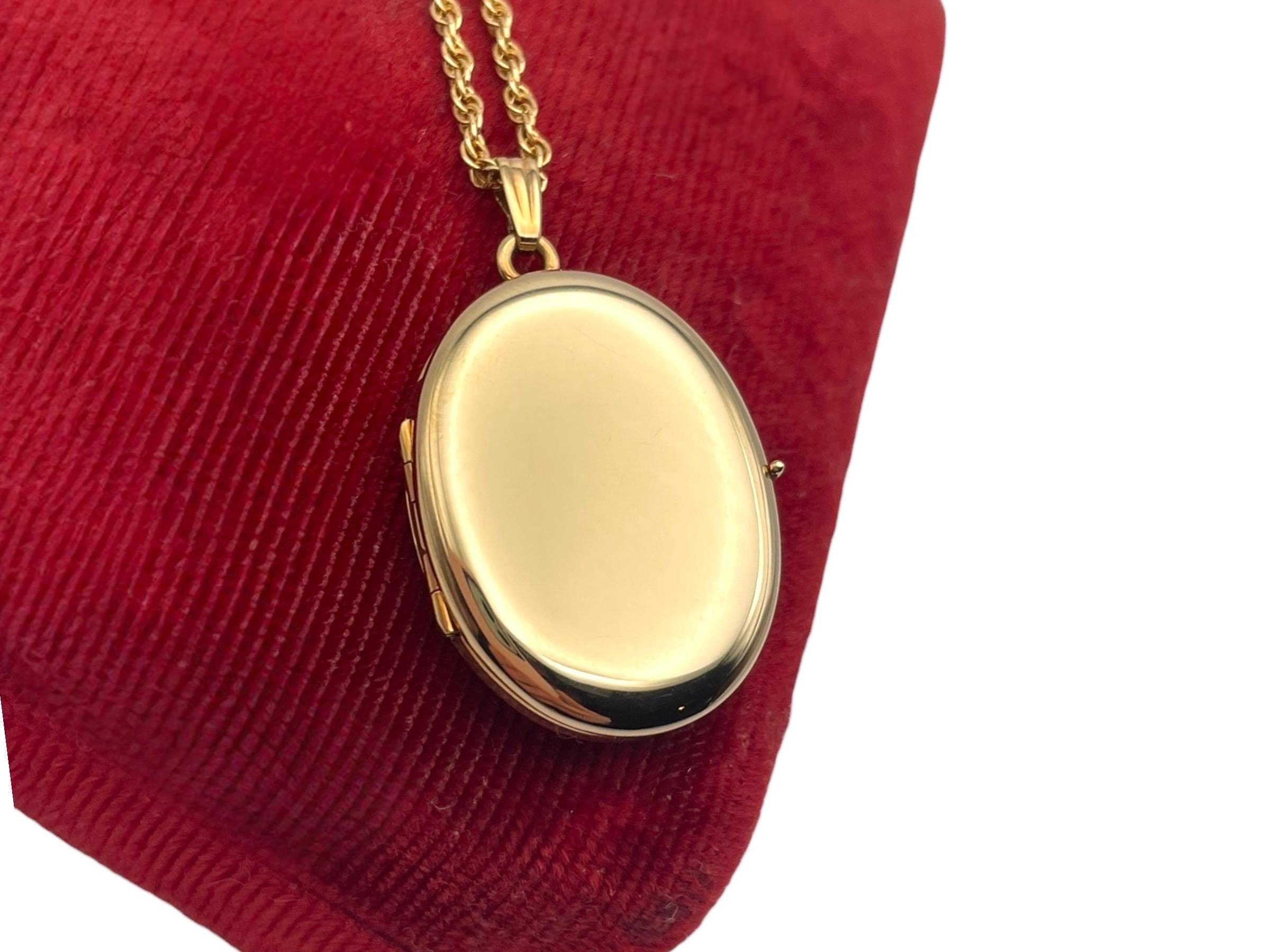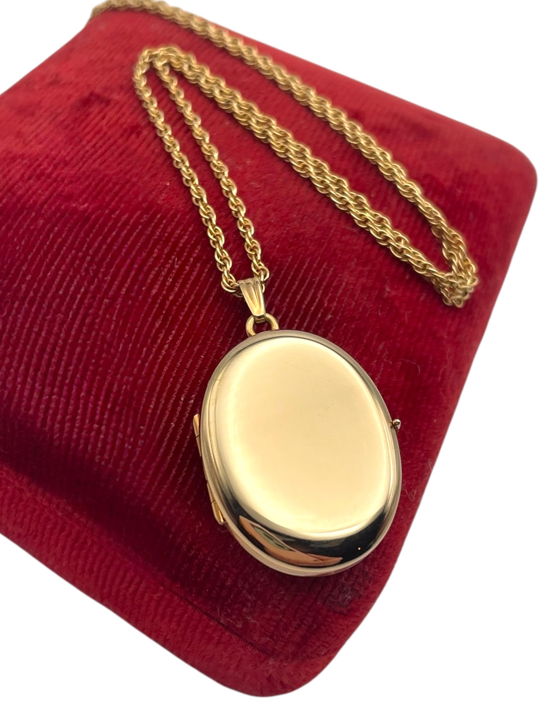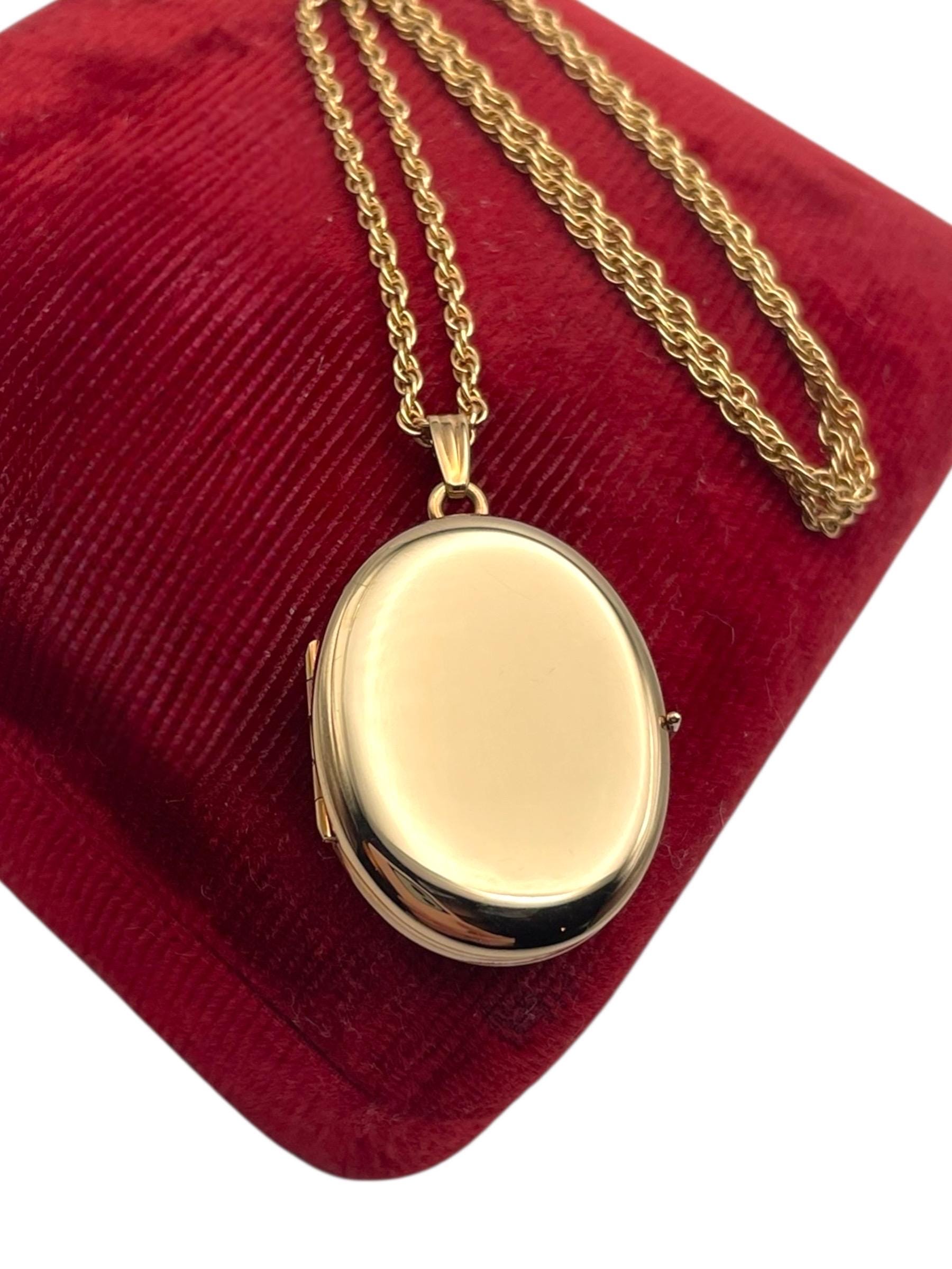 A classic vintage 14K gold filled oval shaped locket necklace that holds 4 photos. The front and back are both shiny gold, with no design.