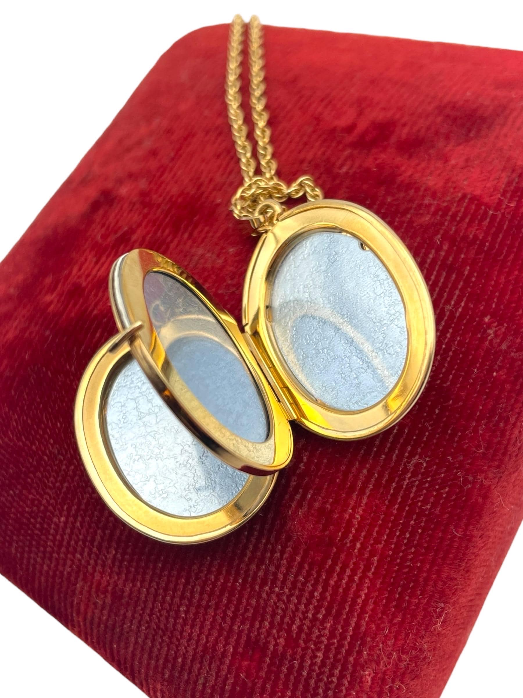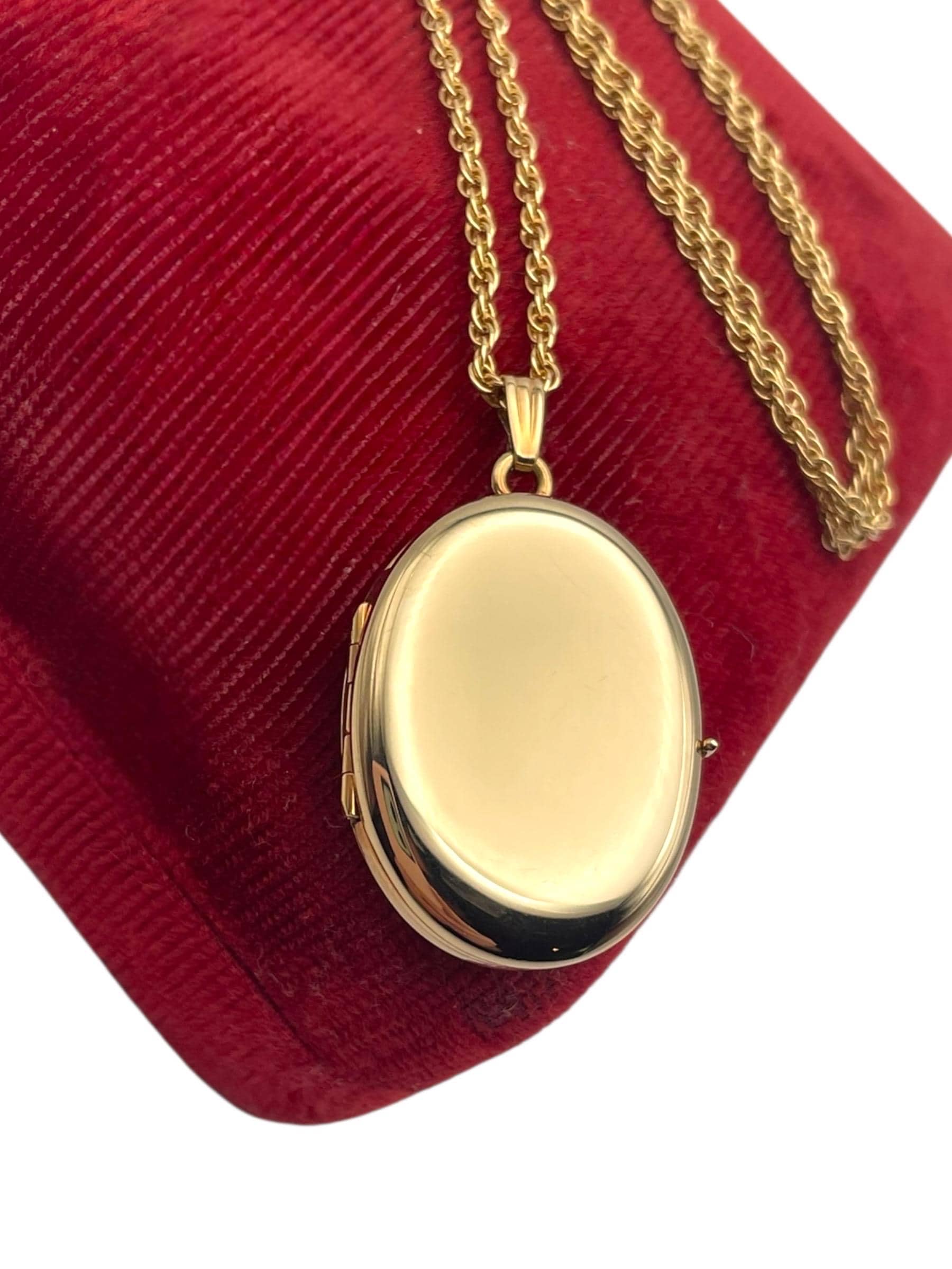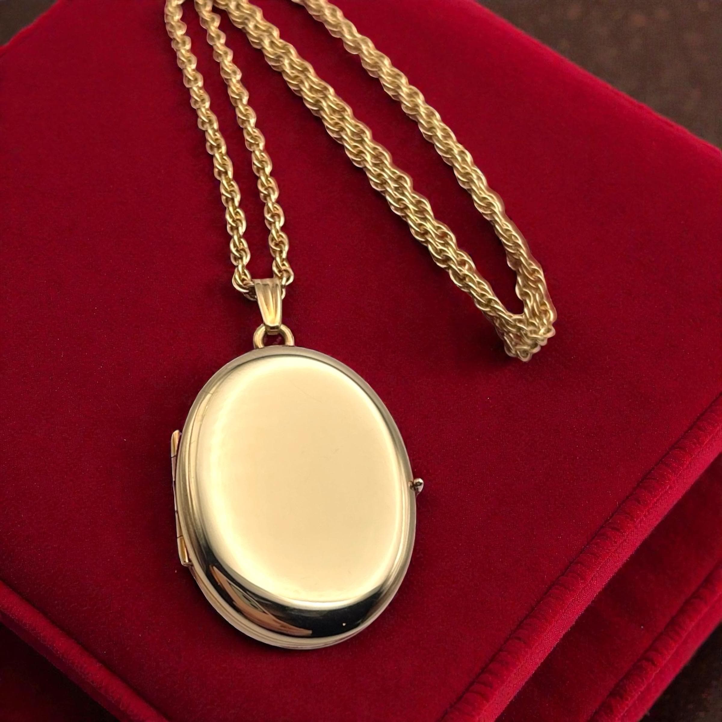 A classic vintage 14K gold filled oval shaped locket necklace that holds 4 photos. The front and back are both shiny gold, with no design.