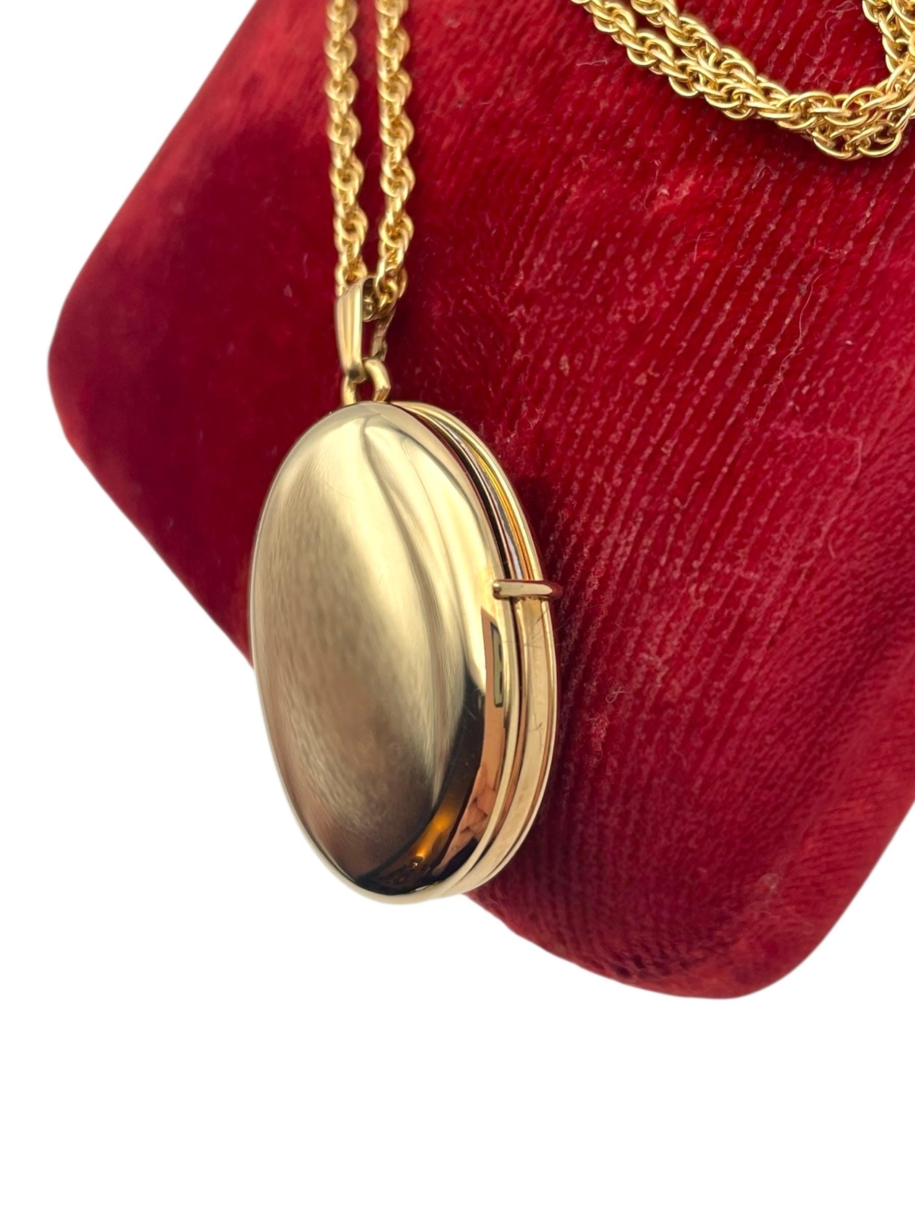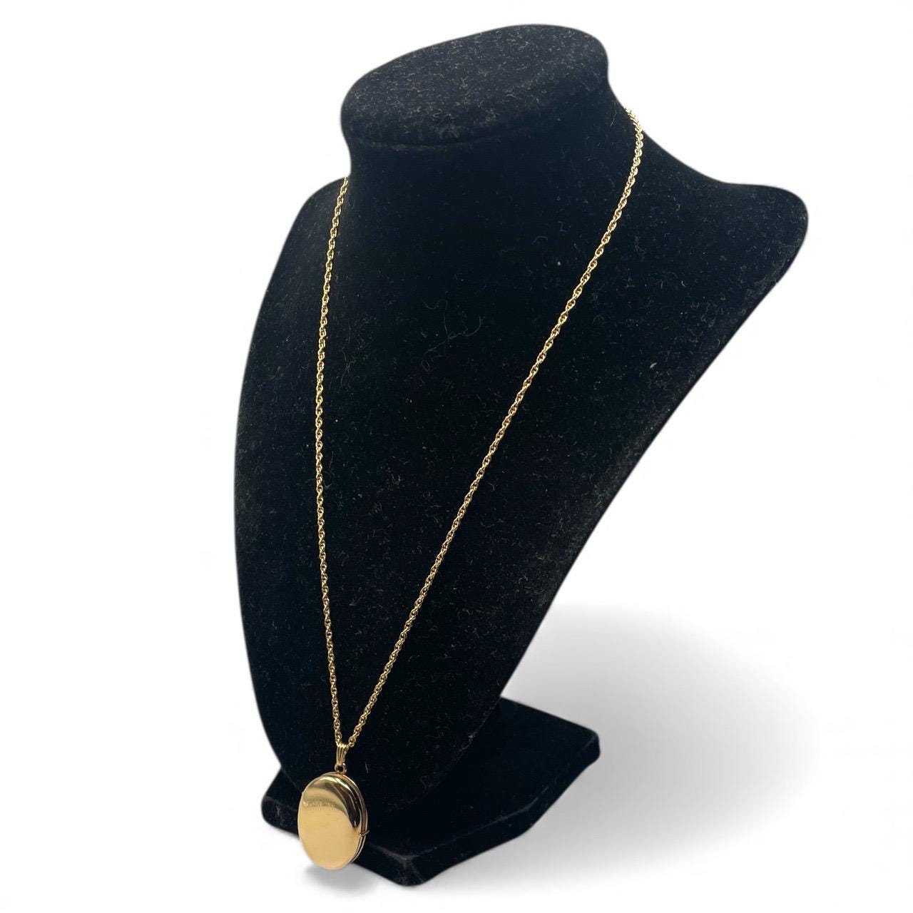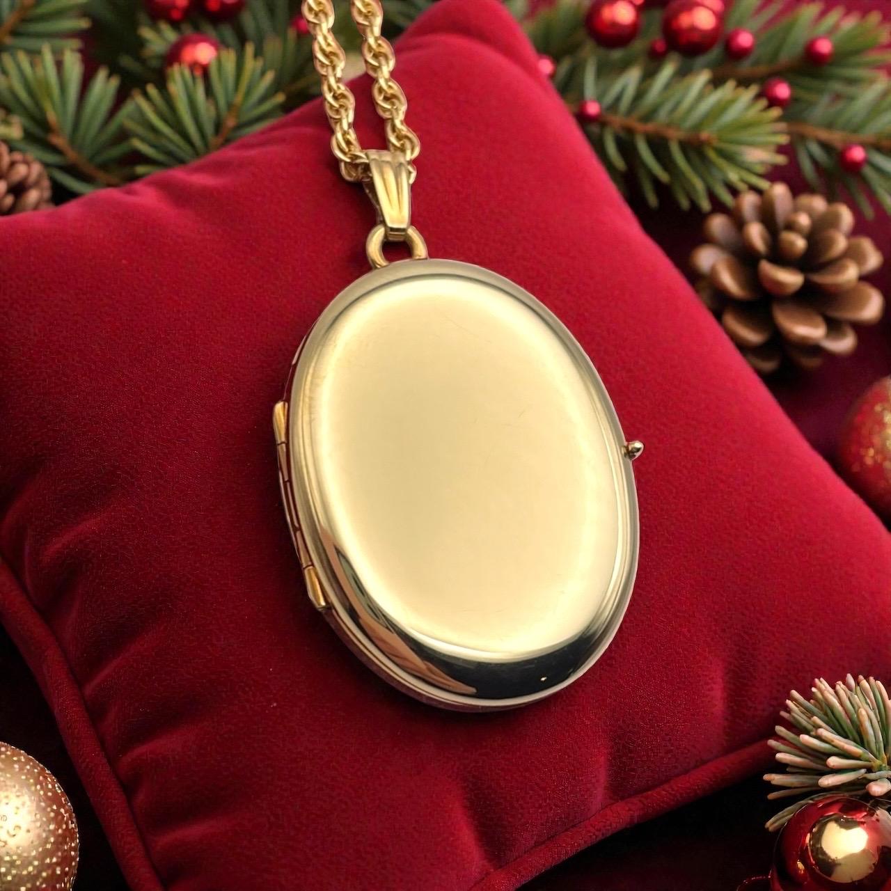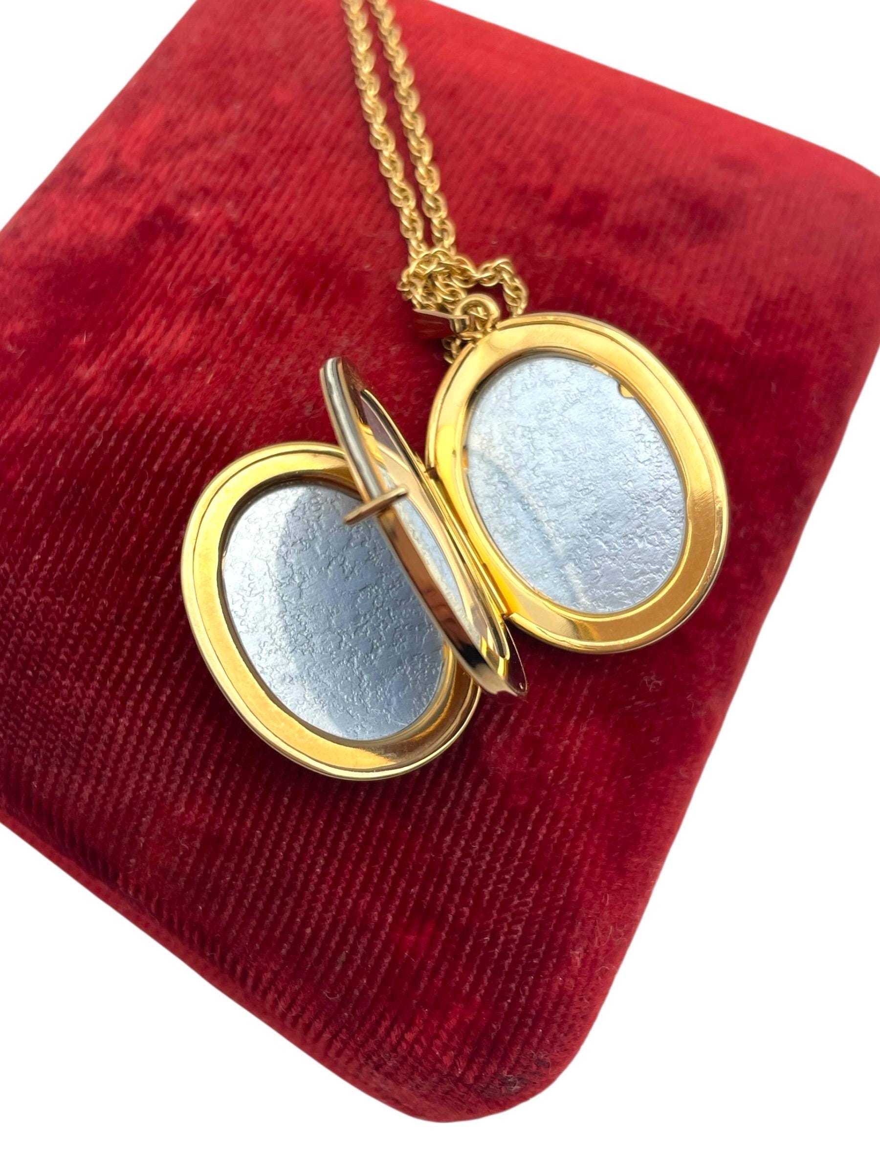 A classic vintage 14K gold filled oval shaped locket necklace that holds 4 photos. The front and back are both shiny gold, with no design.
