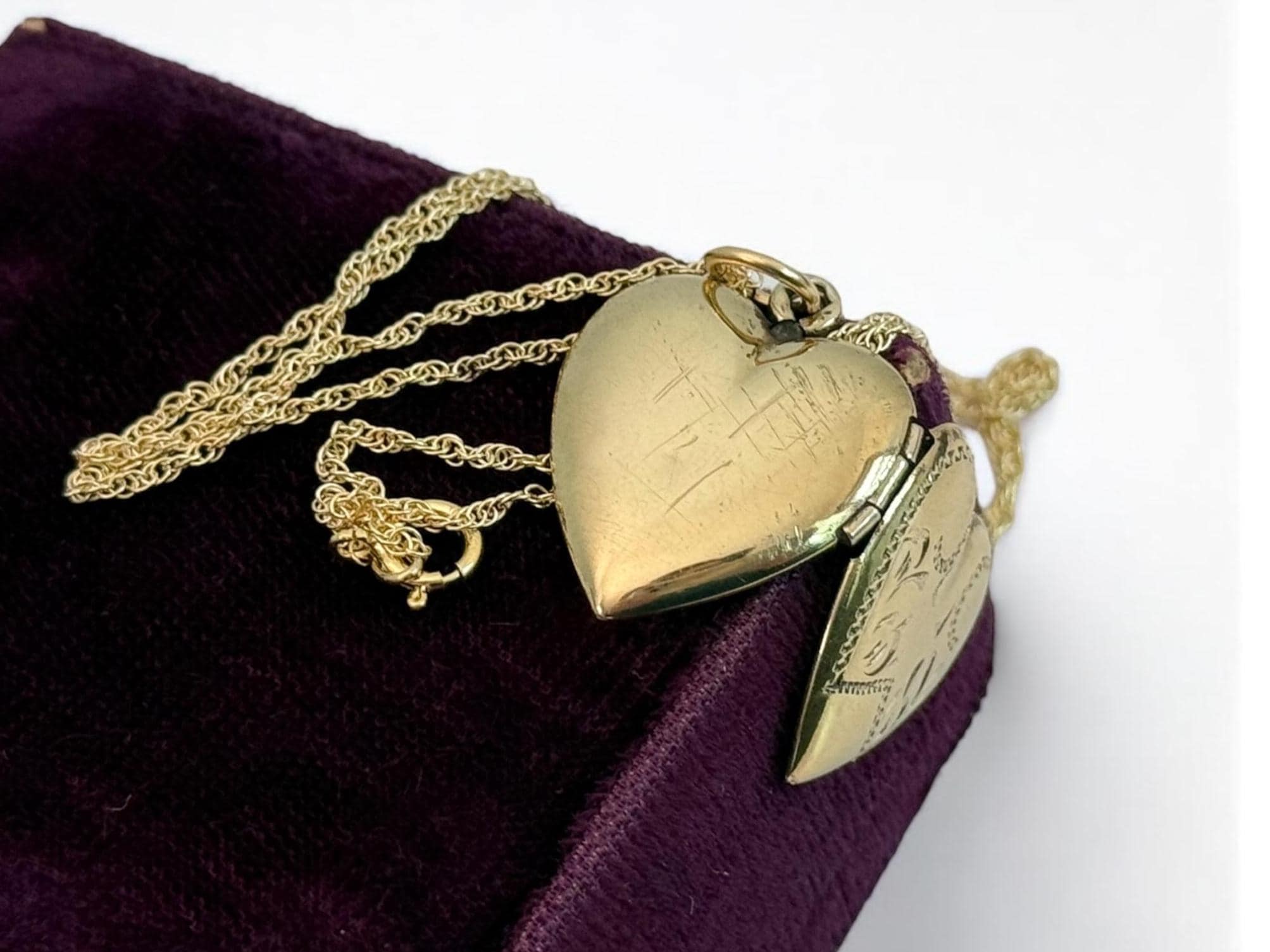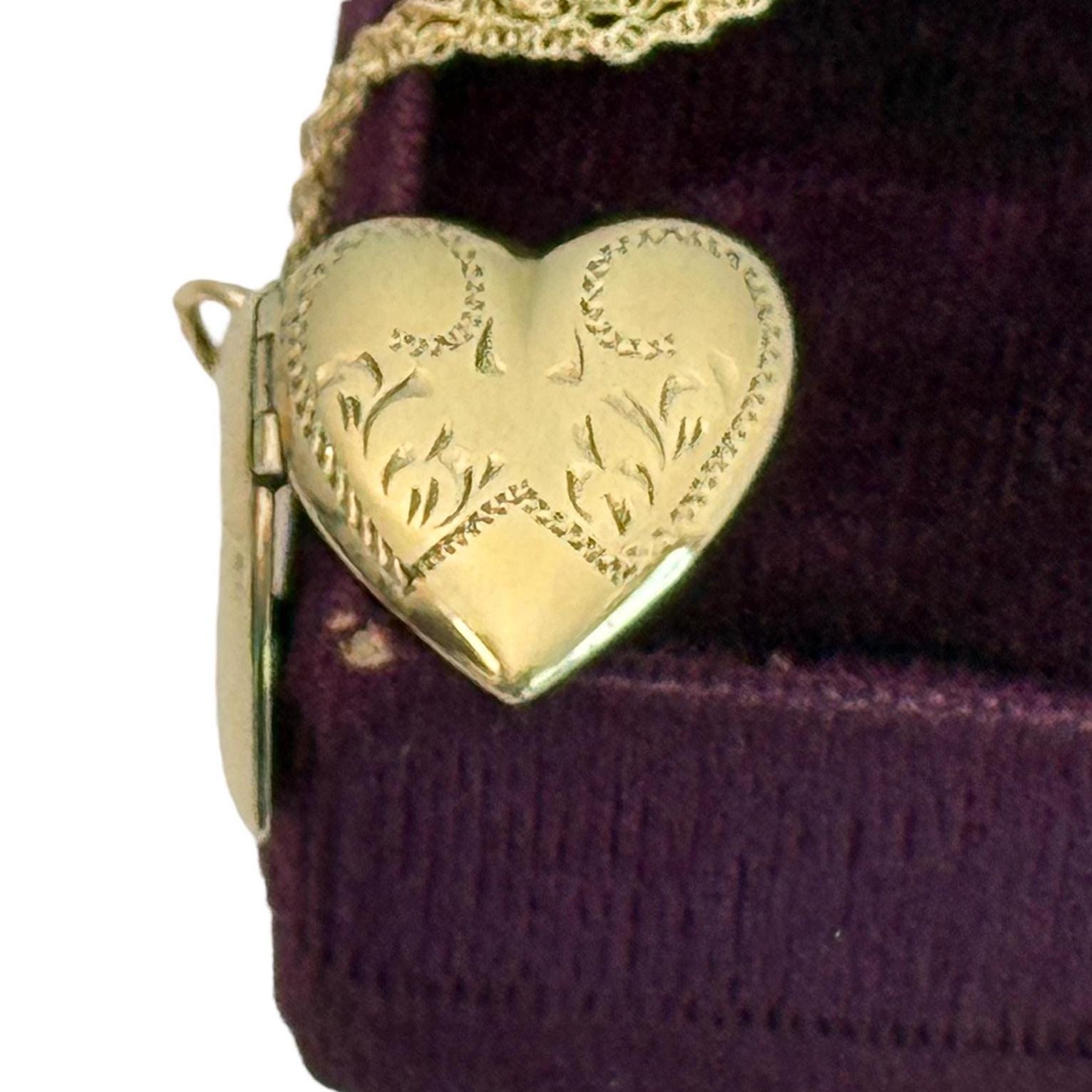 A very sweet vintage yellow gold-filled etched heart locket. The front has etched lines, curling swirls and tiny flourishes. The back is plain with no design.