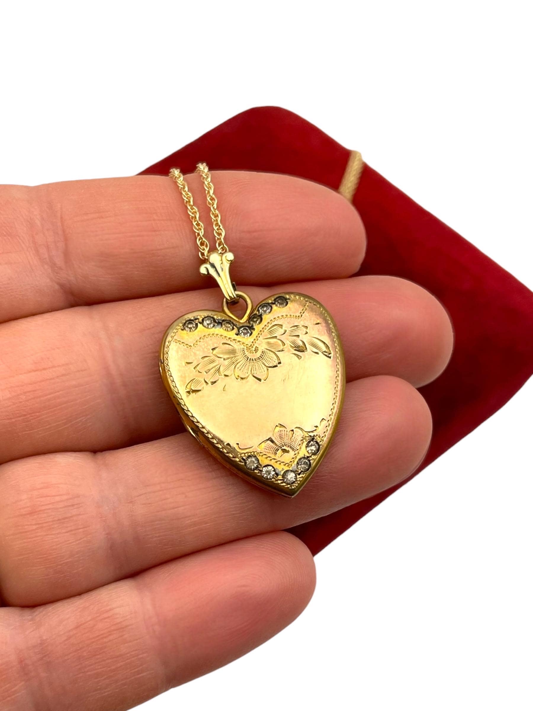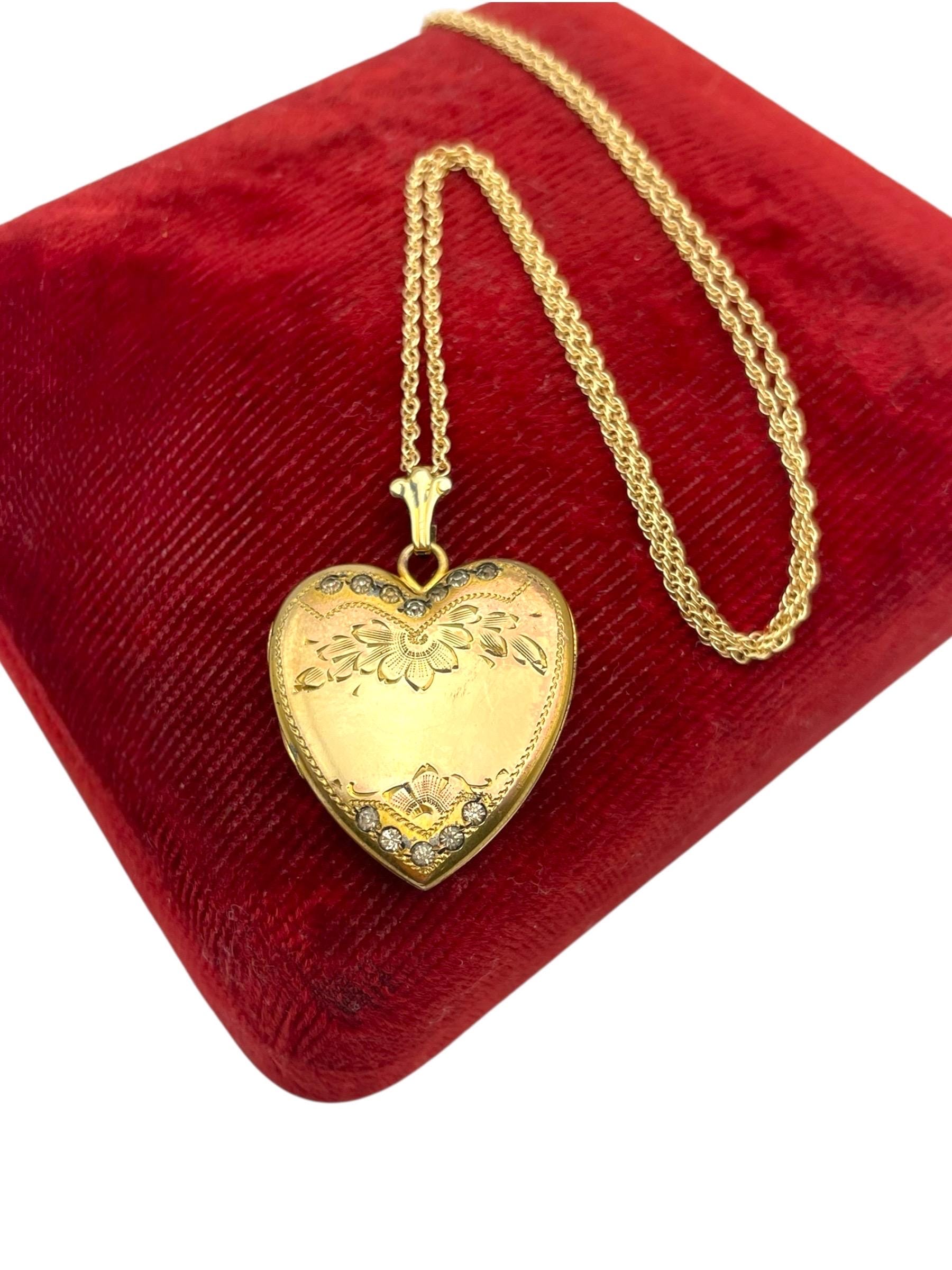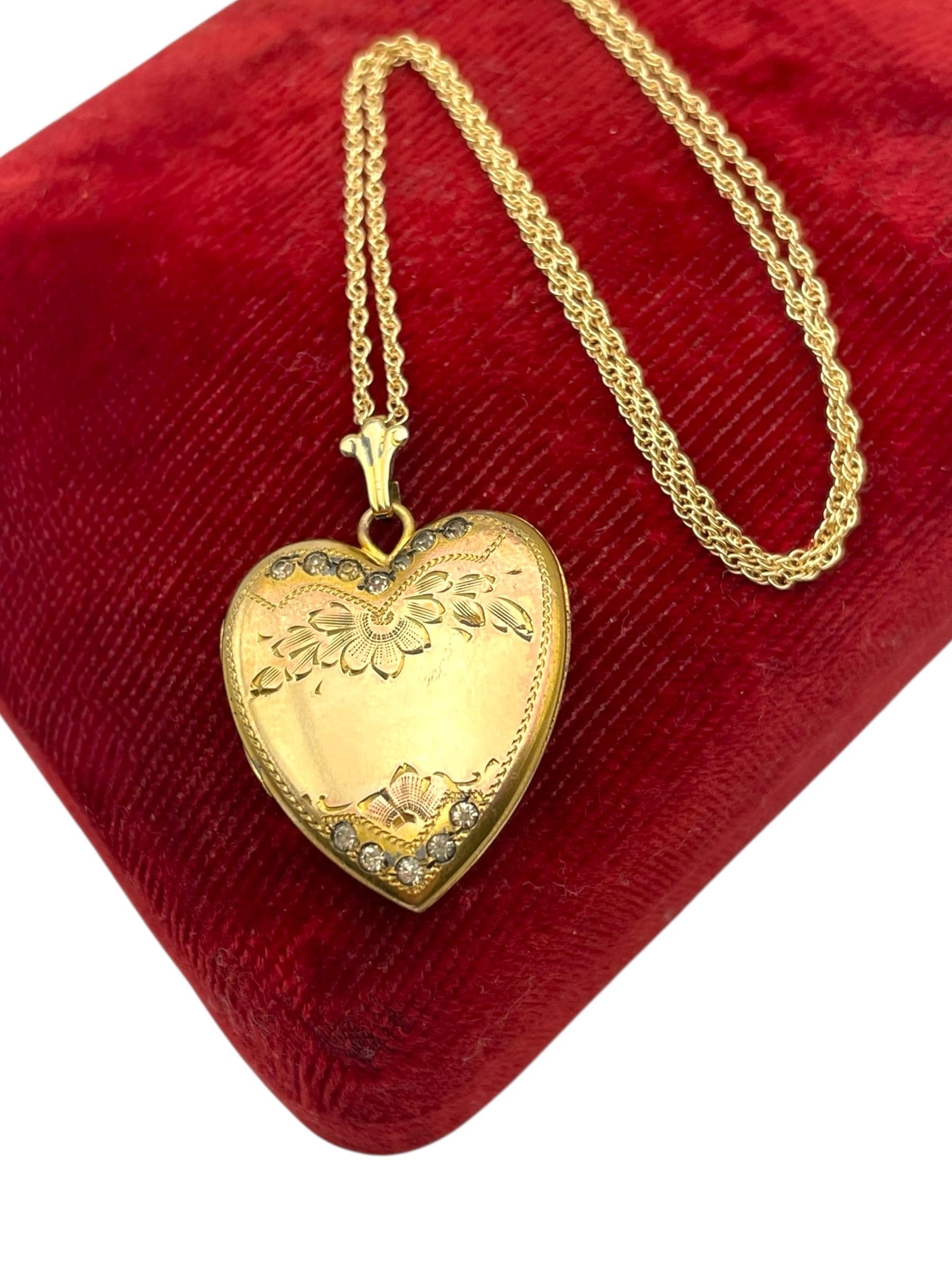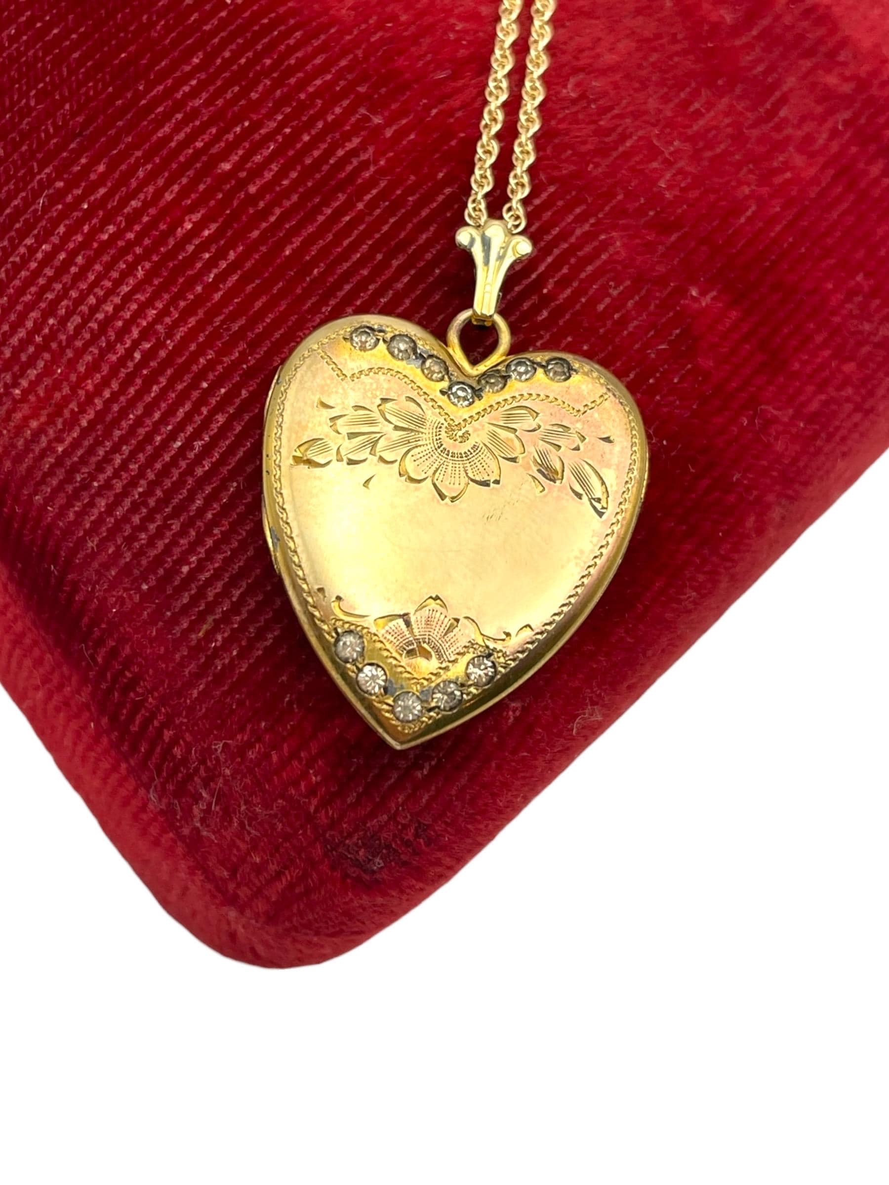 An adorable heart shaped gold filled locket featuring an etched floral and leaf design with rhinestone accents on the front. This sweetheart style locket was popular circa the 1930s and beyond.