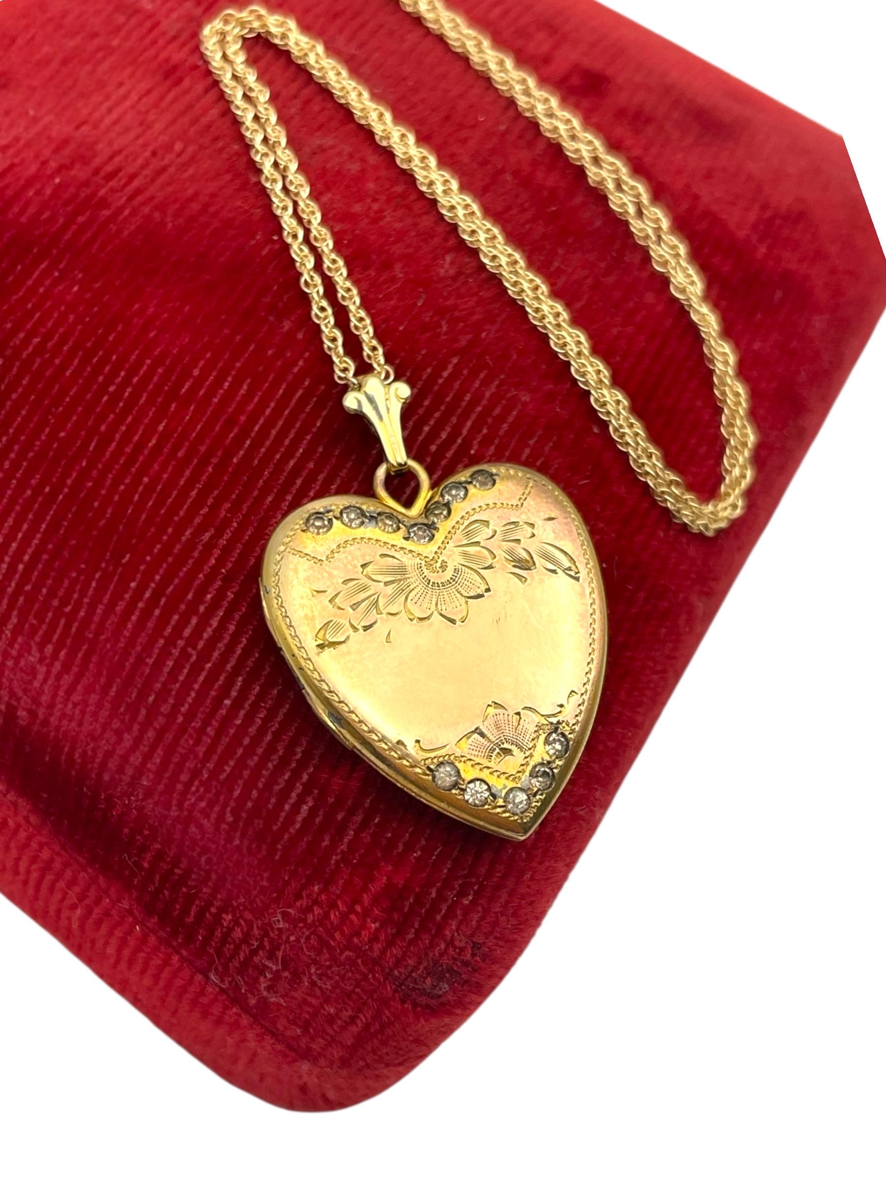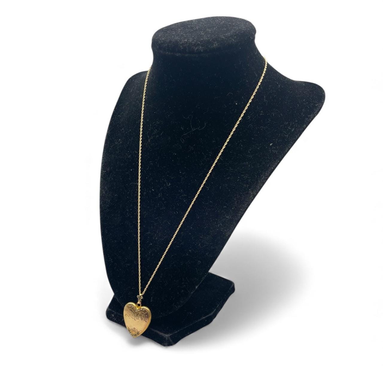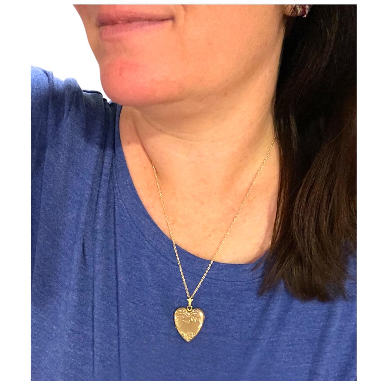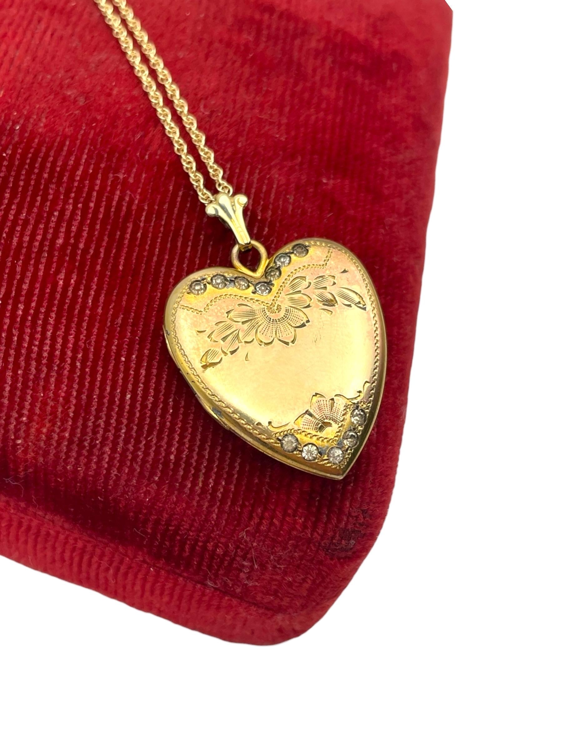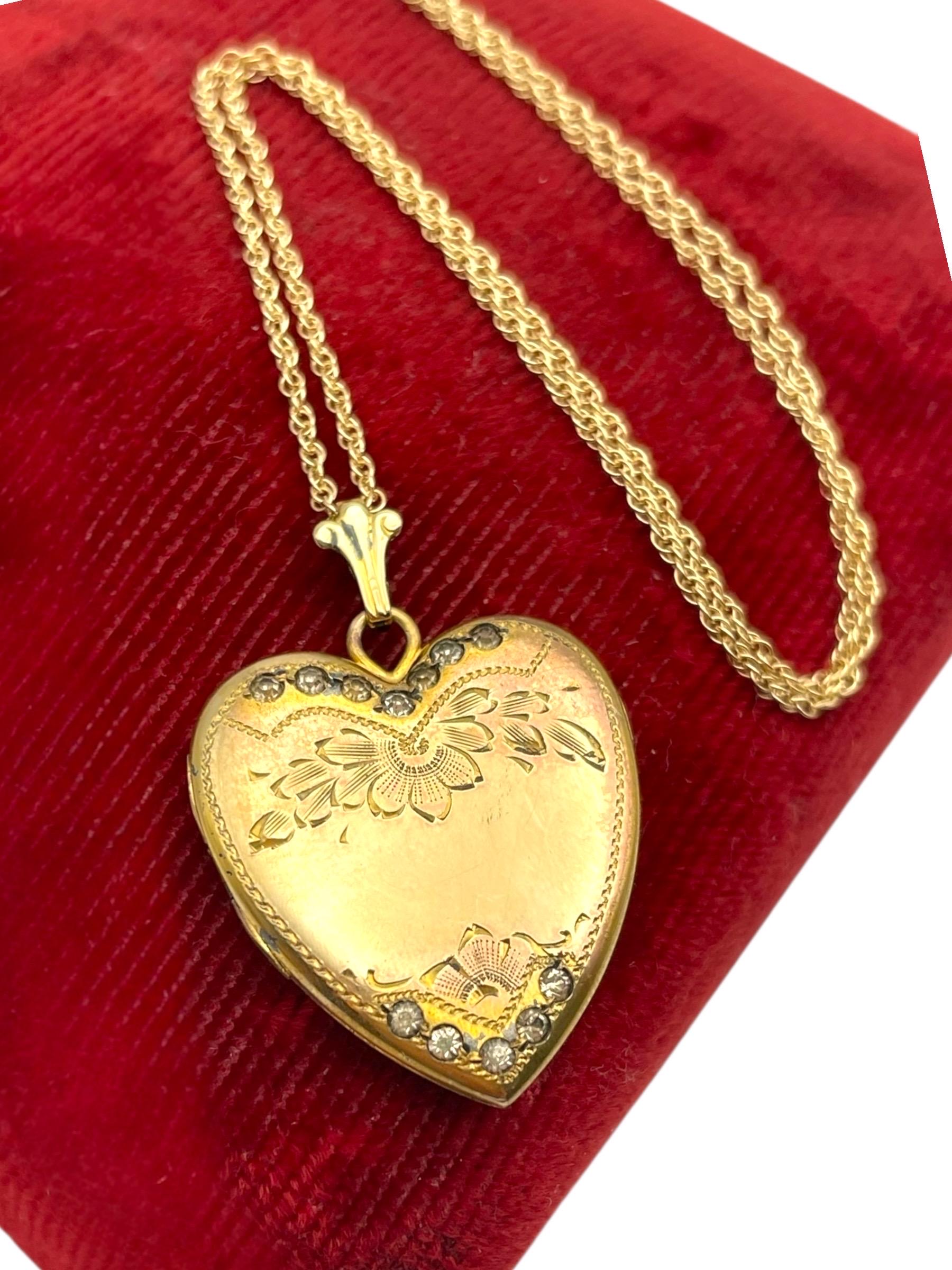 An adorable heart shaped gold filled locket featuring an etched floral and leaf design with rhinestone accents on the front. This sweetheart style locket was popular circa the 1930s and beyond.