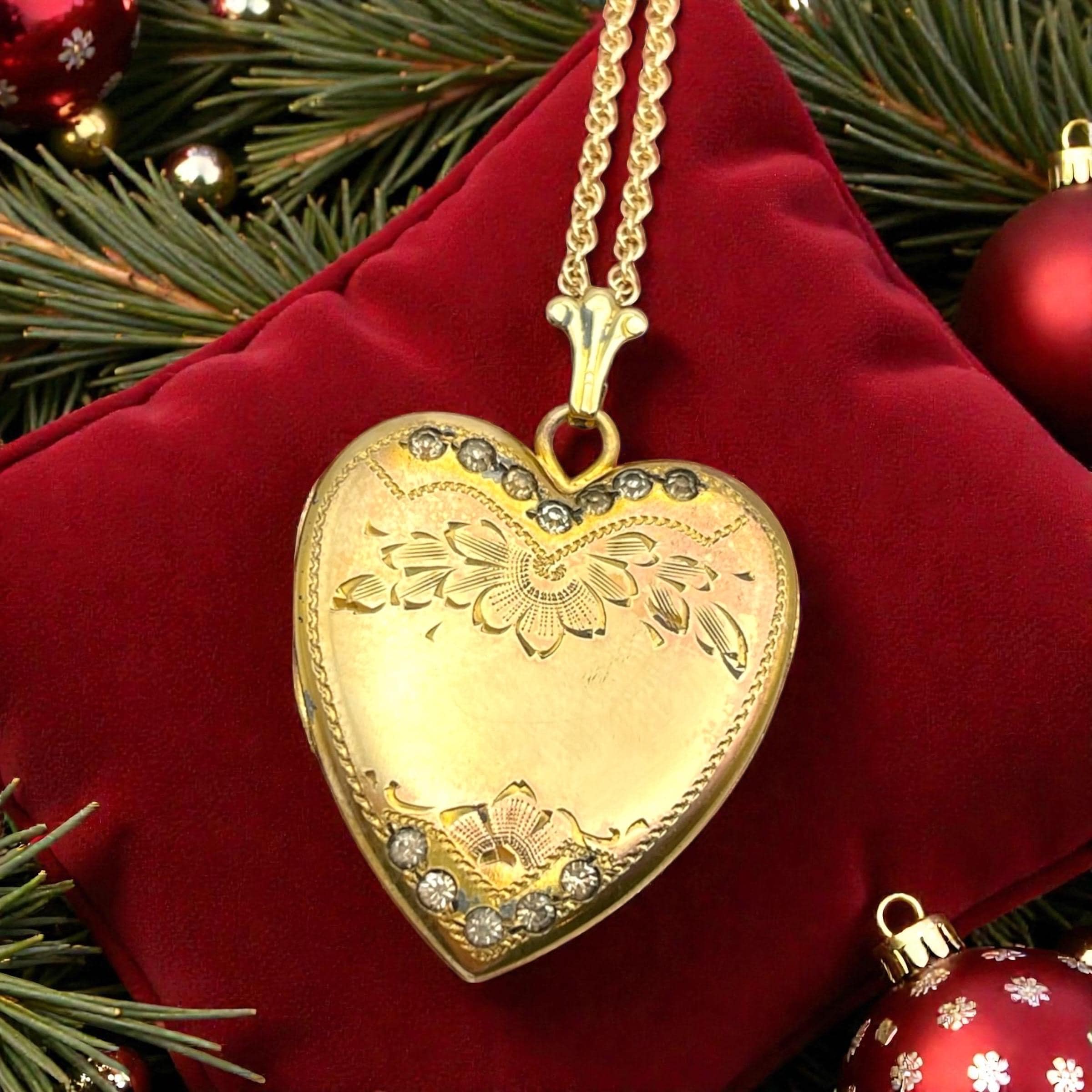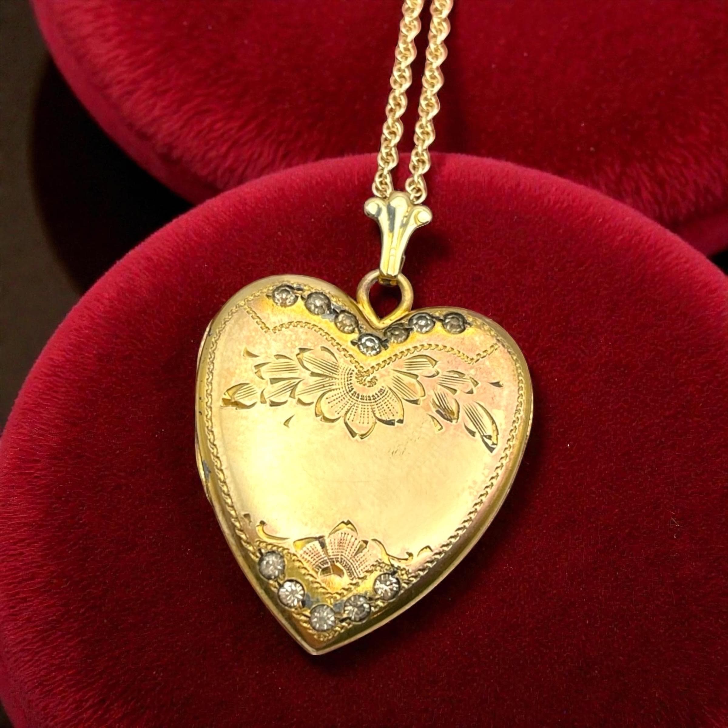 Vintage 14K Gold Filled Heart Locket Necklace - Rhinestone Floral Etched Sweetheart Pendant by Cheever & Tweedy