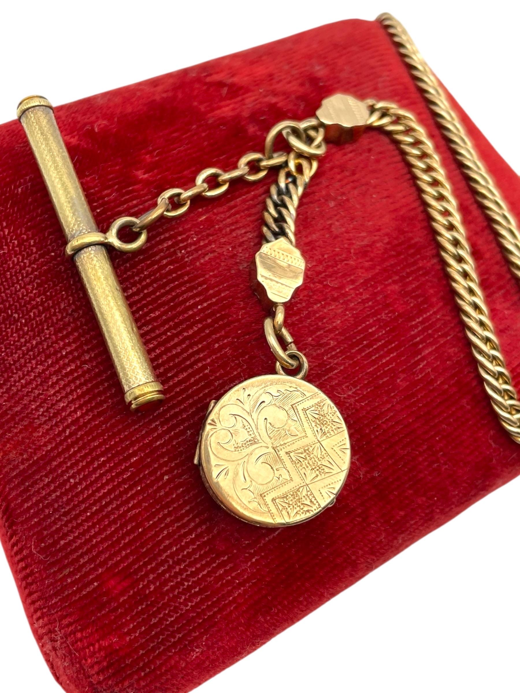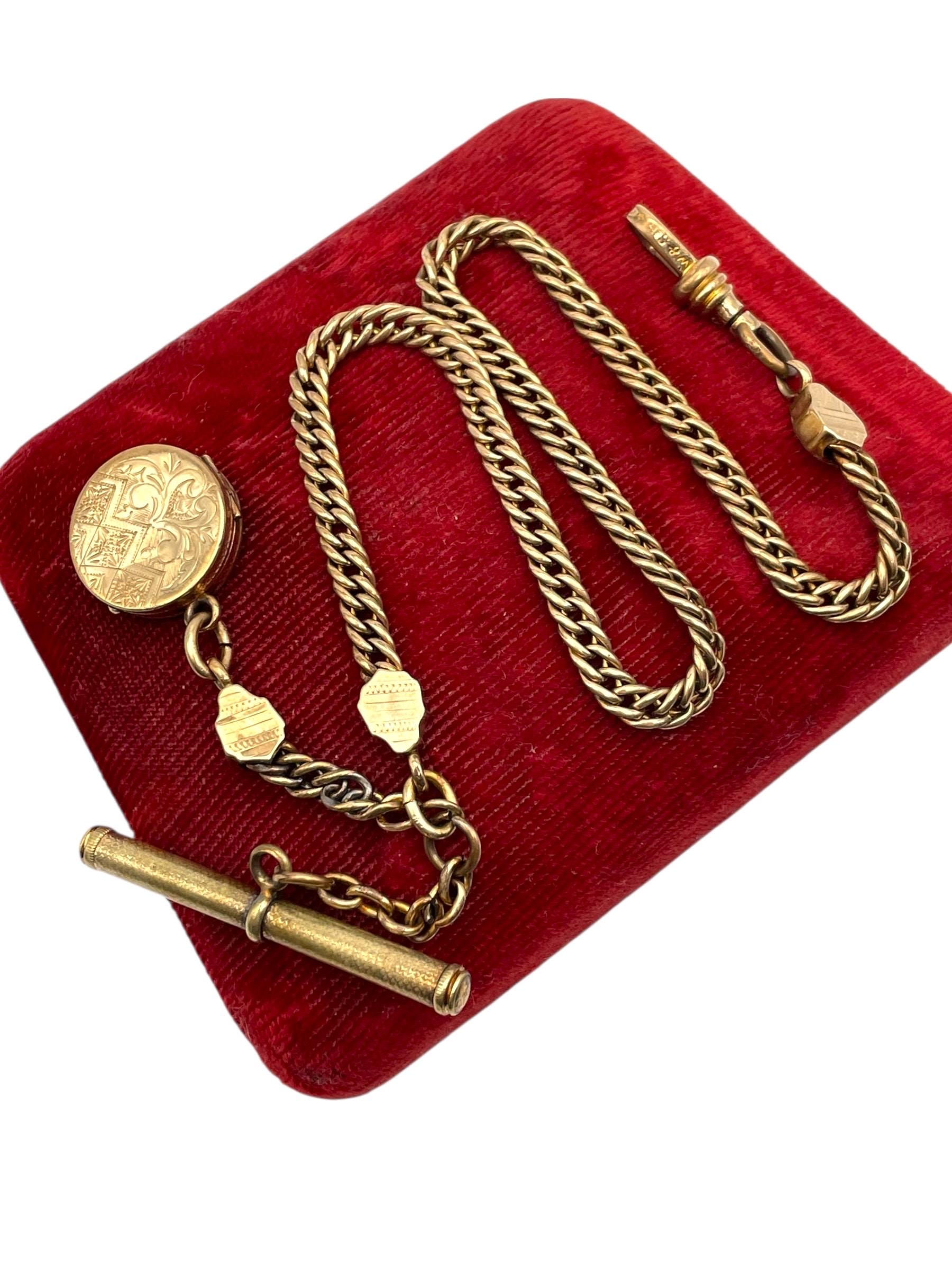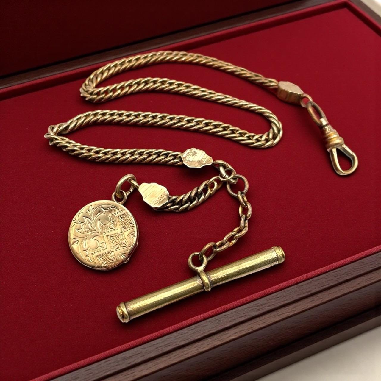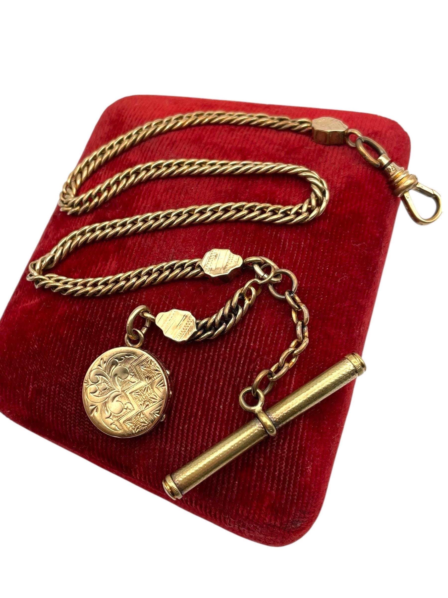 Amazing antique gold filled pocket watch chain and locket fob. This antique fob and watch chain are classic pieces of late 1800s/early 1900s jewelry and features a detailed etched design on the locket front and a different etched design on the back.