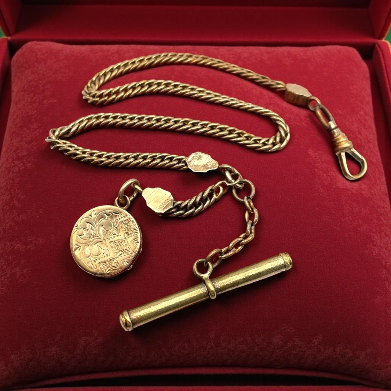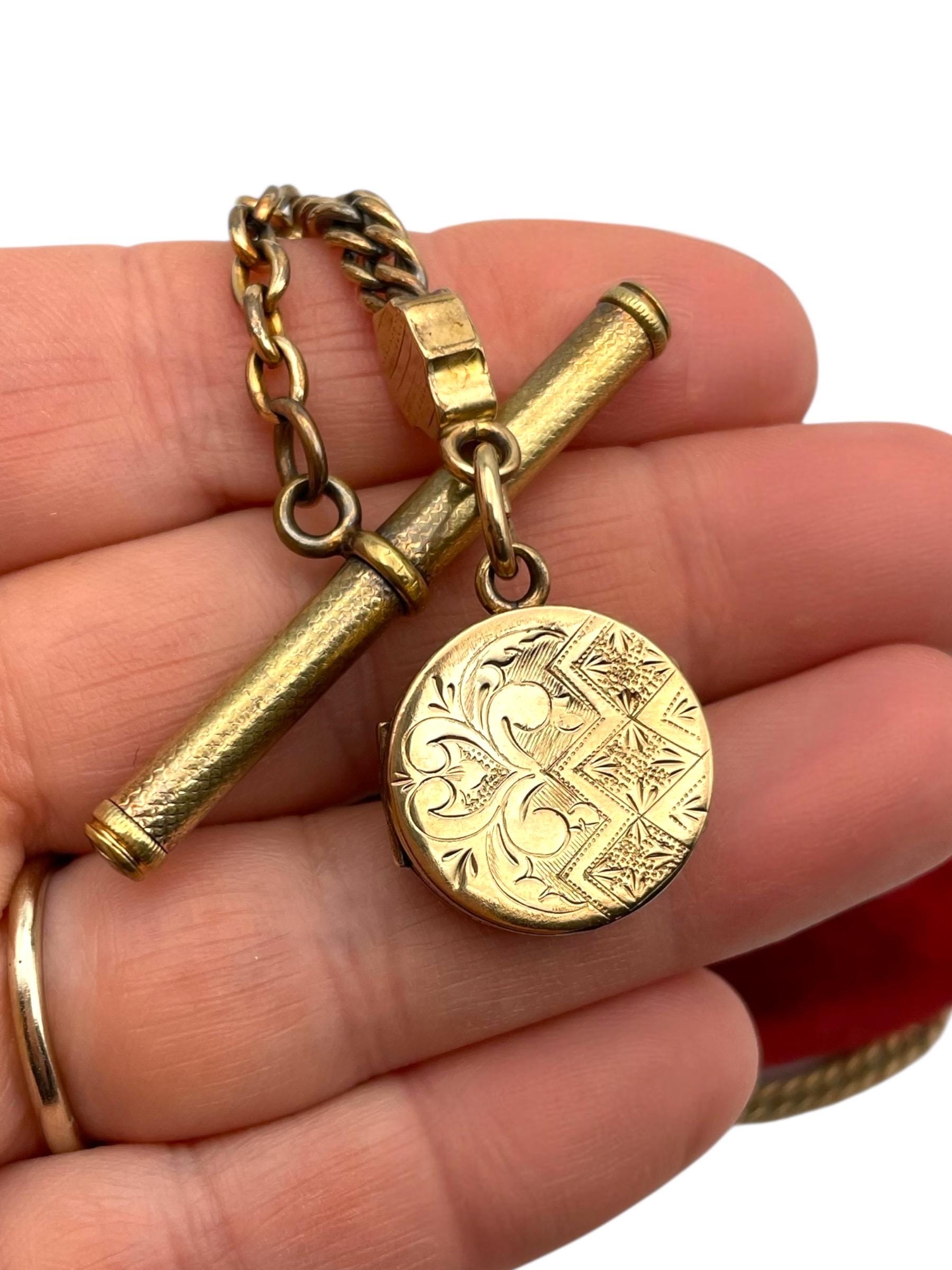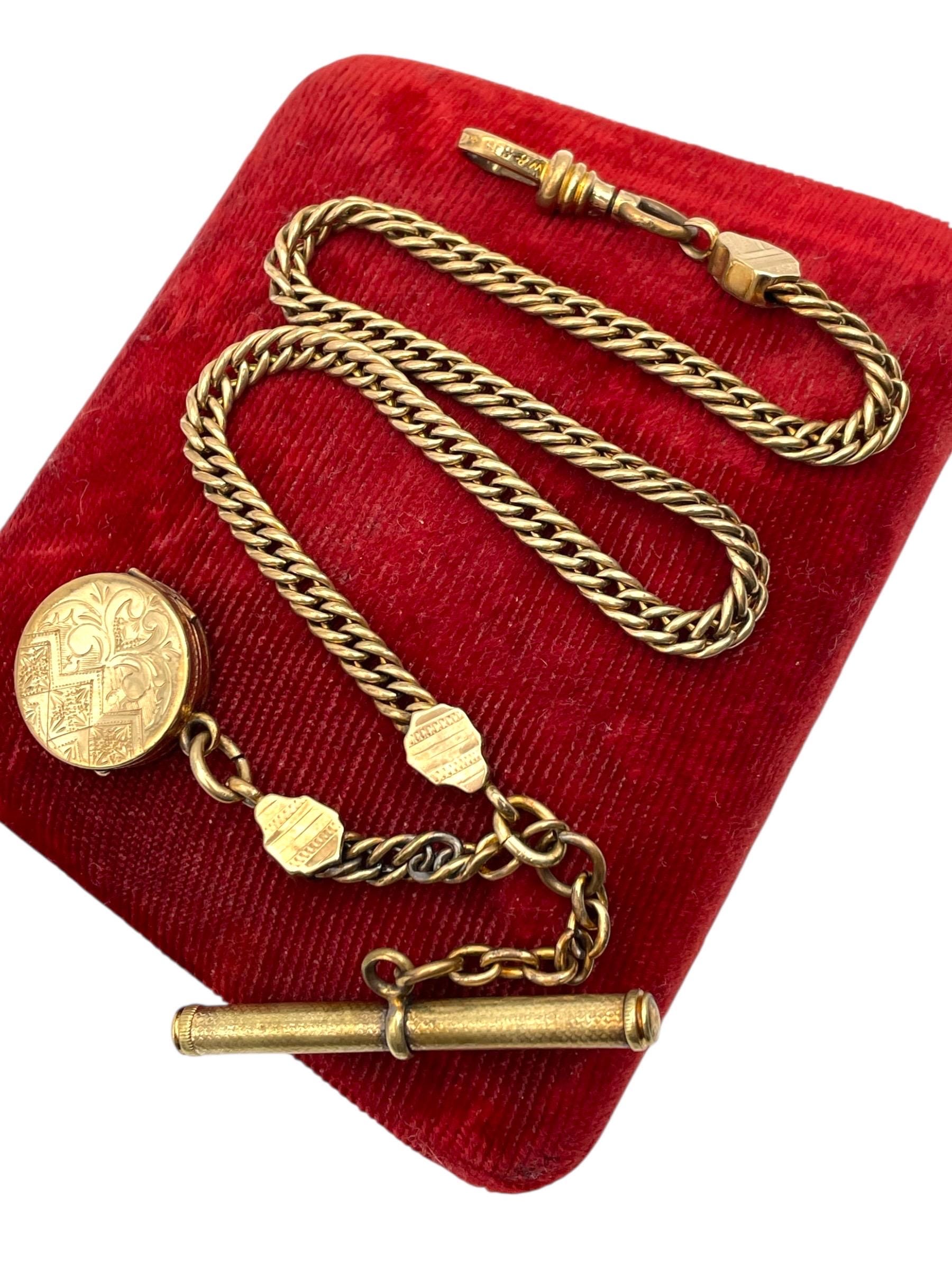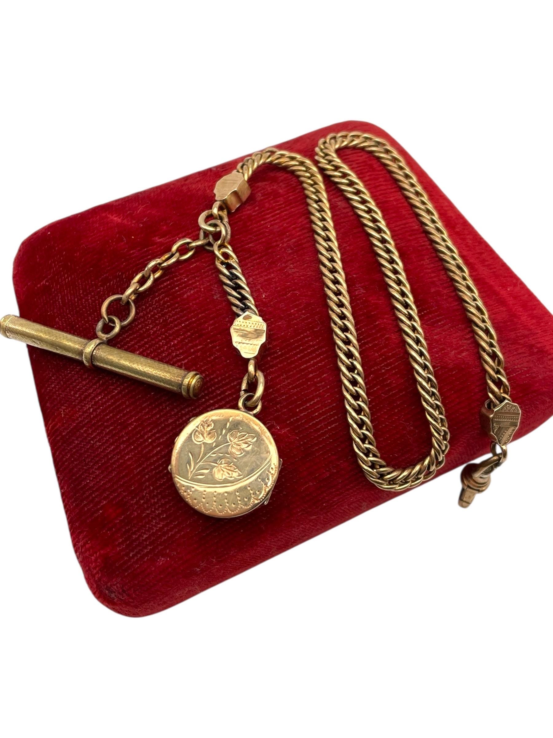 Amazing antique gold filled pocket watch chain and locket fob. This antique fob and watch chain are classic pieces of late 1800s/early 1900s jewelry and features a detailed etched design on the locket front and a different etched design on the back.