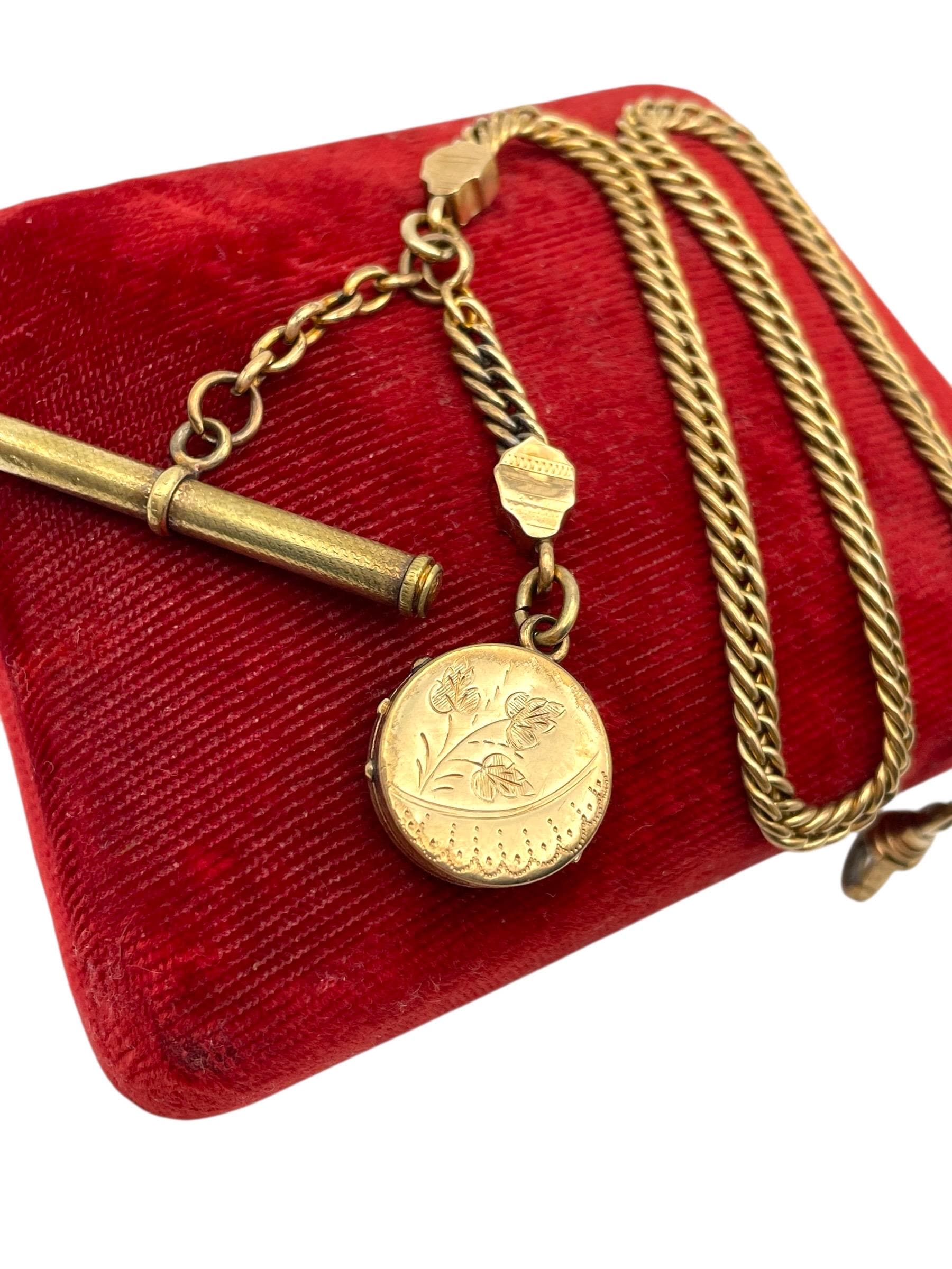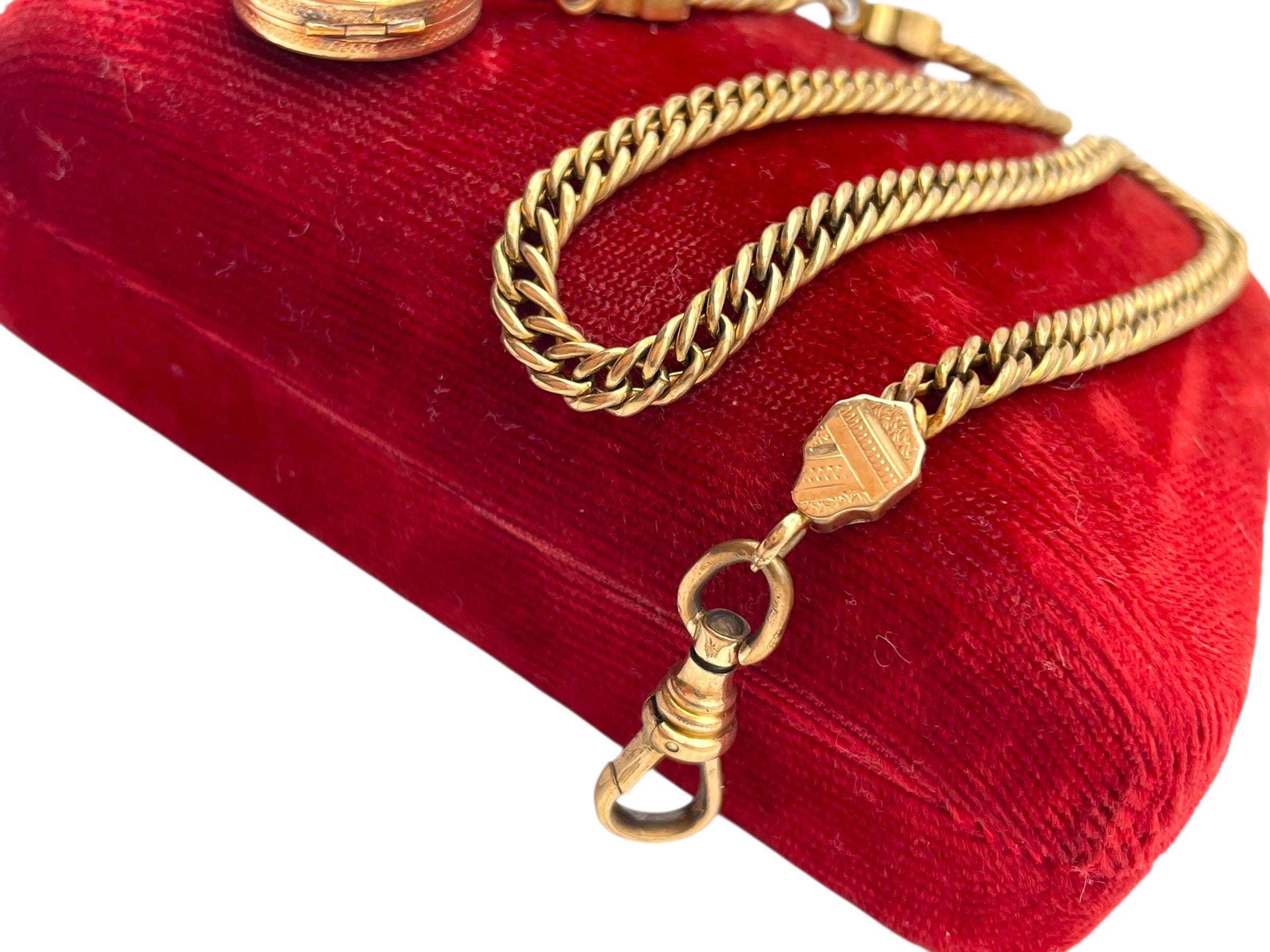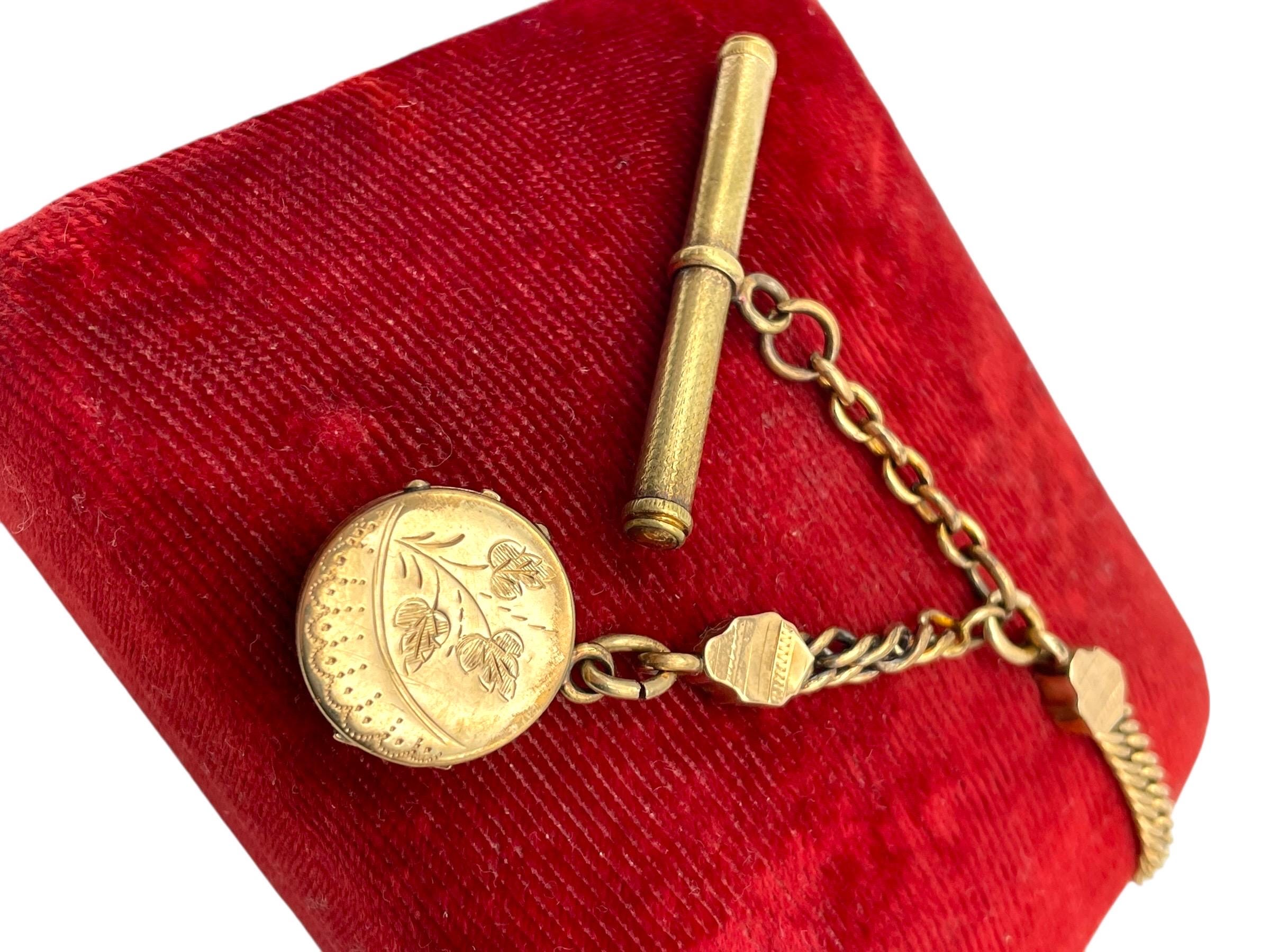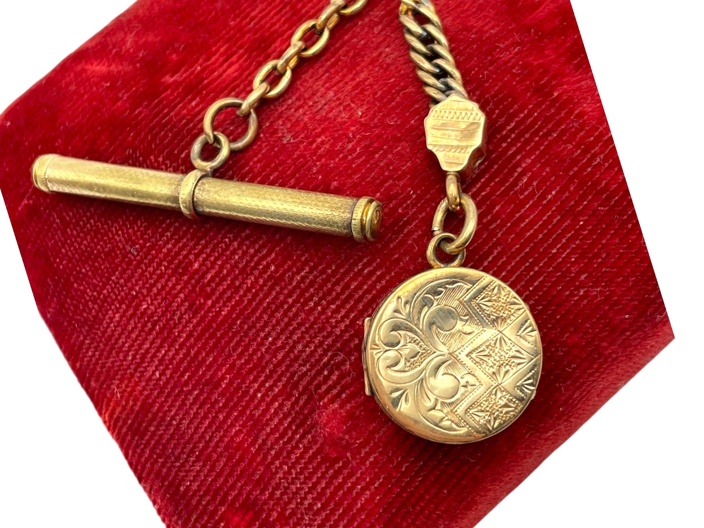 Amazing antique gold filled pocket watch chain and locket fob. This antique fob and watch chain are classic pieces of late 1800s/early 1900s jewelry and features a detailed etched design on the locket front and a different etched design on the back.