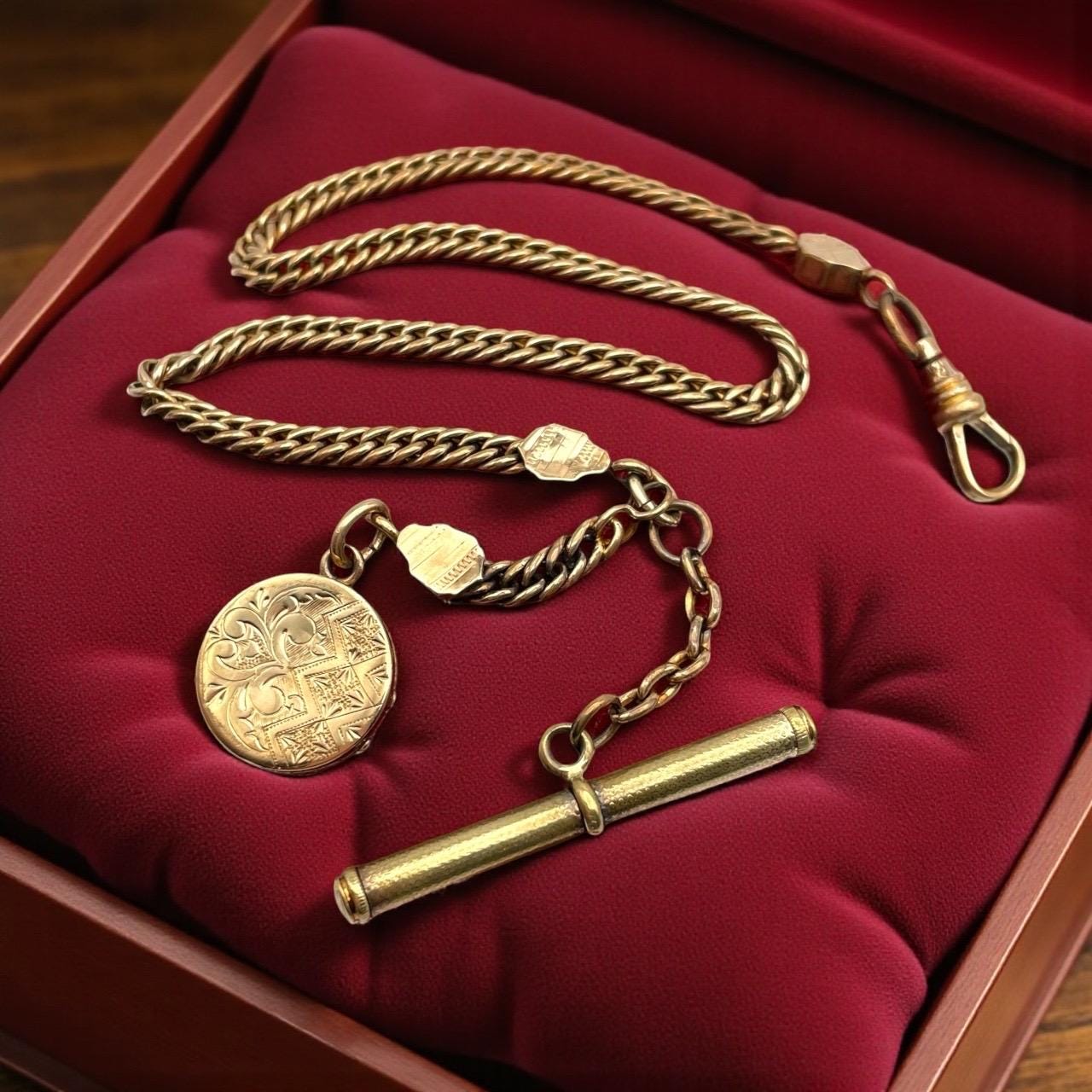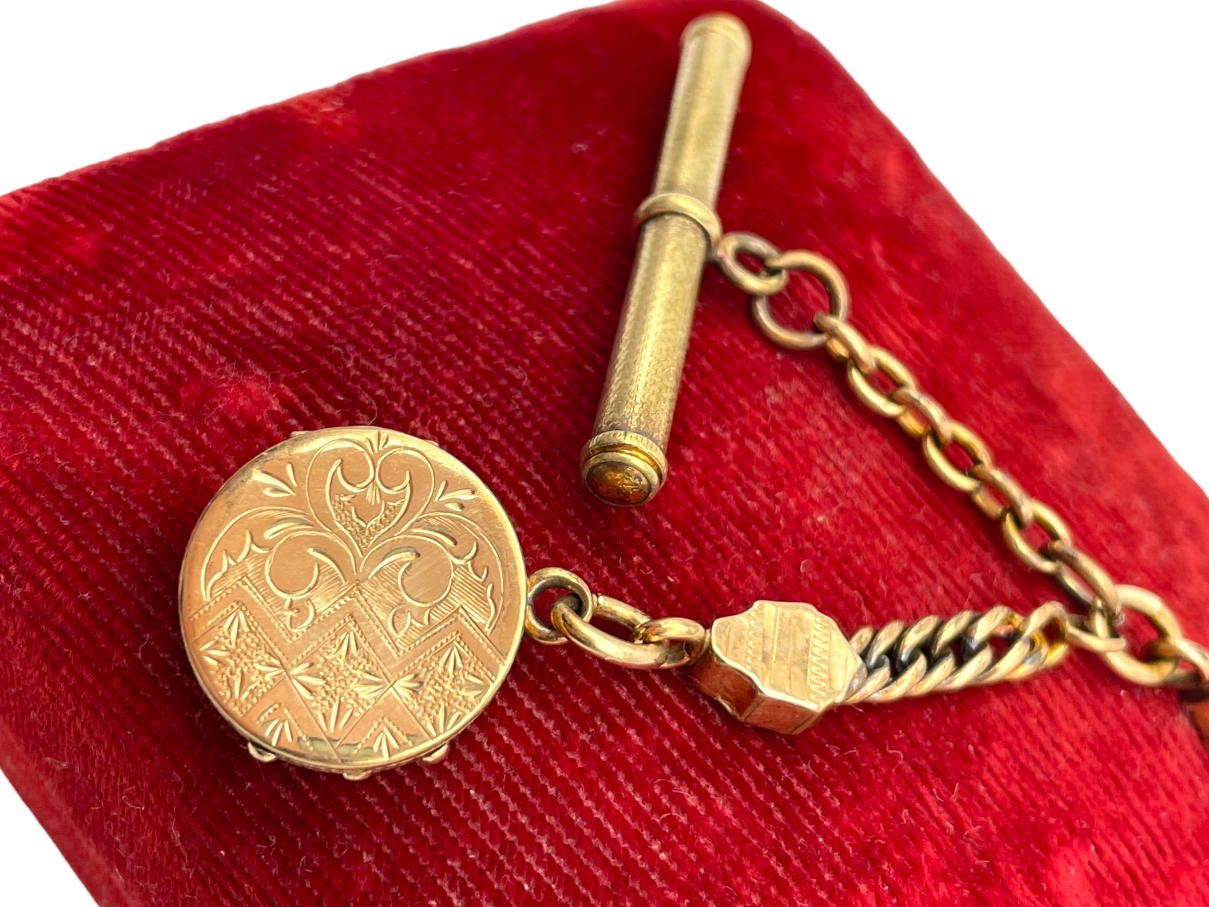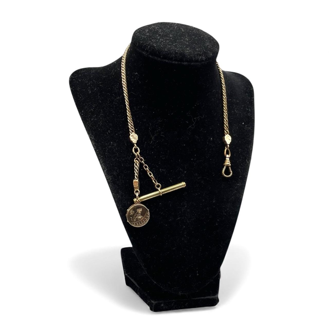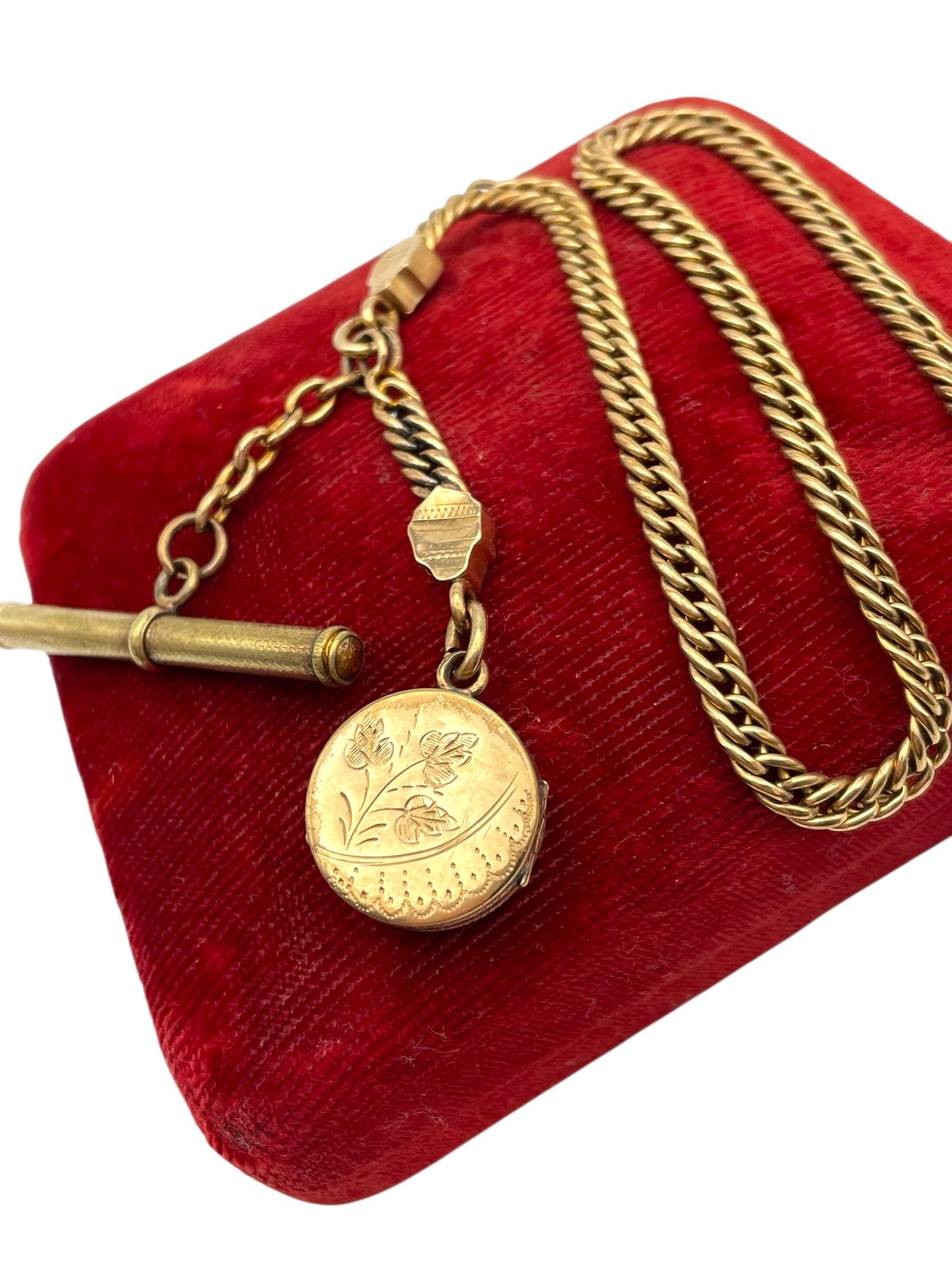 Amazing antique gold filled pocket watch chain and locket fob. This antique fob and watch chain are classic pieces of late 1800s/early 1900s jewelry and features a detailed etched design on the locket front and a different etched design on the back.