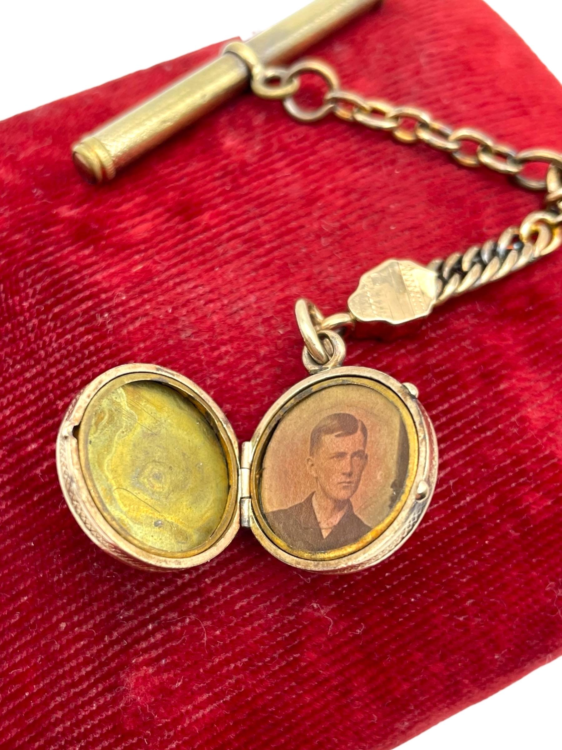 The round locket that hangs has etched designs - different on each side. Inside are two wells that can each hold a round photo. Both sides have the frames intact and an original photo of young man - very old, looks like late 1800s.