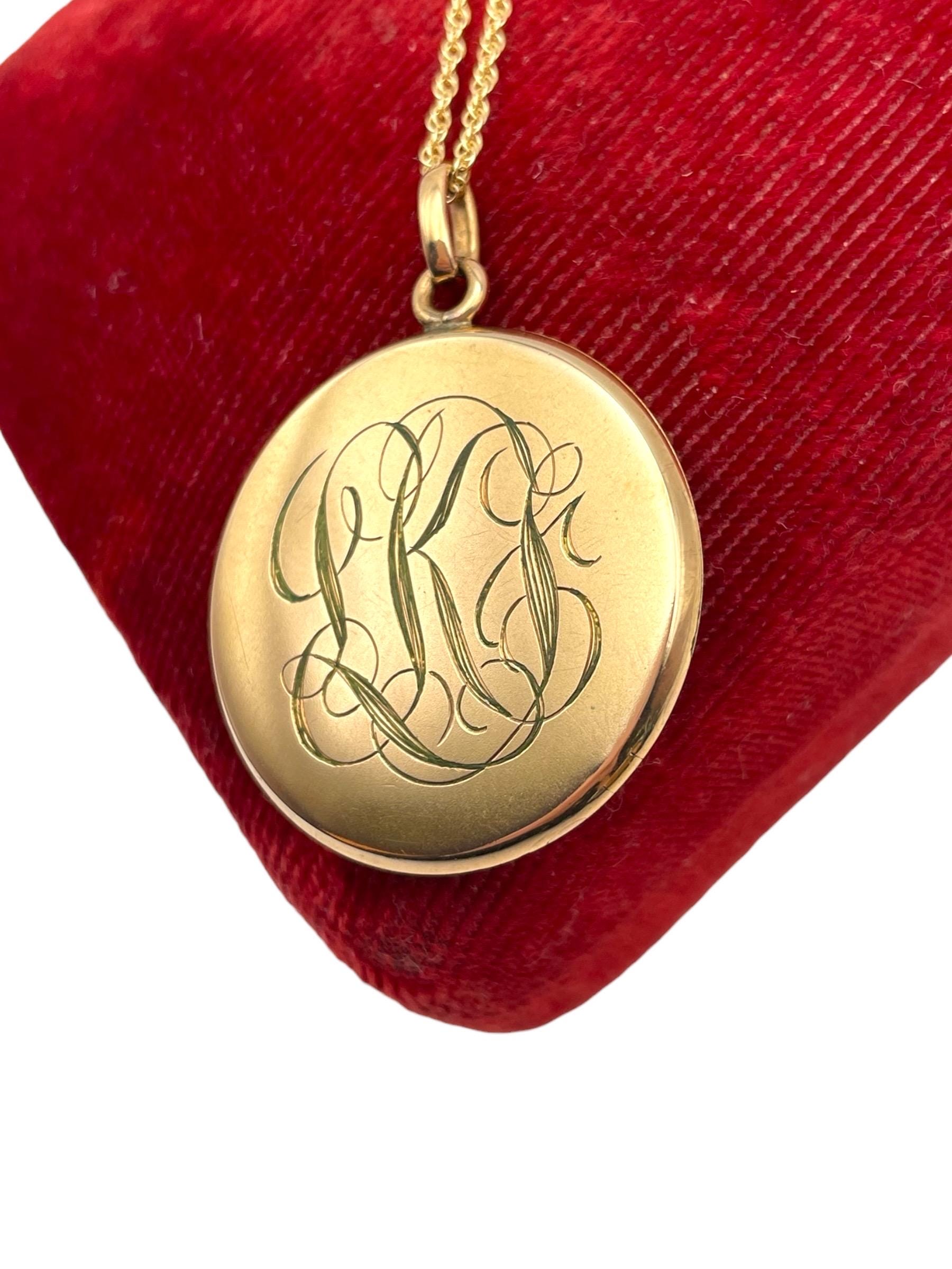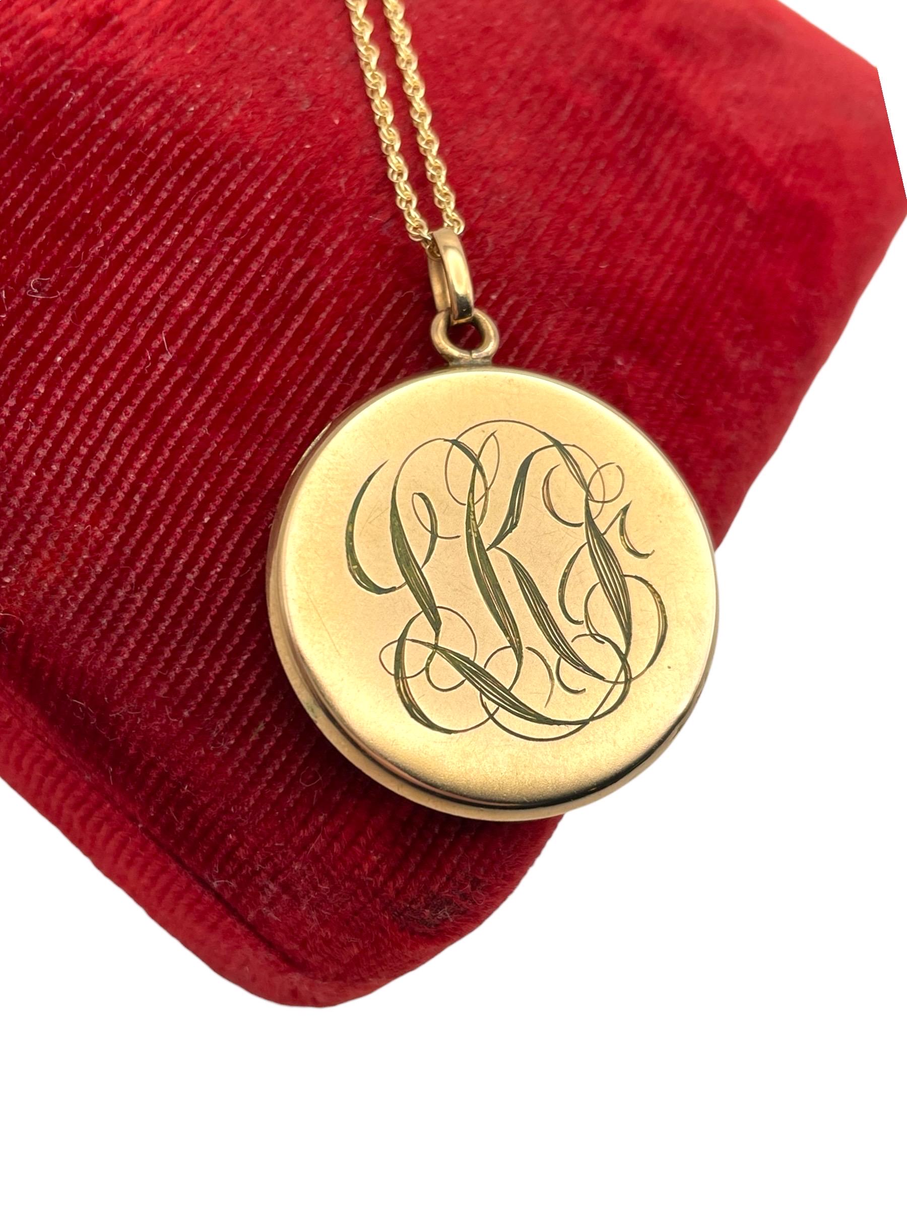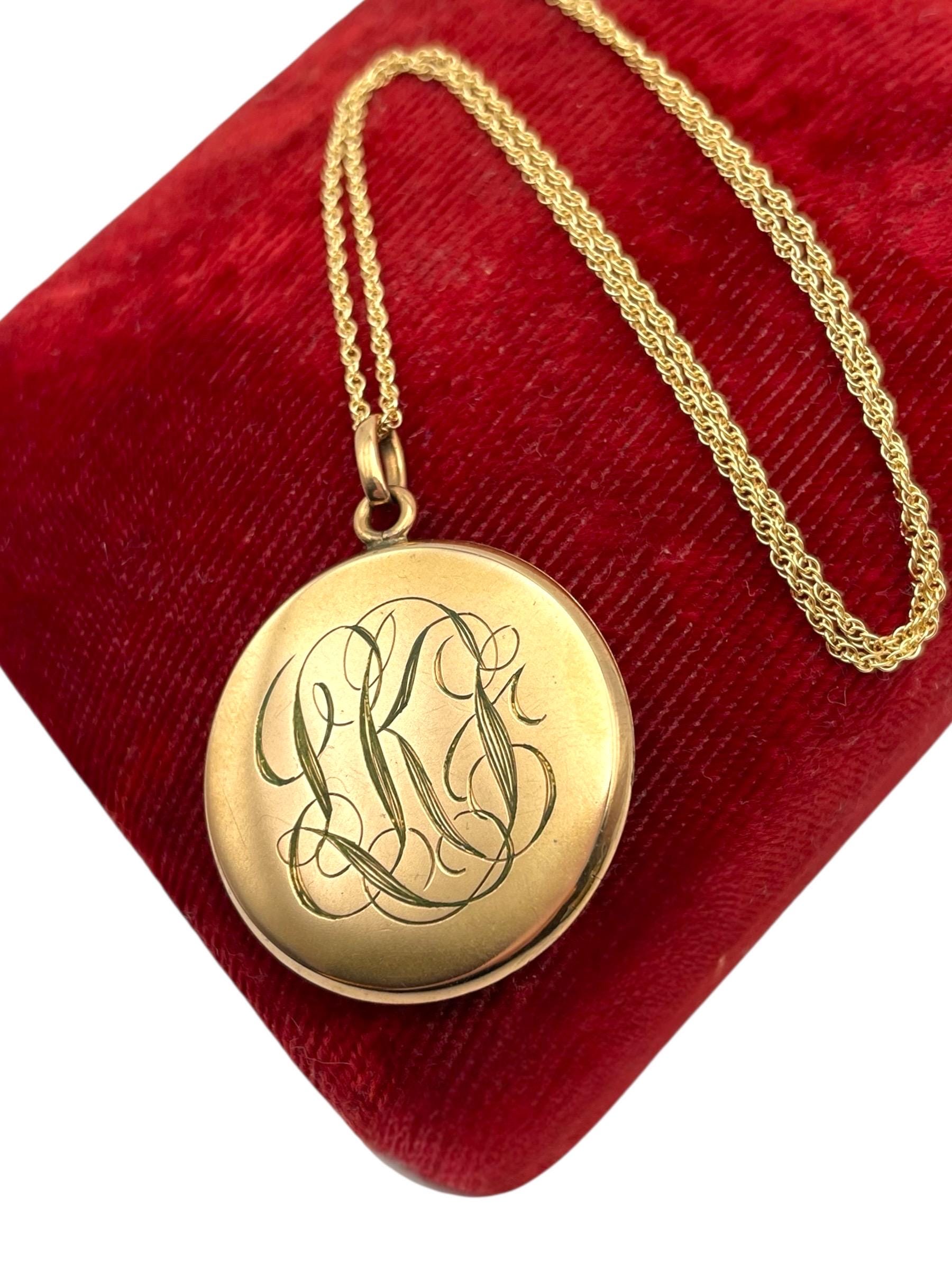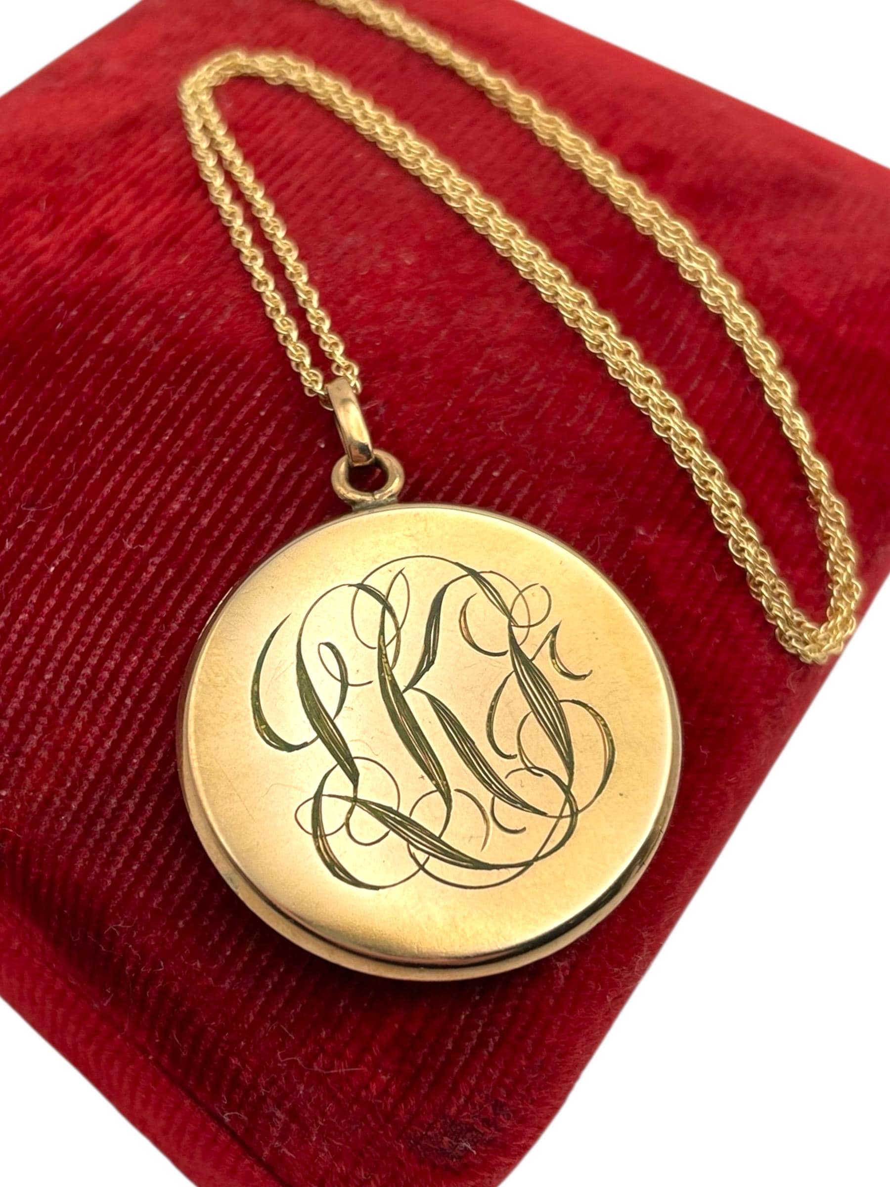A classic round antique gold shell locket featuring a monogrammed front with the initials of what appears to be "LKF” in swirling cursive script. The back side of this circa early 1900s locket is plain with no decoration. This type of monogrammed item was very popular during the Edwardian era.