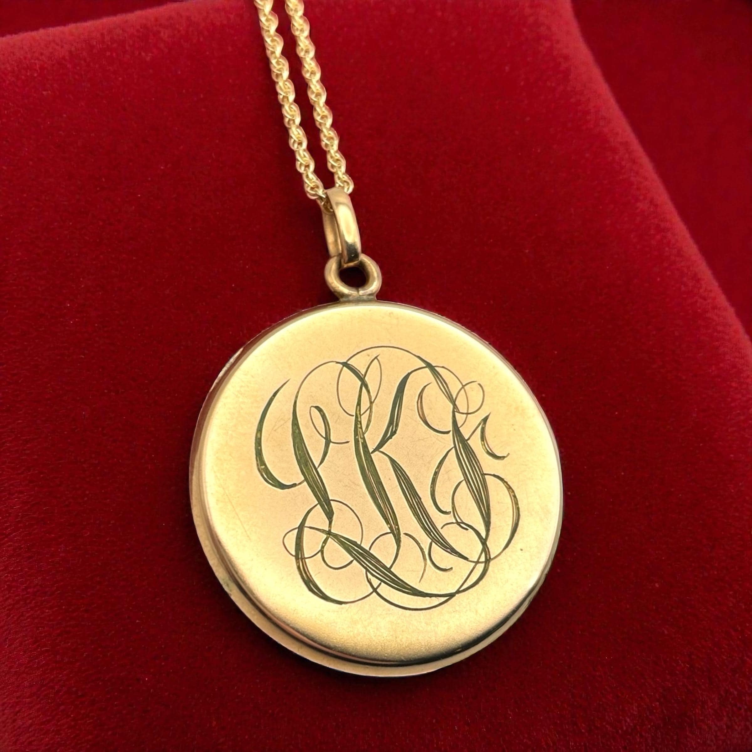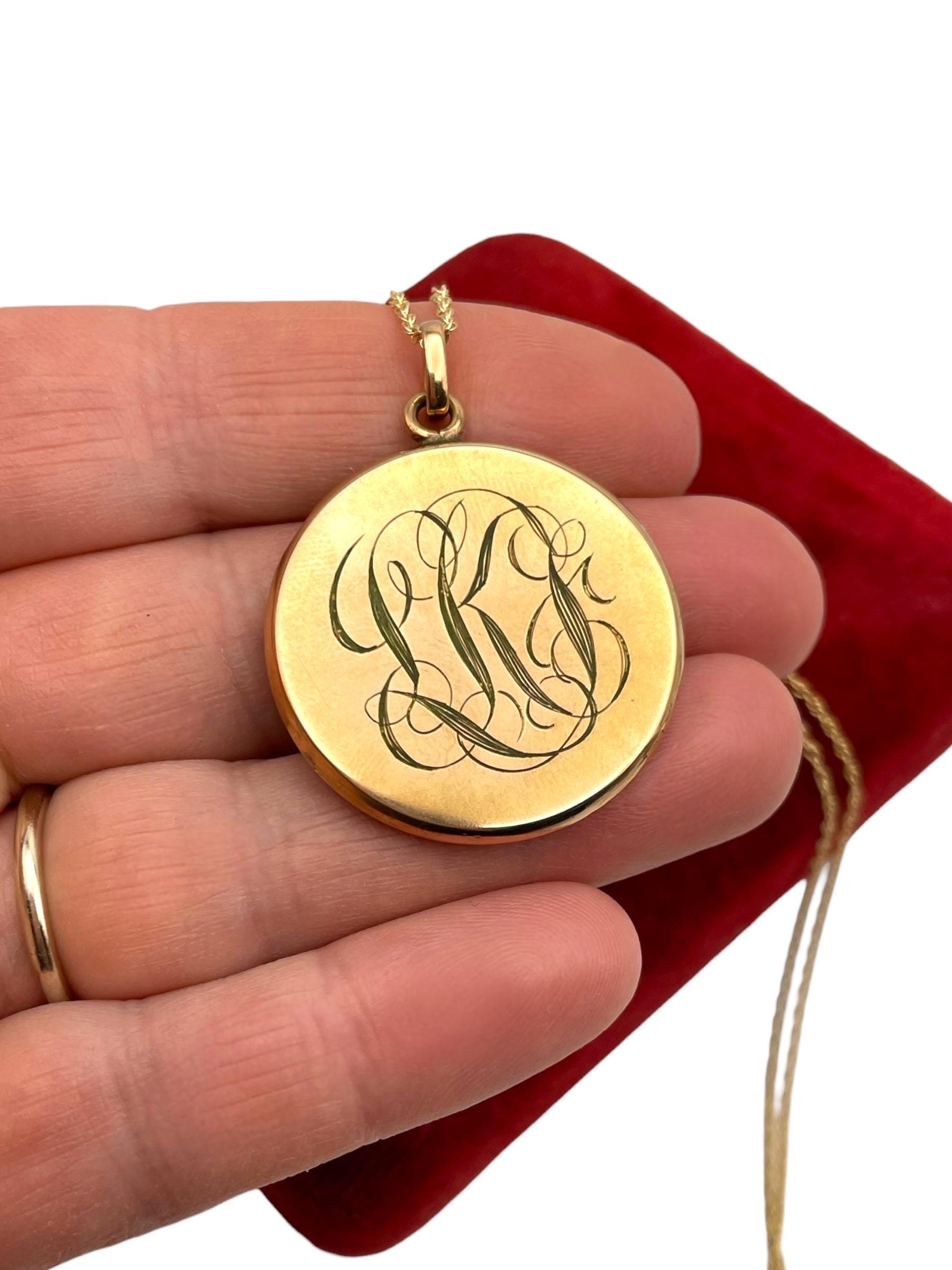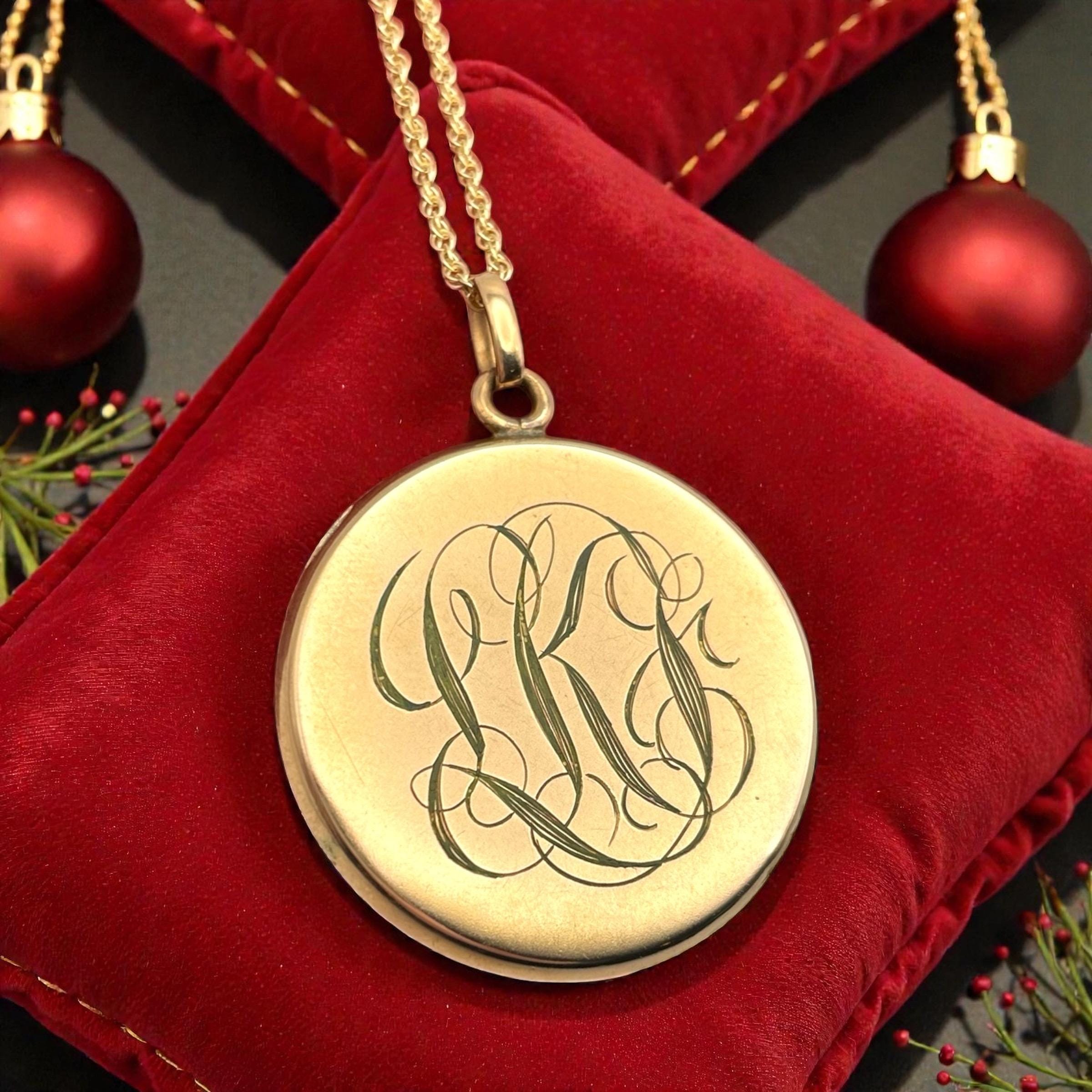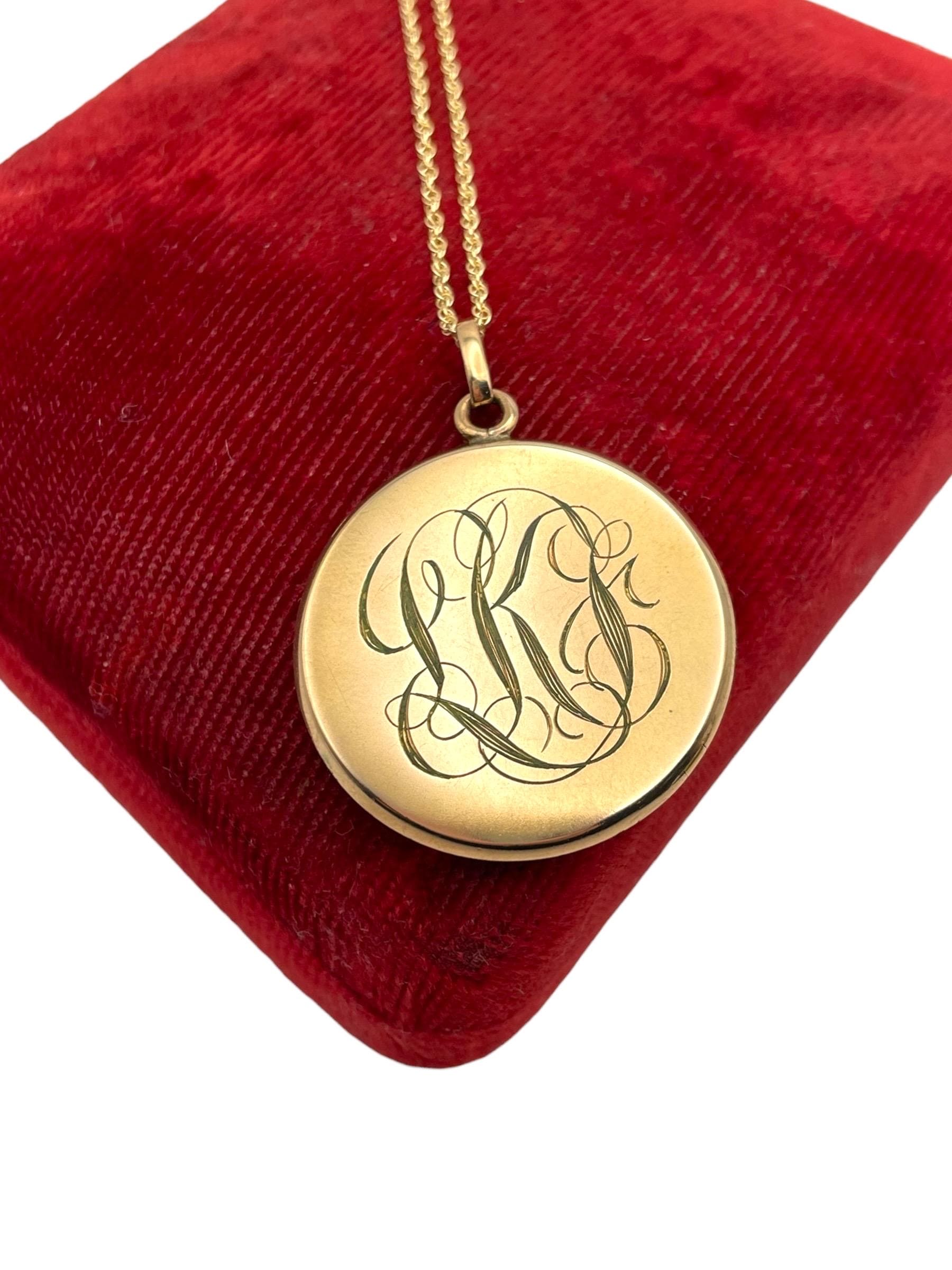 A classic round antique gold shell locket featuring a monogrammed front with the initials of what appears to be "LKF” in swirling cursive script. The back side of this circa early 1900s locket is plain with no decoration. This type of monogrammed item was very popular during the Edwardian era.