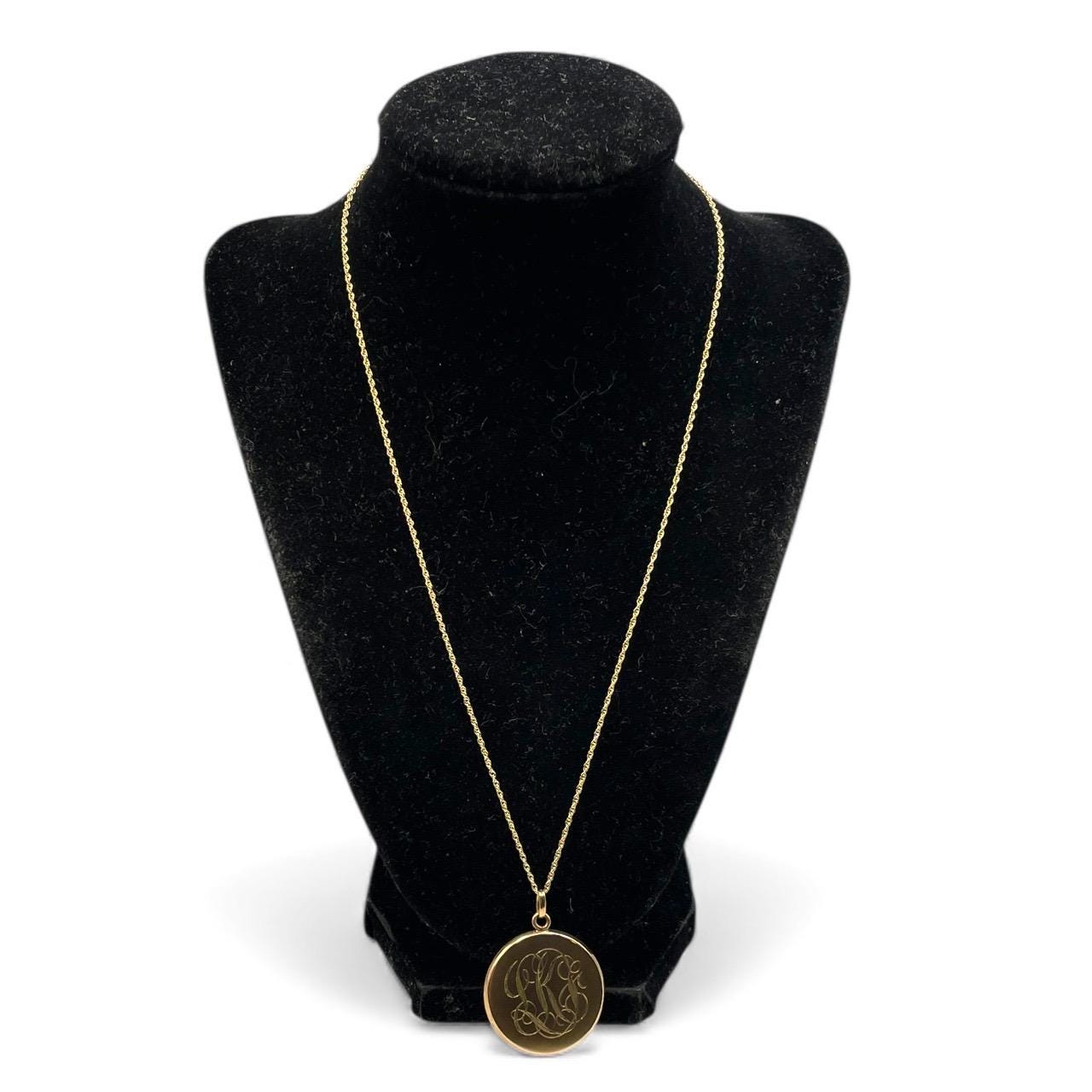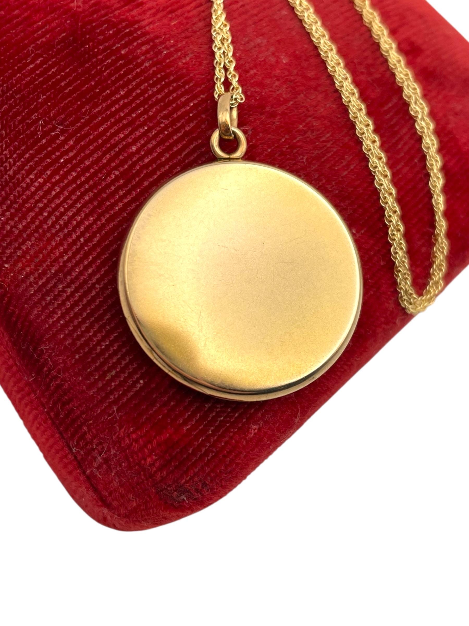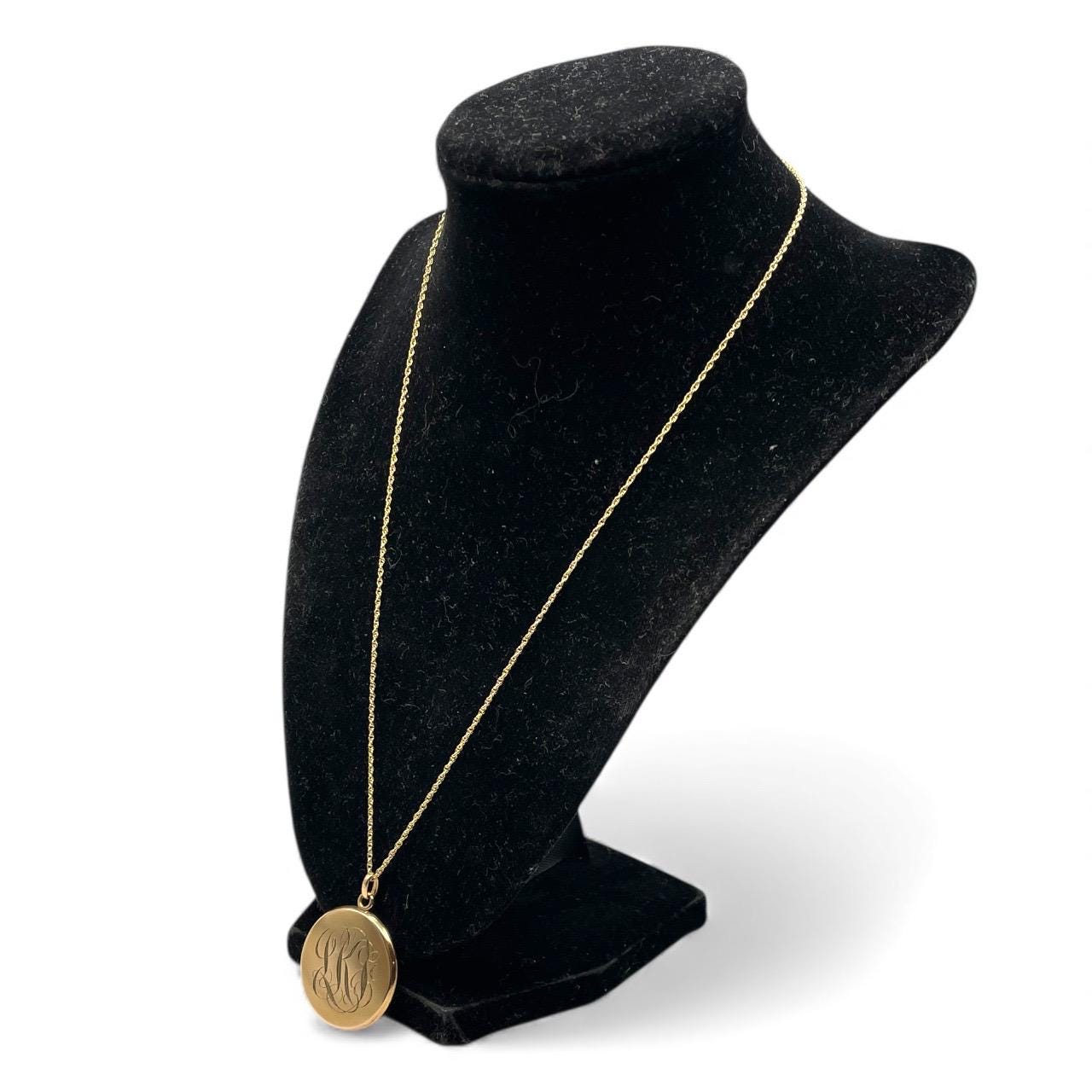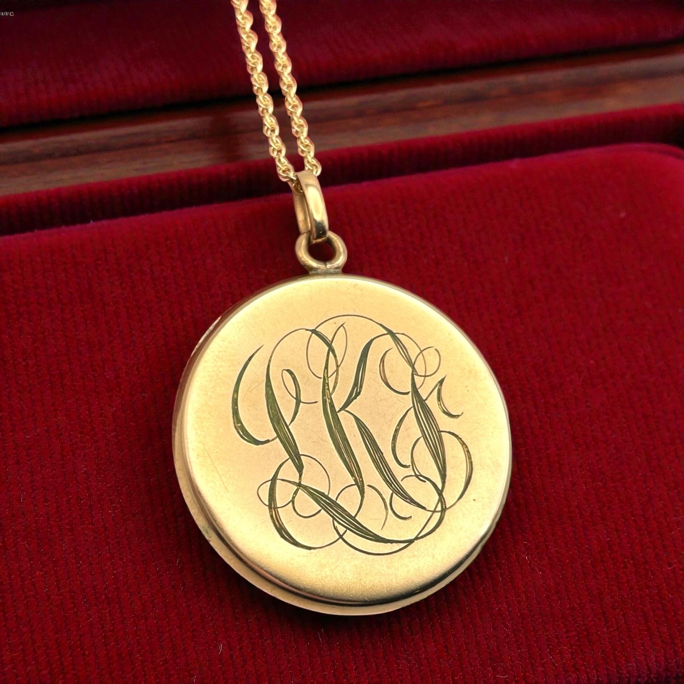 A classic round antique gold shell locket featuring a monogrammed front with the initials of what appears to be "LKF” in swirling cursive script. The back side of this circa early 1900s locket is plain with no decoration. This type of monogrammed item was very popular during the Edwardian era.