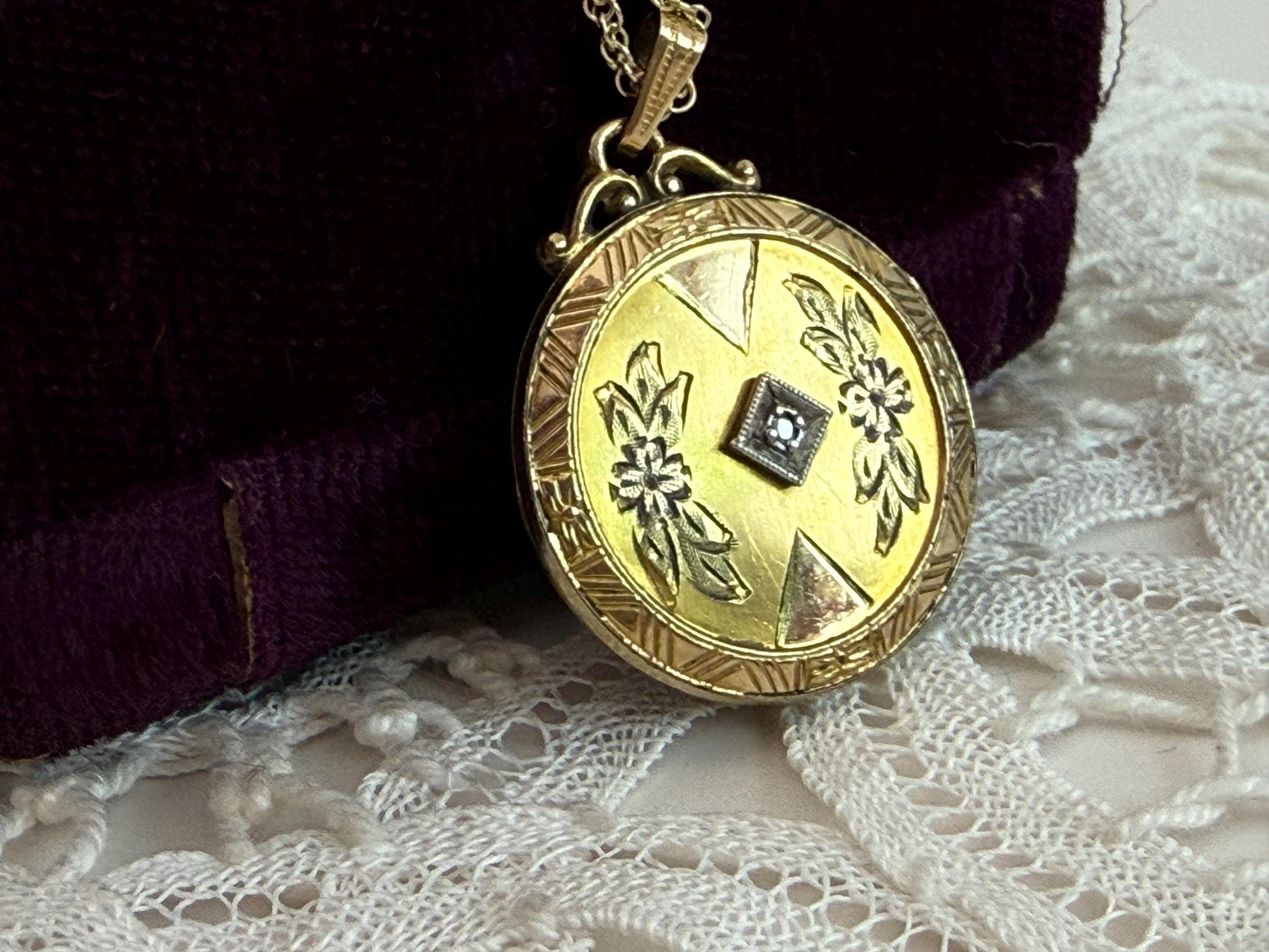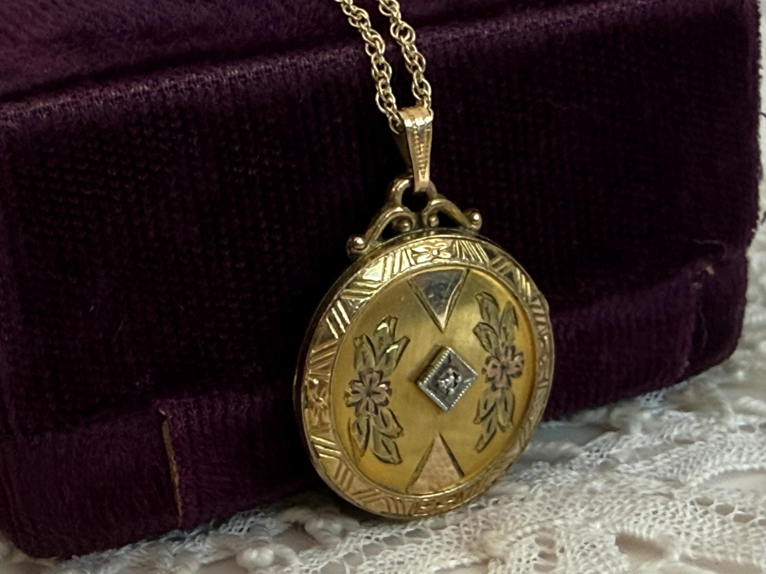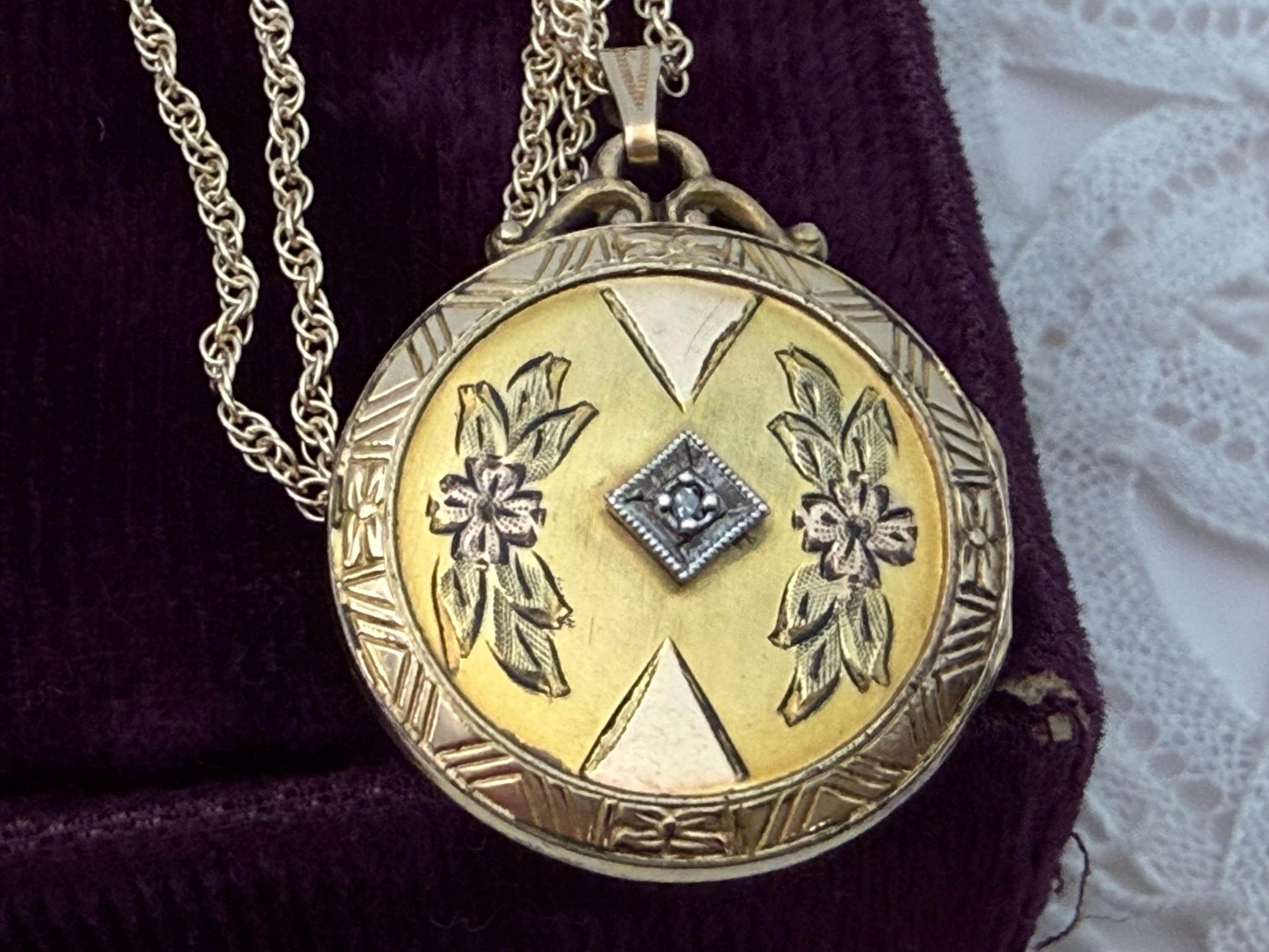 Vintage 10K PS Co Gold Filled Etched & Diamond Round Locket Necklace, 12K GF Chain