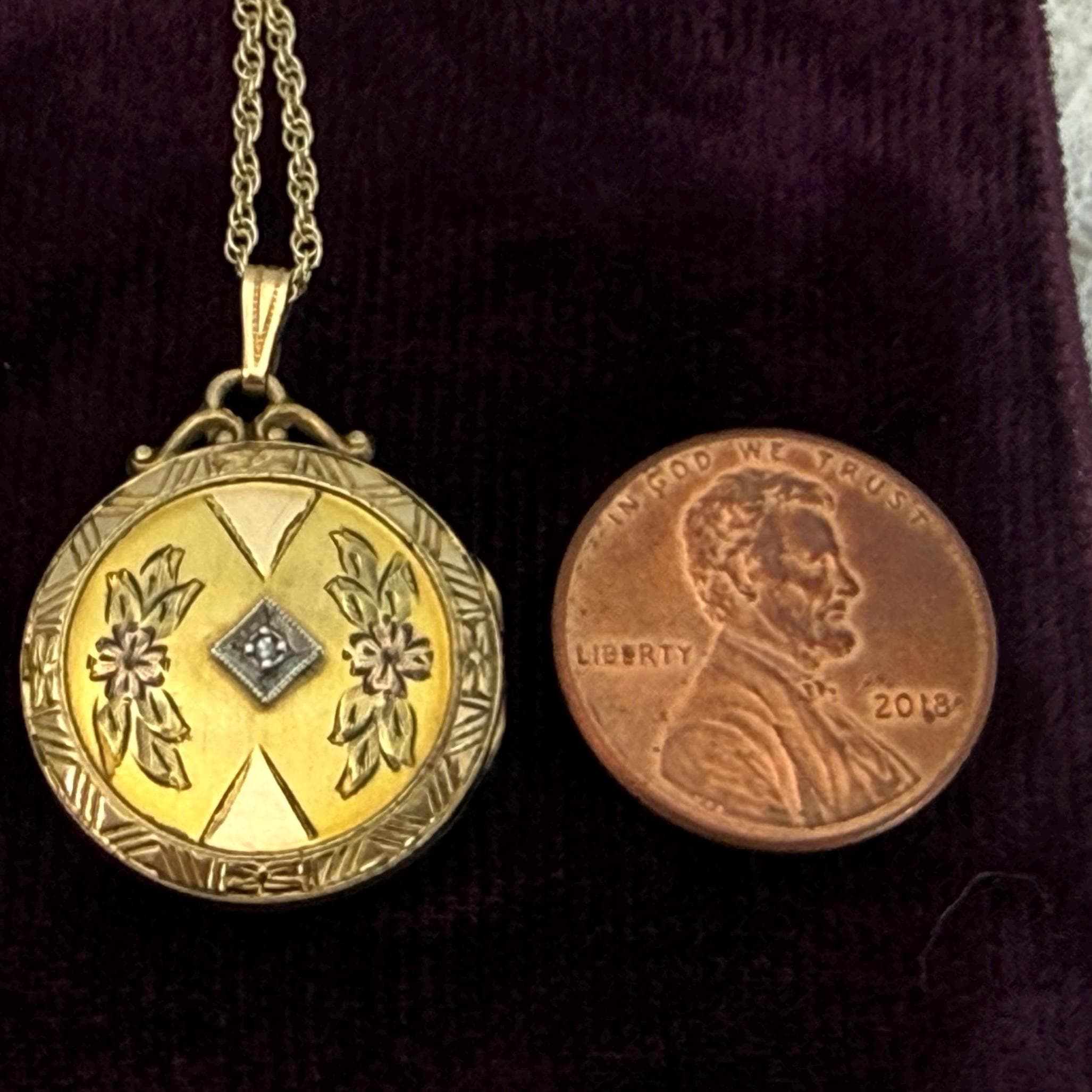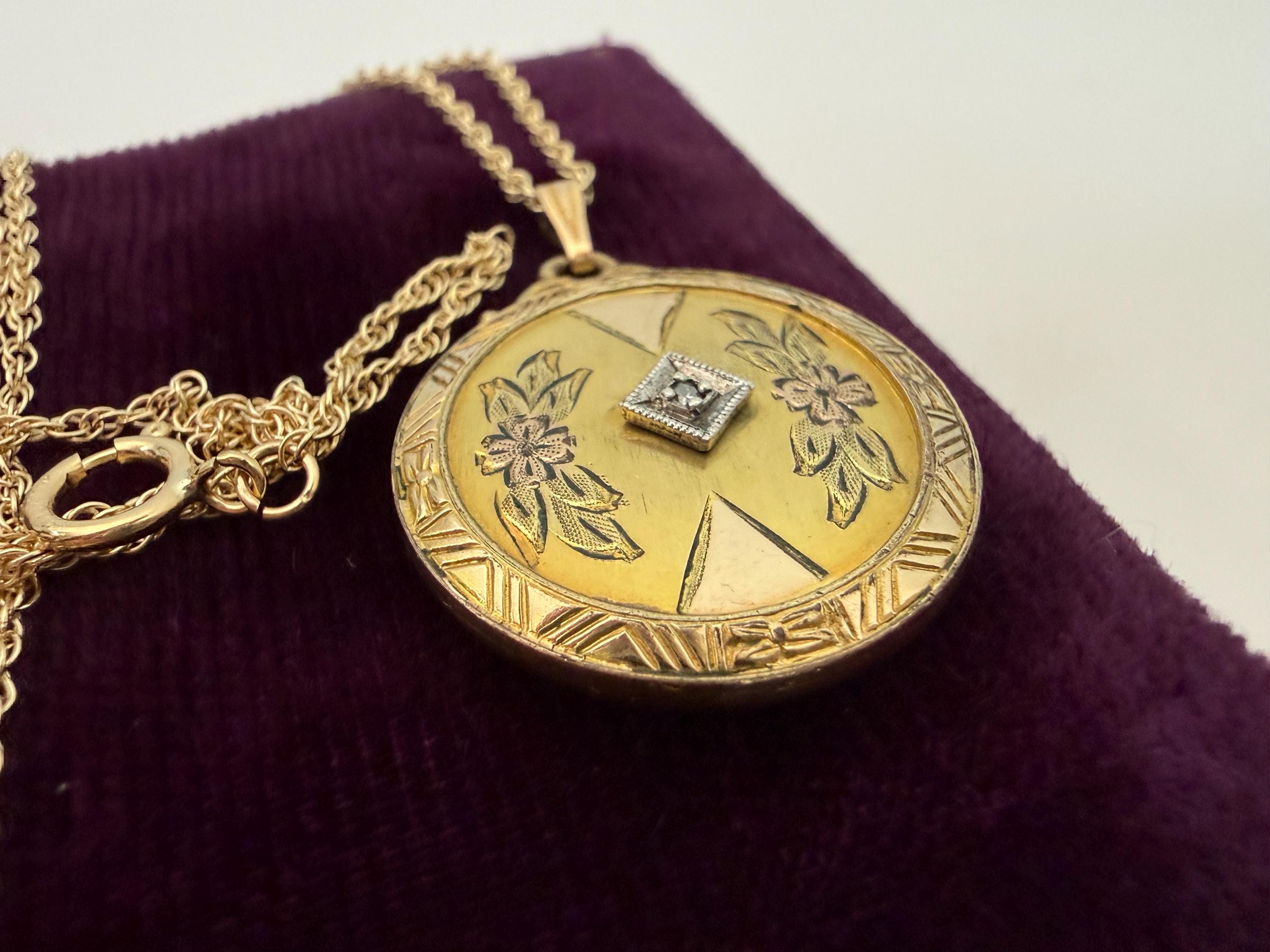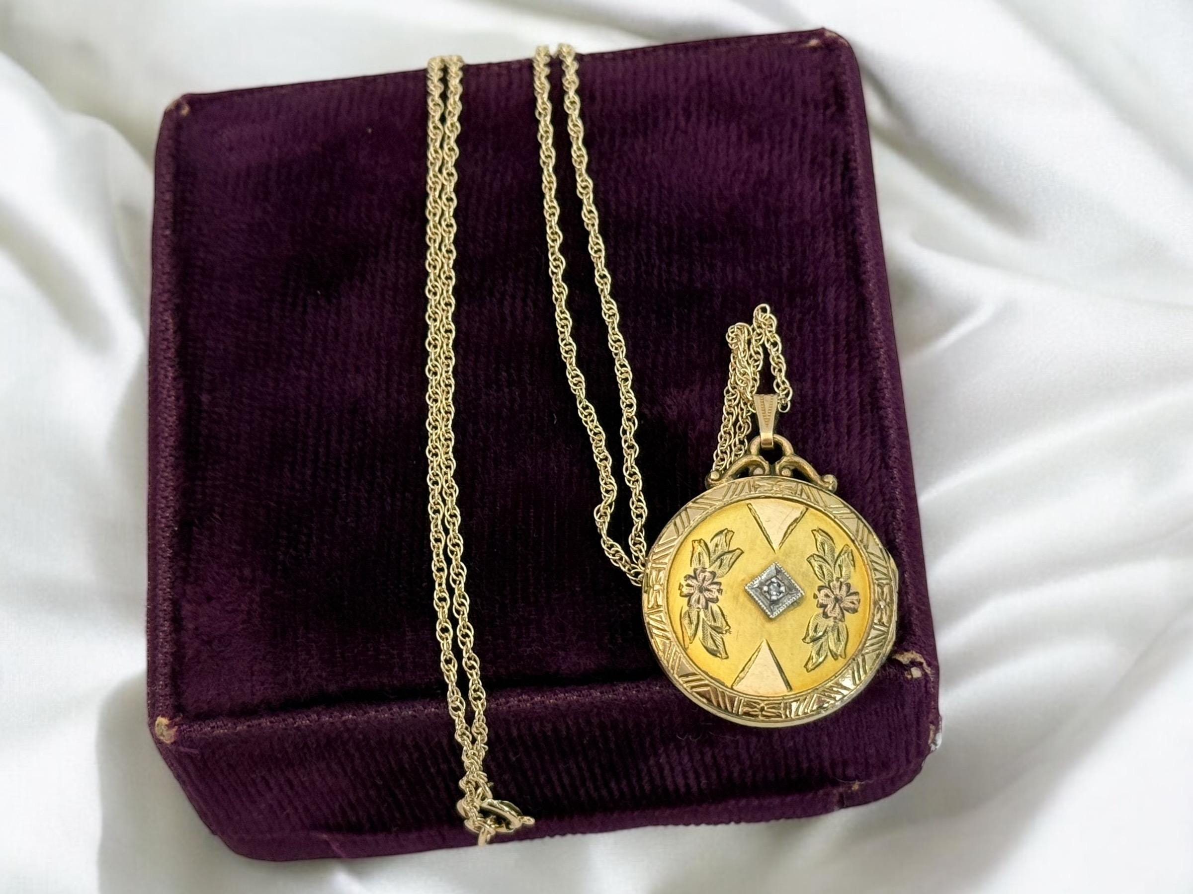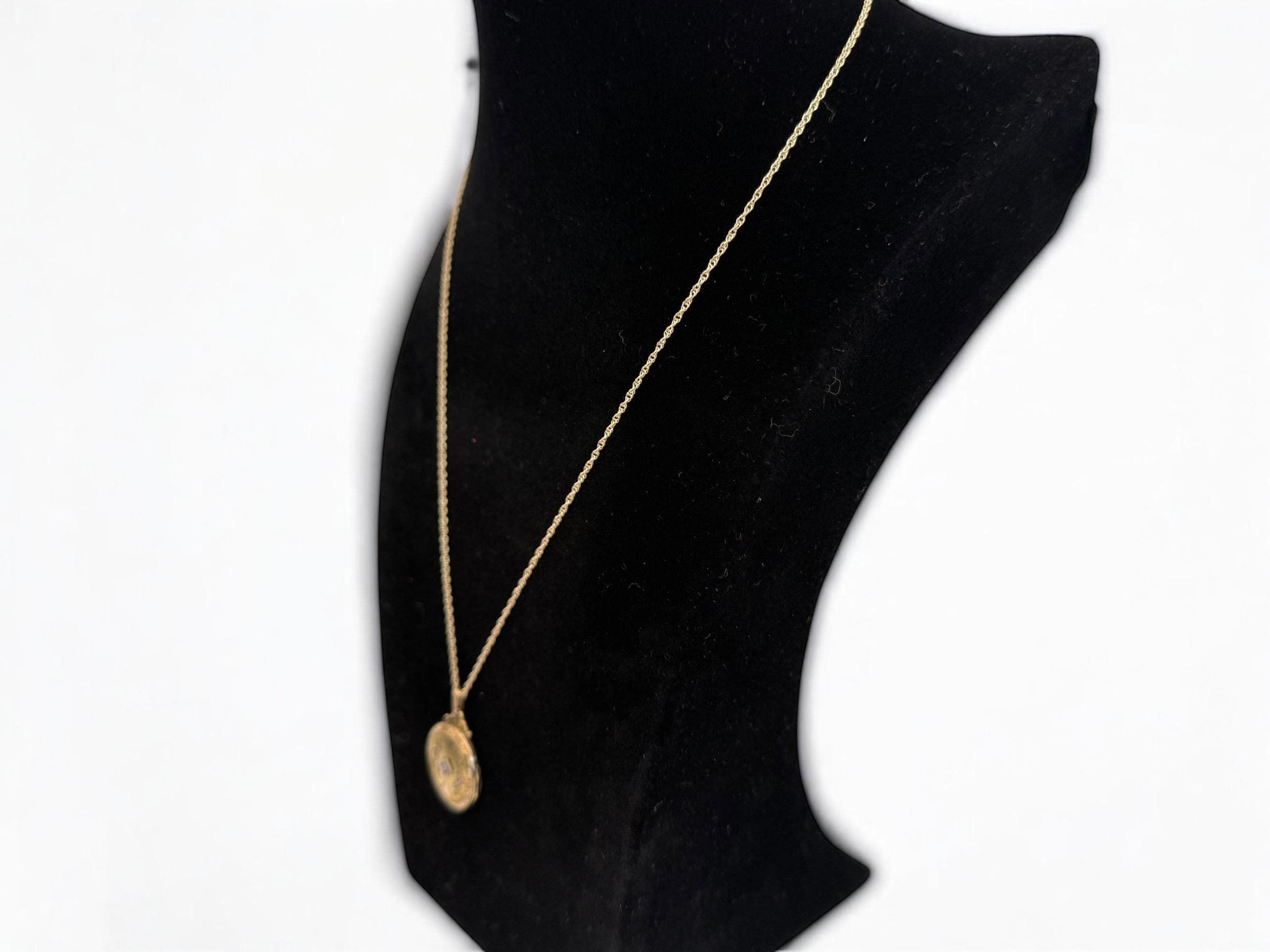 Vintage 10K PS Co Gold Filled Etched & Diamond Round Locket Necklace, 12K GF Chain