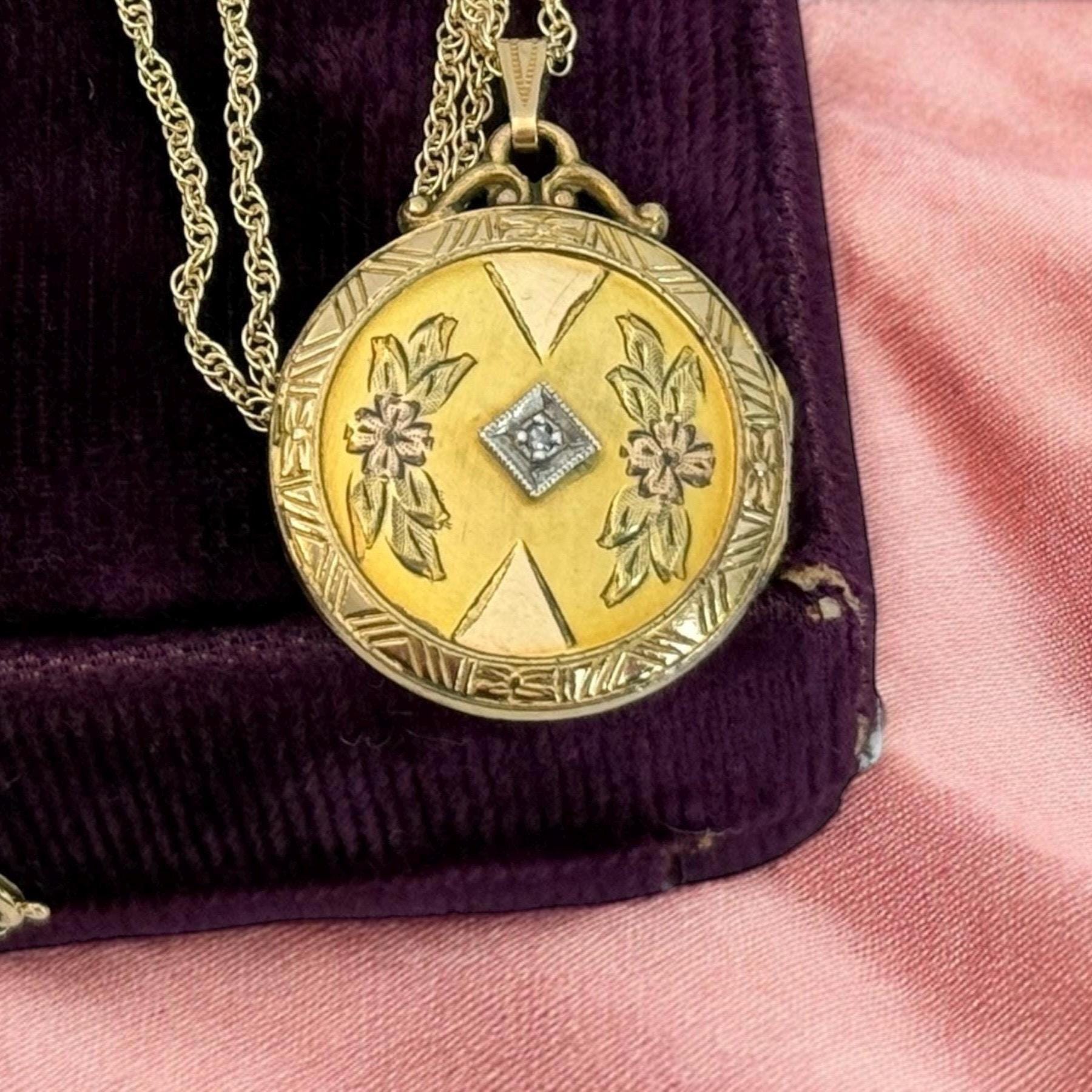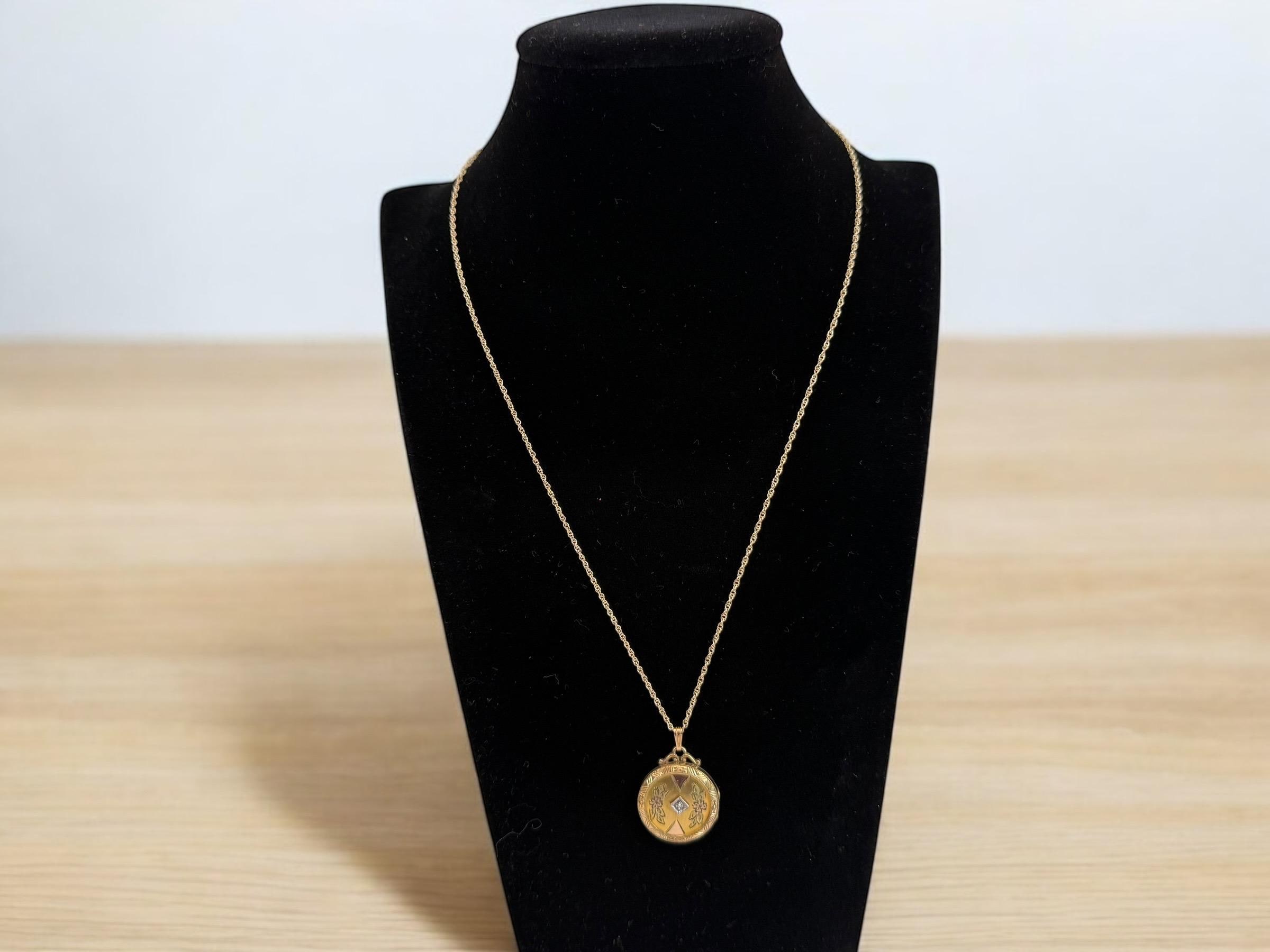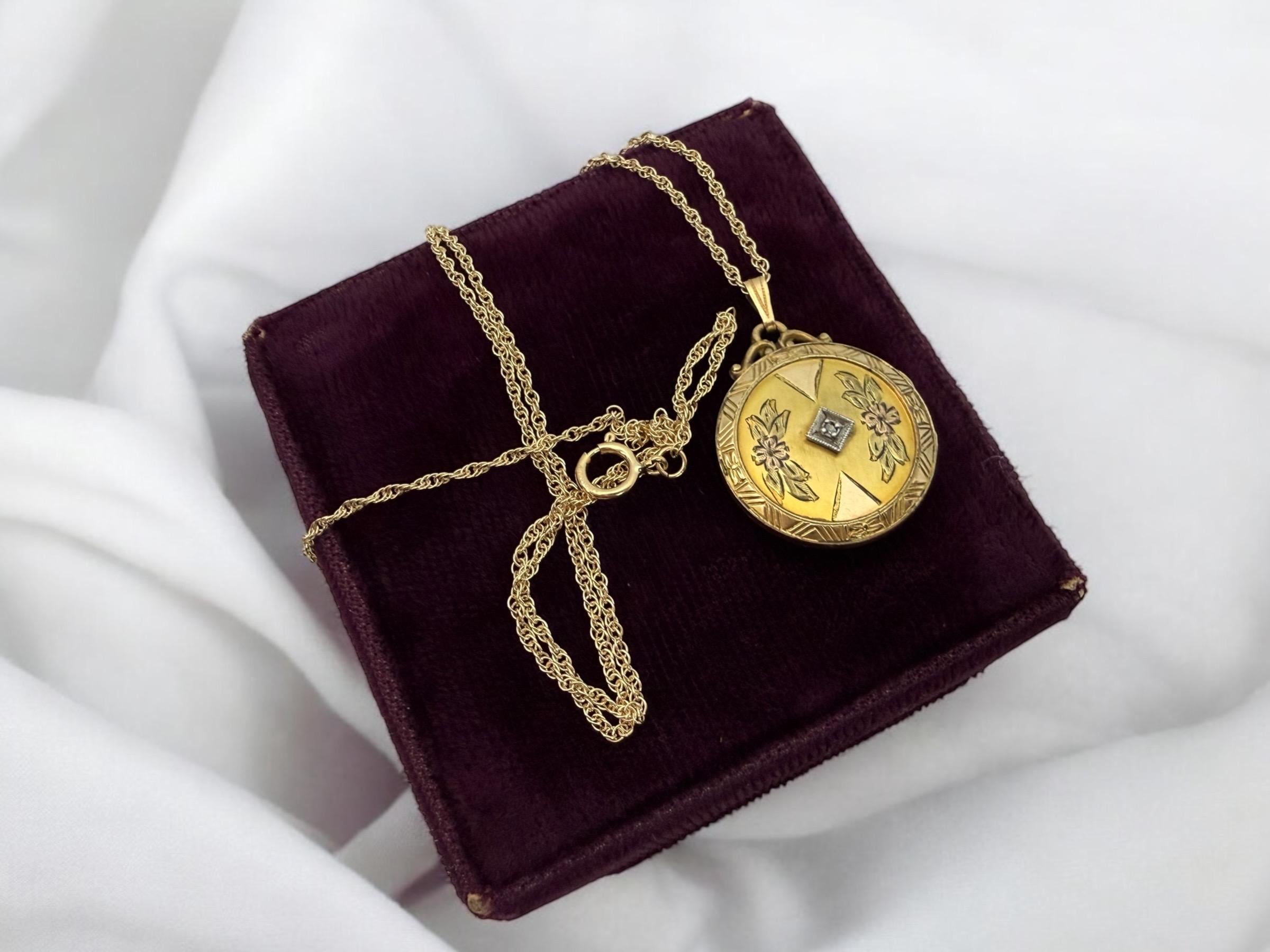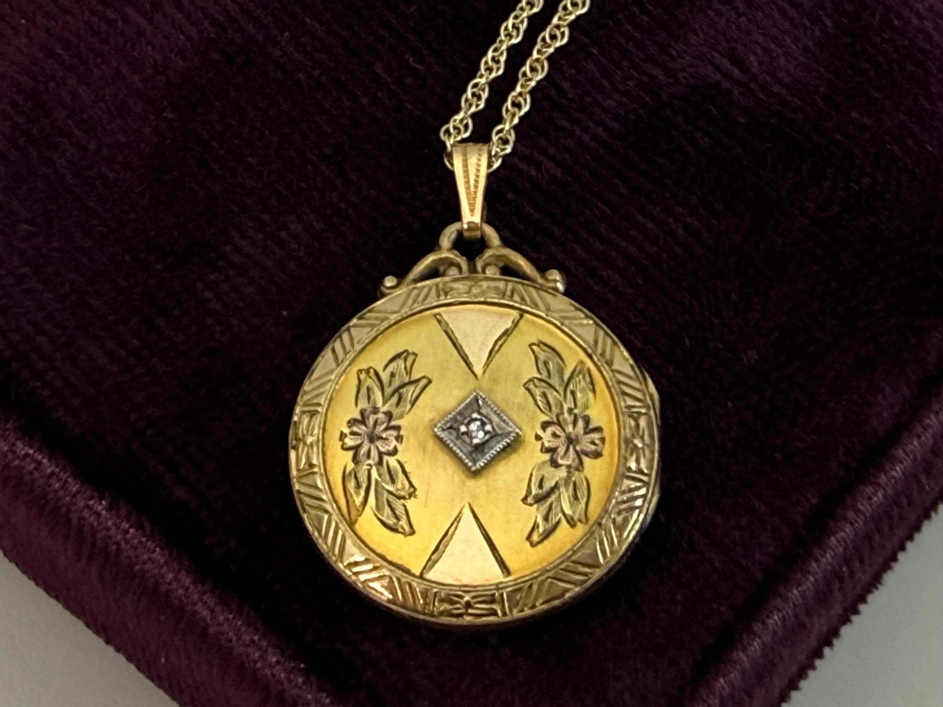 A wonderful and ornate vintage 10K gold filled round locket on a 12K gold filled chain. This locket has an elaborately decorated and etched floral front that features a small round diamond in the center. There is an etched outer frame that is ornate with a geometric design. This frame is on the back and front sides. The back center is plain with no design.