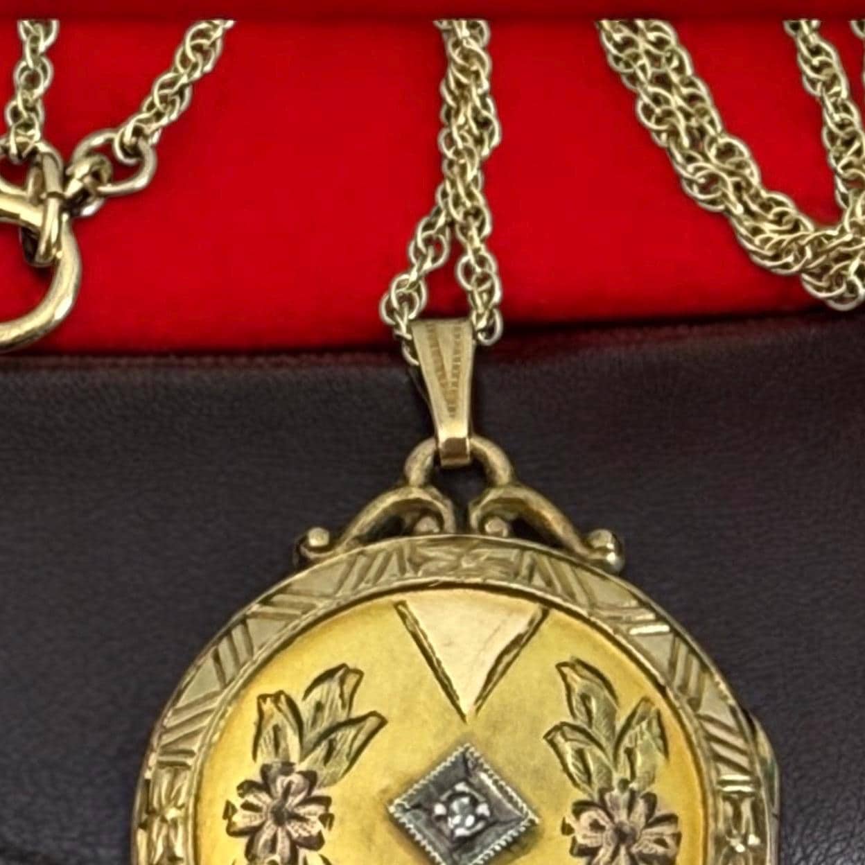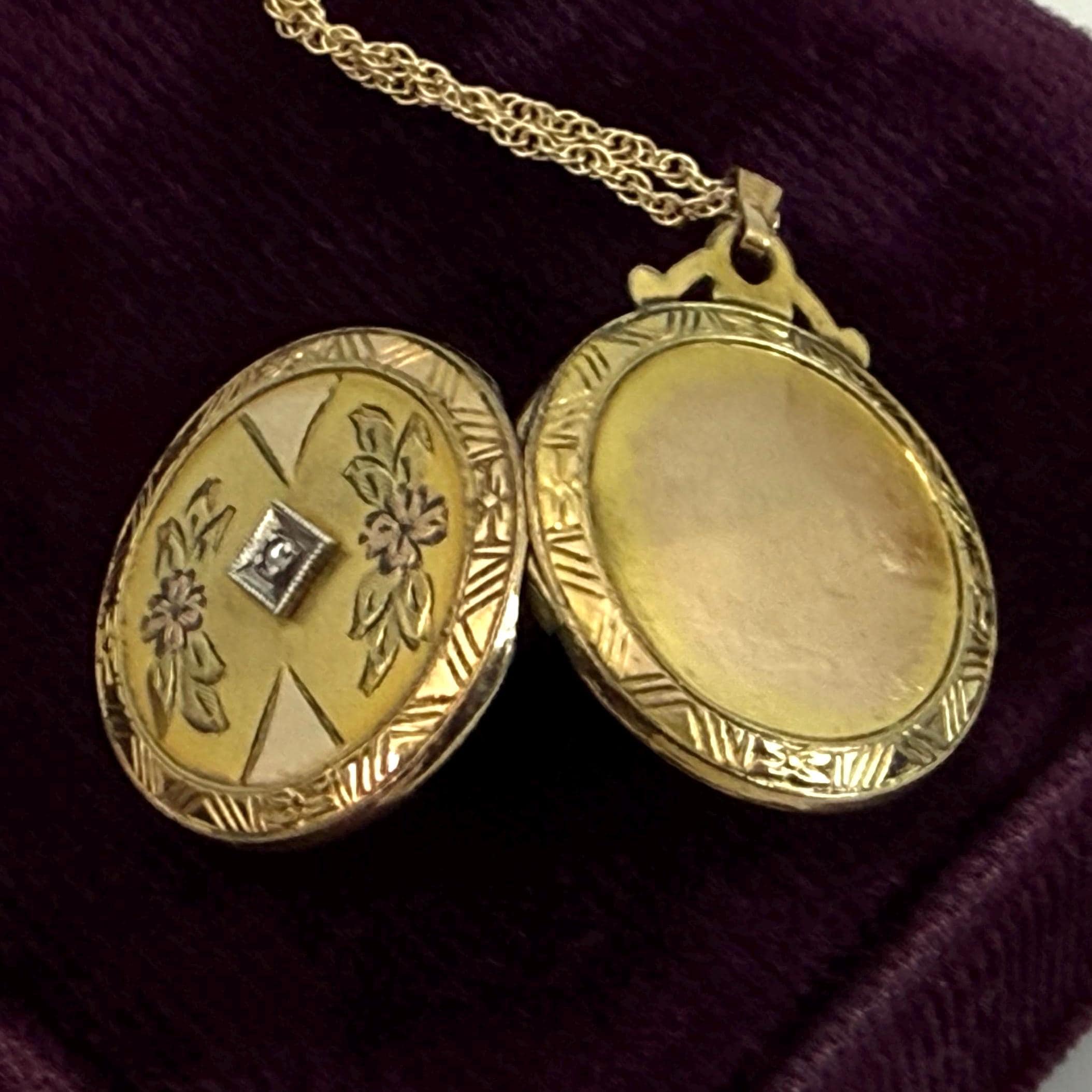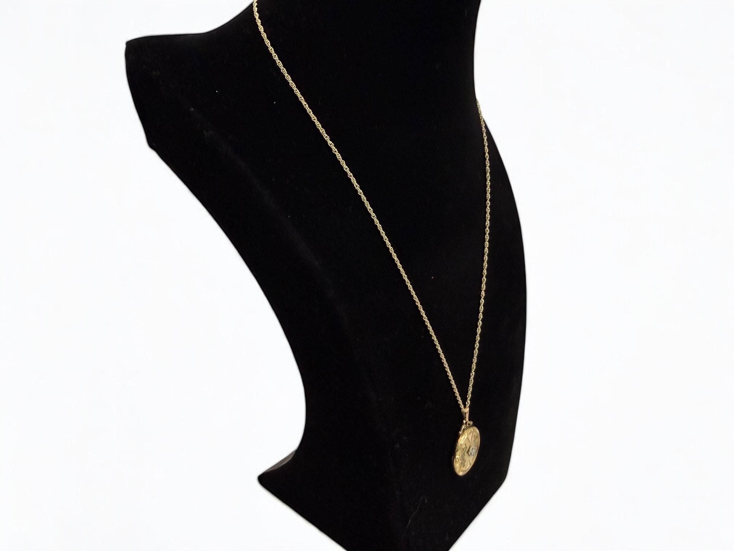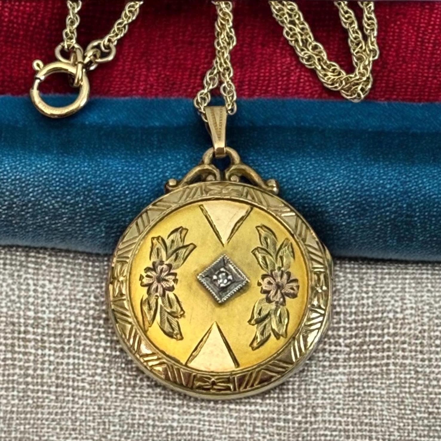 A wonderful and ornate vintage 10K gold filled round locket on a 12K gold filled chain. This locket has an elaborately decorated and etched floral front that features a small round diamond in the center. There is an etched outer frame that is ornate with a geometric design. This frame is on the back and front sides. The back center is plain with no design.
