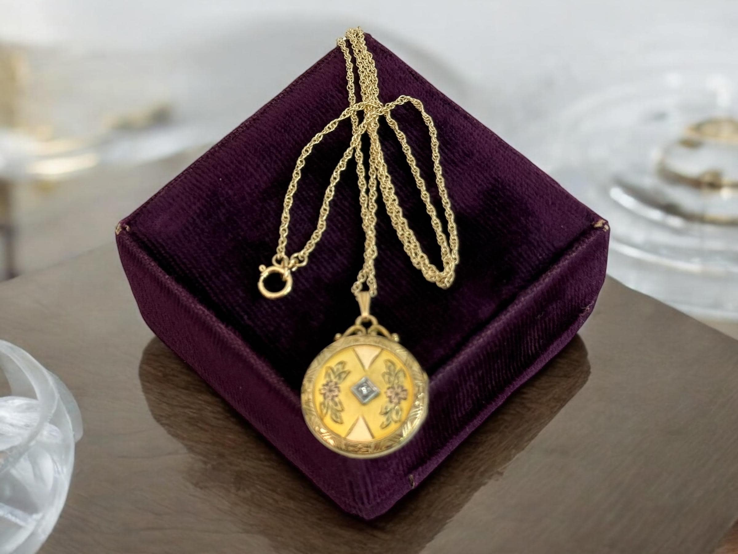 The vintage locket hangs from a new 14K gold filled twisted link chain that secures with a spring clasp.