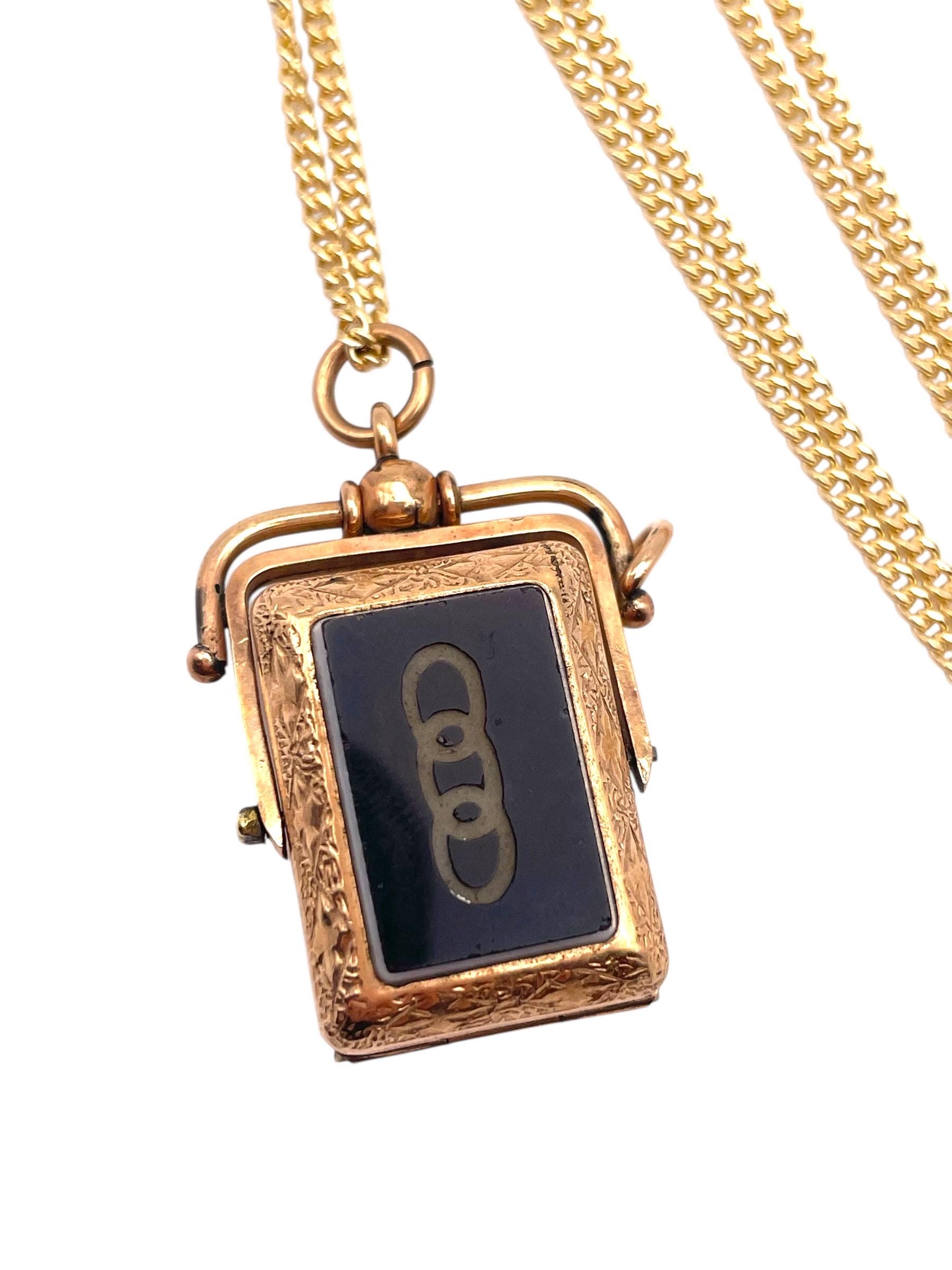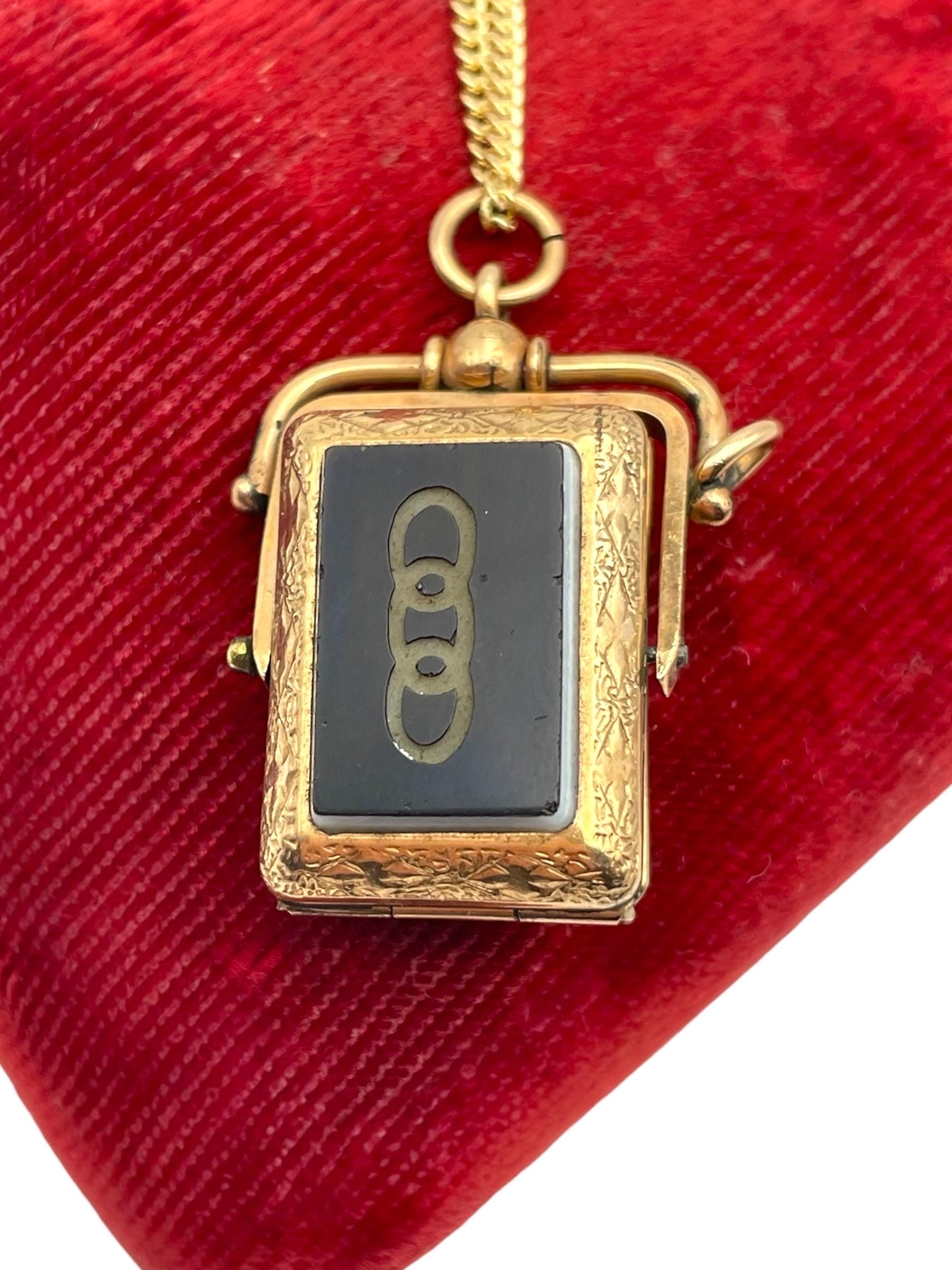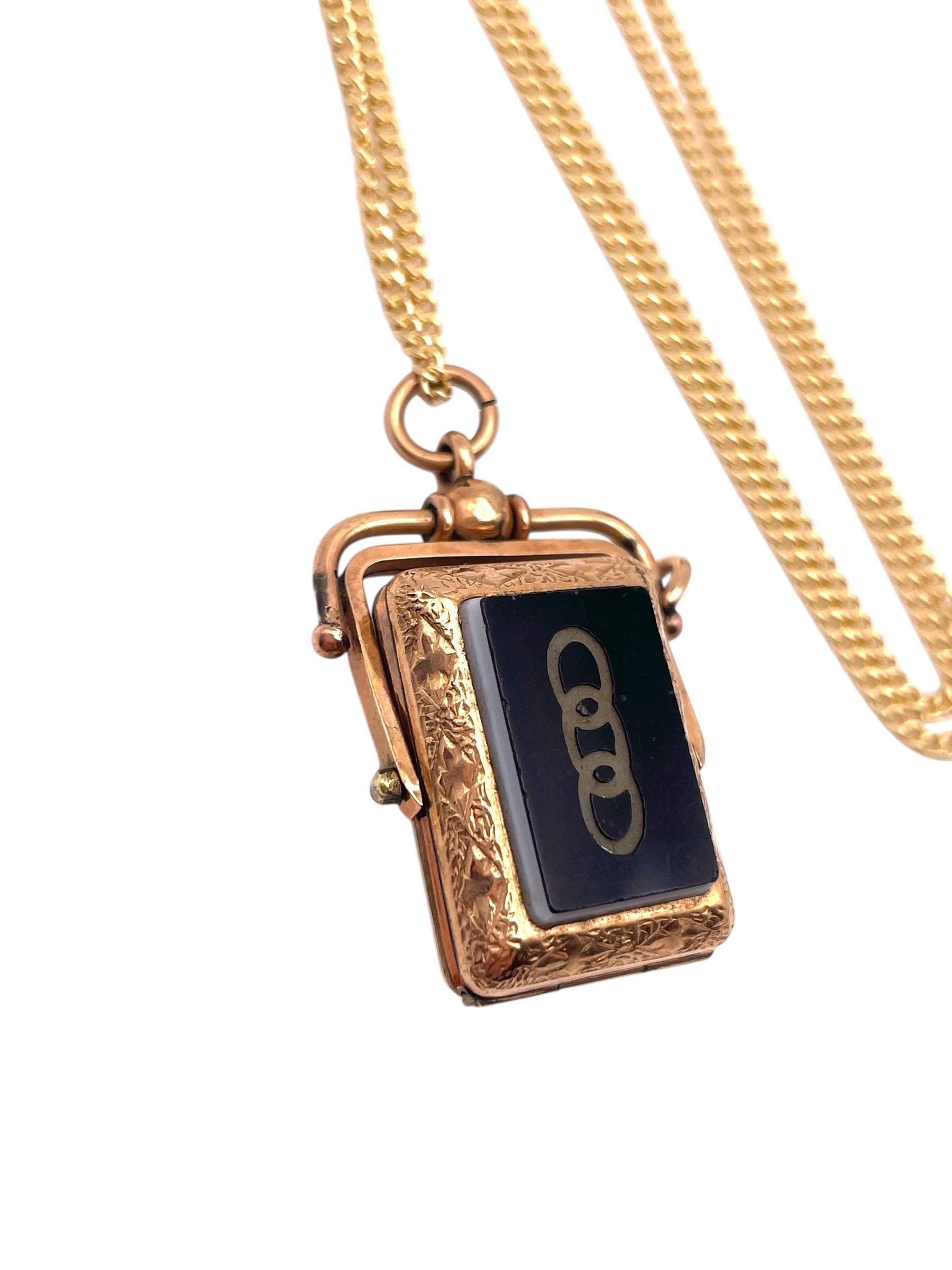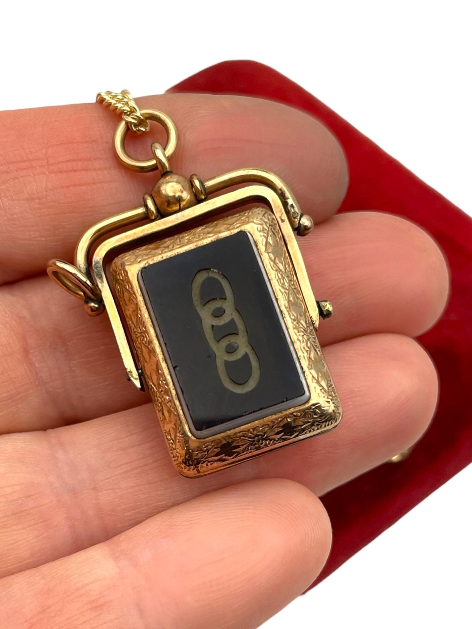 Amazingly detailed antique fob necklace. This necklace is gorgeous - times two! One side of the 10K gold filled locket has a rounded carnelian stone. The other side has a black rectangle with three carved interlocking rings (white under the black top). There is a bail attached to the one side of the fob as well as in the top center.