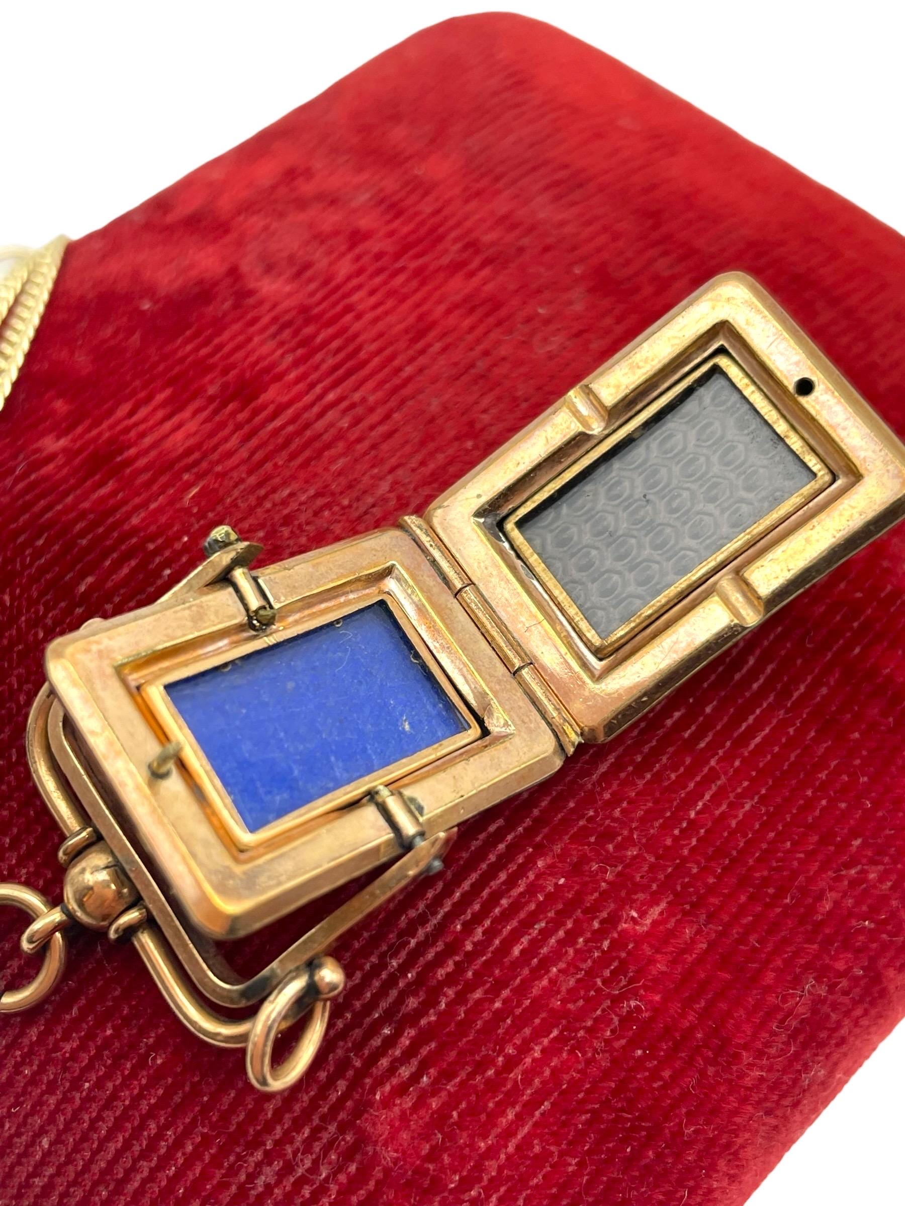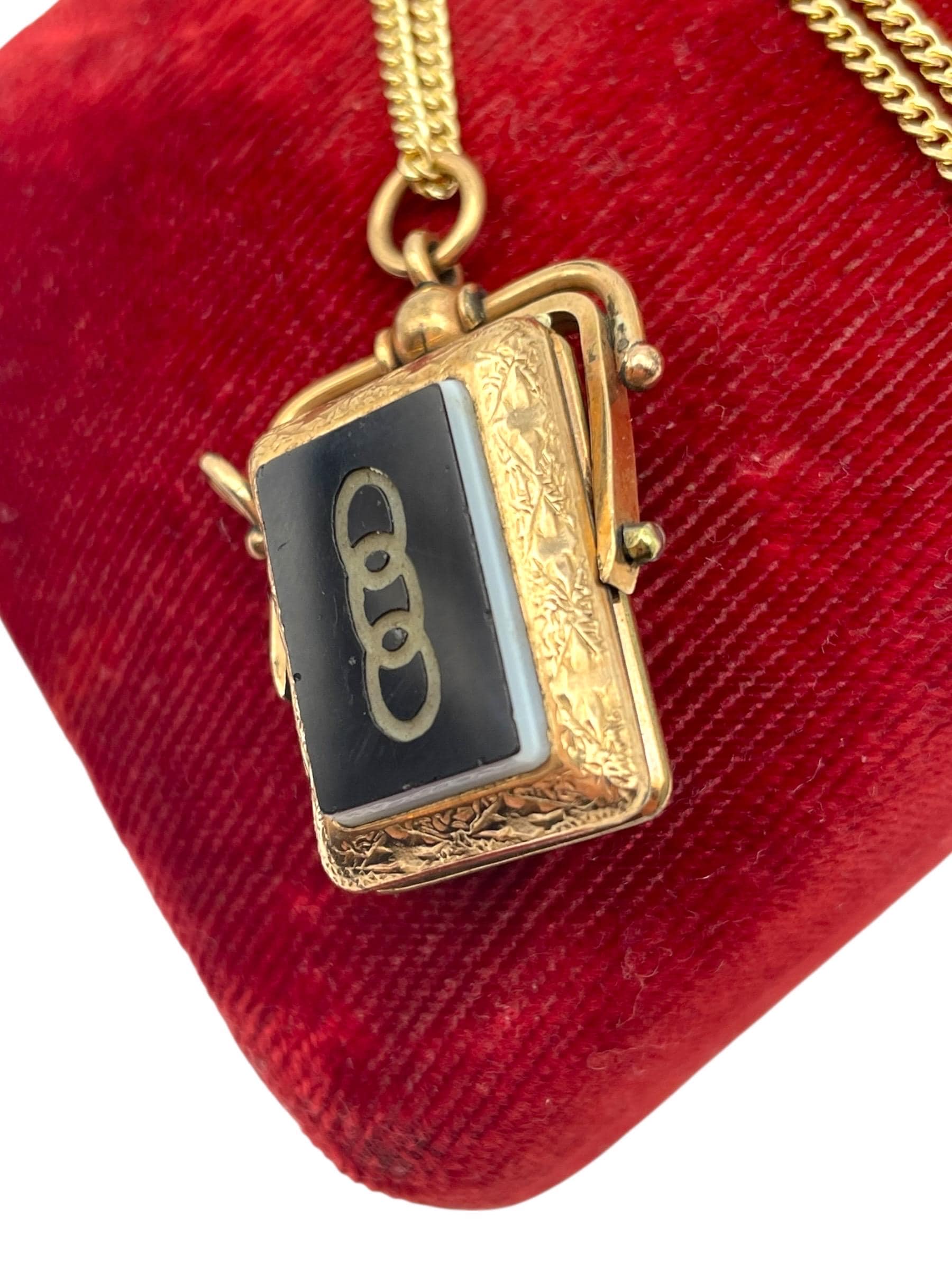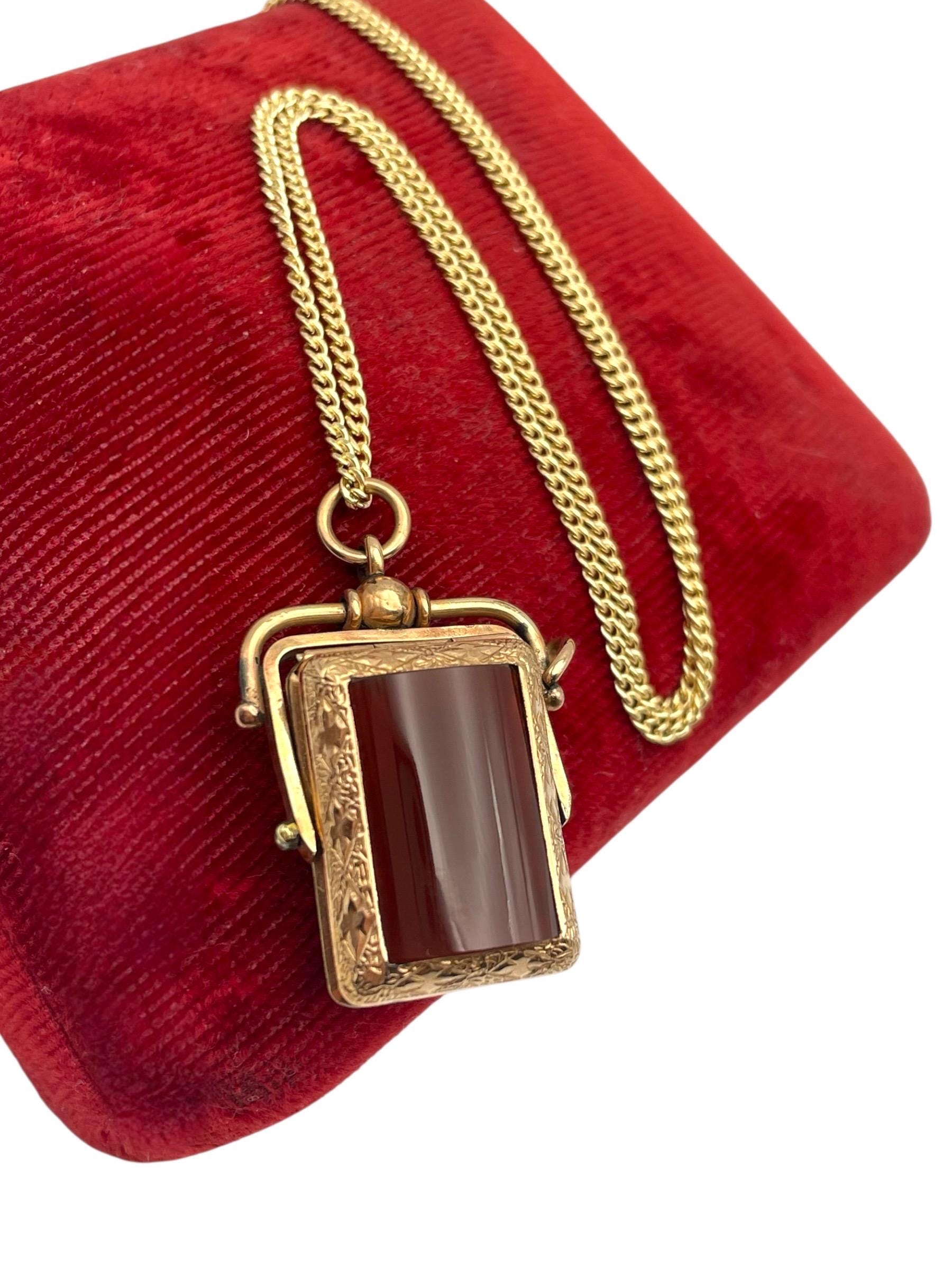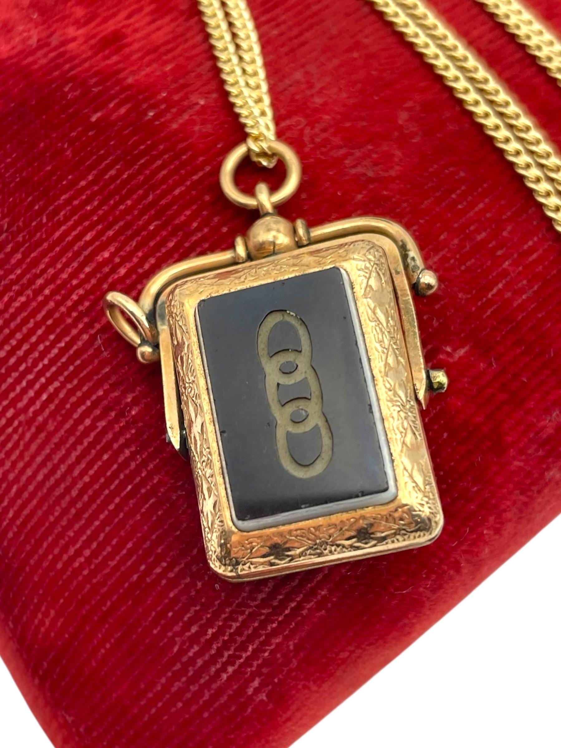 Amazingly detailed antique fob necklace. This necklace is gorgeous - times two! One side of the 10K gold filled locket has a rounded carnelian stone. The other side has a black rectangle with three carved interlocking rings (white under the black top). There is a bail attached to the one side of the fob as well as in the top center.