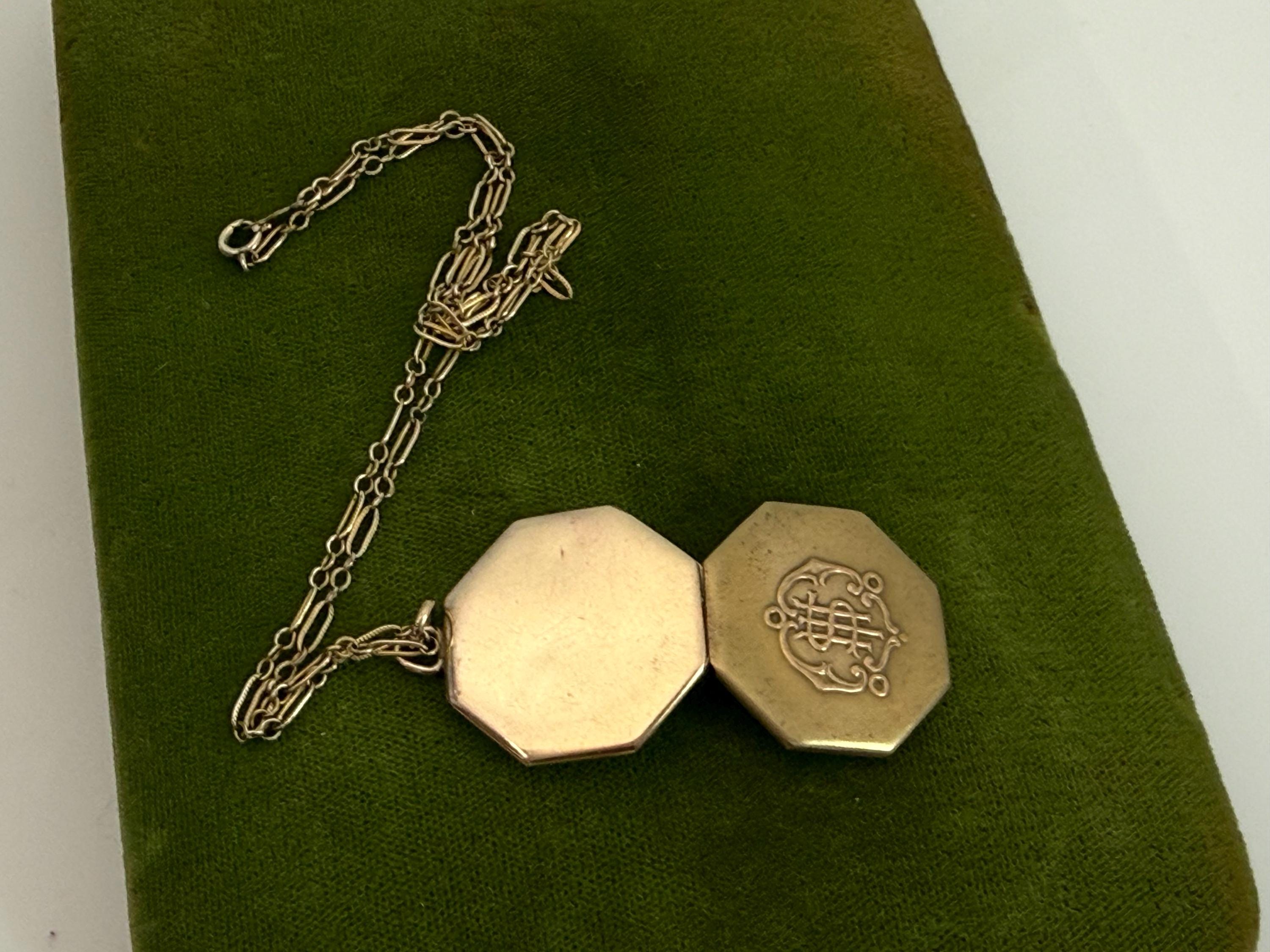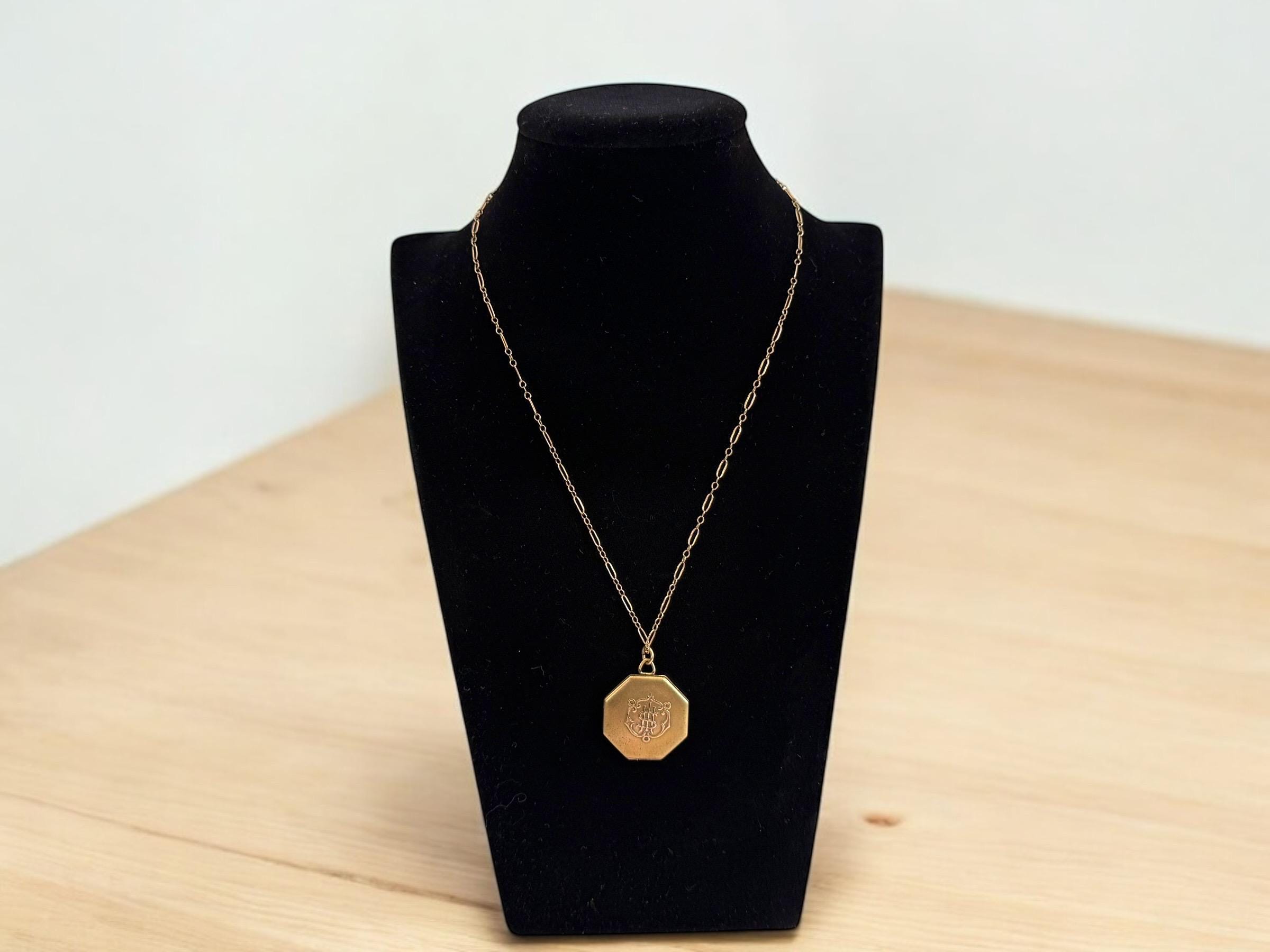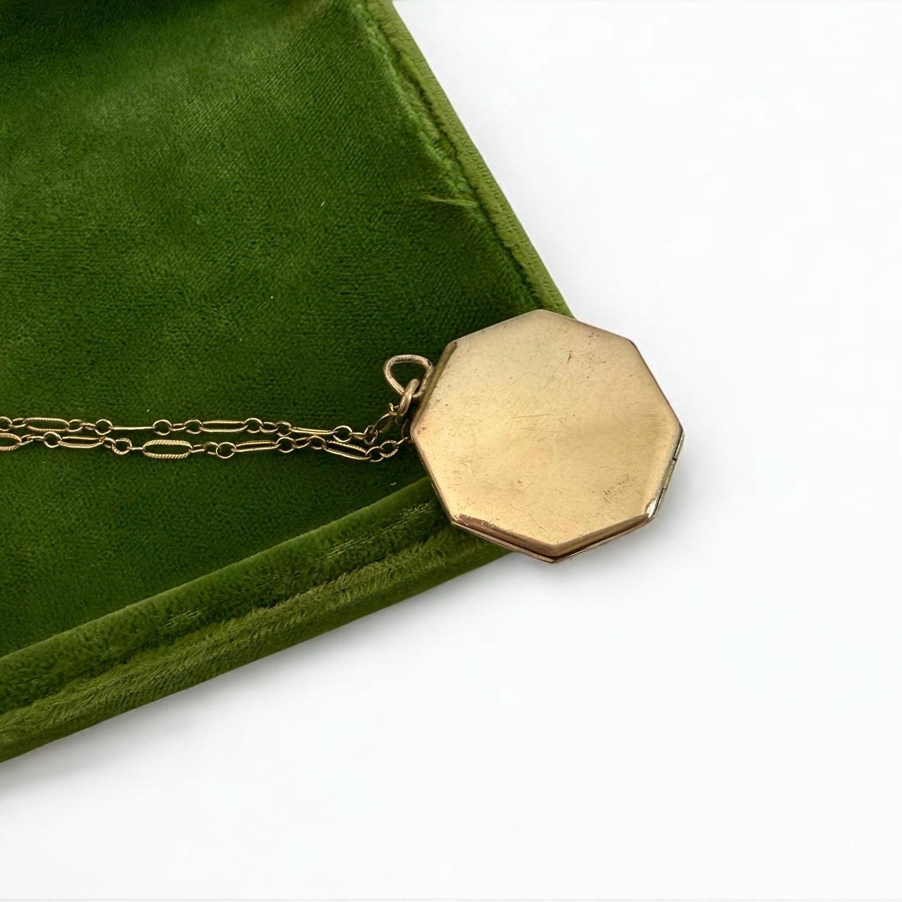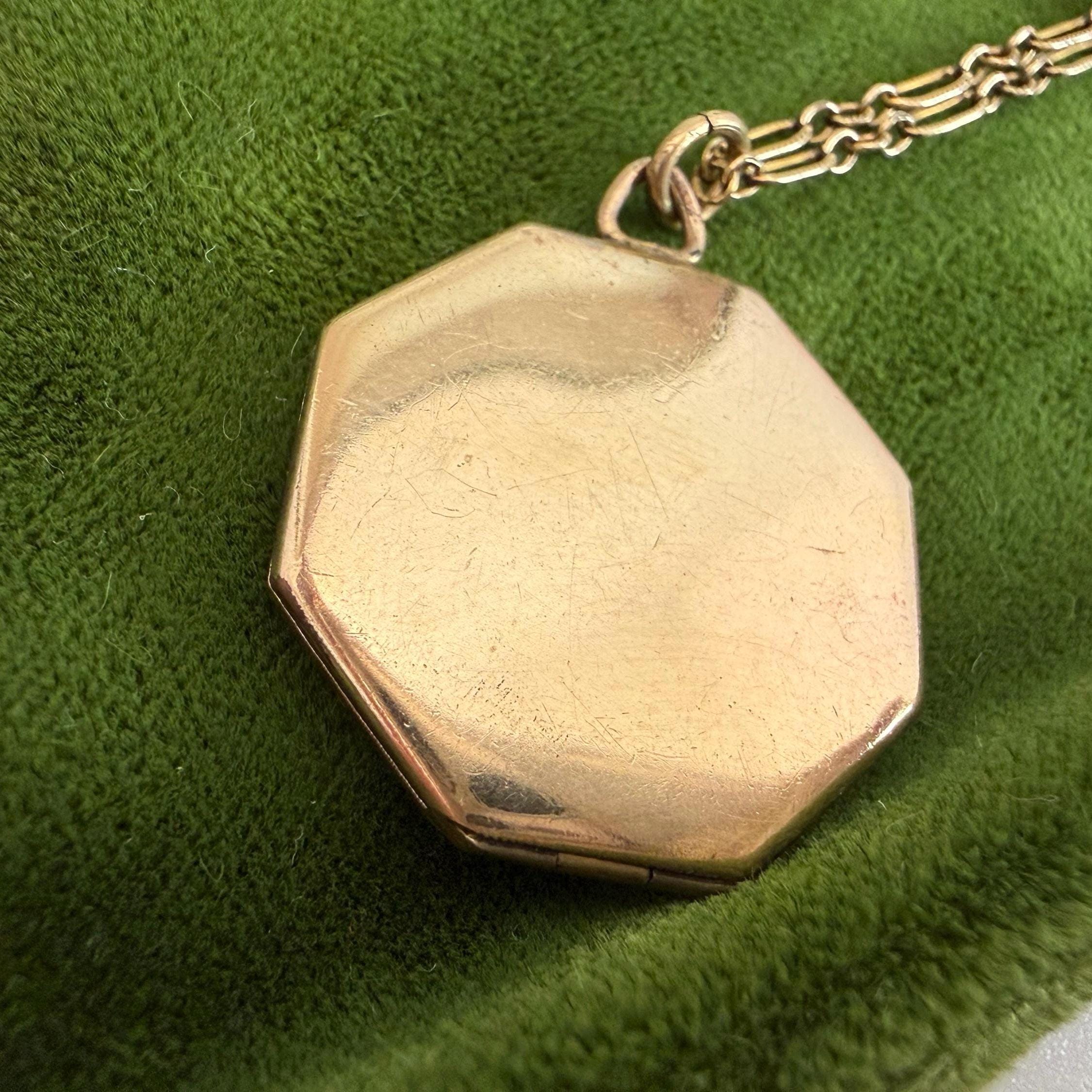 This unique 6 sided locket pendant hangs from a vintage 12K gold filled specialty link chain. The gold filled chain's spring ring clasp closes securely.