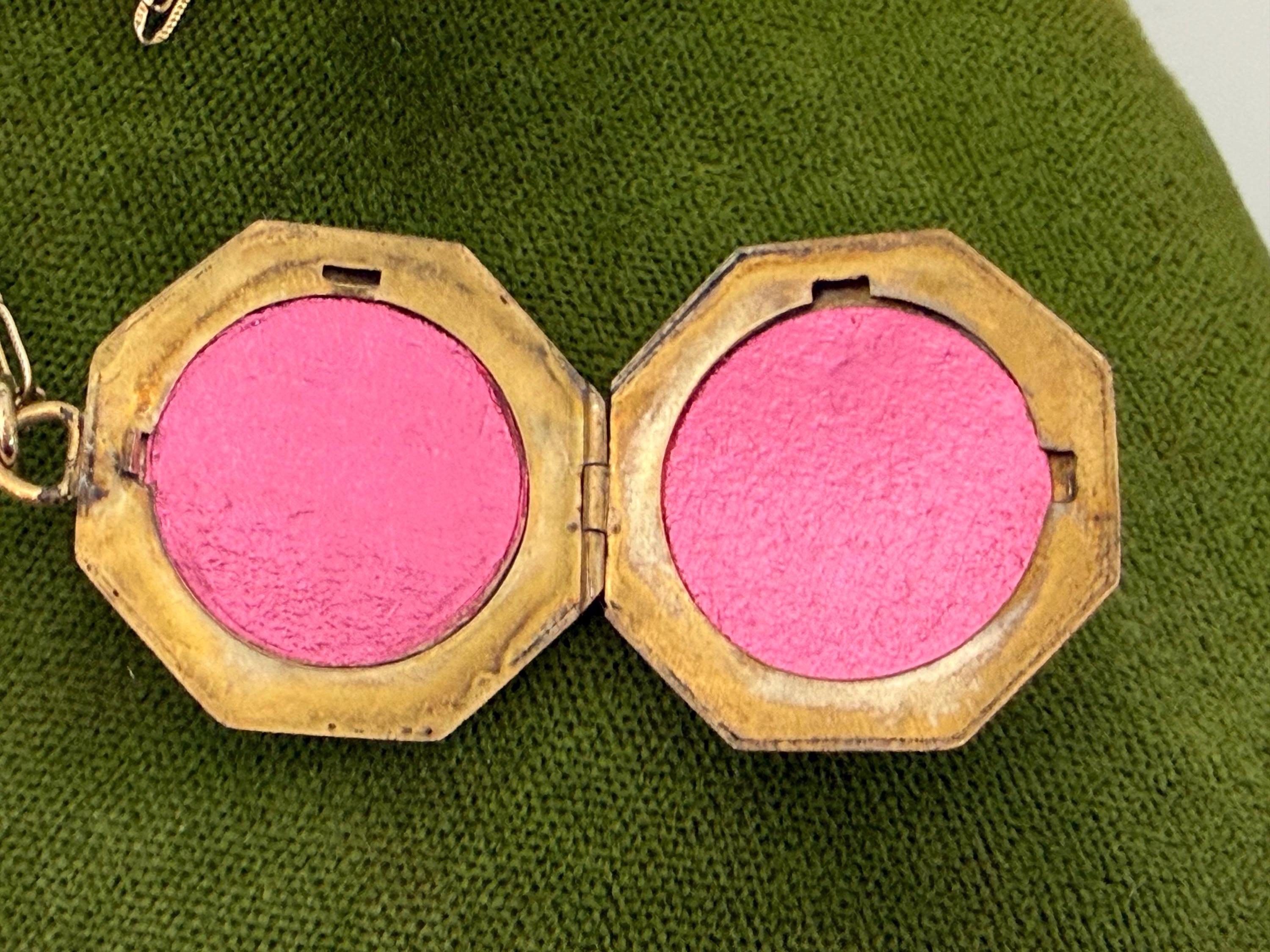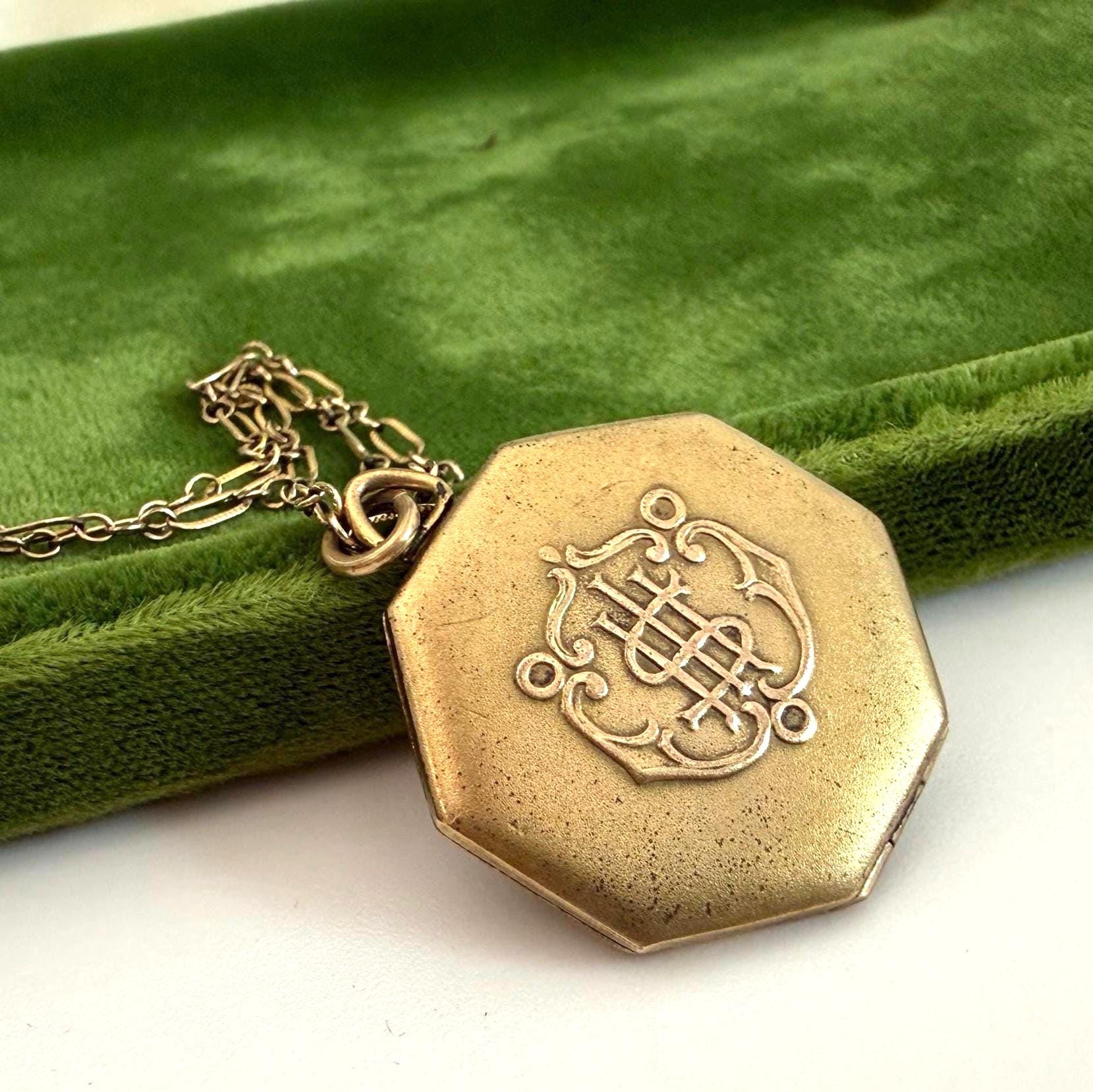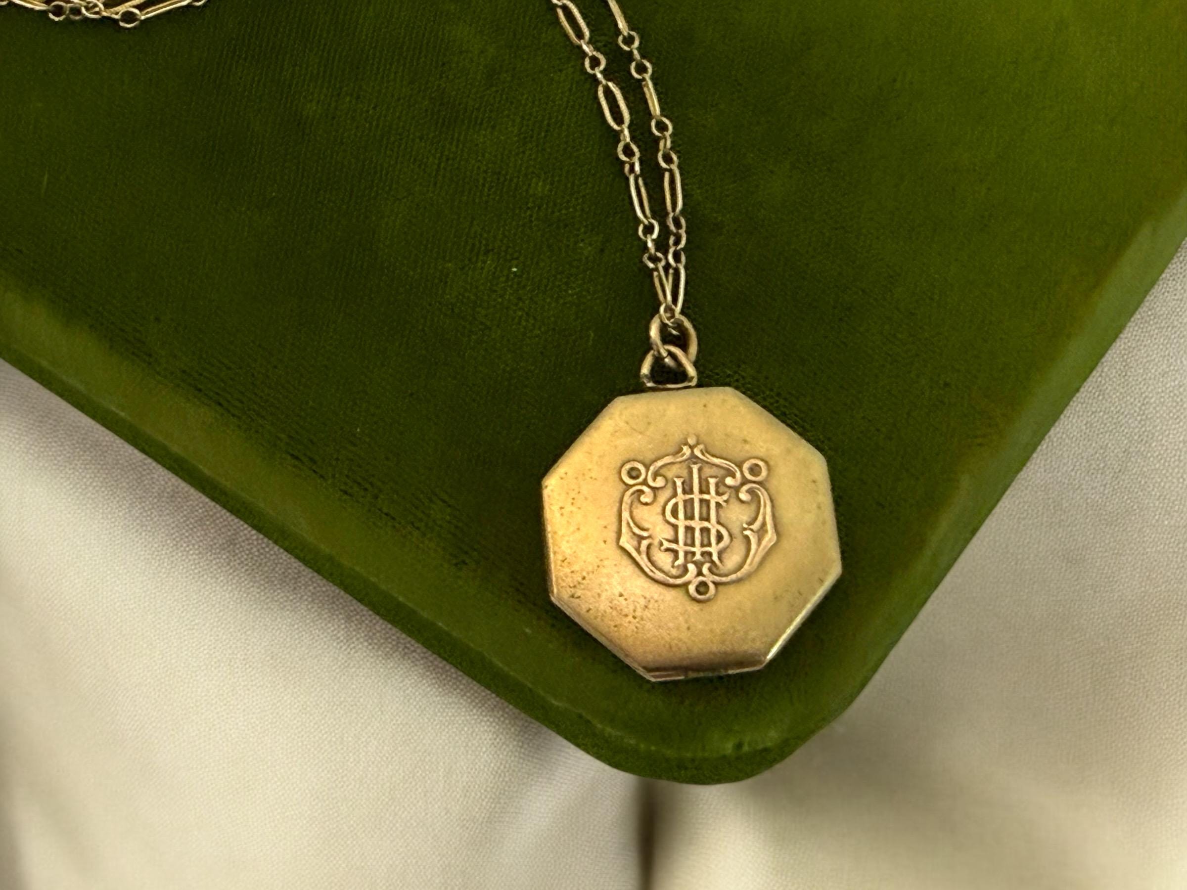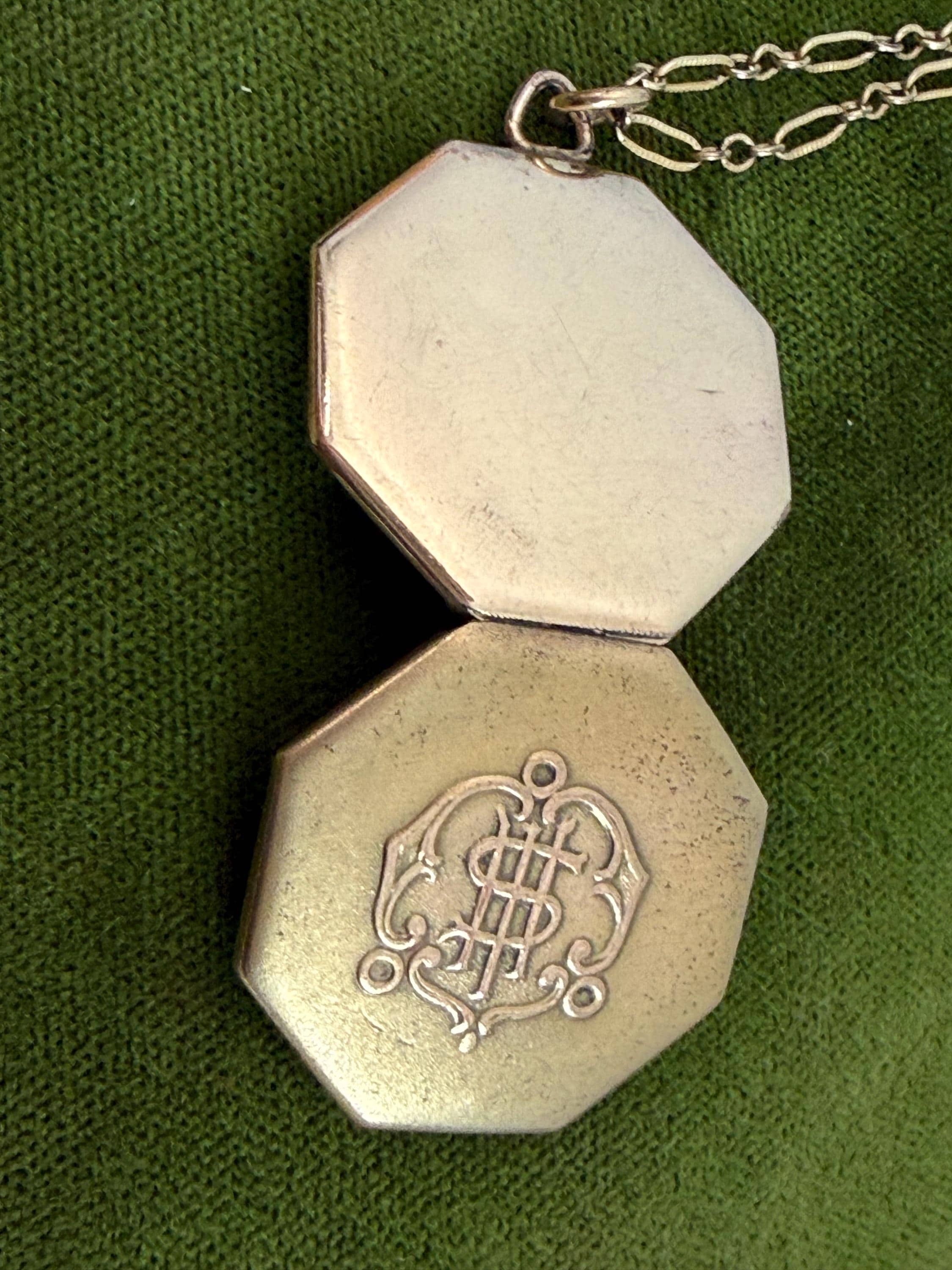 This unique 6 sided locket pendant hangs from a vintage 12K gold filled specialty link chain. The gold filled chain's spring ring clasp closes securely.
