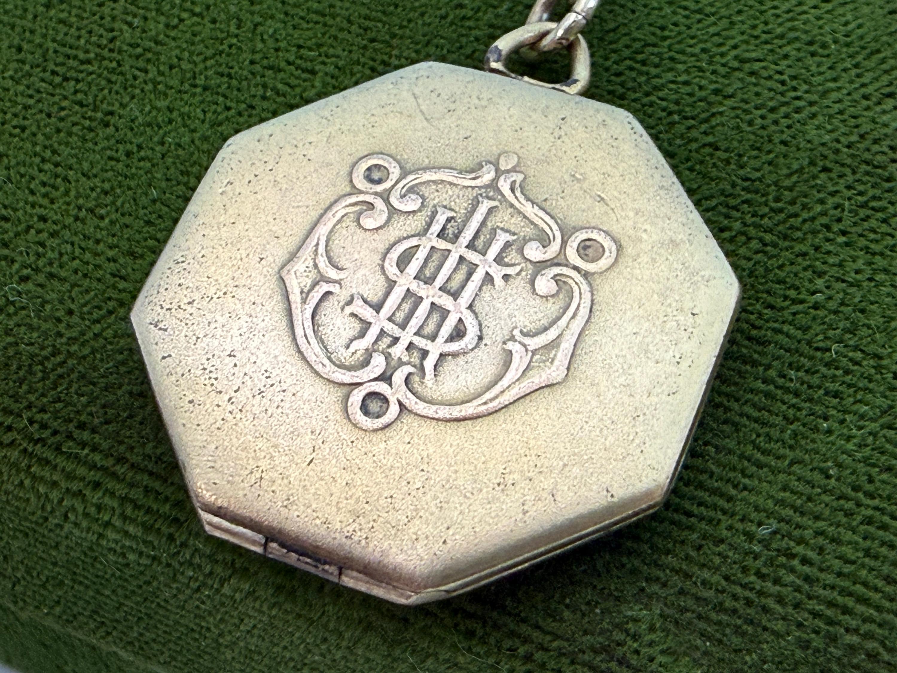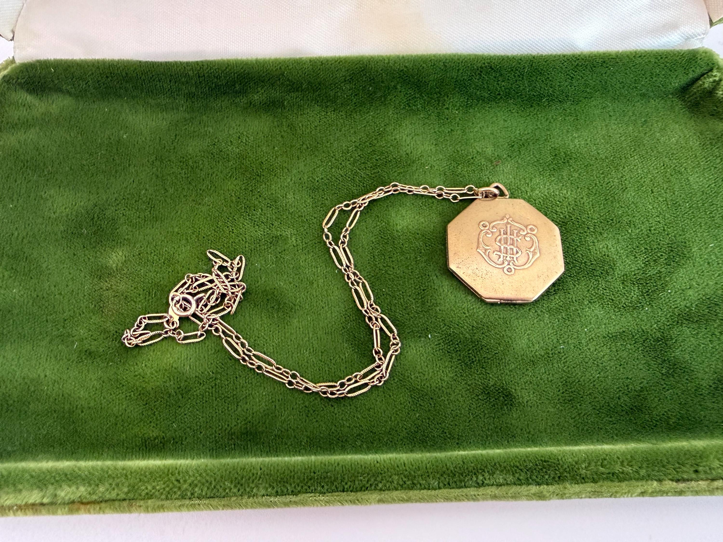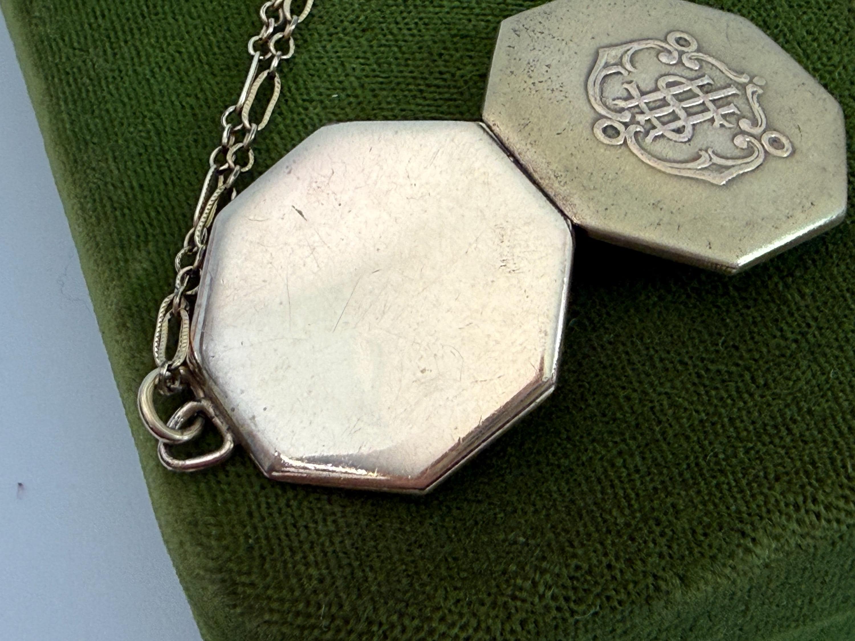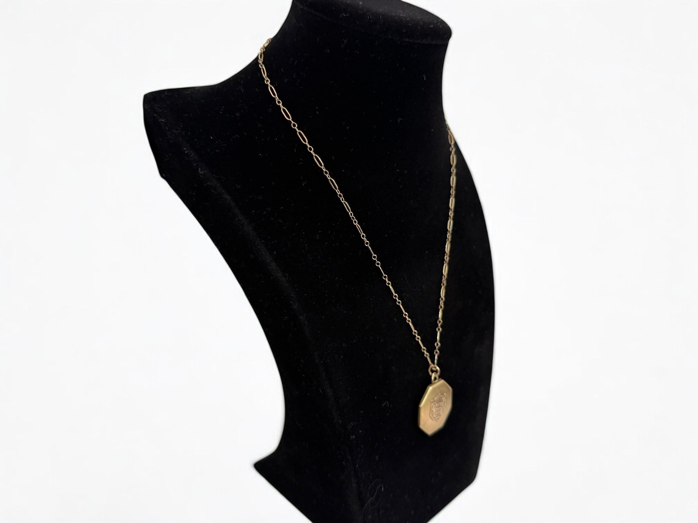 This unique 6 sided locket pendant hangs from a vintage 12K gold filled specialty link chain. The gold filled chain's spring ring clasp closes securely.