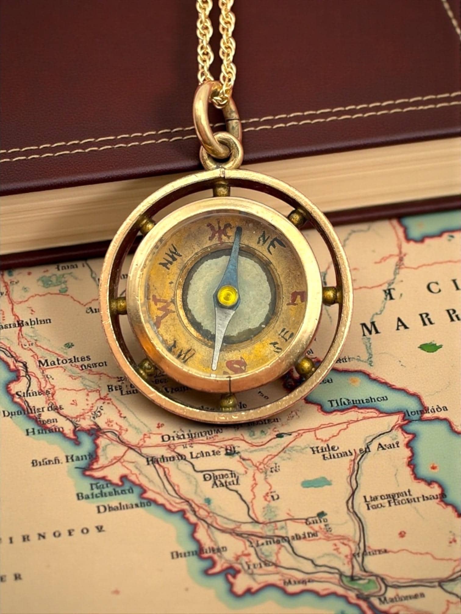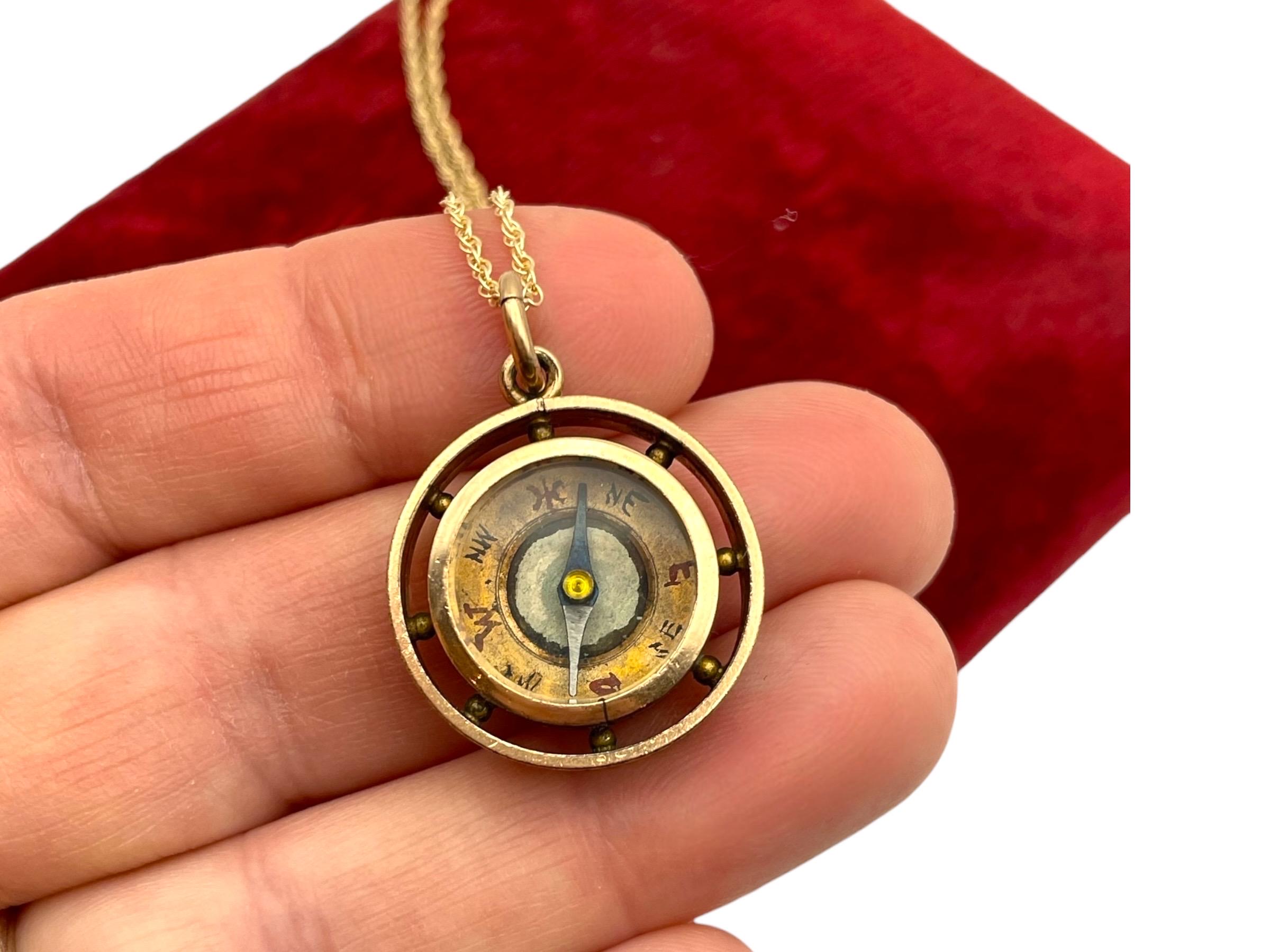 All who wander are not lost! Find your way with this unique antique compass charm. This Victorian era gold filled pendant features a small round compass in the center with a decorative leaf-type design around the outside.