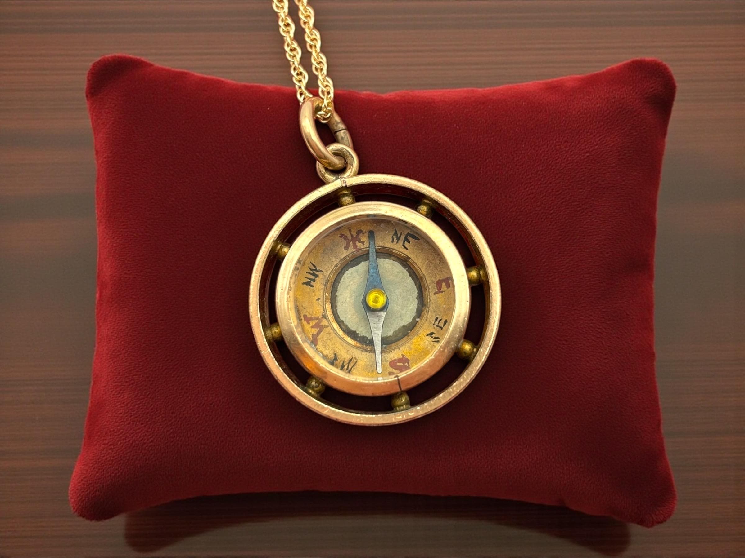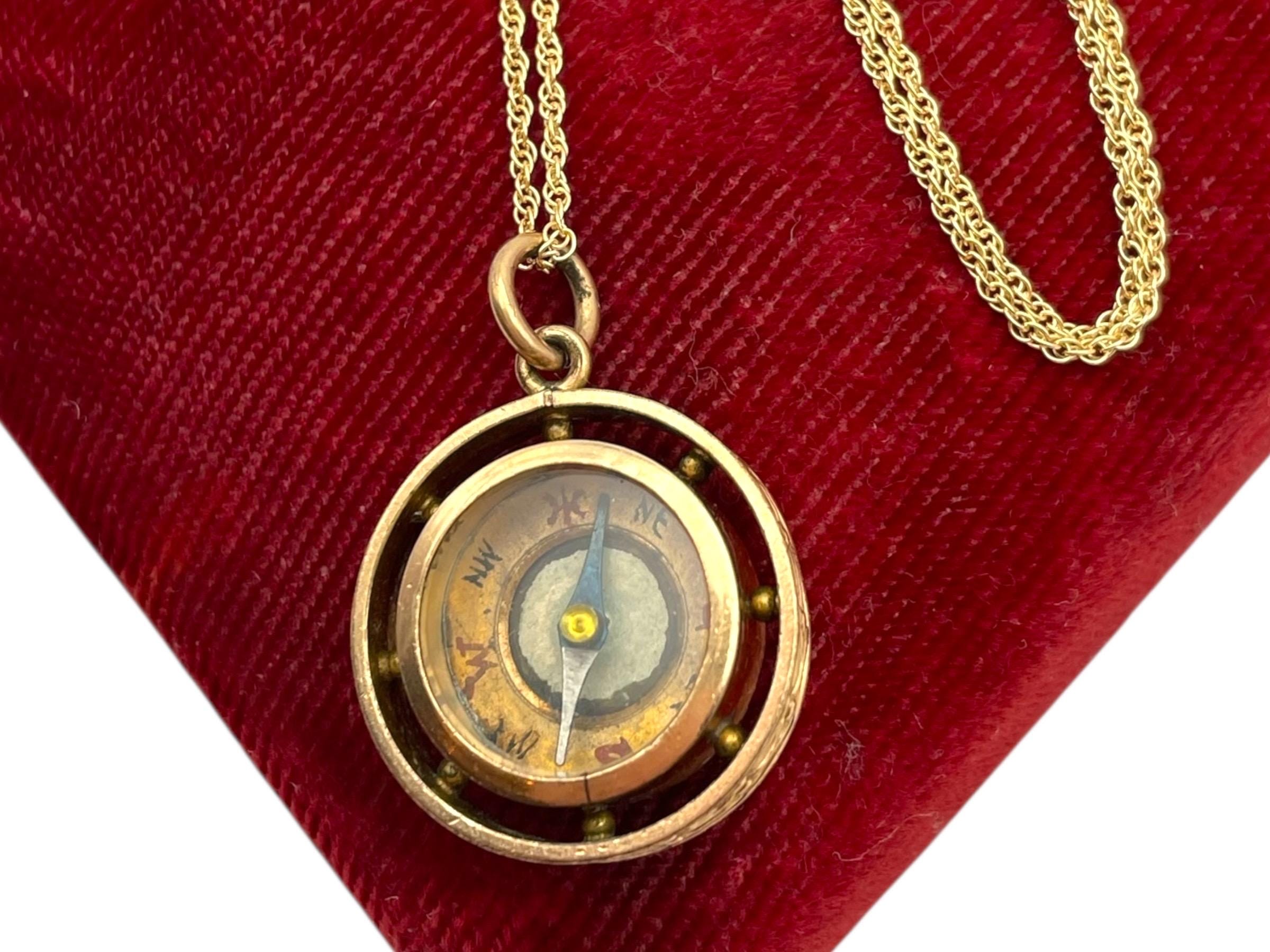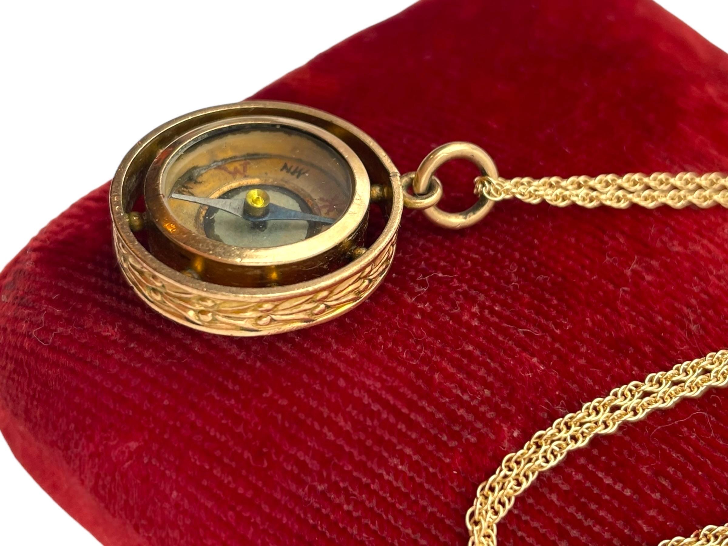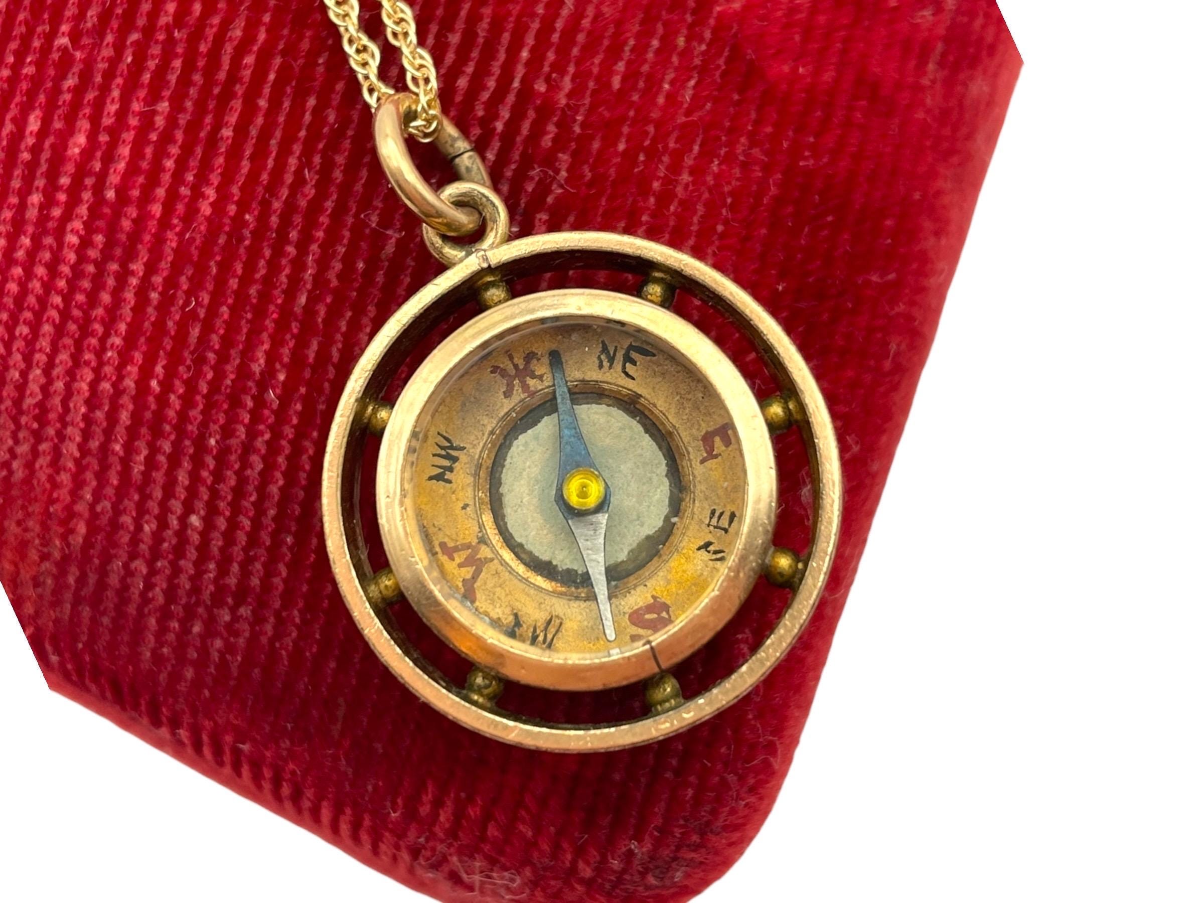 In nice antique condition with wear and patina commensurate with vintage age (100+ years old) - see photos for details. Some wear, etc to the inside, under the glass. Some wear, small indentations, etc. to the edges. The compass arrow does move when the compass is laid flat. The chain is new and in great condition.
