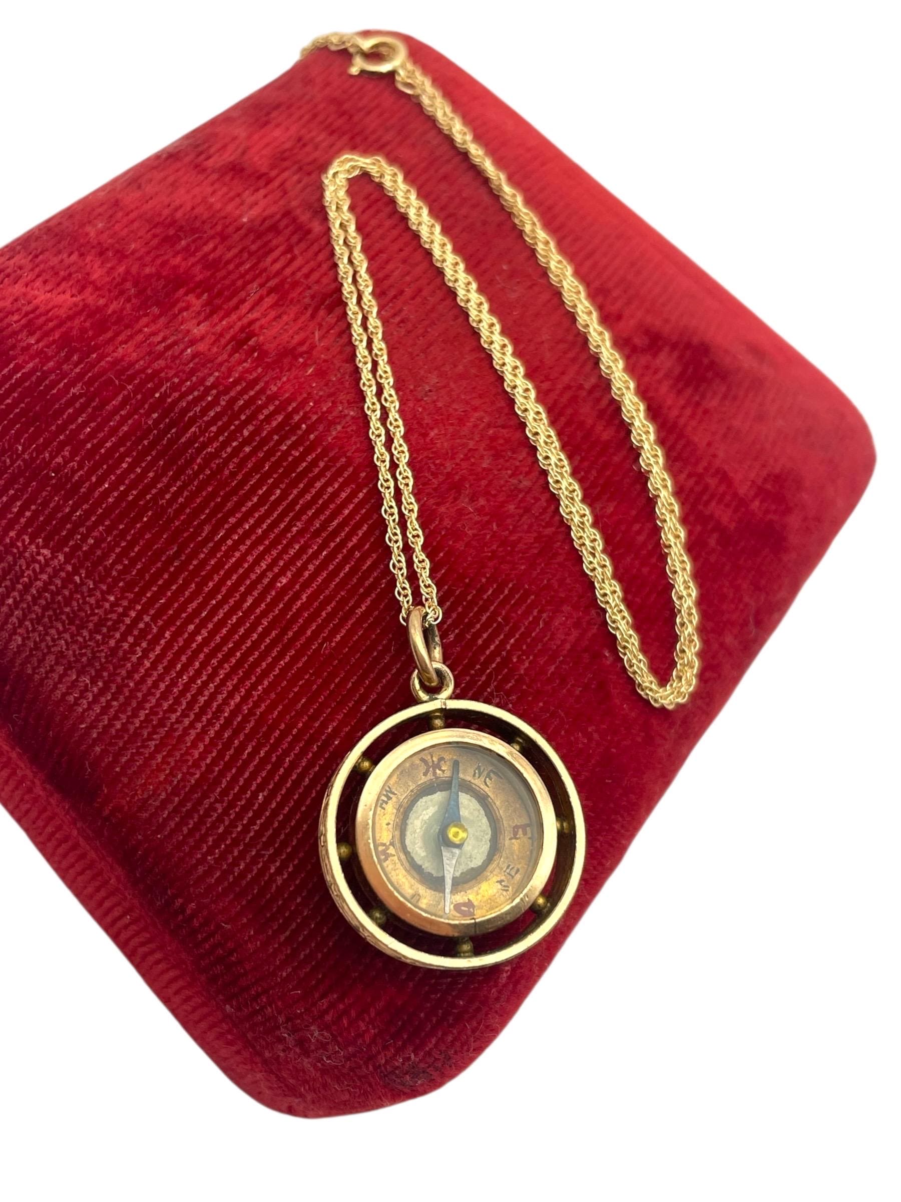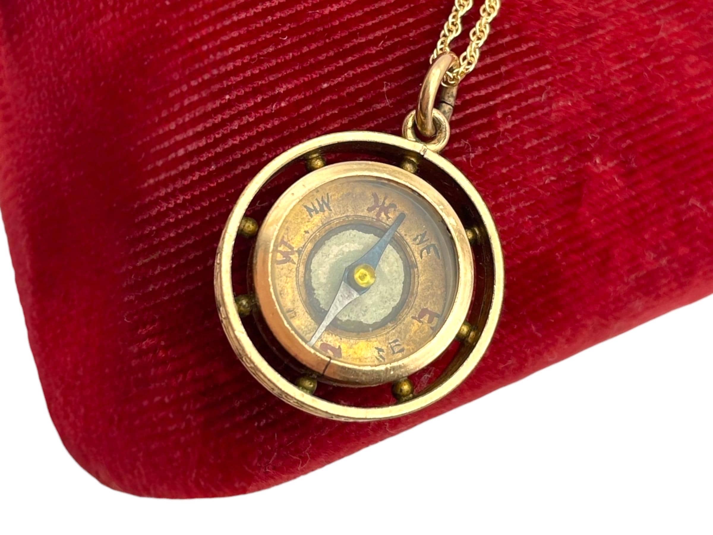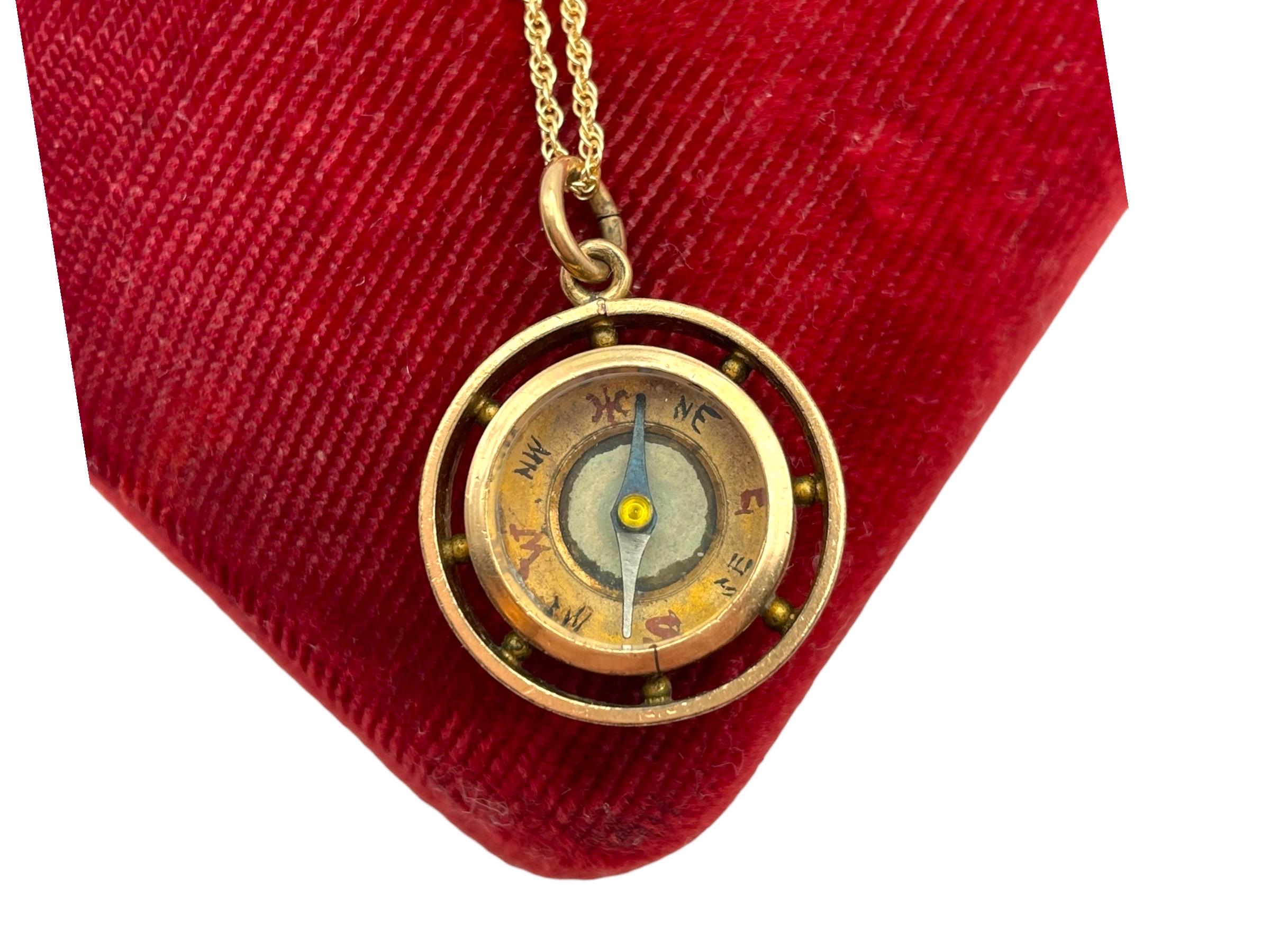 In nice antique condition with wear and patina commensurate with vintage age (100+ years old) - see photos for details. Some wear, etc to the inside, under the glass. Some wear, small indentations, etc. to the edges. The compass arrow does move when the compass is laid flat. The chain is new and in great condition.