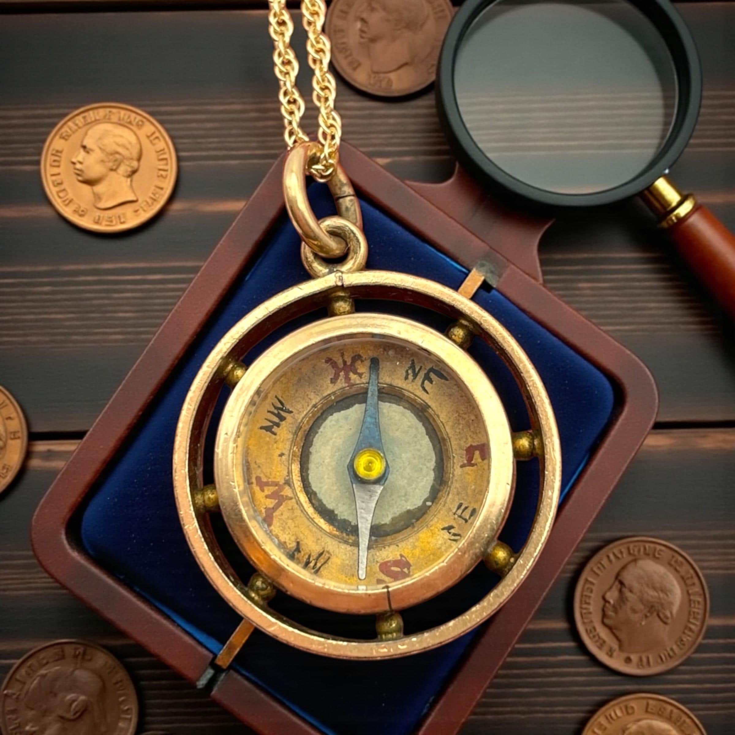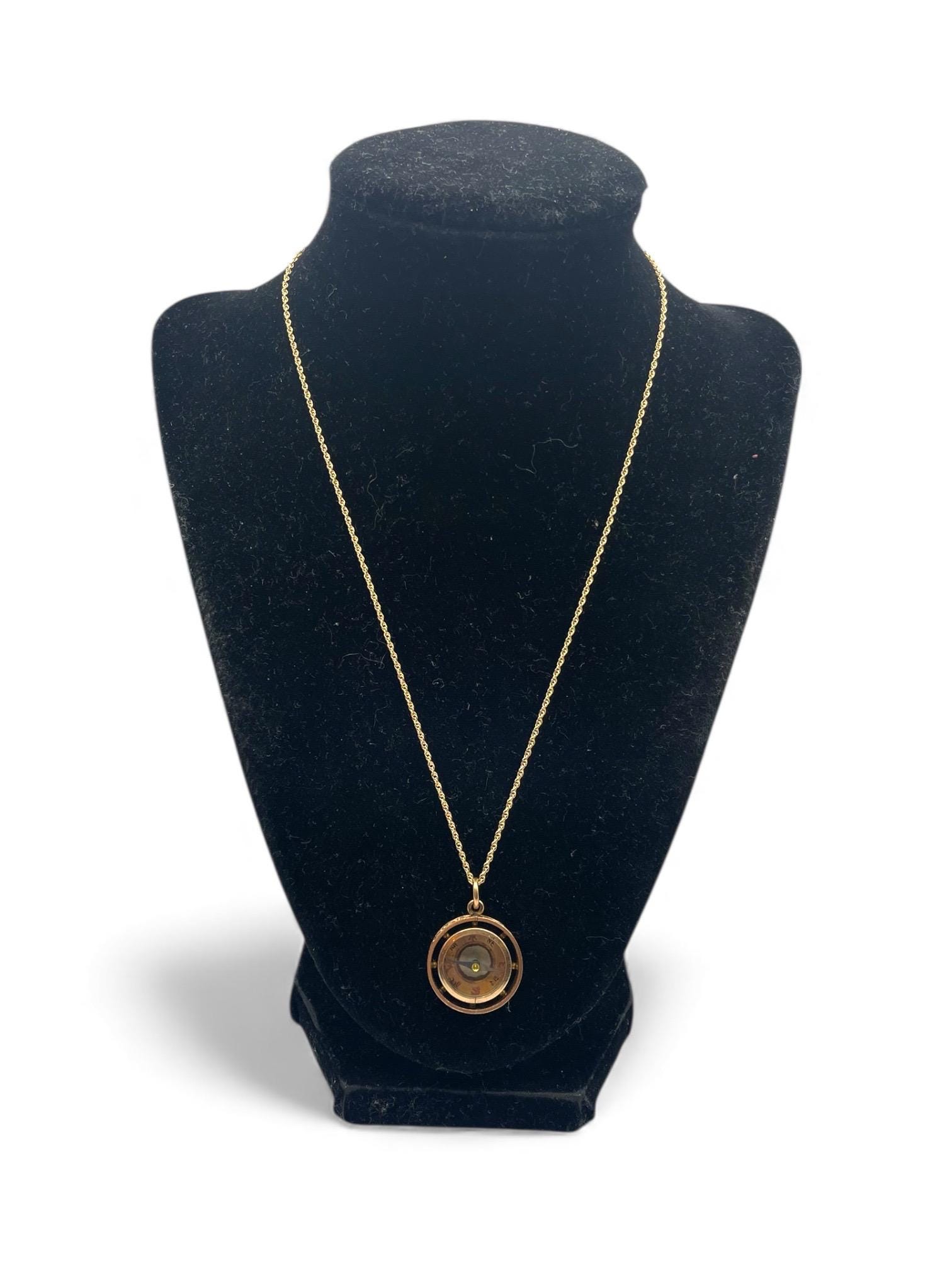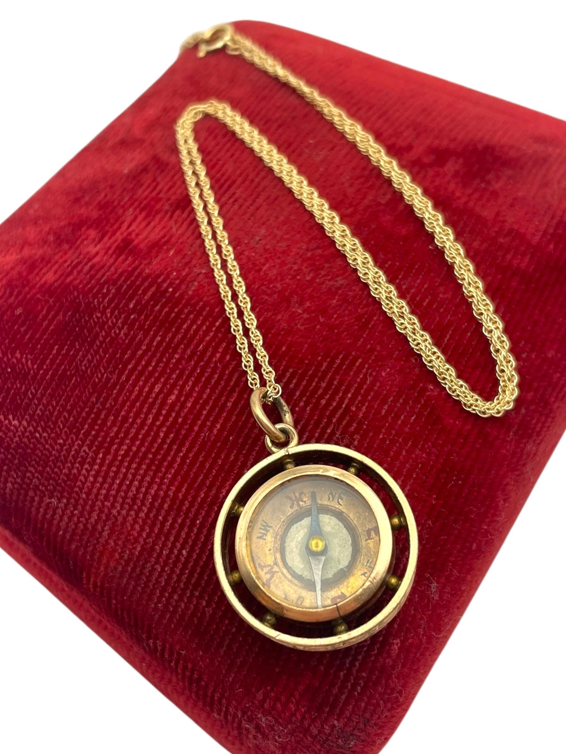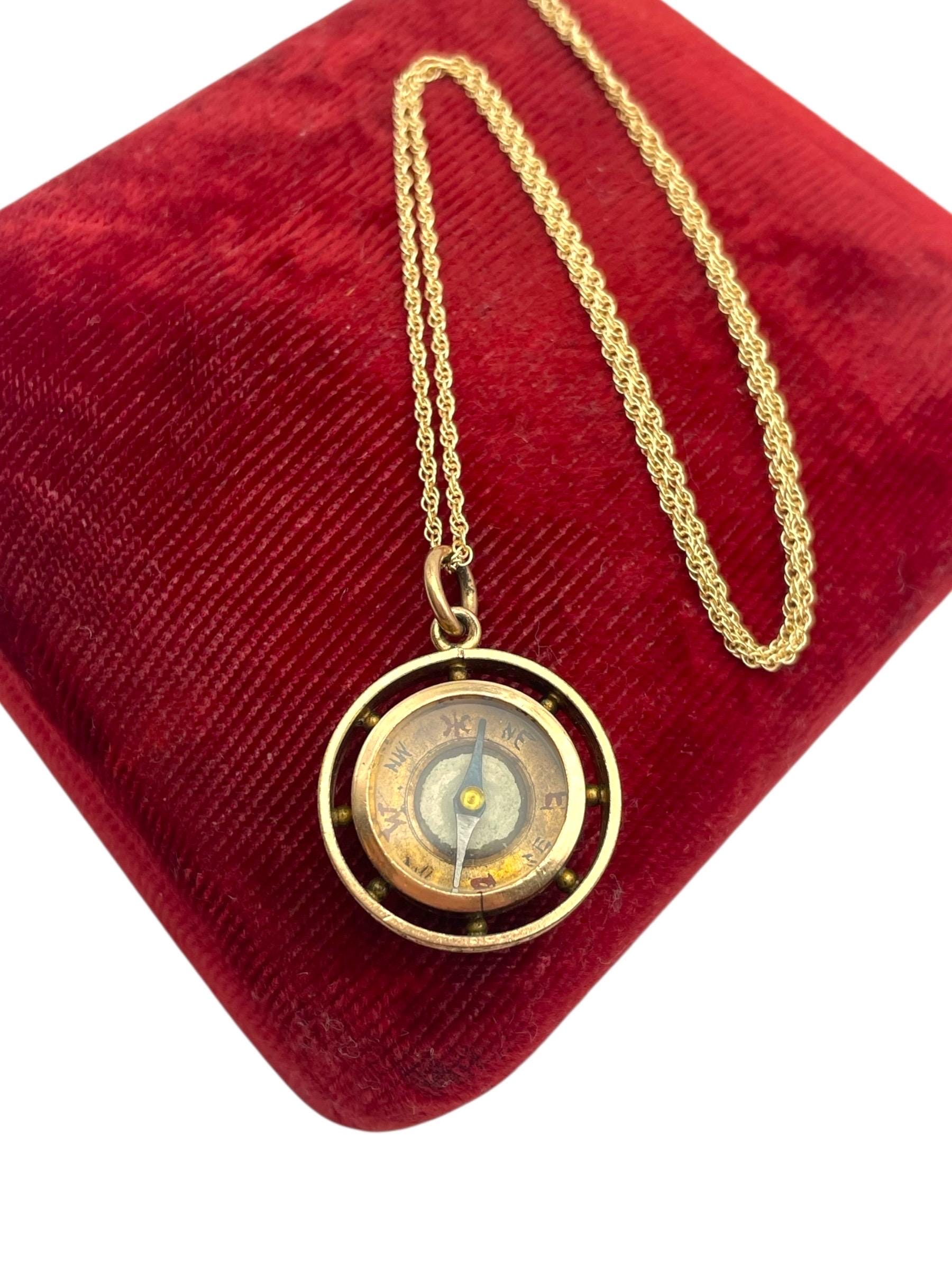 In nice antique condition with wear and patina commensurate with vintage age (100+ years old) - see photos for details. Some wear, etc to the inside, under the glass. Some wear, small indentations, etc. to the edges. The compass arrow does move when the compass is laid flat. The chain is new and in great condition.