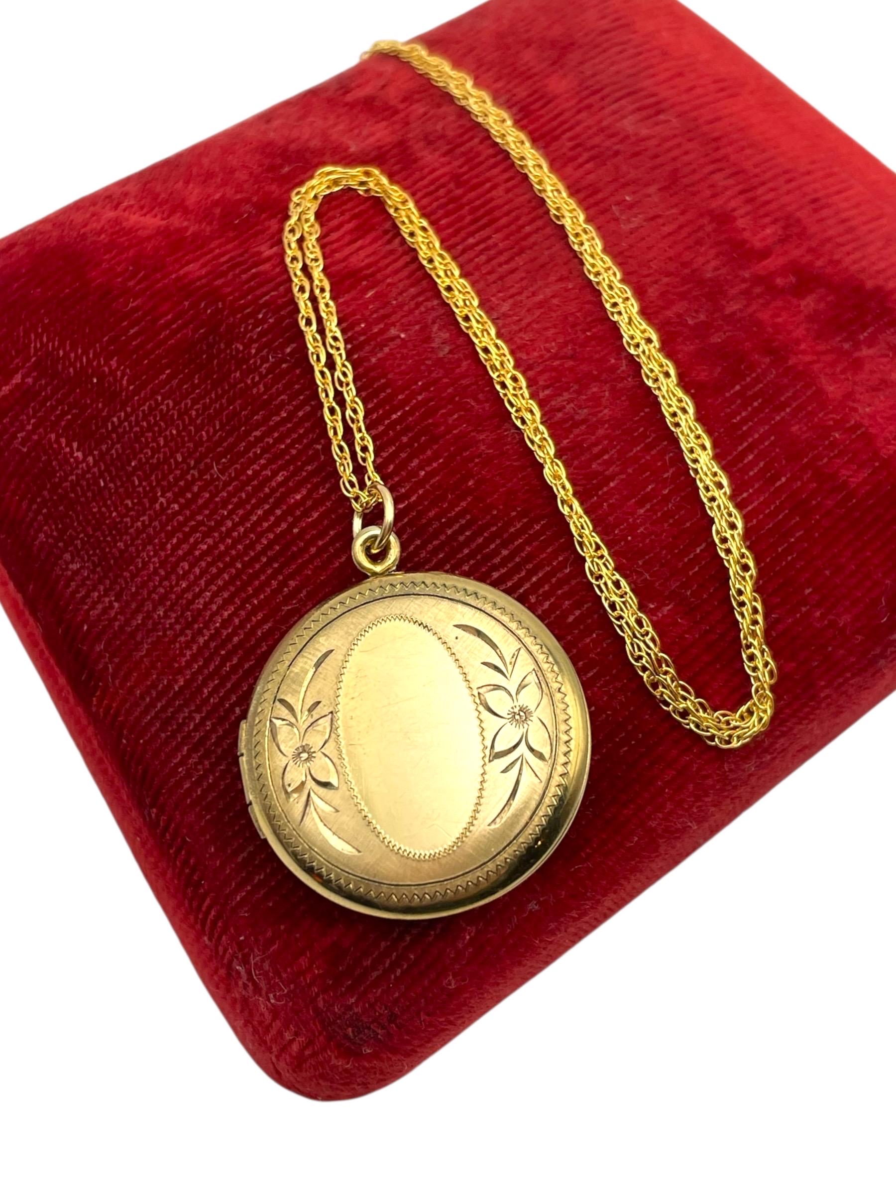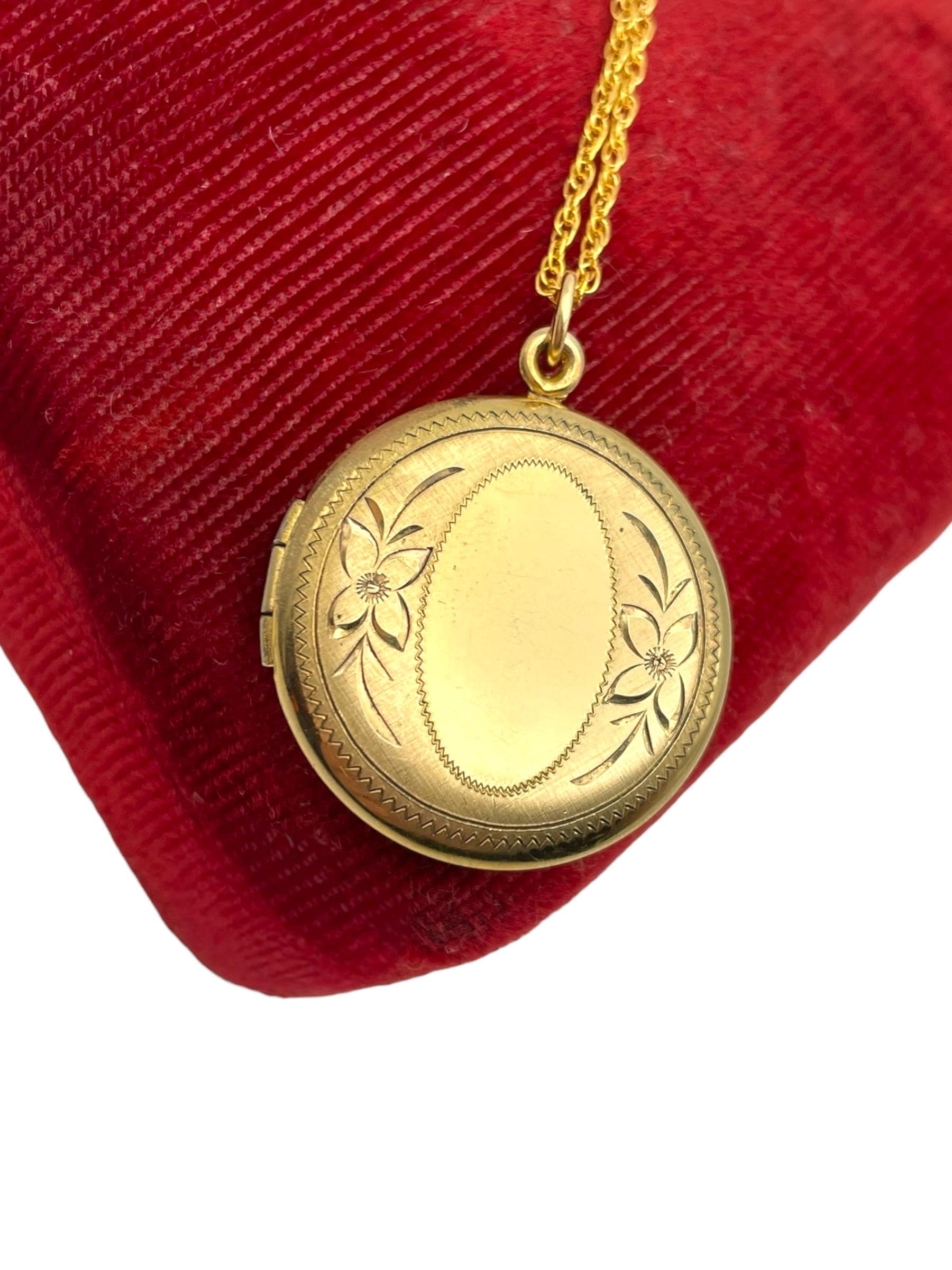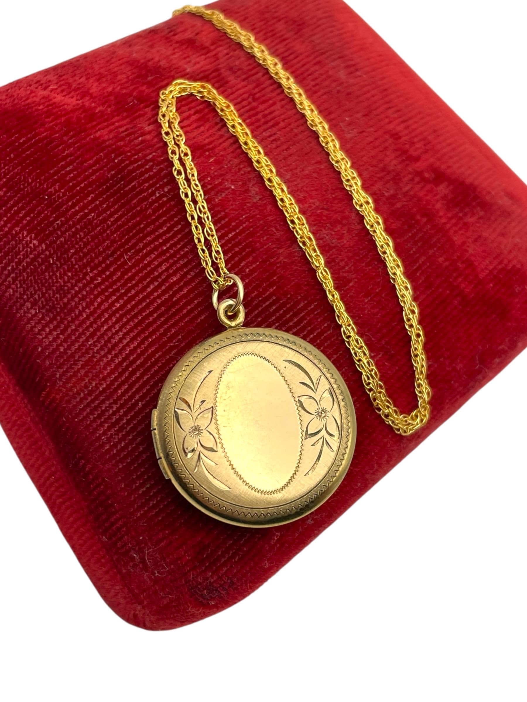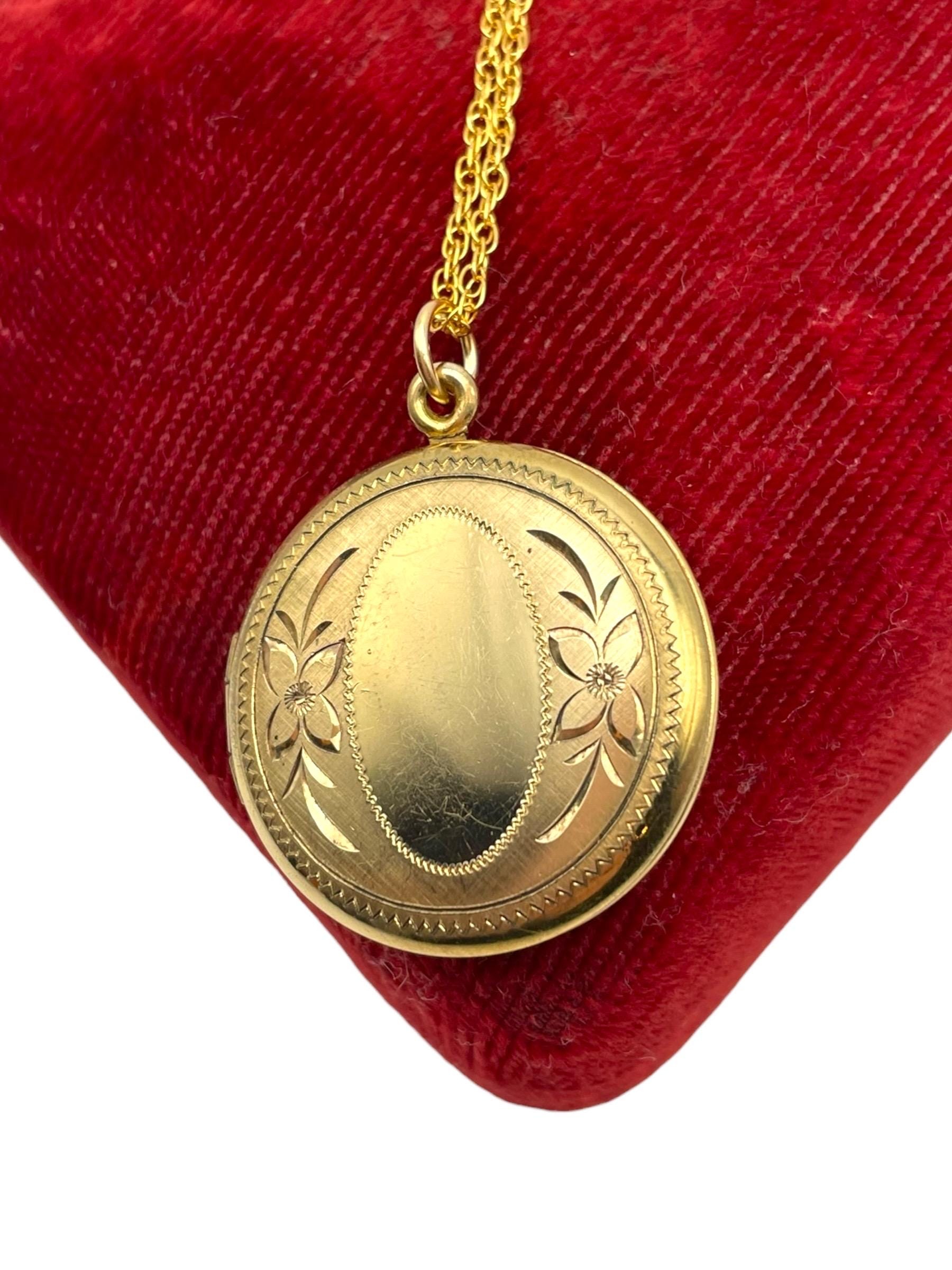 A large round vintage gold filled locket on a 14K yellow gold chain. This locket features an etched floral design on the front, the back is plain with no design.