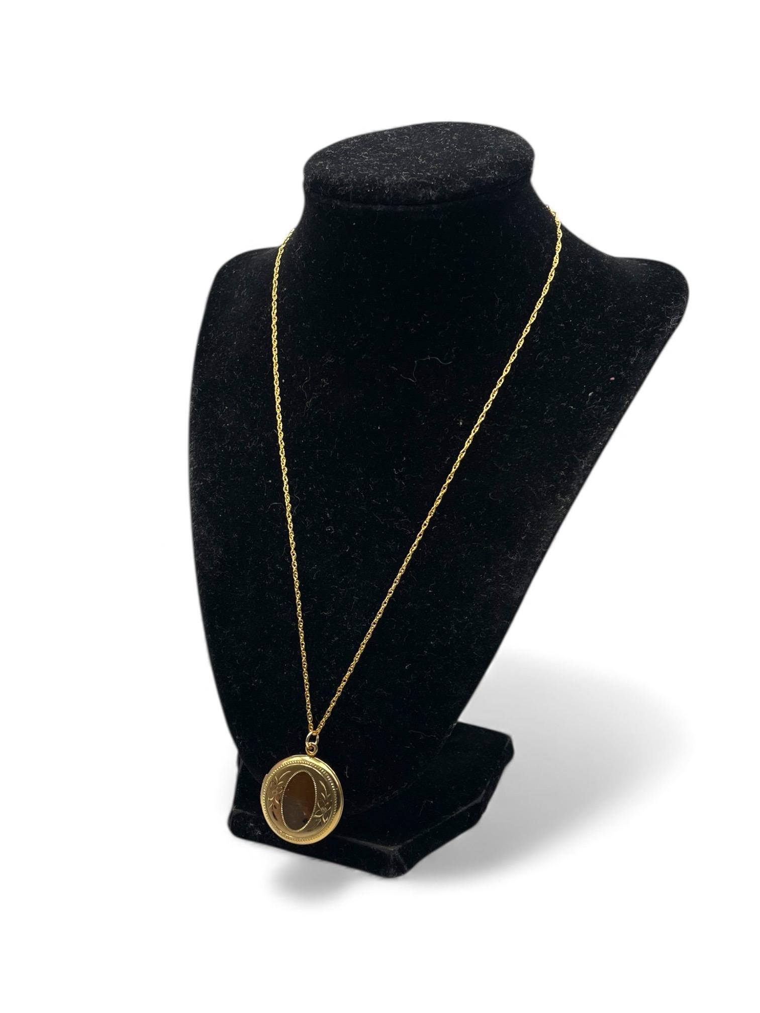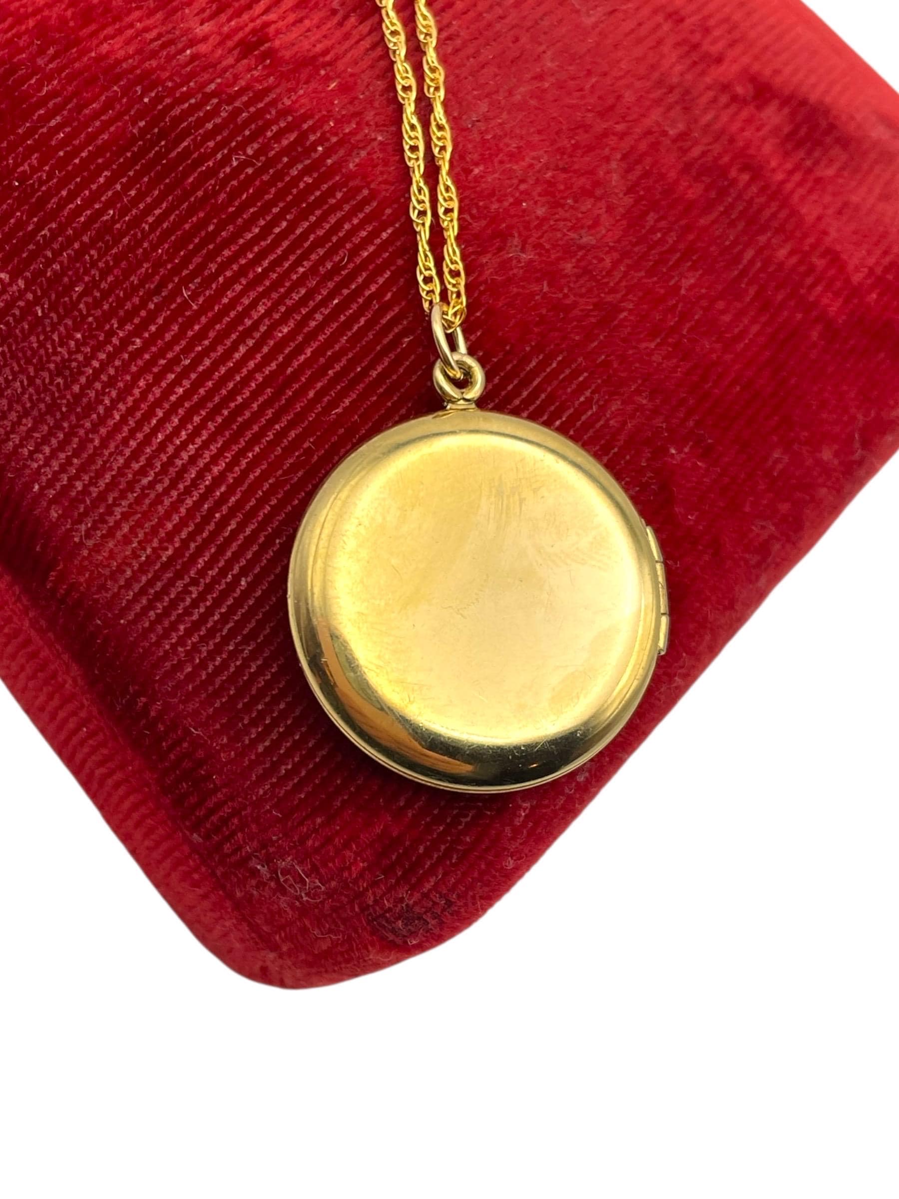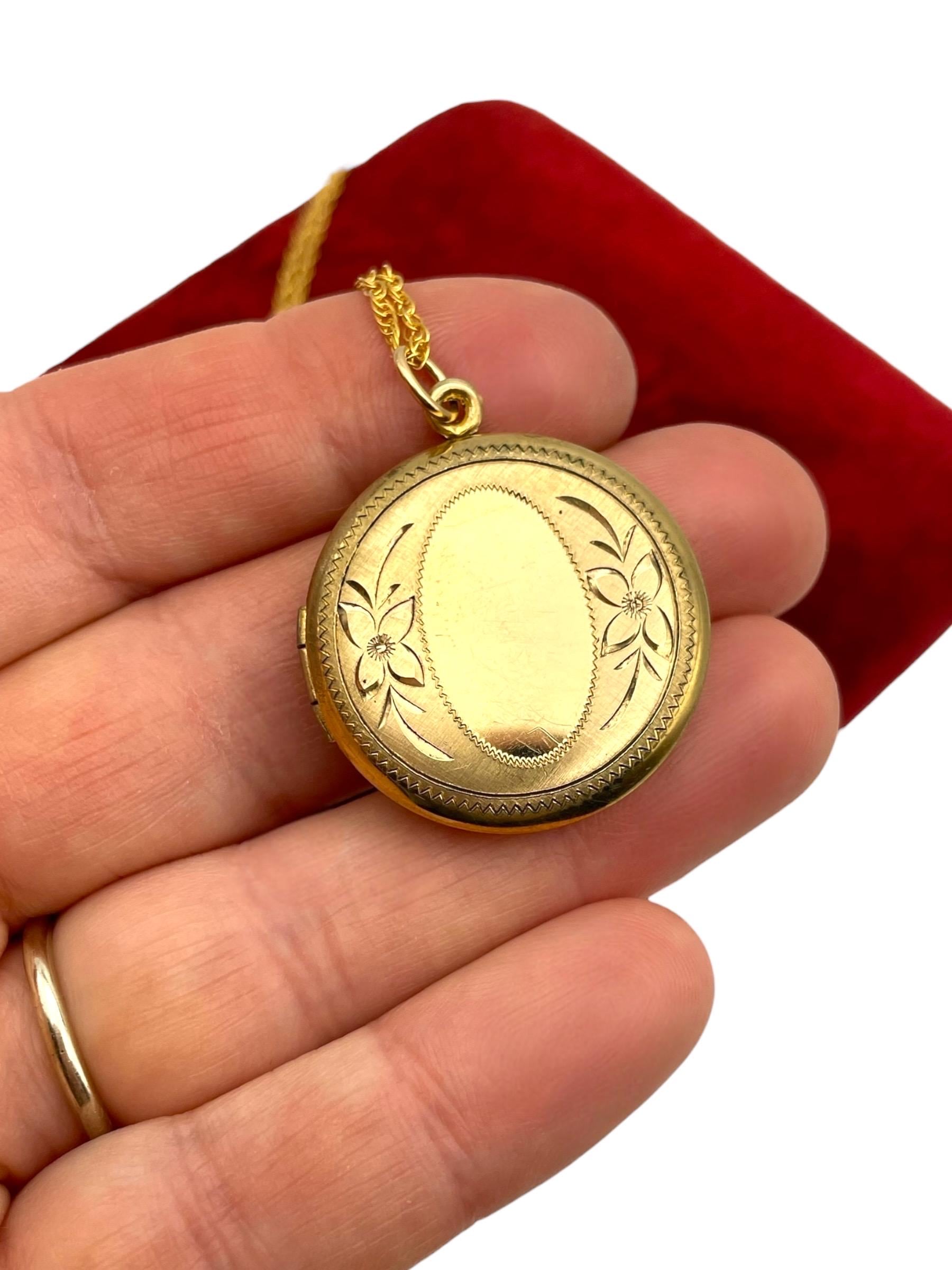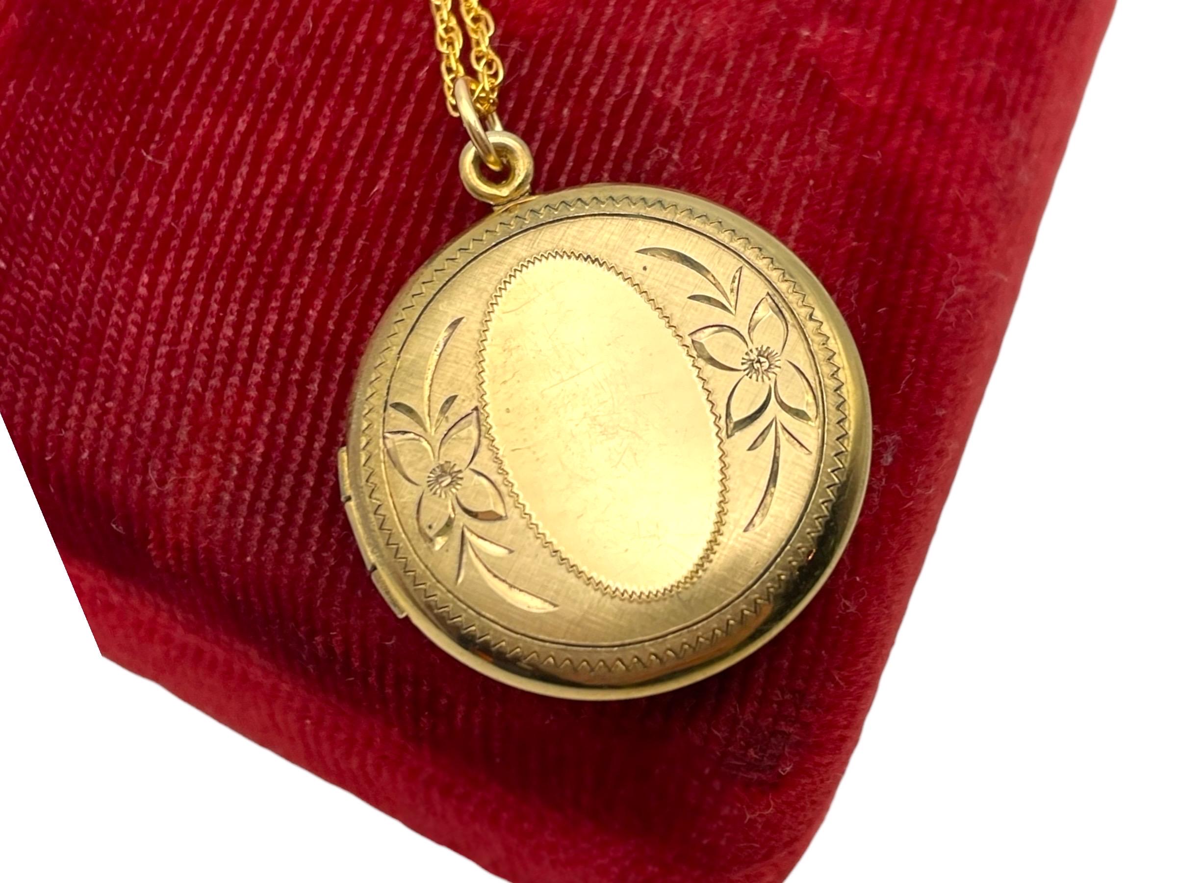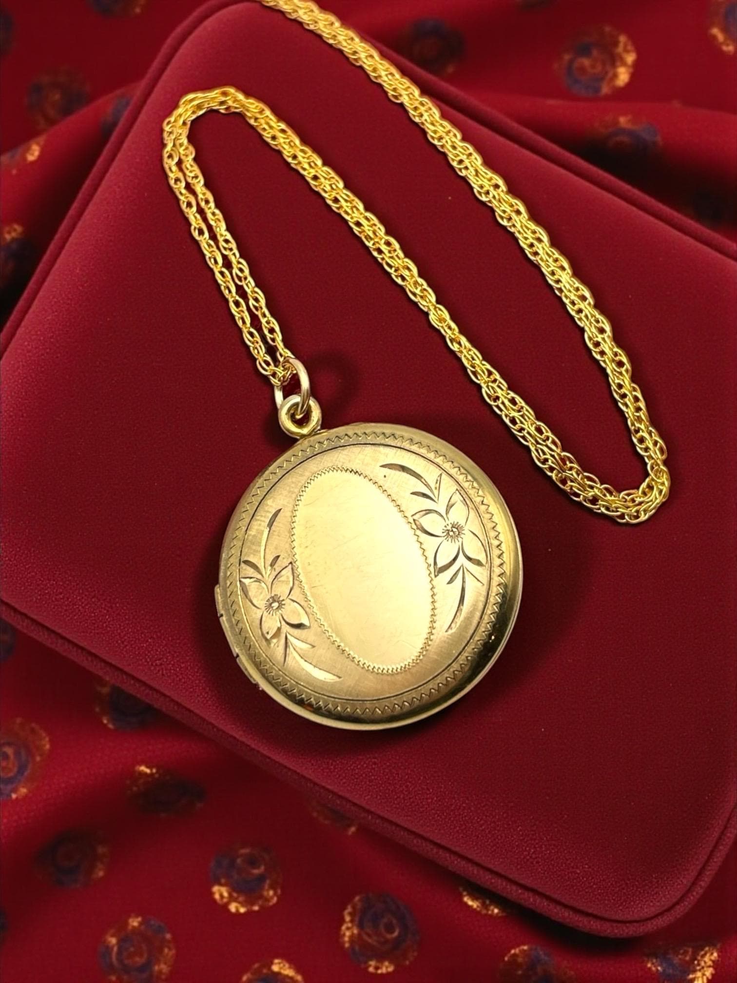 A large round vintage gold filled locket on a 14K yellow gold chain. This locket features an etched floral design on the front, the back is plain with no design.