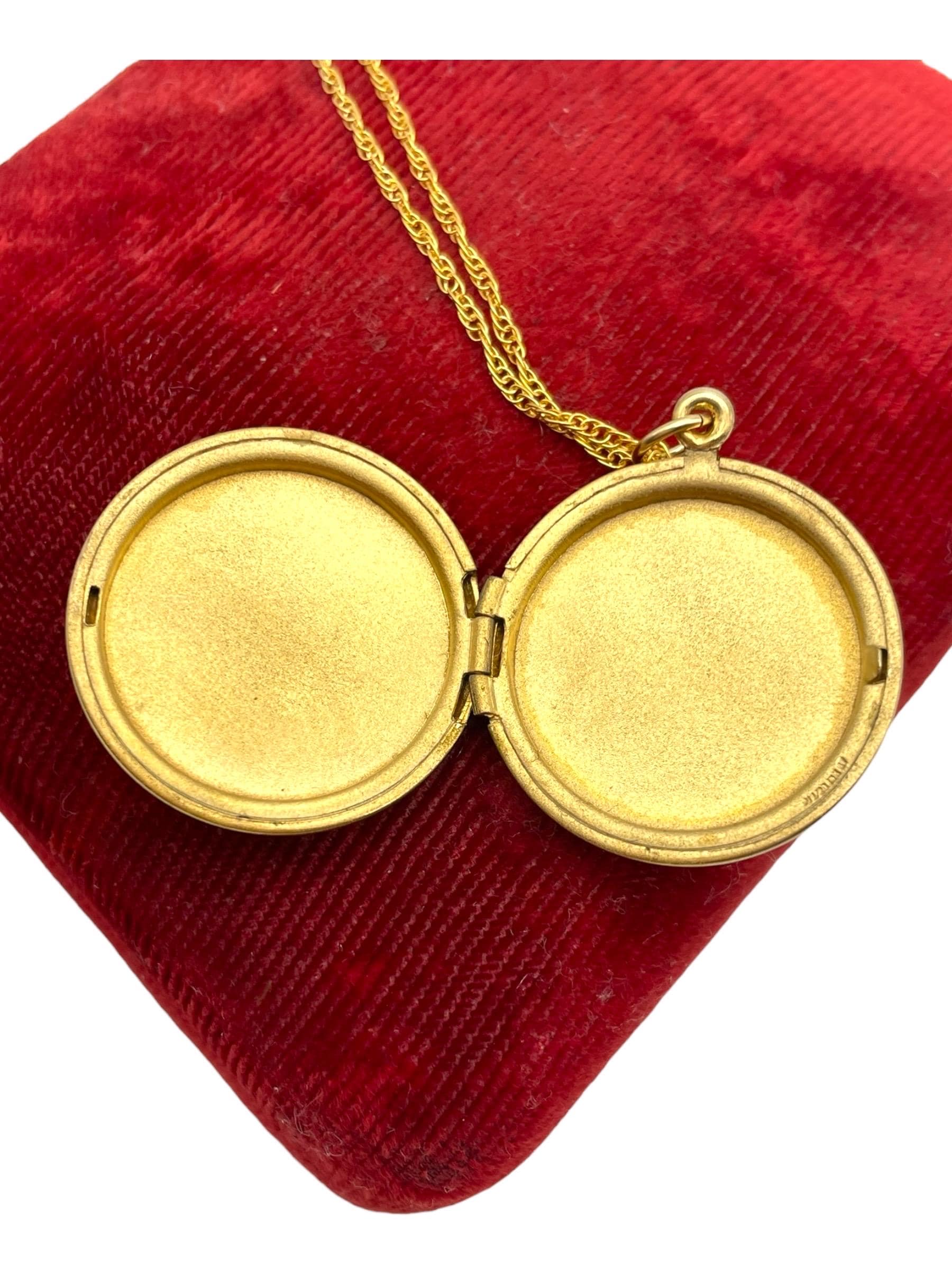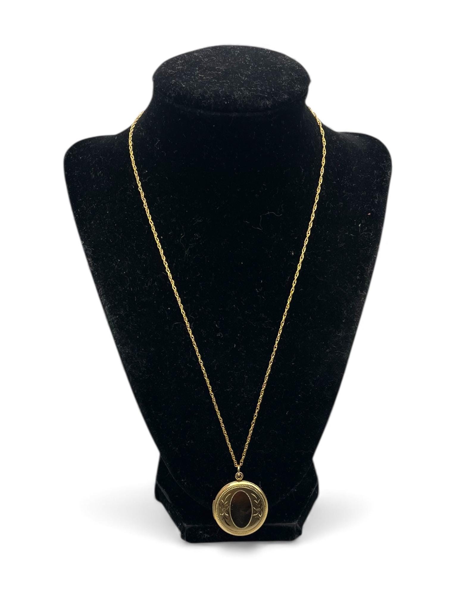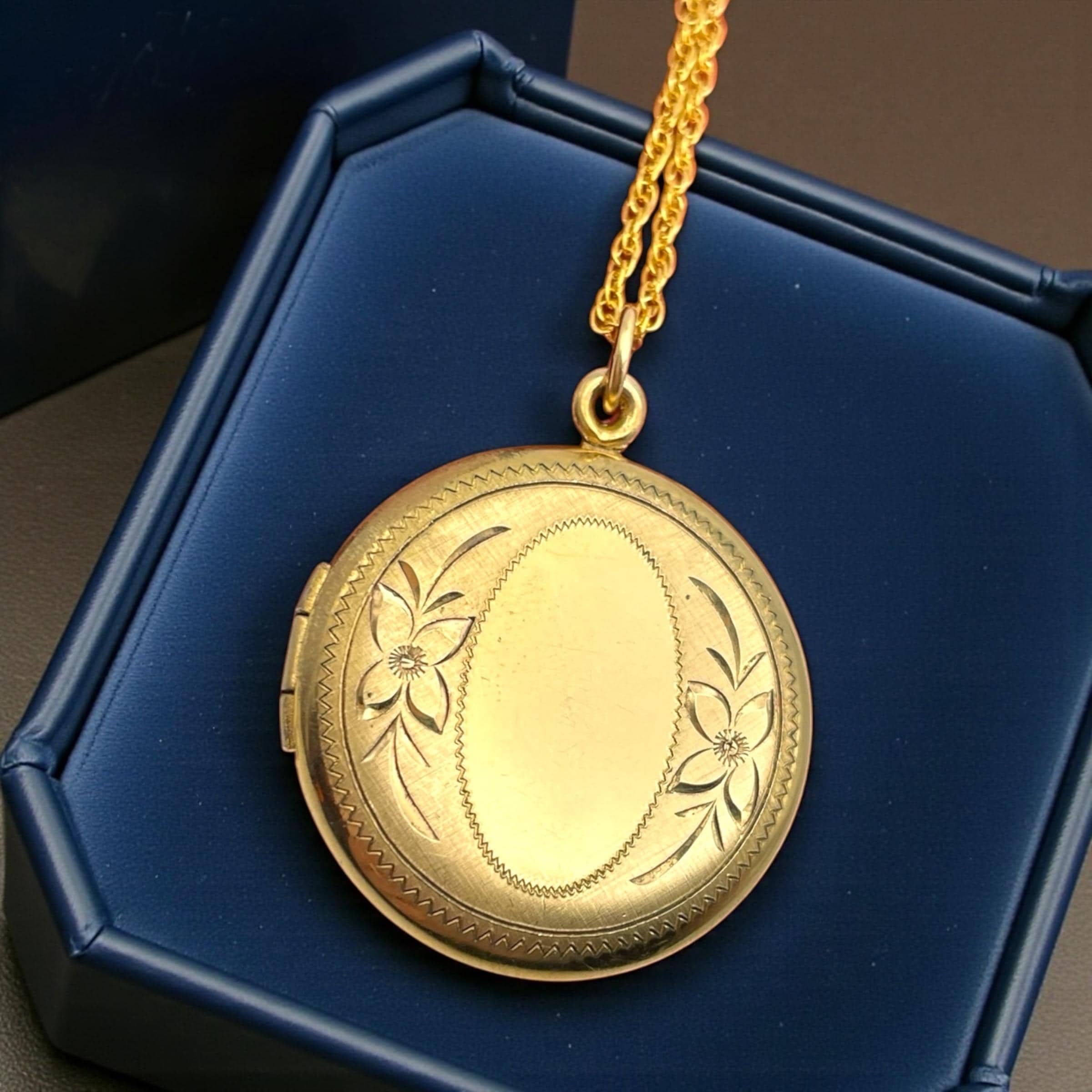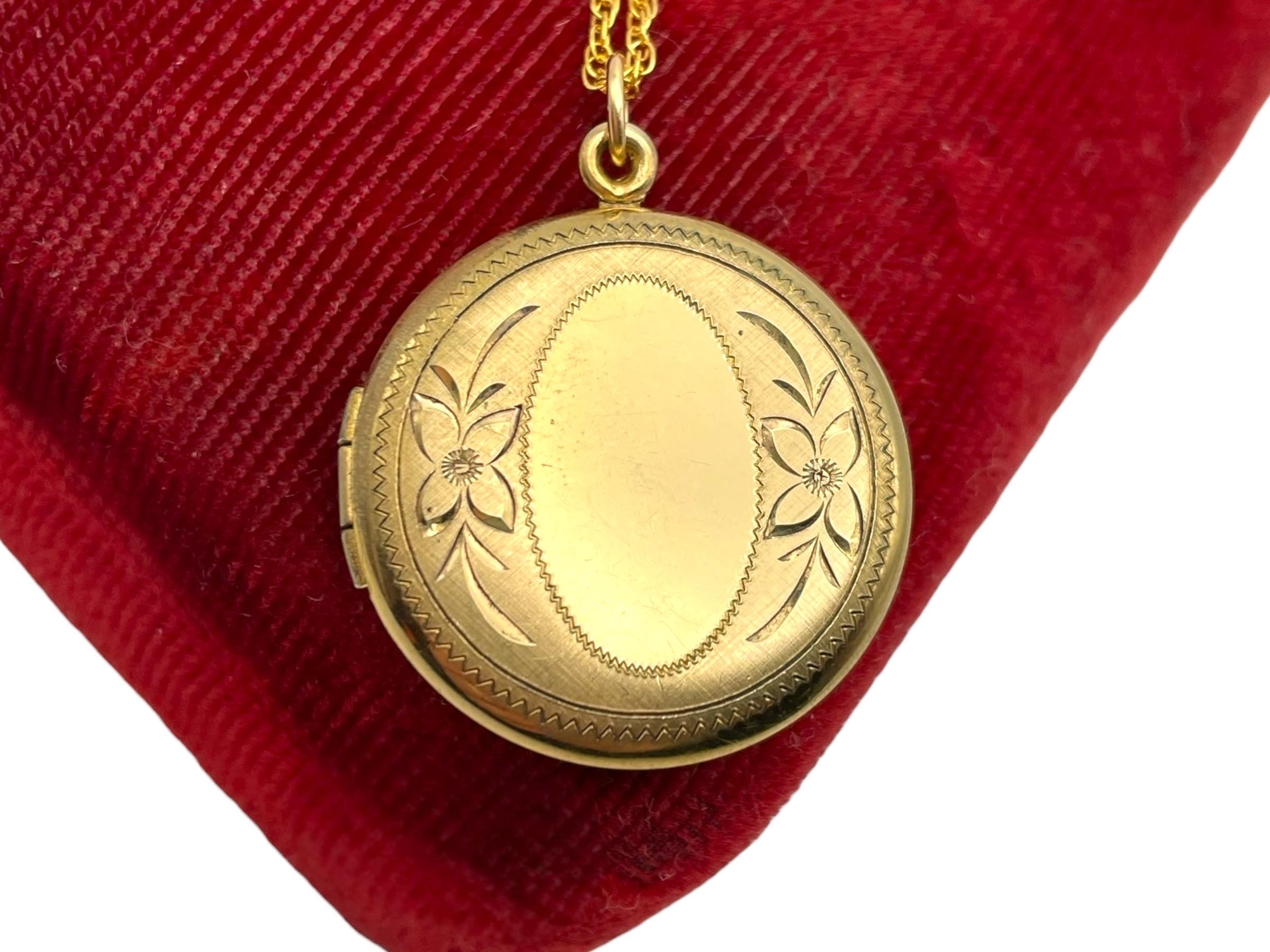Vintage Gold Locket Necklace: 14K Gold Filled Pendant, Round Etched Flowers Retro Jewelry